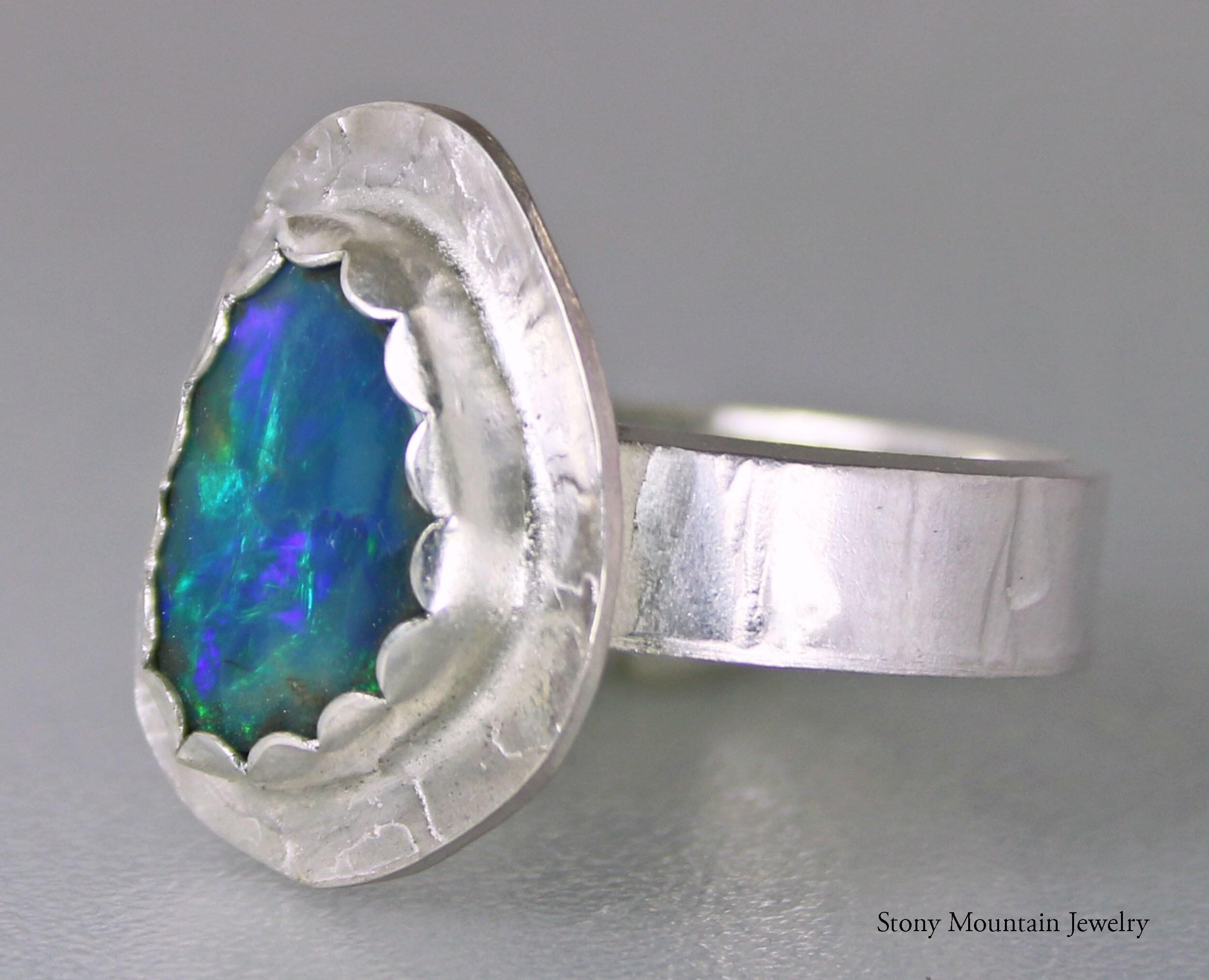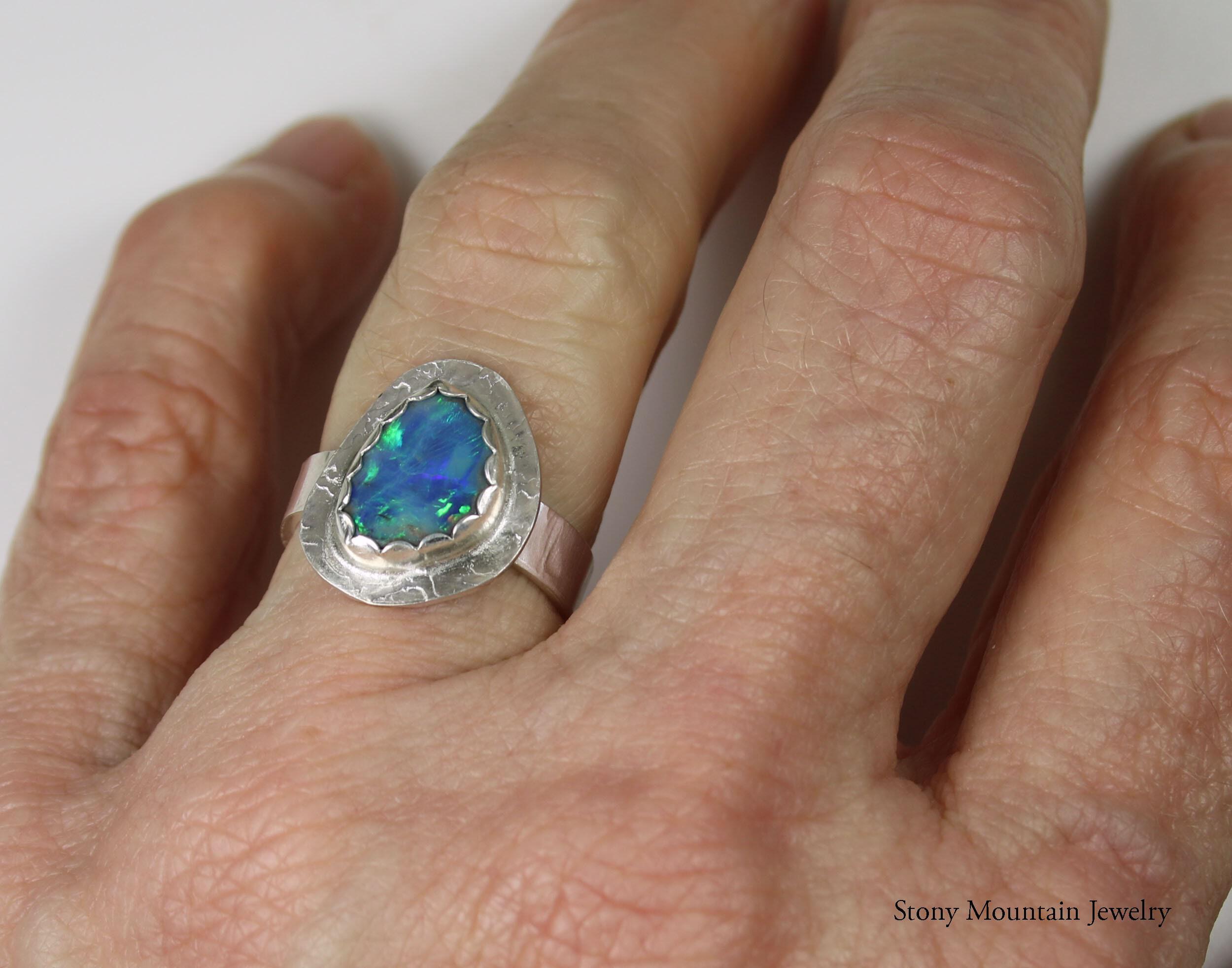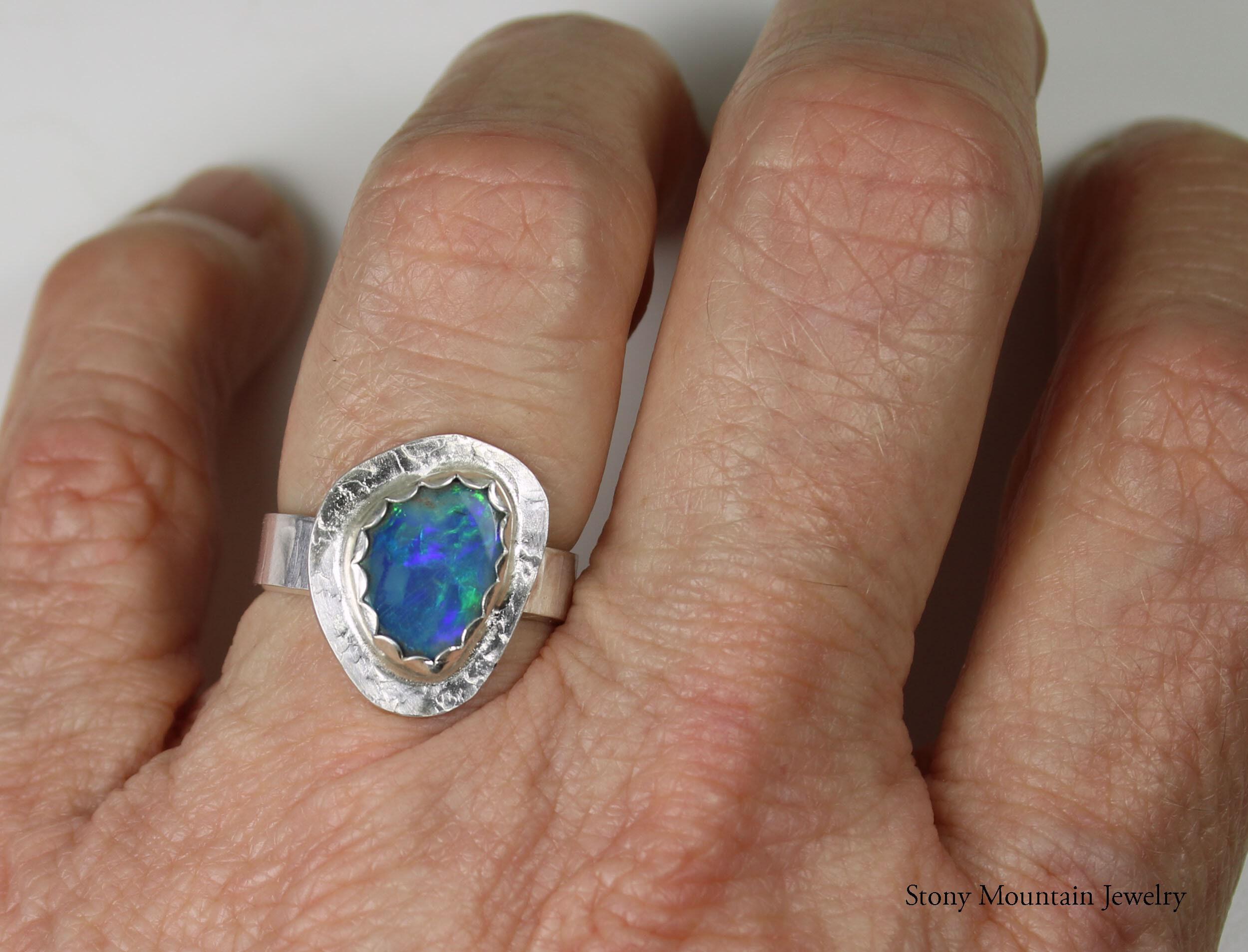 Beautiful vivid Australian Blue Opal ring. Boulder opal doublet with hints of blue green fire is bezel set in sterling silver atop a textured sterling silver surround on a hammered silver band. This ring is a size 6 3/4 and can be sized up to an 7 1/2. Original Ran Armstrong OOAK wide band designer gemstone ring. This non traditional style ring is very comfortable to wear and makes an exceptional fashion statement. A lovely October birthstone ring.Ring Size..............................6.75 Gemstone...........................Australian Blue Opal Doublet Carat Weight.......................1 carat Gemstone Dimensions.......11mm x 8mm Widest band measure.........17mm (point to point where the stone is set) Side Band measure..............5mm Back band measure.............5mm Band Thickness....................1mm Combined metals, often highly textured, with their color and character variations have long been a hallmark of Ran Armstrong’s jewelry designs. Having spent decades honing his crafts in lapidary arts, jewelry design and metal sculpting, Ran has a unique take on mixing sterling silver and high karat gold to show case fine gemstones in mini wearable sculptures. Every piece has been designed and created with the utmost care and skill. Each one is a treasure that will be Distinctively Yours. All jewelry is gift boxed. US SHIPPING: All items under $200.00 are shipped via USPS First Class Mail, with tracking. Shipping upgrade are available at checkout. All items over $200.00 are shipped USPS First Class Mail, with Signature Confirmation to the United States. INTERNATIONAL SHIPPING: Buyer is responsible for any and all customs fees and/or VAT taxes. At this time, only items under $400.00 ship internationally. Those items ship USPS First Class Mail, with tracking. Shipping upgrades are available at checkout. JOIN OUR VIP CLUB for ETSY EARLY DISCOUNTS AND SPECIAL COUPON CODES - JUST COPY & PASTE INTO A NEW BROWSER TAB: http://eepurl.com/gEvNRj