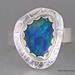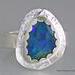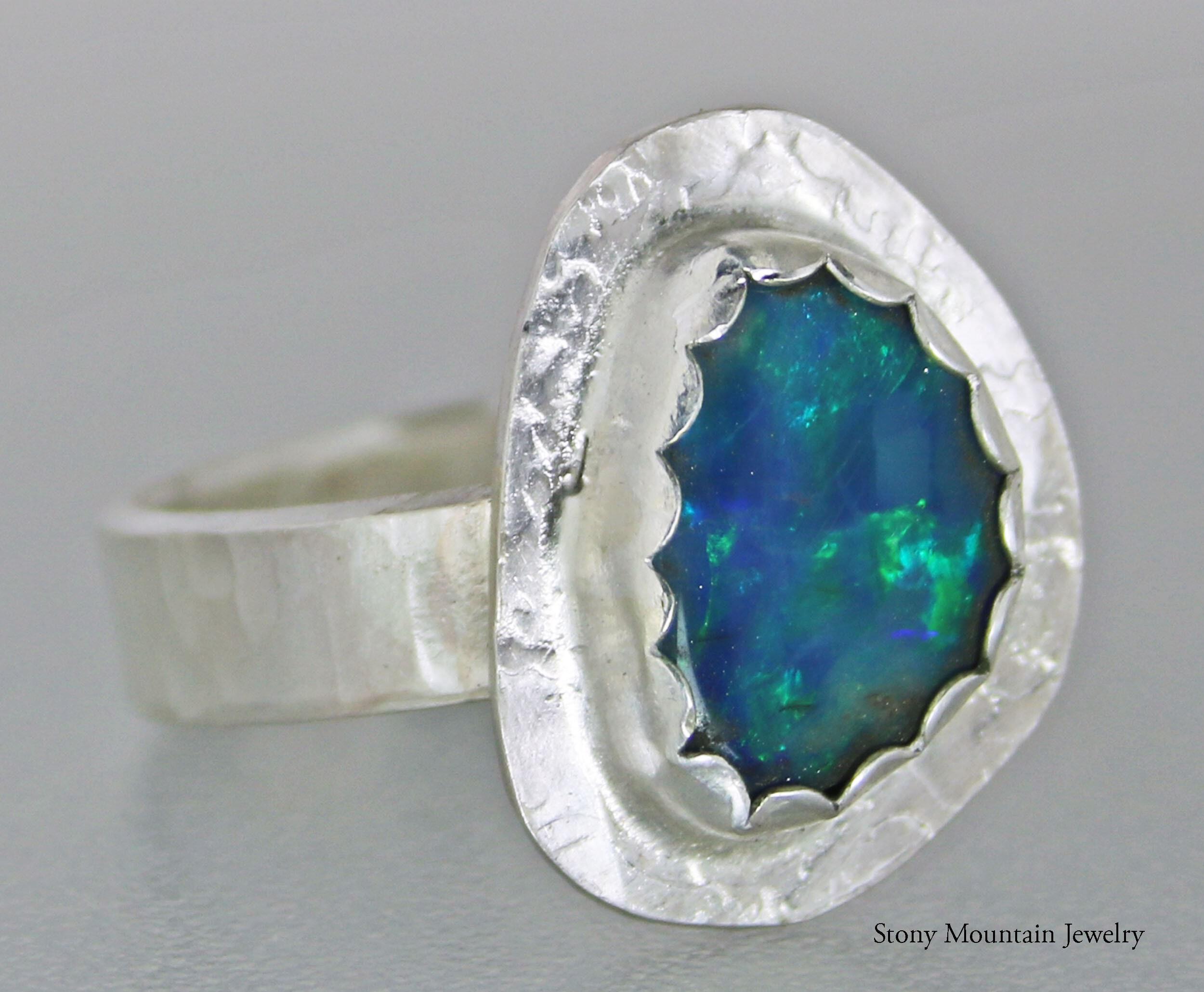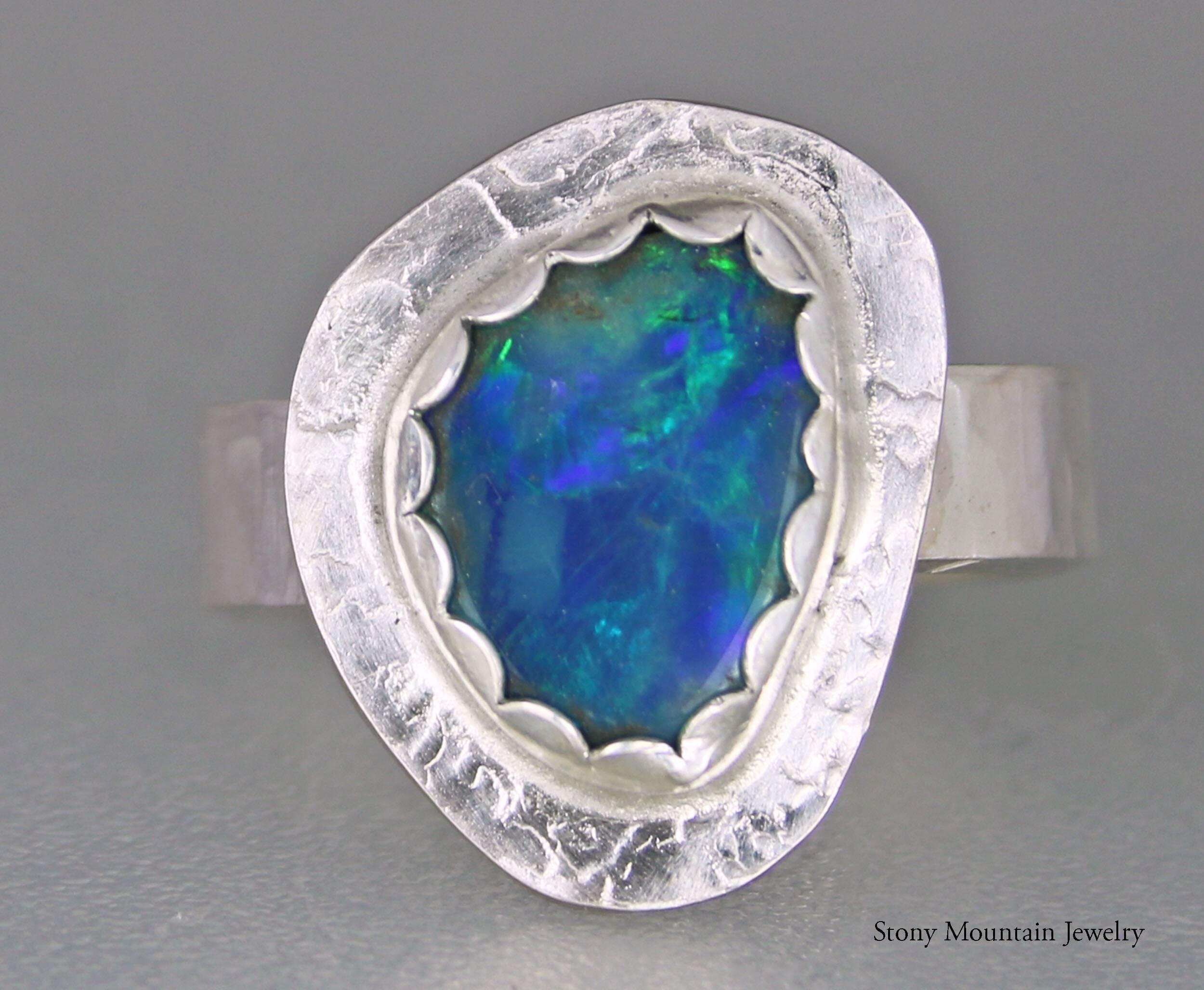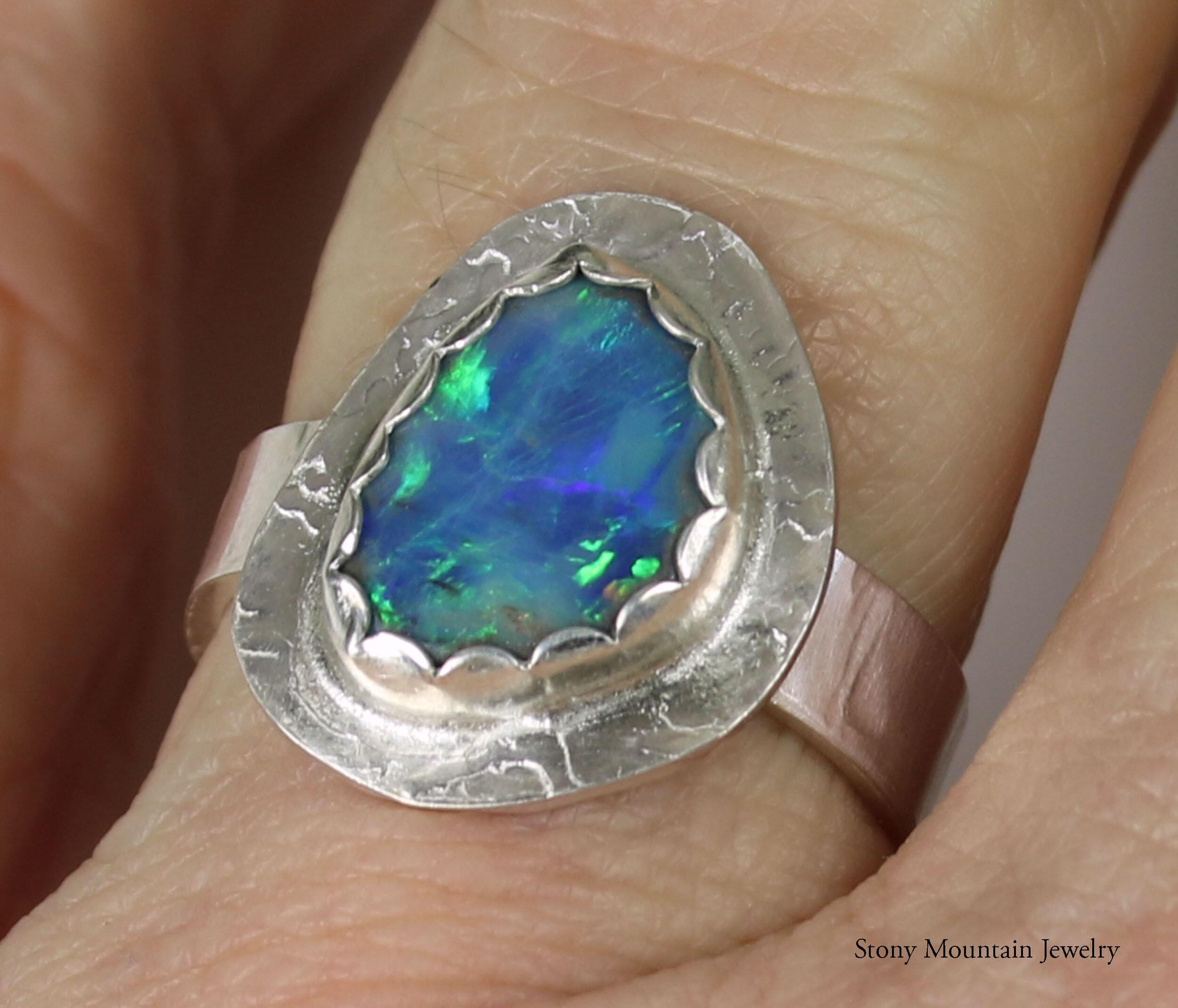 Beautiful vivid Australian Blue Opal ring. Boulder opal doublet with hints of blue green fire is bezel set in sterling silver atop a textured sterling silver surround on a hammered silver band. This ring is a size 6 3/4 and can be sized up to an 7 1/2. Original Ran Armstrong OOAK wide band designer gemstone ring. This non traditional style ring is very comfortable to wear and makes an exceptional fashion statement. A lovely October birthstone ring.Ring Size..............................6.75 Gemstone...........................Australian Blue Opal Doublet Carat Weight.......................1 carat Gemstone Dimensions.......11mm x 8mm Widest band measure.........17mm (point to point where the stone is set) Side Band measure..............5mm Back band measure.............5mm Band Thickness....................1mm Combined metals, often highly textured, with their color and character variations have long been a hallmark of Ran Armstrong’s jewelry designs. Having spent decades honing his crafts in lapidary arts, jewelry design and metal sculpting, Ran has a unique take on mixing sterling silver and high karat gold to show case fine gemstones in mini wearable sculptures. Every piece has been designed and created with the utmost care and skill. Each one is a treasure that will be Distinctively Yours. All jewelry is gift boxed. US SHIPPING: All items under $200.00 are shipped via USPS First Class Mail, with tracking. Shipping upgrade are available at checkout. All items over $200.00 are shipped USPS First Class Mail, with Signature Confirmation to the United States. INTERNATIONAL SHIPPING: Buyer is responsible for any and all customs fees and/or VAT taxes. At this time, only items under $400.00 ship internationally. Those items ship USPS First Class Mail, with tracking. Shipping upgrades are available at checkout. JOIN OUR VIP CLUB for ETSY EARLY DISCOUNTS AND SPECIAL COUPON CODES - JUST COPY & PASTE INTO A NEW BROWSER TAB: http://eepurl.com/gEvNRj