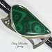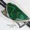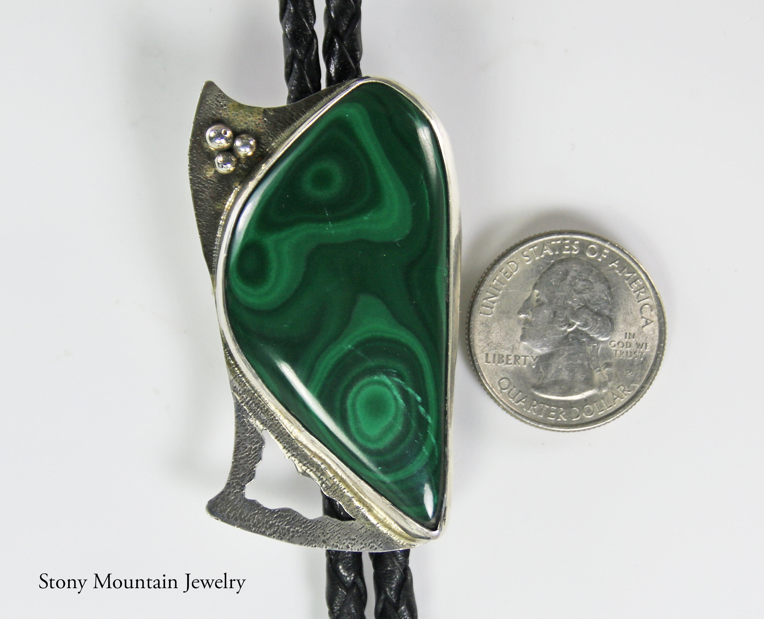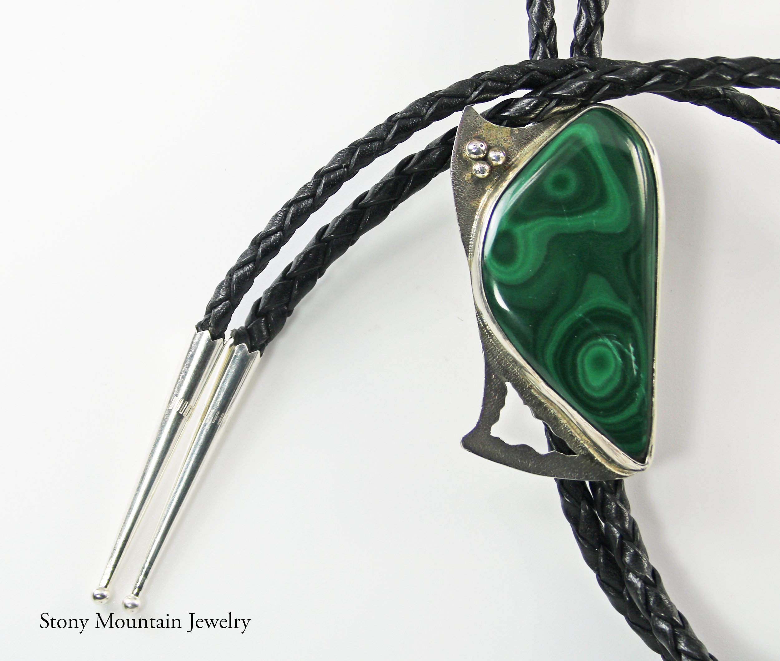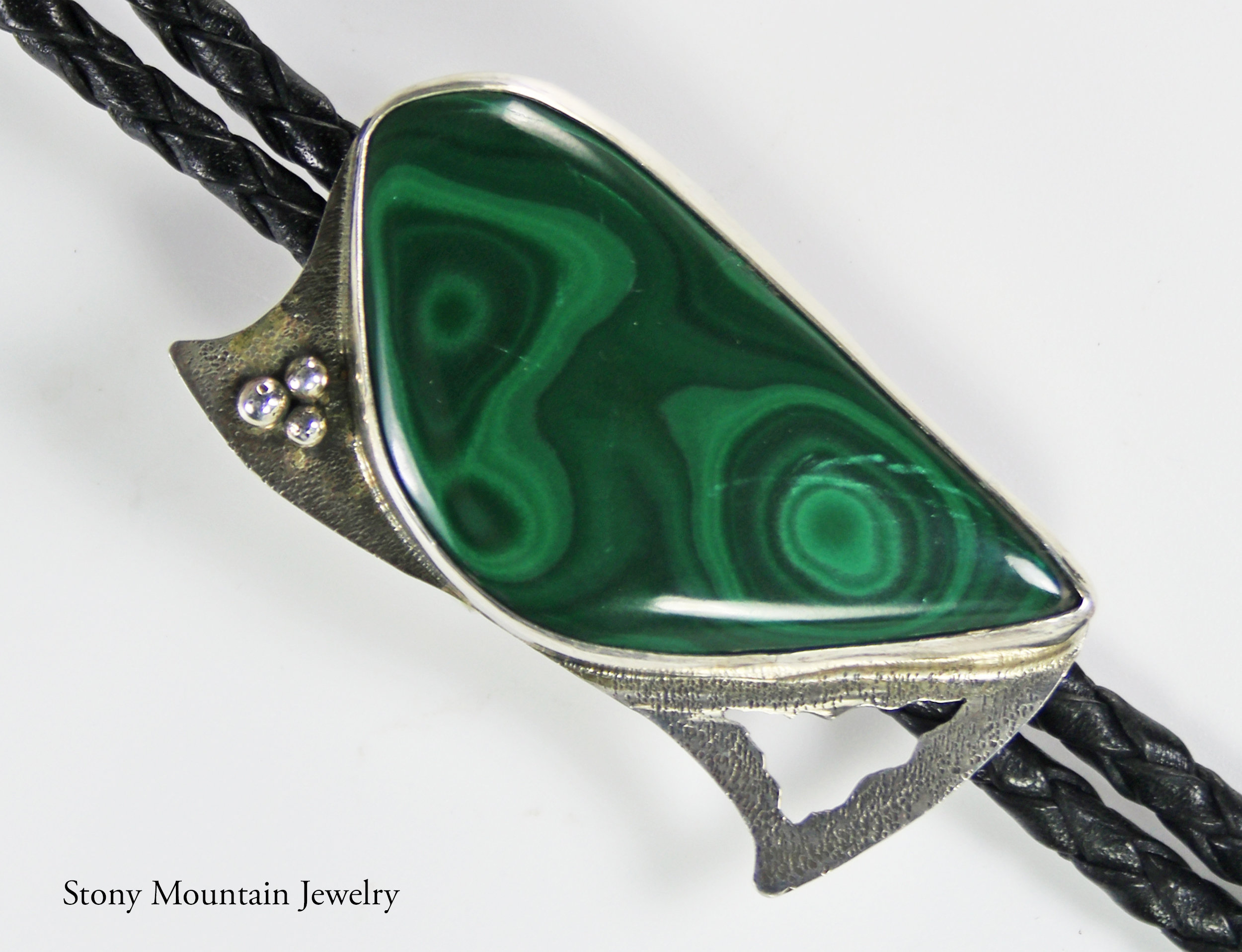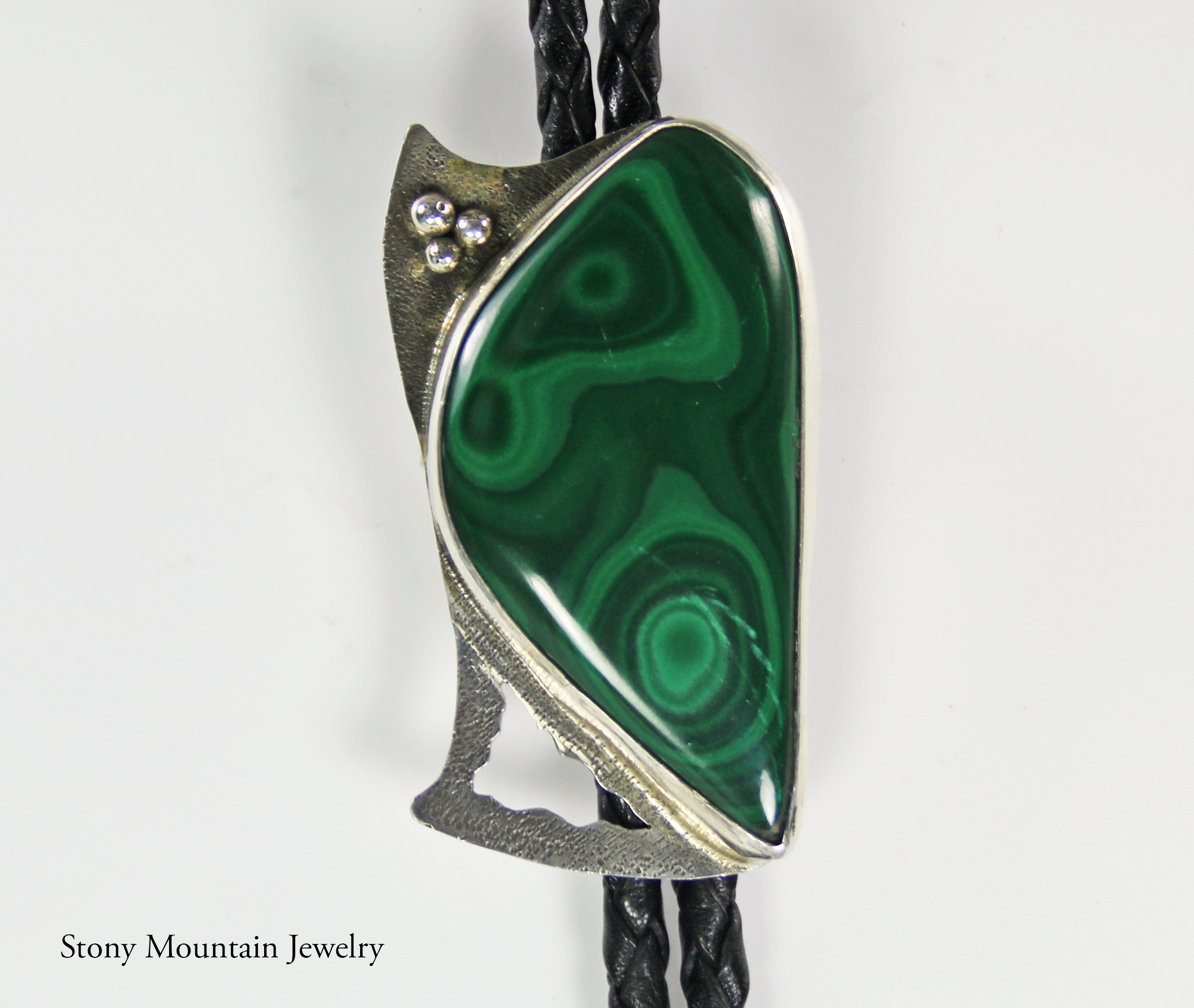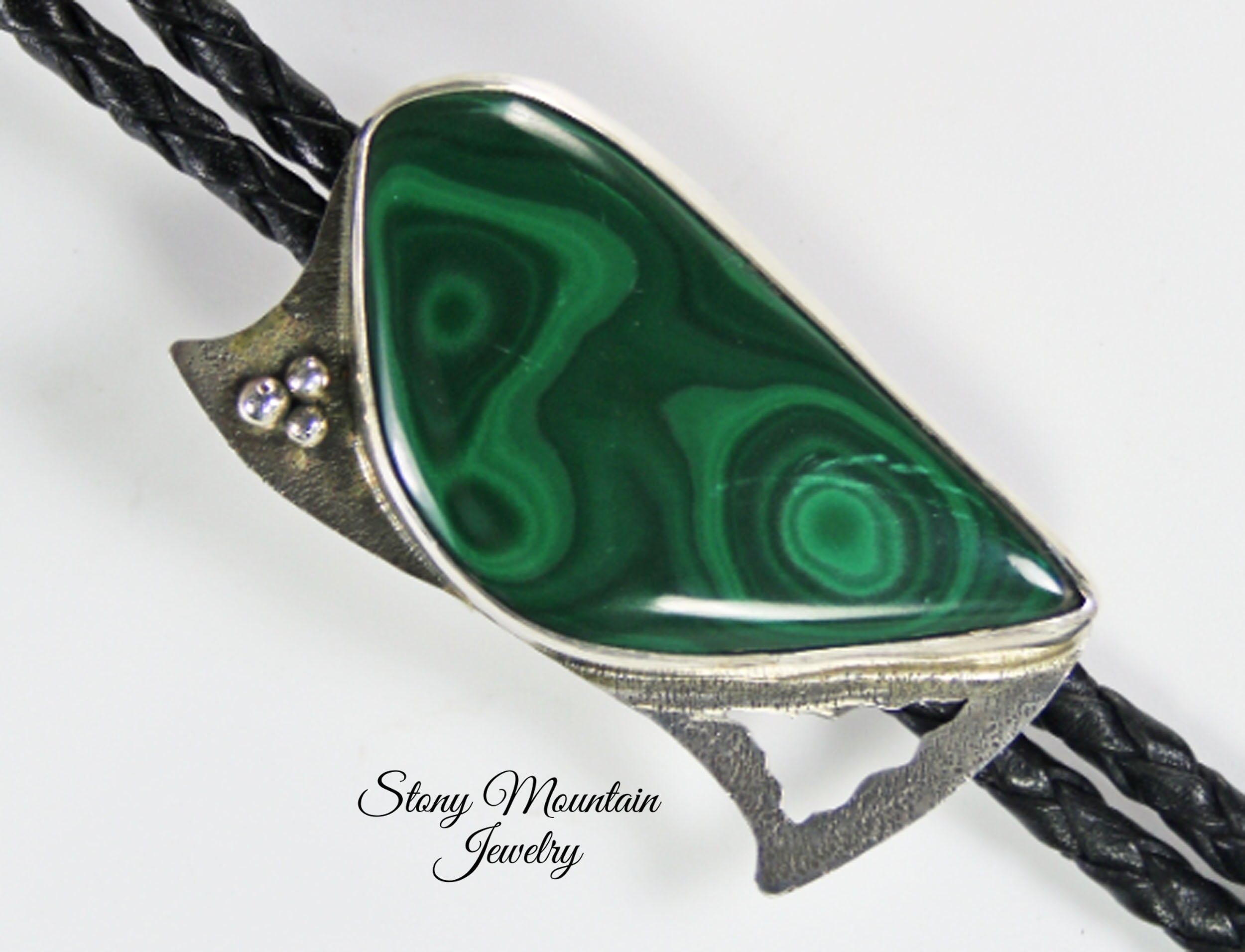 Contemporary Bolo Tie. No rules - this beautiful bolo can be worn by men or women. A wonderful alternative for formal attire or a funky bit of dress up with a tee shirt - NO rules apply for Bolo Ties! Hand cut freeform Malachite is artistically set in sterling silver. The handcrafted slide uses friction rather than a mechanical device. This slide will keep your tie securely in place without crimping the leather cord. Lapidary work, design and fabrication all done by Ran.