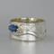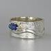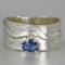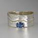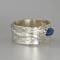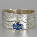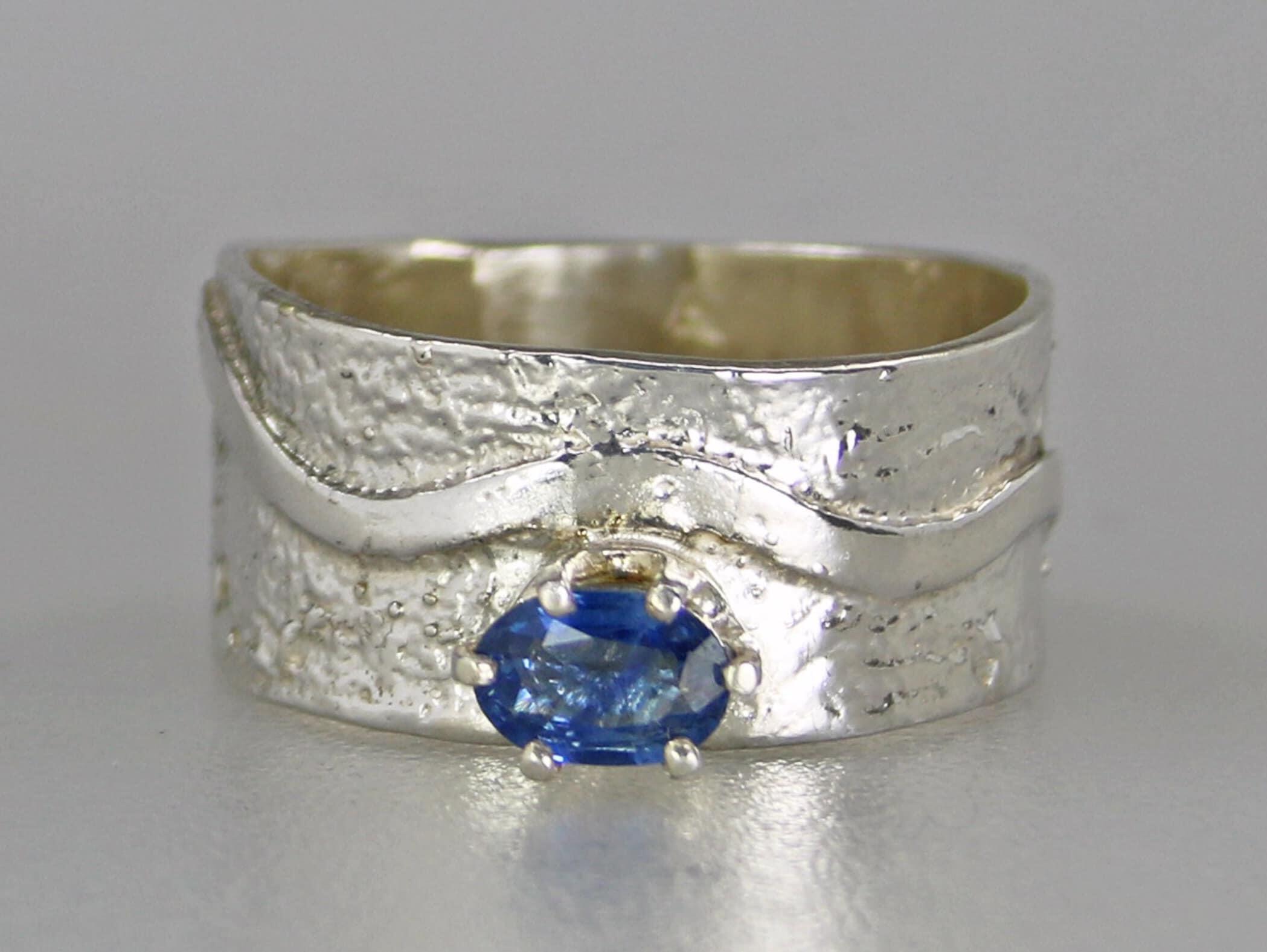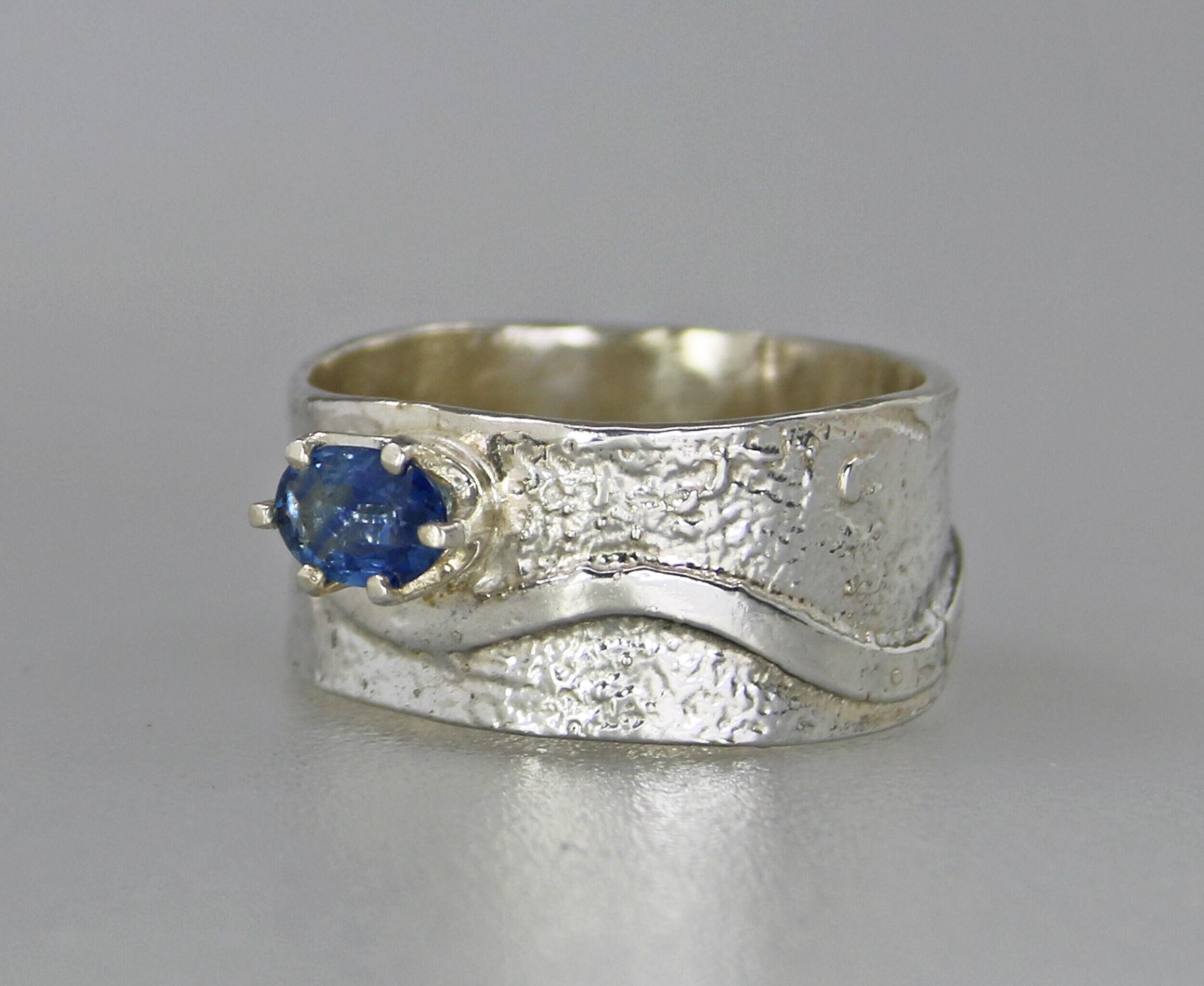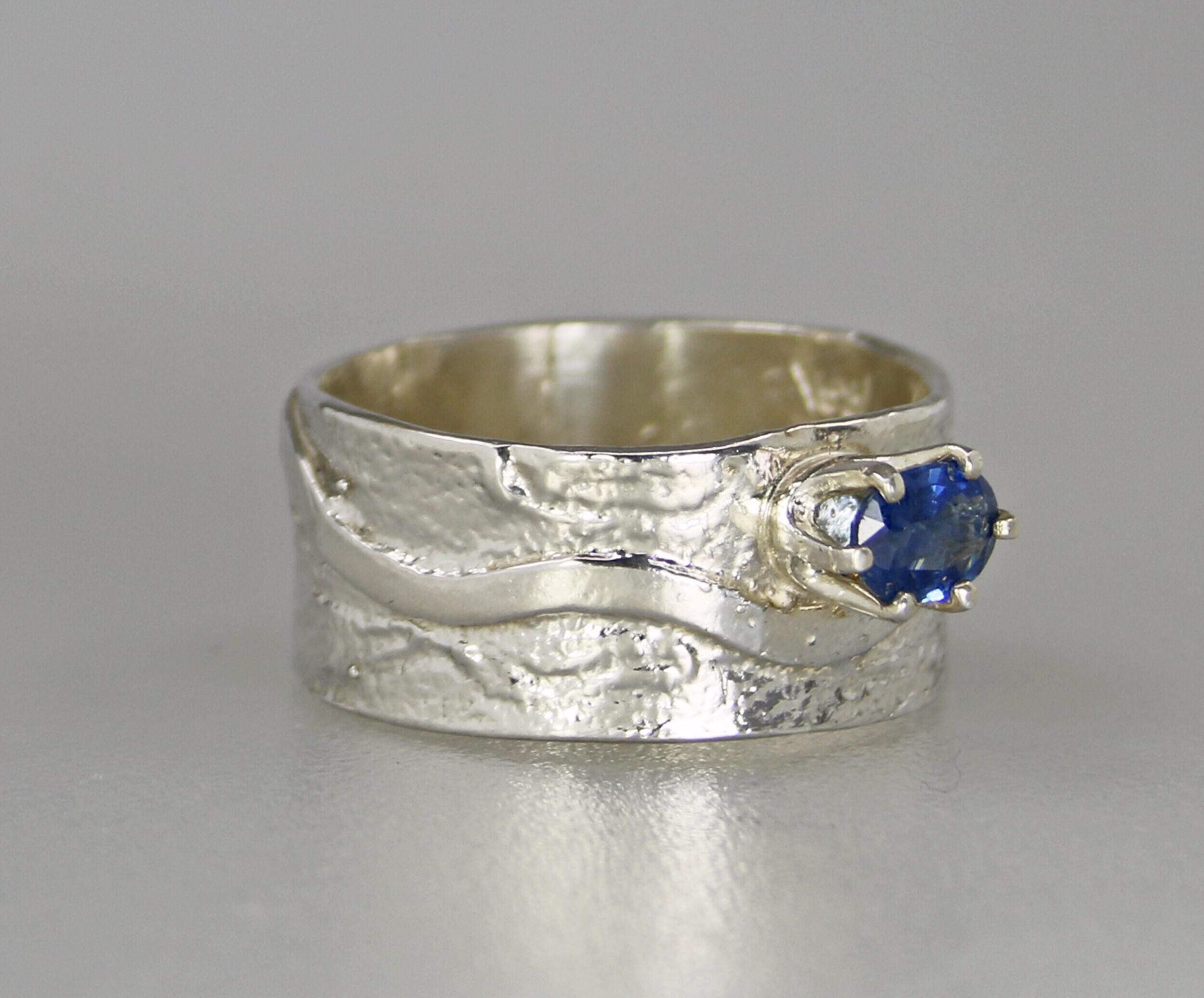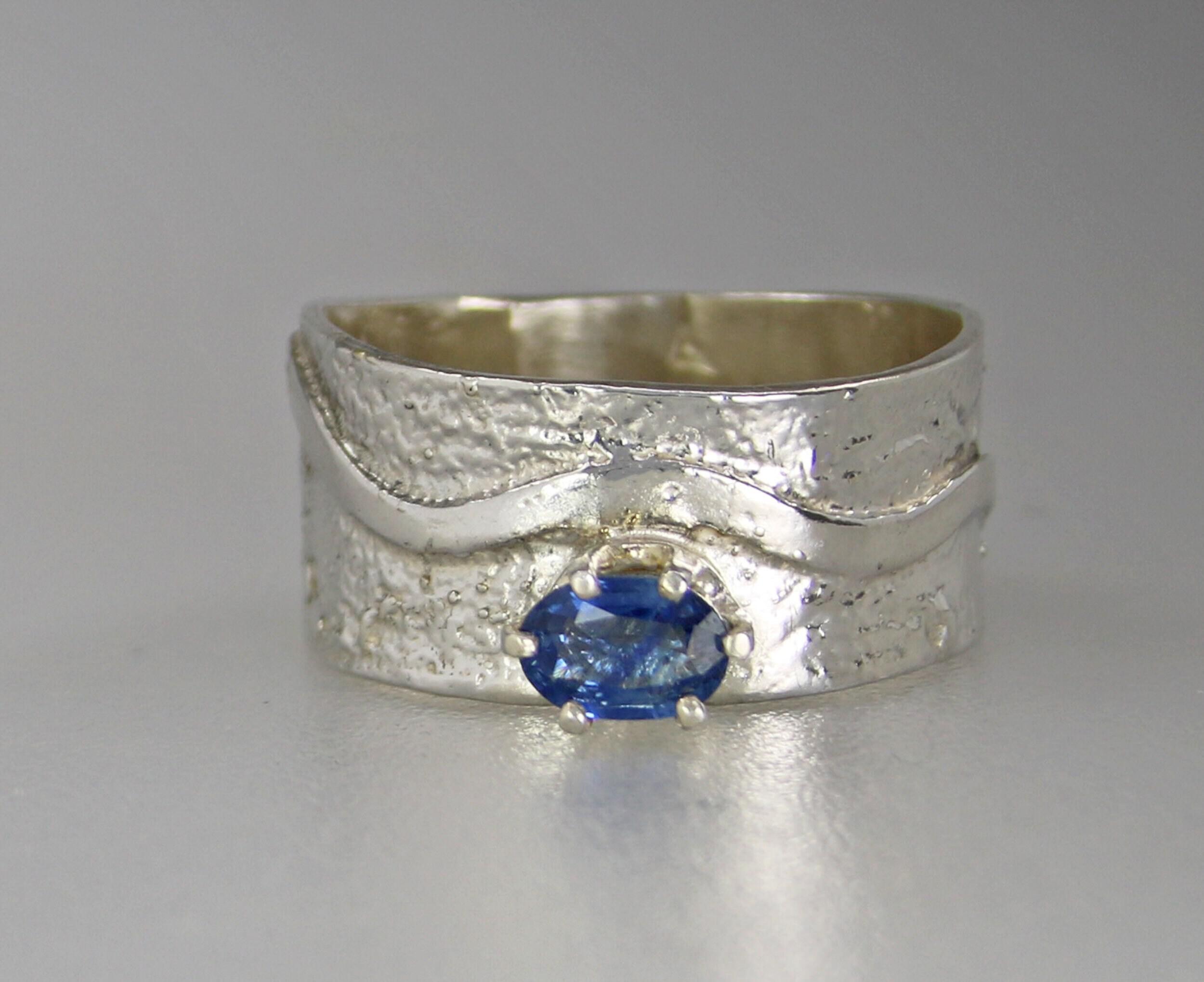 Lovely Blue Sapphire Ring. Delicate sapphire in sterling silver prong setting atop a textured sterling silver wide band. Original Ran Armstrong designer gemstone ring. This non traditional style ring is very comfortable to wear; an exceptional fashion statement. Sapphire is the September birthstone.Ring Size..............................8 - wide band Gemstone...........................Blue Sapphire Carat Weight.......................0.5 carats Gemstone Dimensions.......6mm x 4mm Widest band measure..........10mm (point to point where the stone is set) Band Width measure............10mm Band Thickness....................1.2mm Beautiful high quality faceted gemstones set in sterling silver. This collection features rings bands with playful textures achieved through a variety of methods. Master metalsmith Ran Armstrong has spent decades honing his crafts in lapidary arts, jewelry design and metal sculpting. He has developed a series of patterns which he artistically interchanges in narrow and wide band rings. Each ring is made one at a time and given extra care to be your special treasure. All jewelry is gift boxed. US SHIPPING: All items under $200.00 are shipped via USPS First Class Mail, with tracking. Shipping upgrade are available at checkout. All items over $200.00 are shipped USPS First Class Mail, with Signature Confirmation to the United States. INTERNATIONAL SHIPPING: Buyer is responsible for any and all customs fees and/or VAT taxes. At this time, only items under $400.00 ship internationally. Those items ship USPS First Class Mail, with tracking. Shipping upgrades are available at checkout.