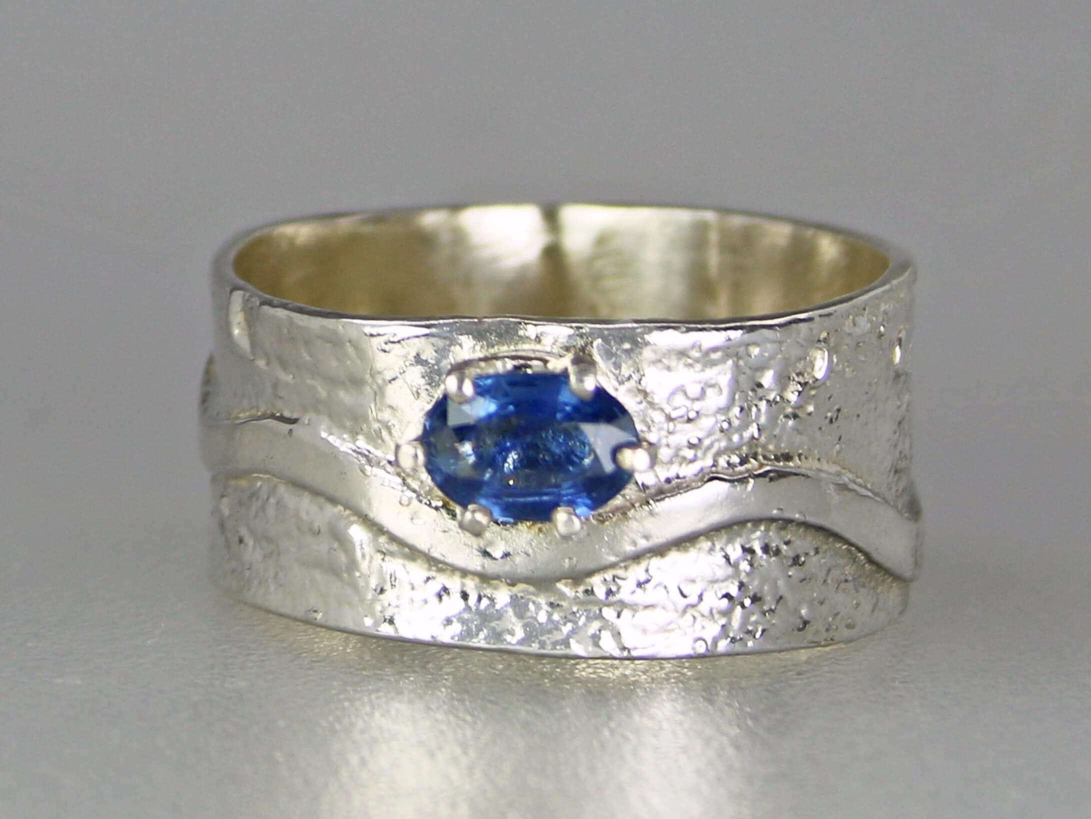 Genuine Blue Sapphire Ring, Sculpted Wide Band Sterling Silver Sapphire Ring, September Birthstone Ring