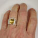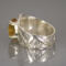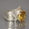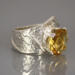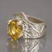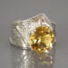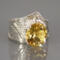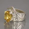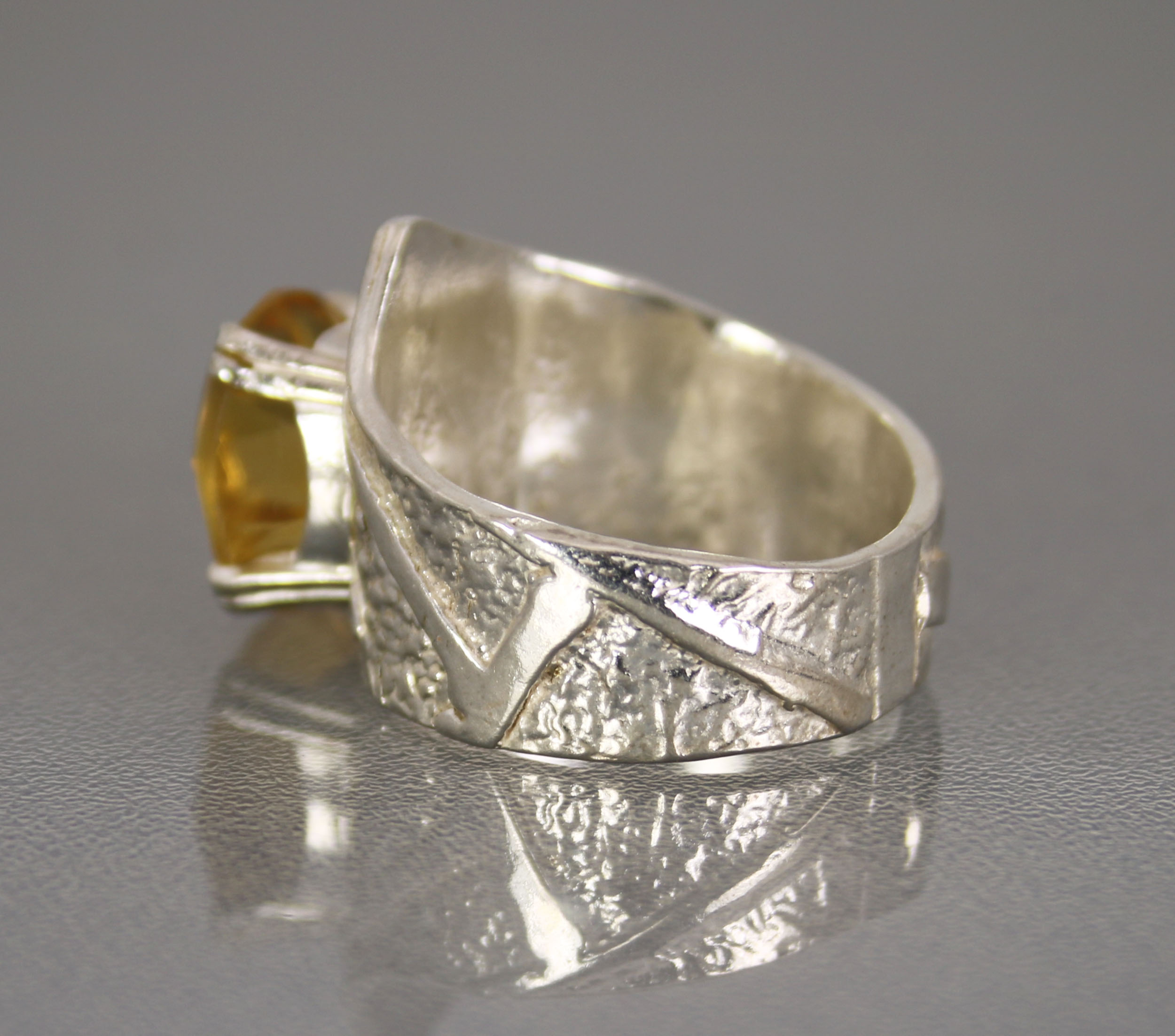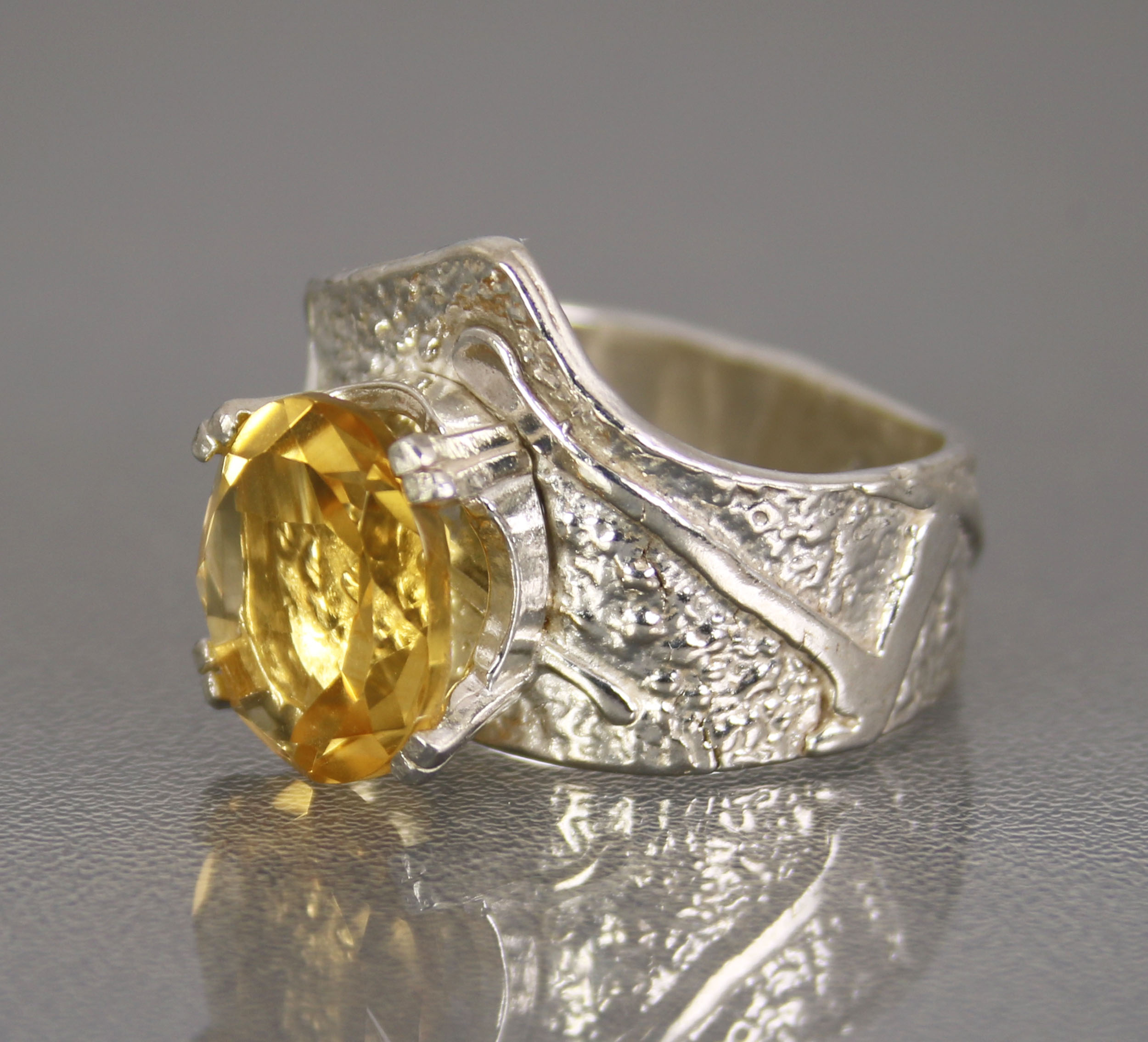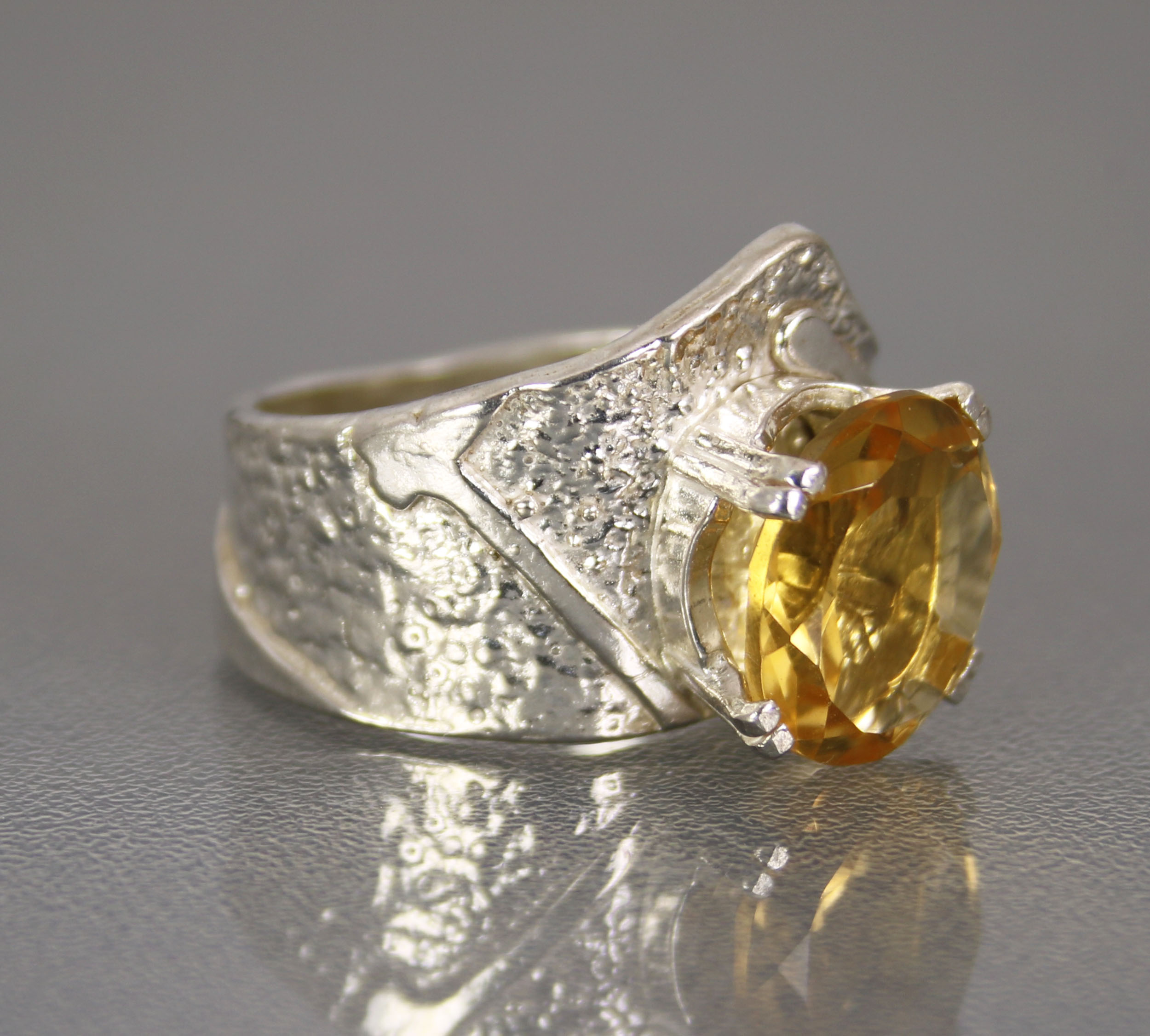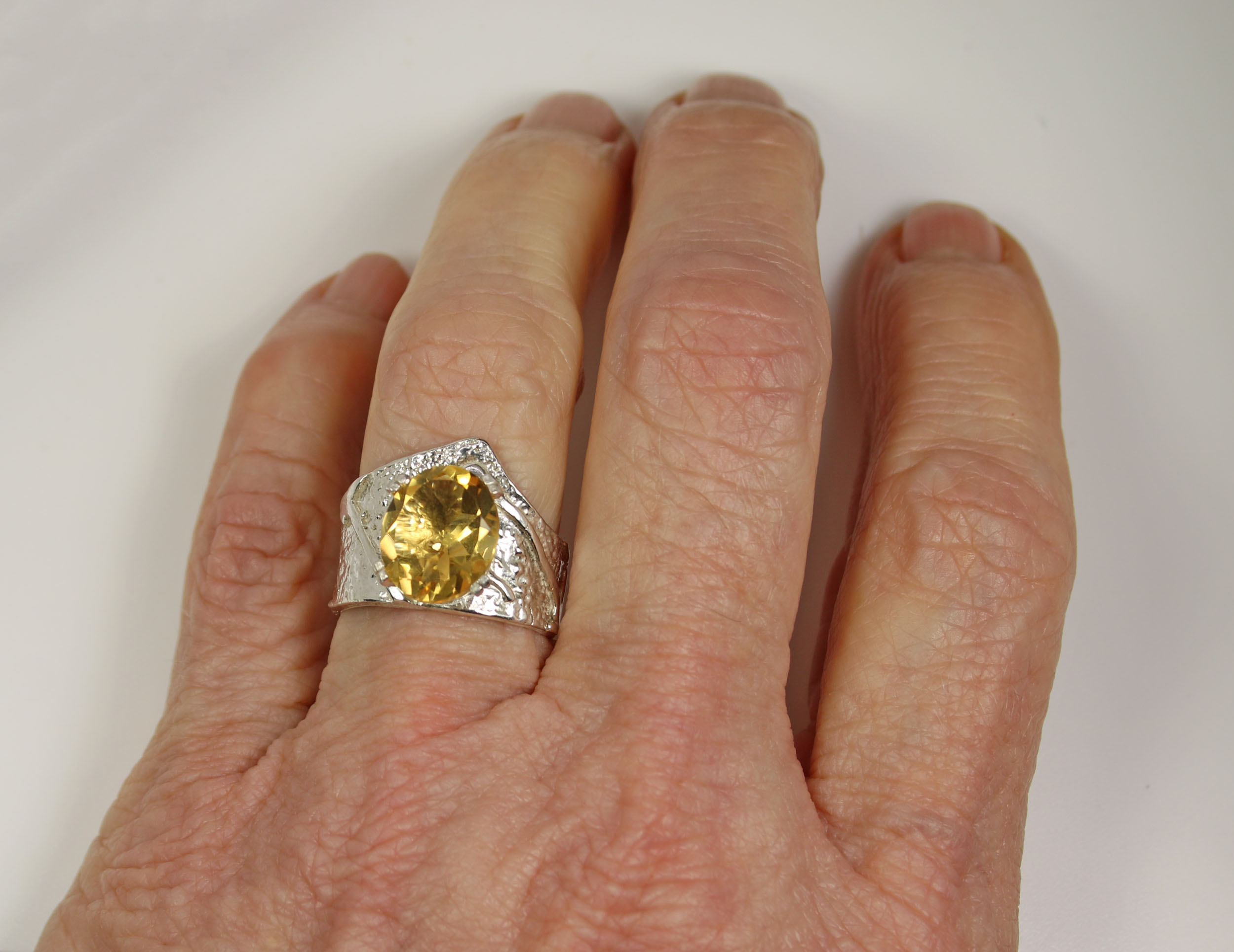 Dazzling 4 carat golden citrine gemstone set in sterling silver on a textured band. This unique ring is a perfect engagement ring or wedding ring for anyone with distinctive style. This non traditional style ring is very comfortable to wear and makes an exceptional fashion statement. Designed and fabricated by Ran Armstrong.