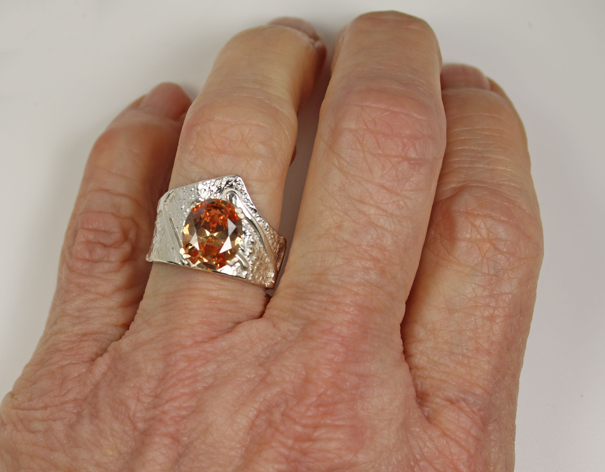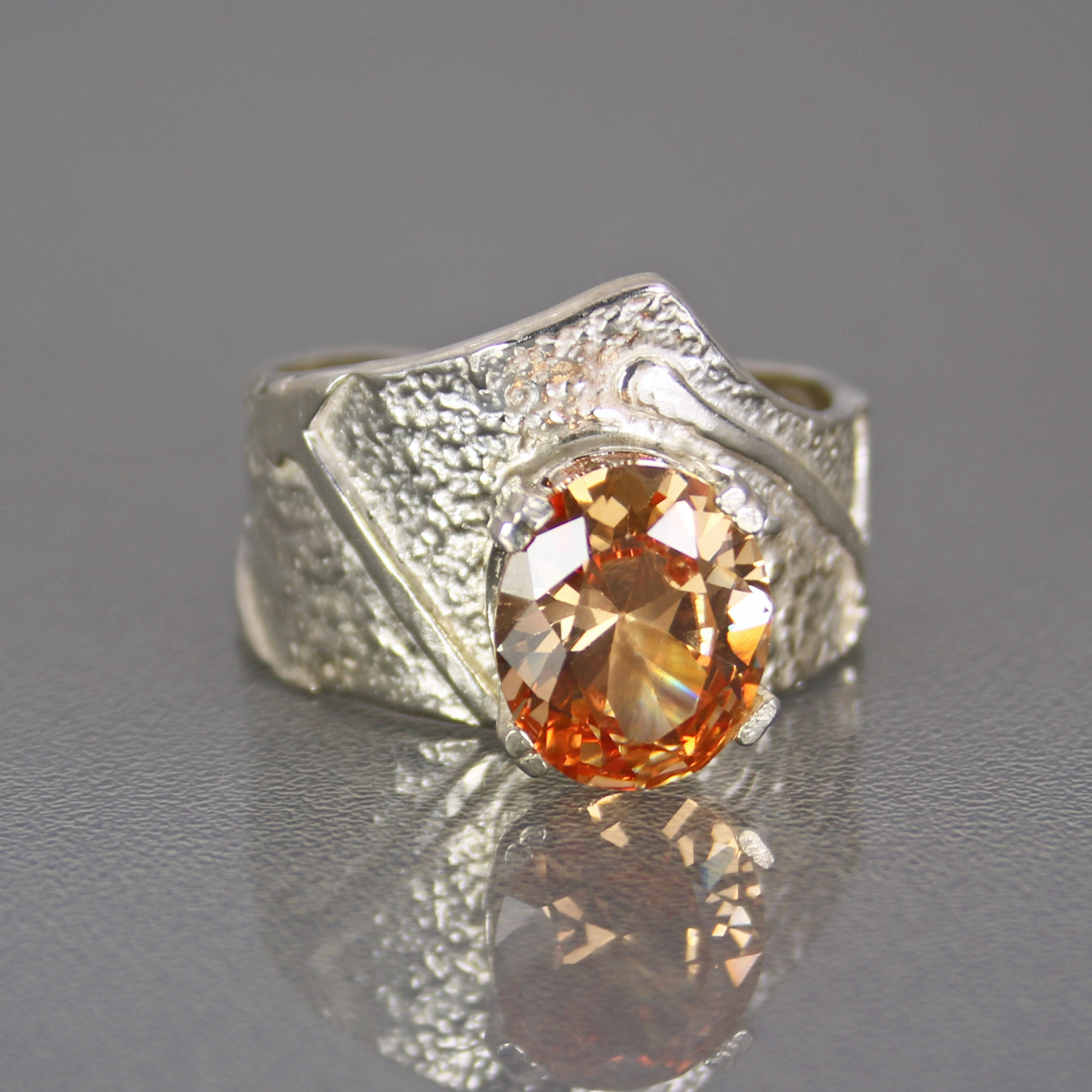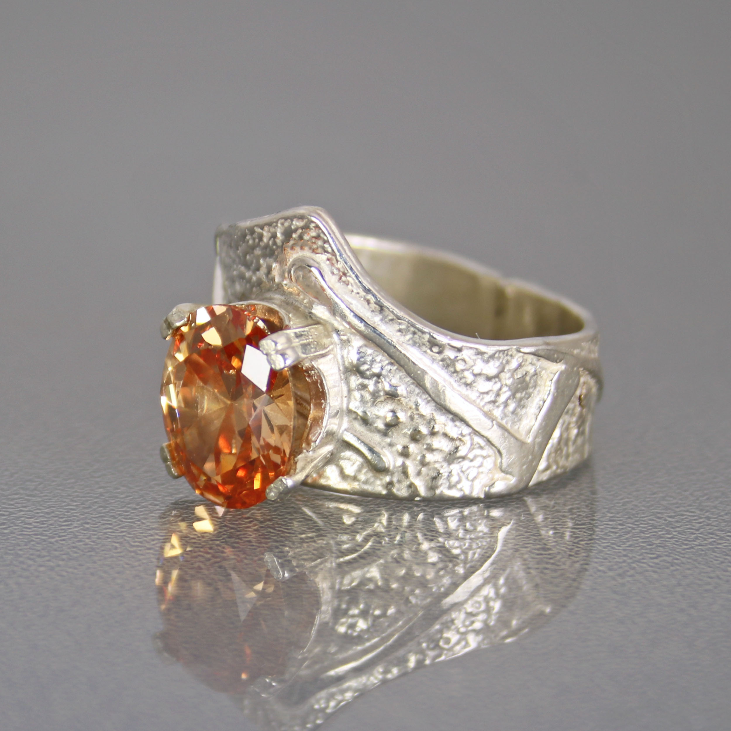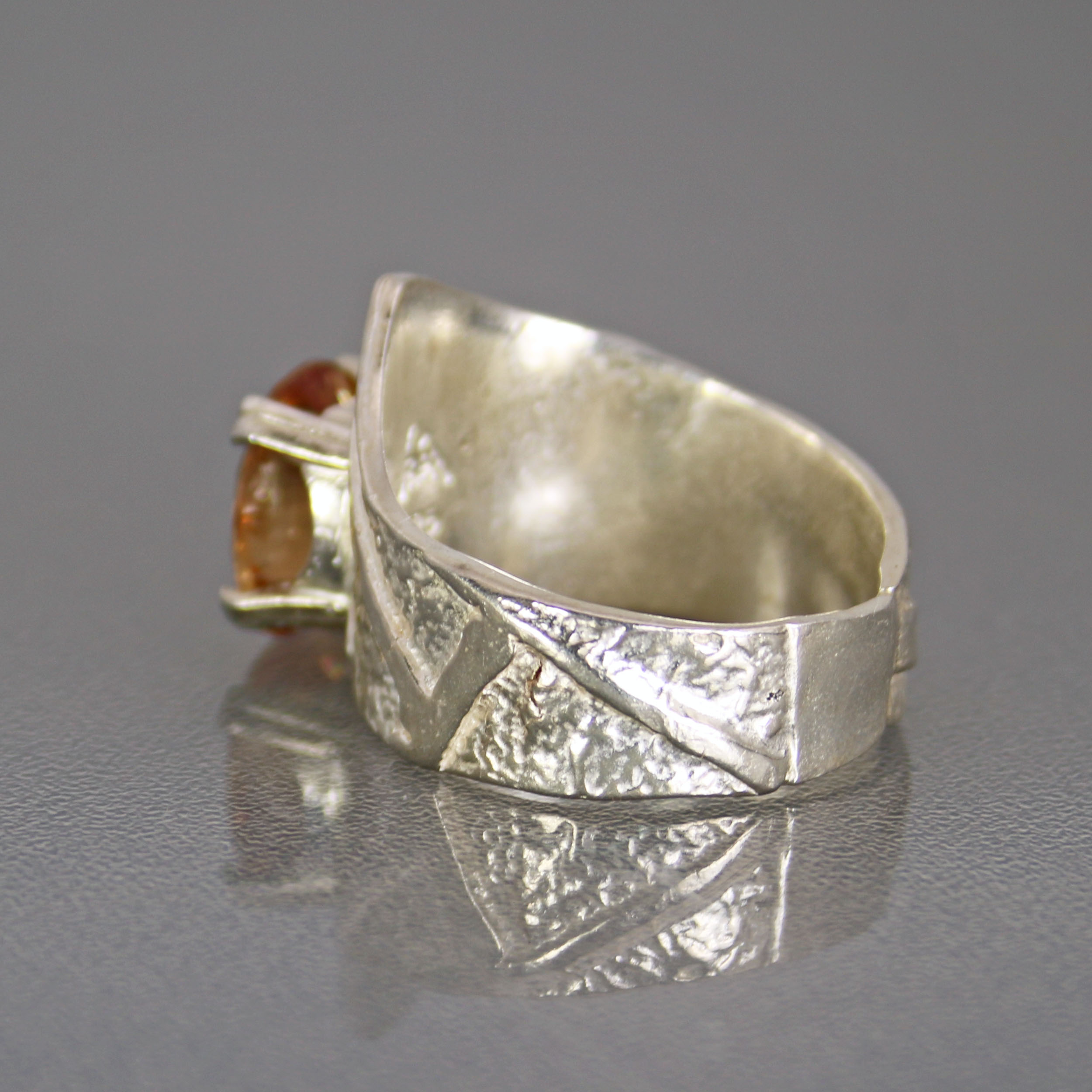 Dazzling 3 carat Rio Grande Citrine gemstone set in sterling silver on a textured band. This unique ring is a perfect engagement ring or wedding ring for anyone with distinctive style. This non traditional style ring is very comfortable to wear and makes an exceptional fashion statement. Designed and fabricated by Ran Armstrong.