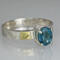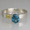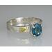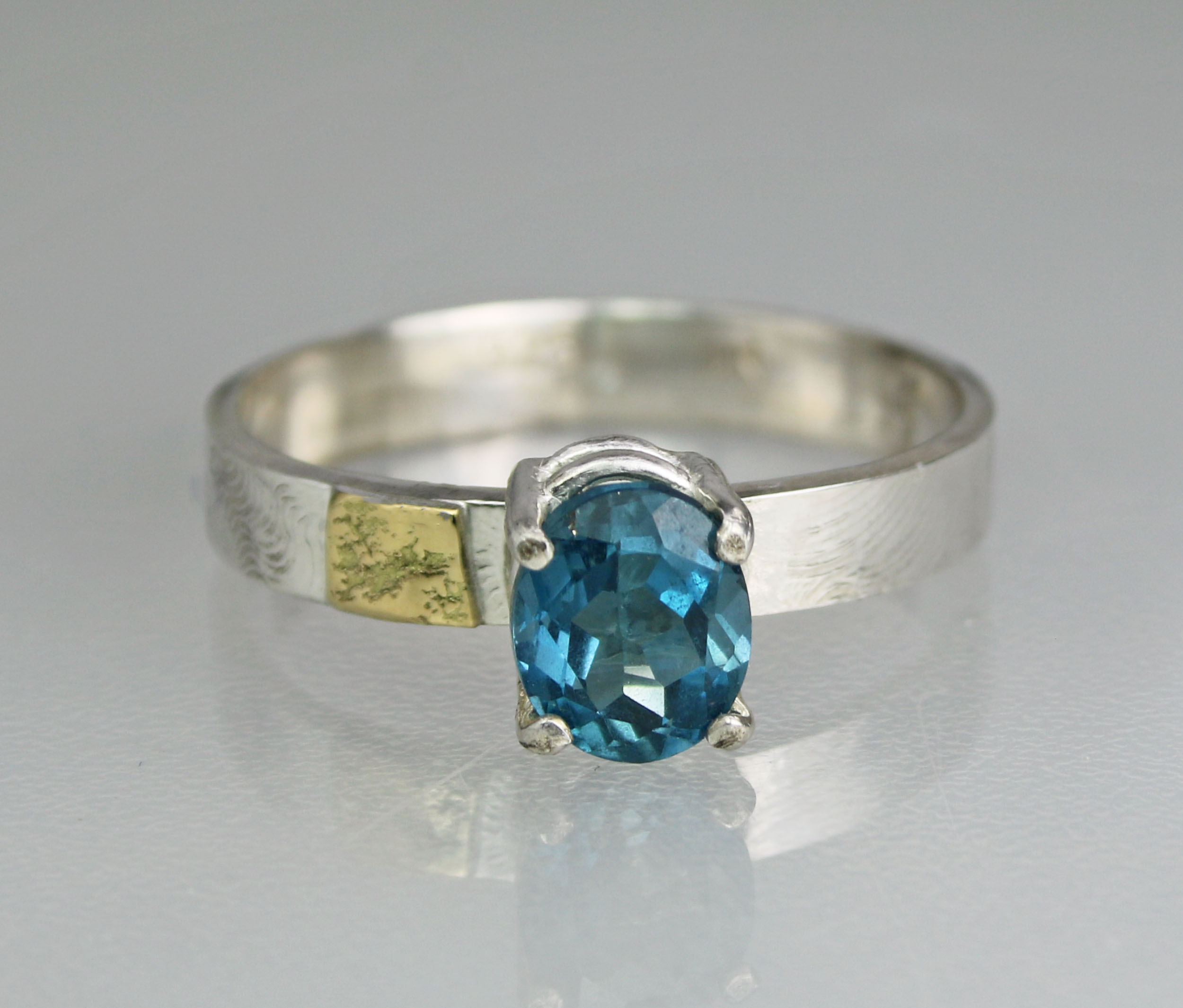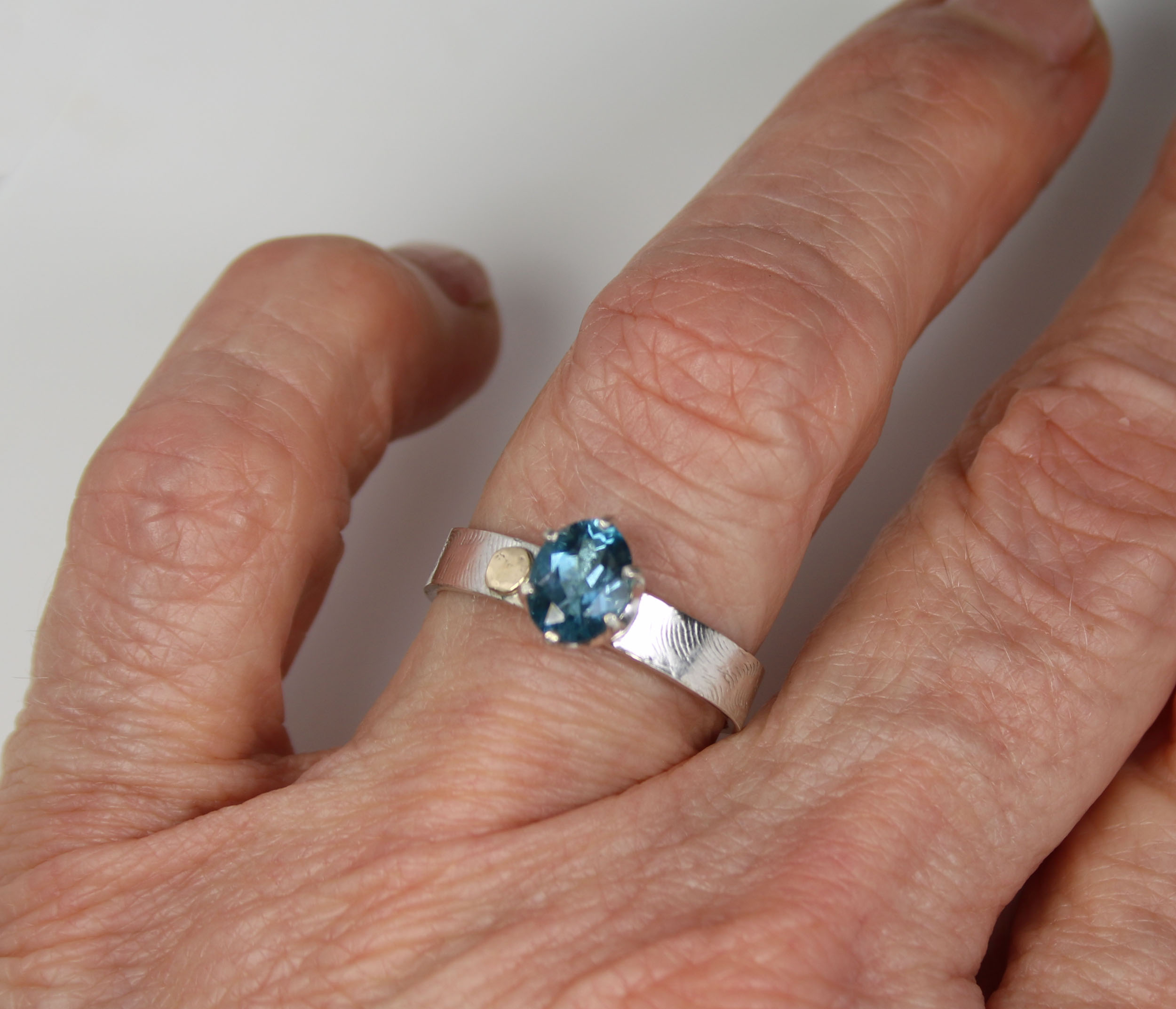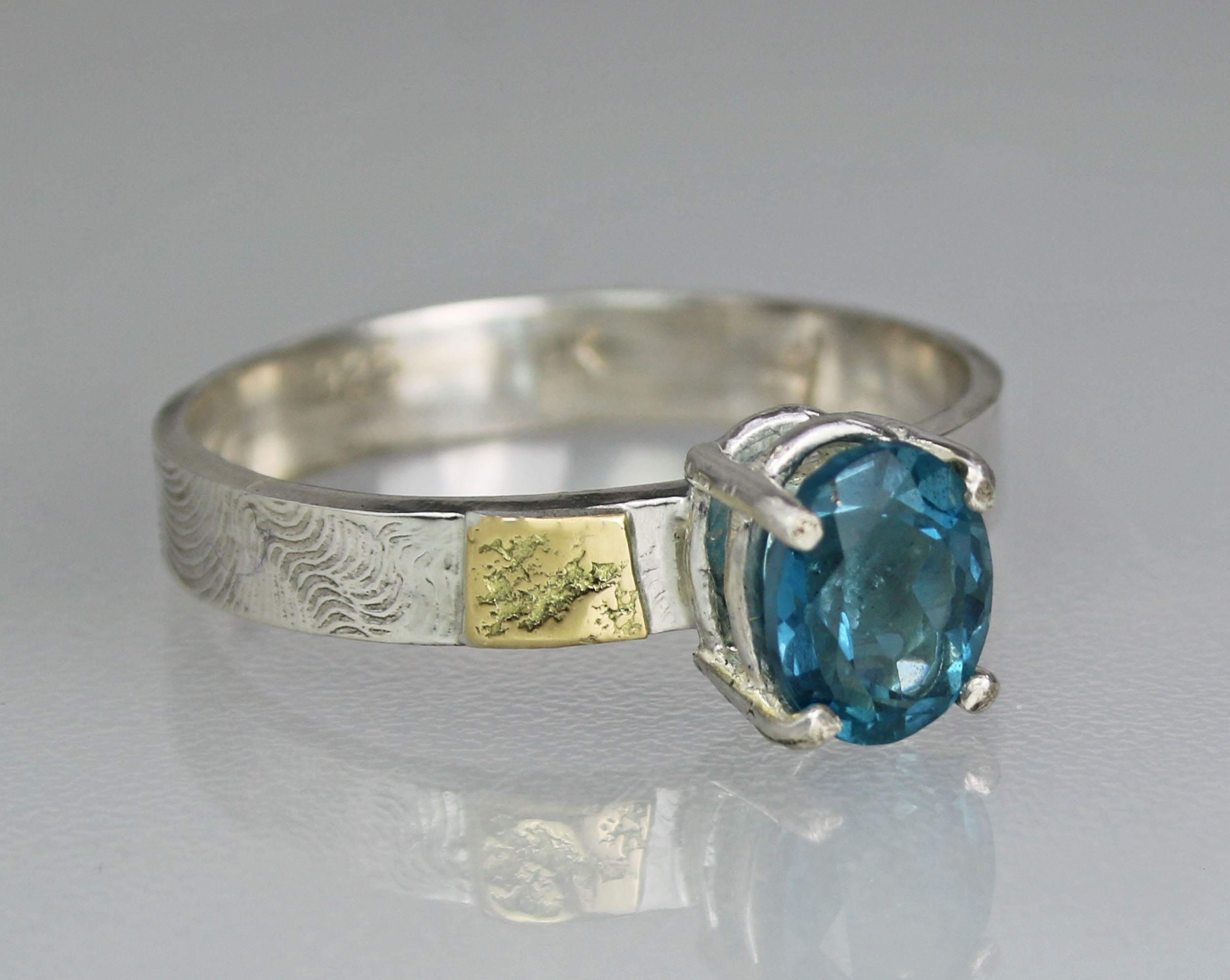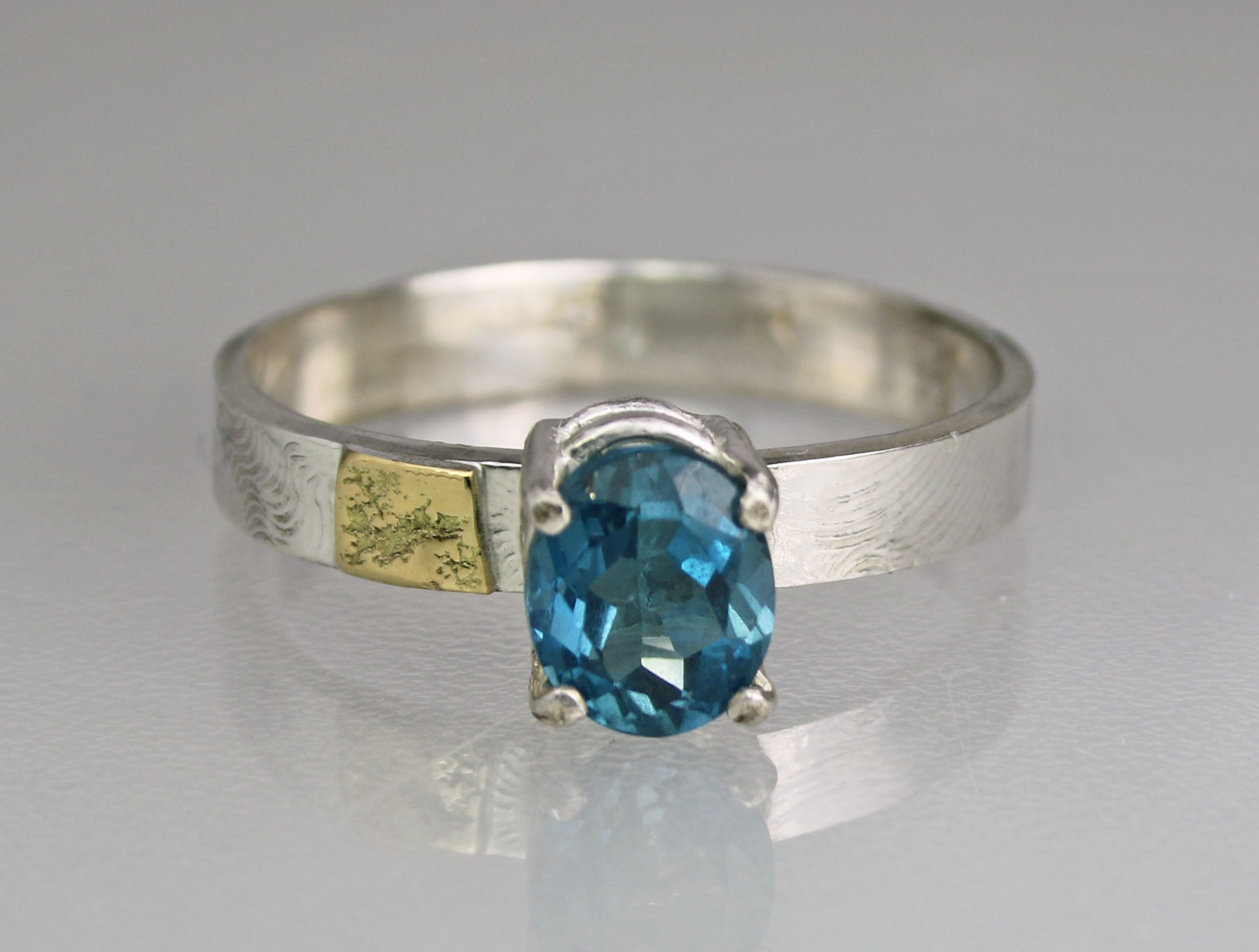Stunning London Blue Topaz gold & silver ring. Brilliant Blue Topaz set in sterling silver textured band accented with a 14kt gold splat. A very lovely oval cut, blue gemstone ring to wear for all occasions. Comfortable to wear; an exceptional fashion statement.