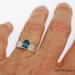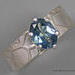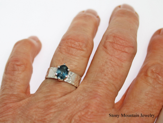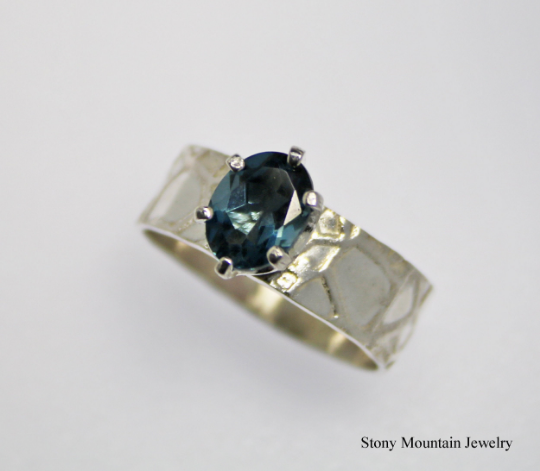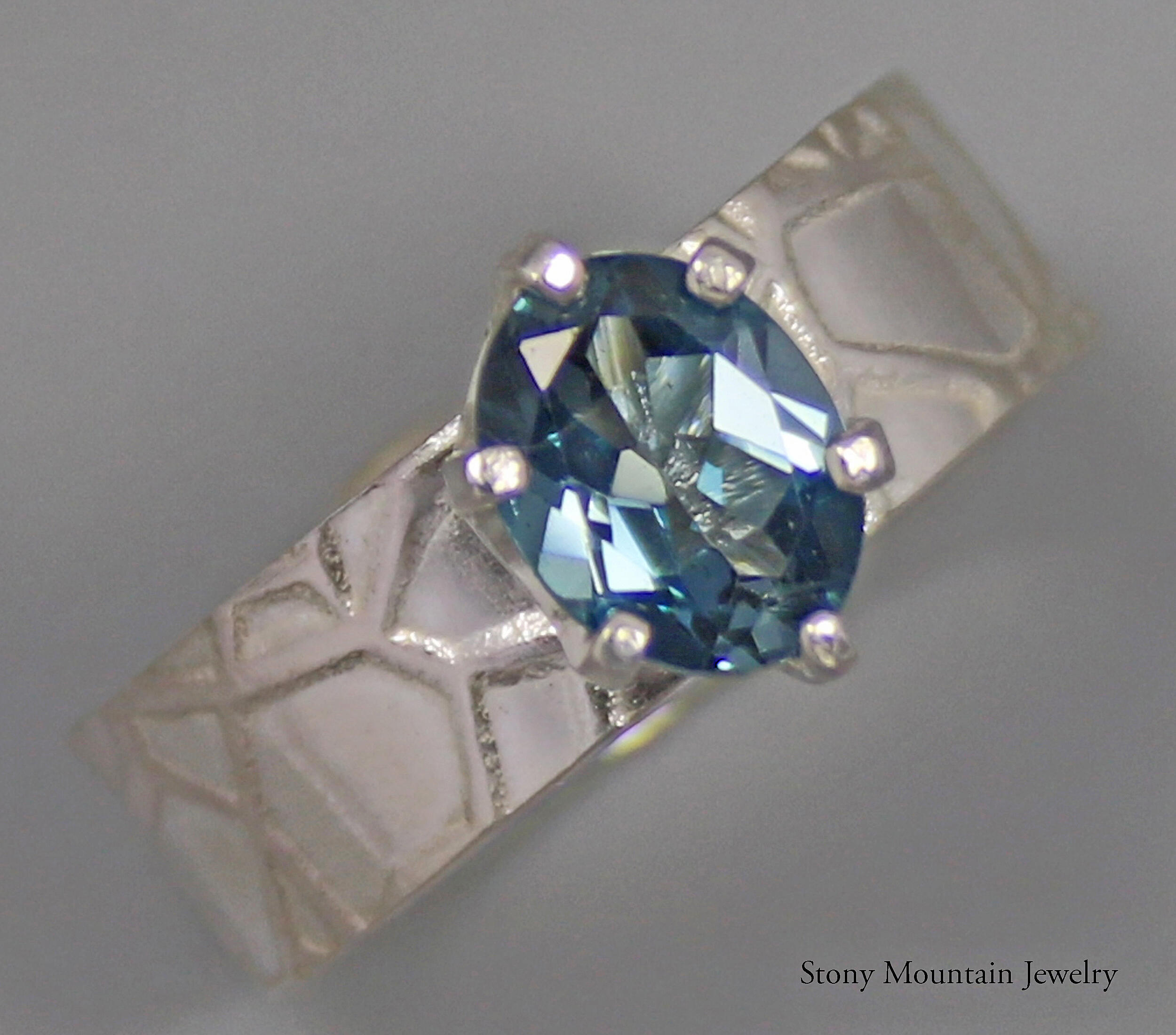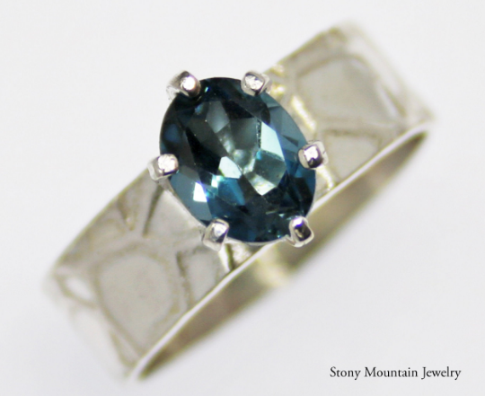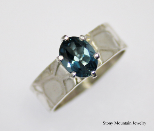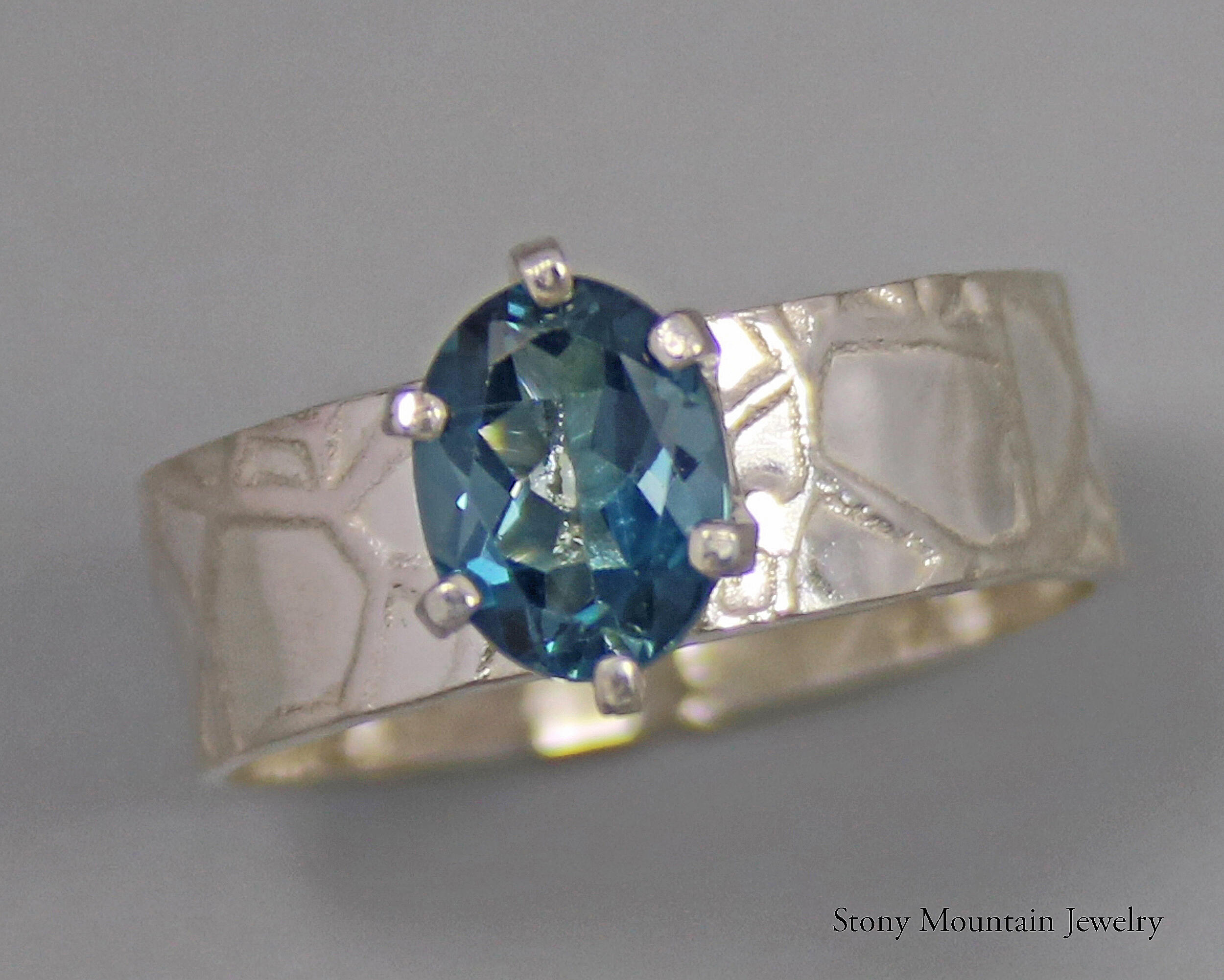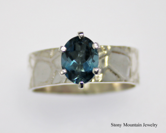 Sparkling, oval cut London Blue Topaz set in a six prong sterling silver mount will be set on your choice of textured sterling silver band. The ring in the photos is on our Cobblestone pattern sterling silver band. Select the one YOU like the most. on our swirling clouds pattern sterling silver band. Original Ran Armstrong designer gemstone ring. This non traditional style ring is very comfortable and fun to wear; an exceptional fashion statement to dress up of down. The perfect gift to treat yourself or that special someone.