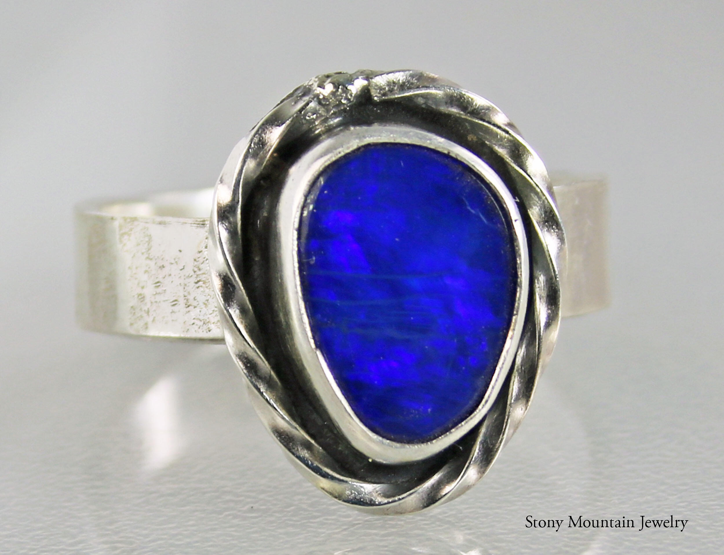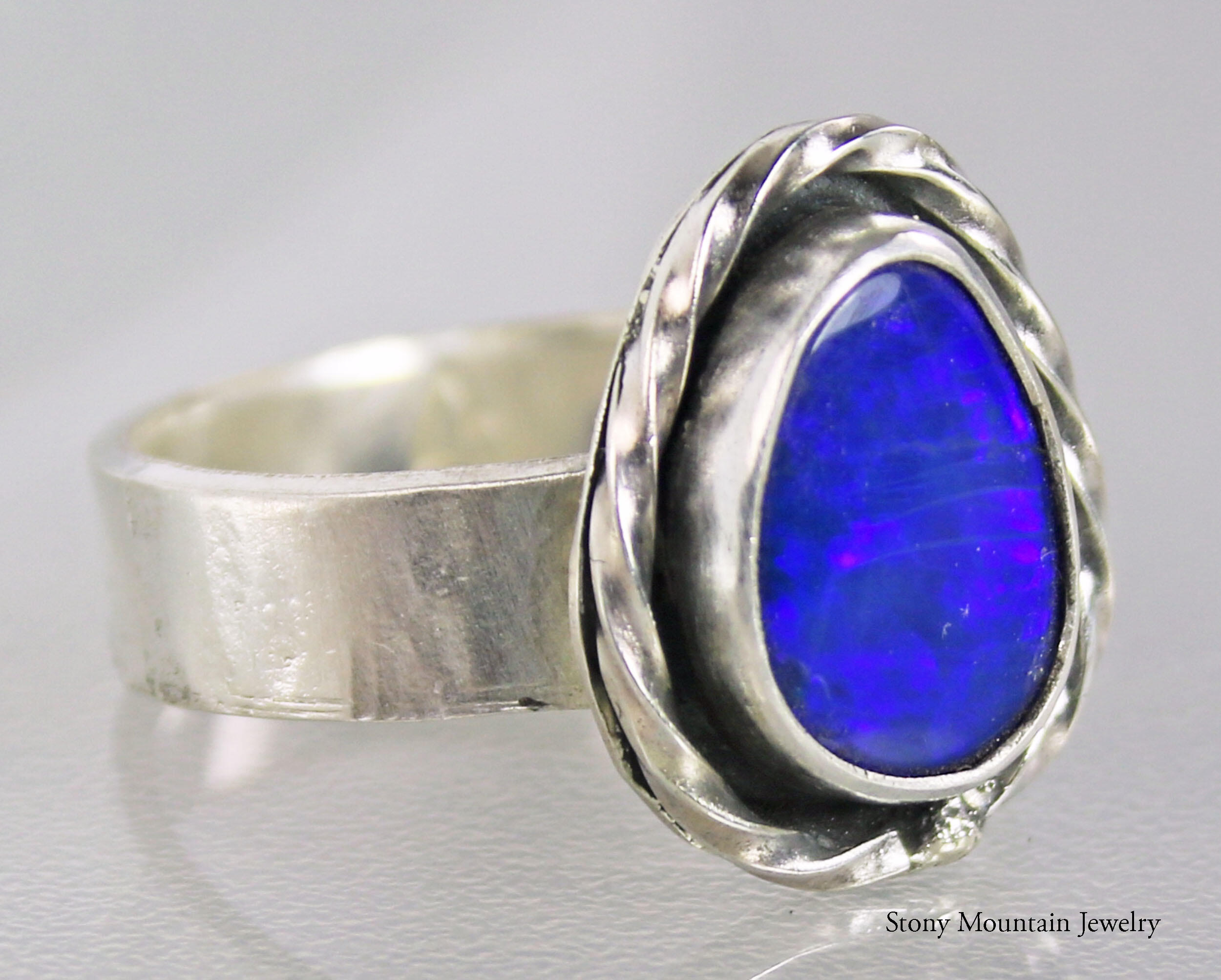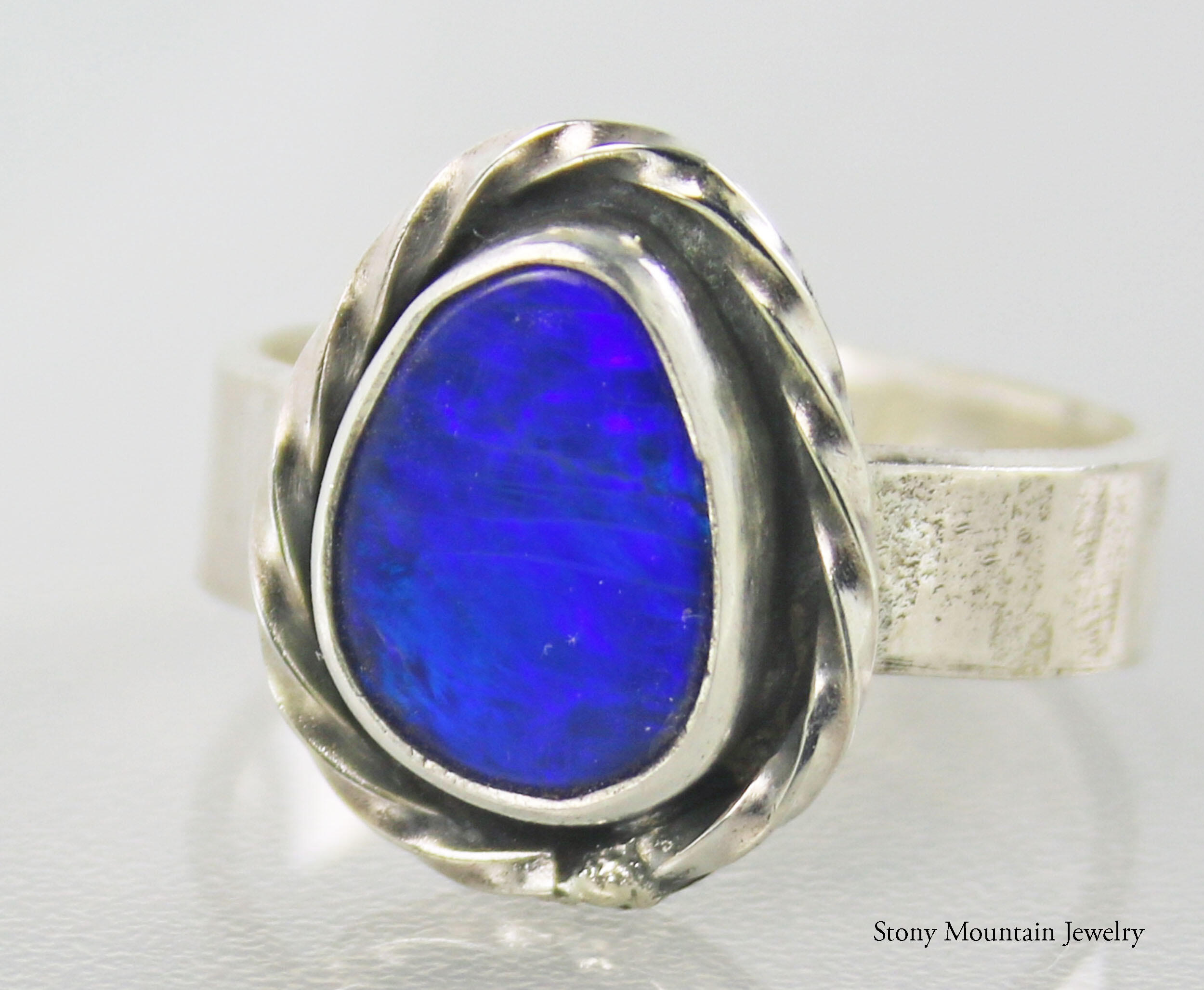 Beautiful blue Australian Boulder Opal ring flashes hints of purple. Set in a sterling silver bezel with a highly textured sculptural surround on a hammered sterling silver band. The light patina accentuates the sculpted design. The beauty is a size 7 and can be sized up to a 7 3/4. Original Ran Armstrong designer gemstone ring. This non traditional style ring is very comfortable to wear and makes an exceptional fashion statement.