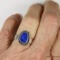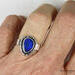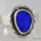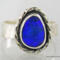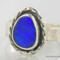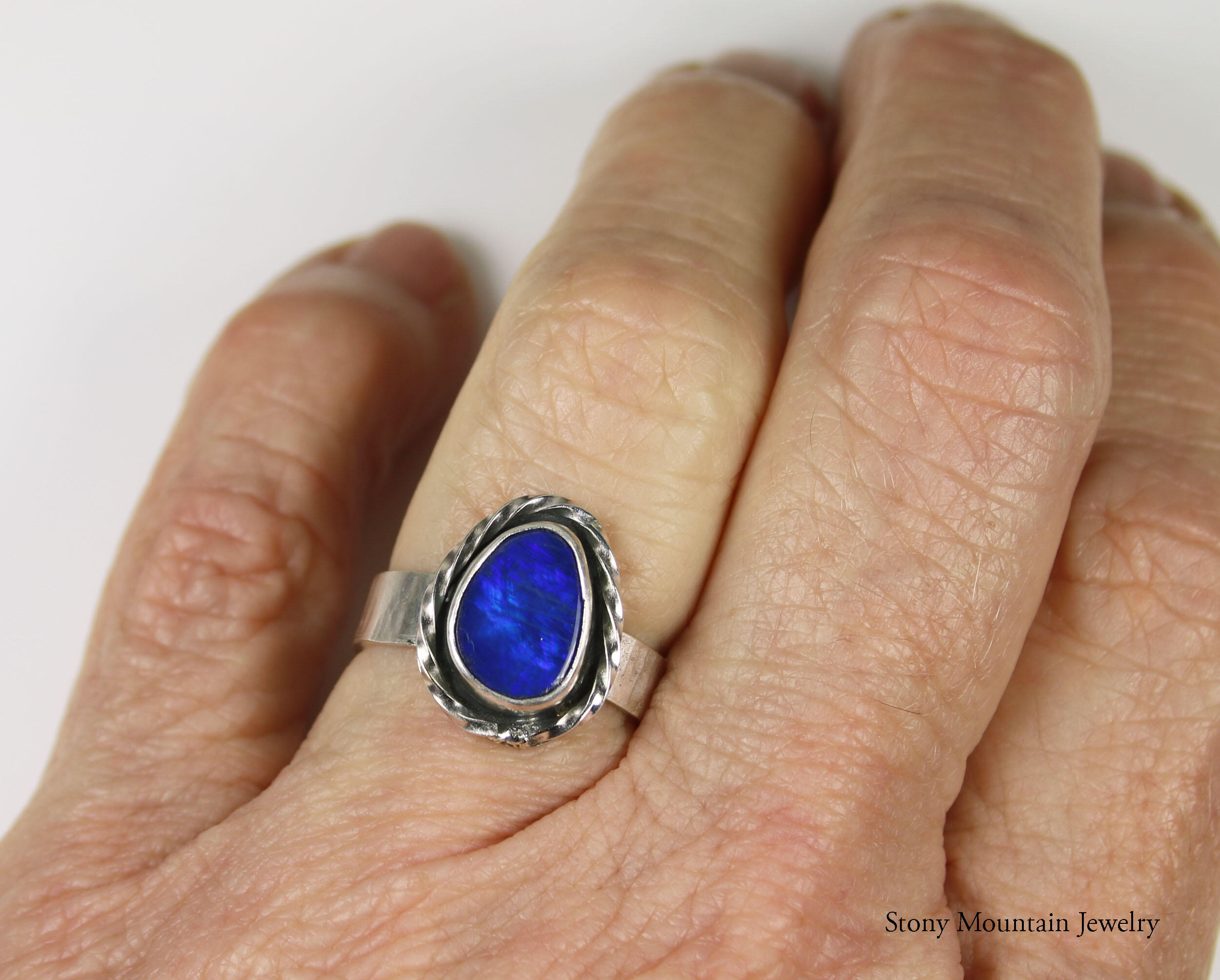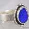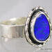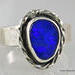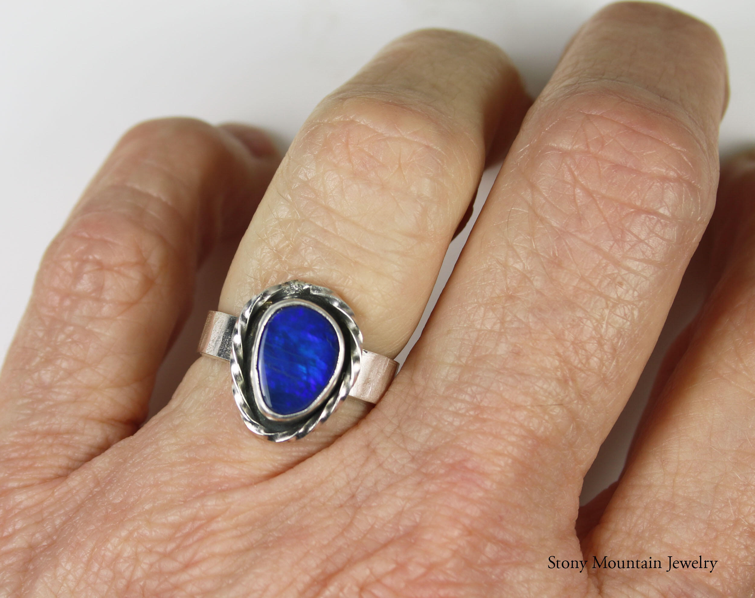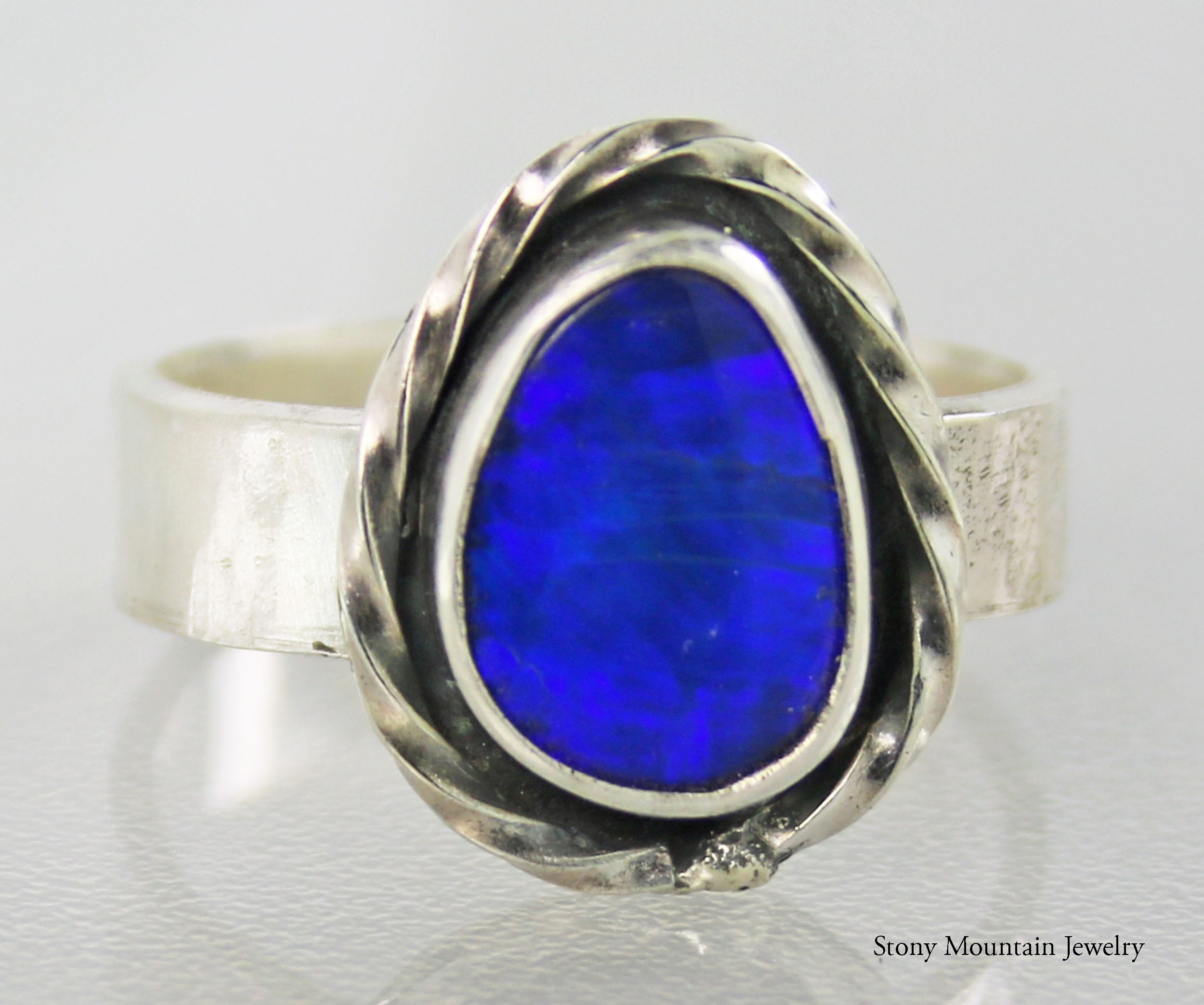 Beautiful blue Australian Boulder Opal ring flashes hints of purple. Set in a sterling silver bezel with a highly textured sculptural surround on a hammered sterling silver band. The light patina accentuates the sculpted design. The beauty is a size 7 and can be sized up to a 7 3/4. Original Ran Armstrong designer gemstone ring. This non traditional style ring is very comfortable to wear and makes an exceptional fashion statement.