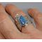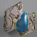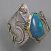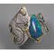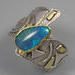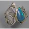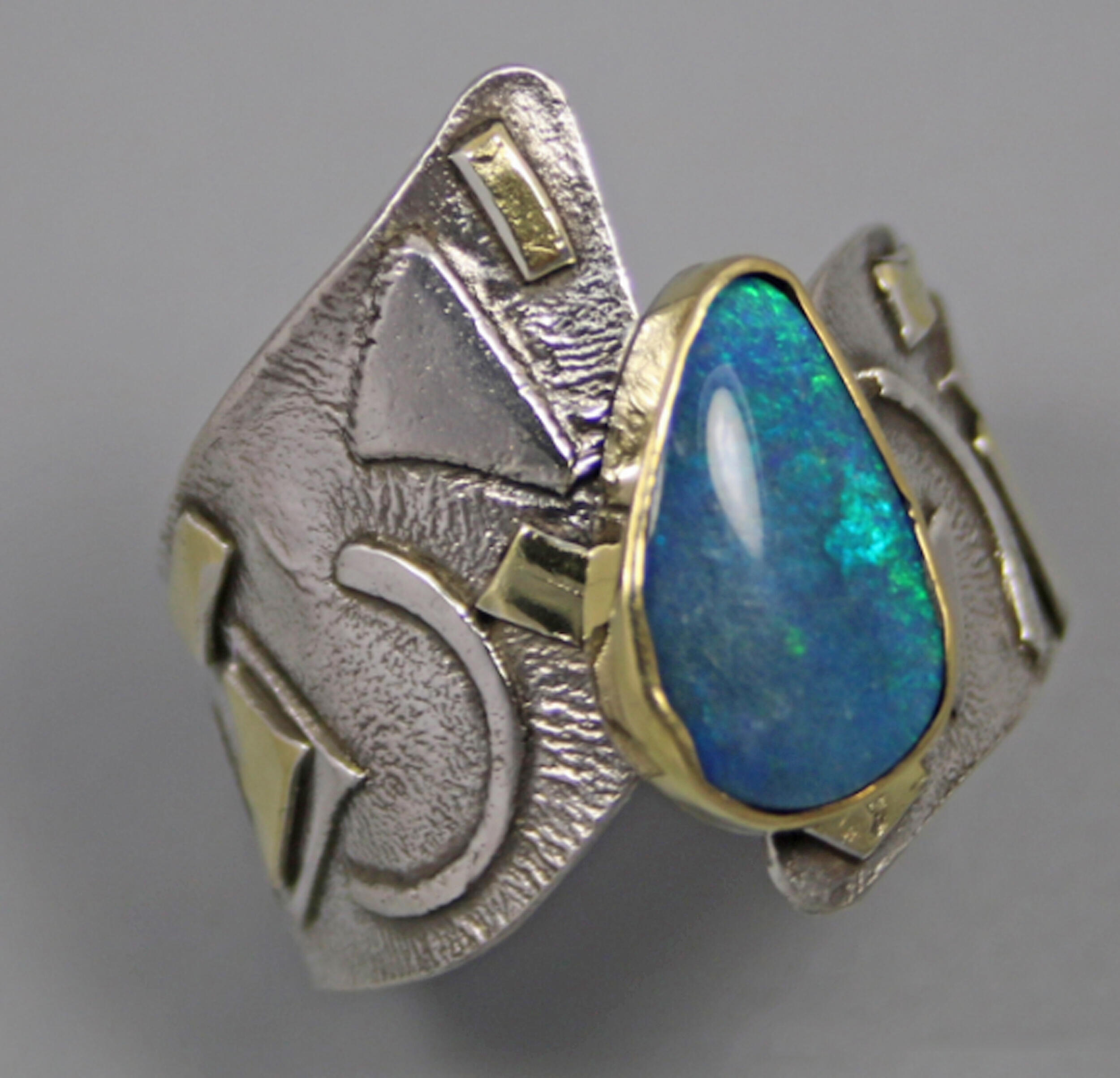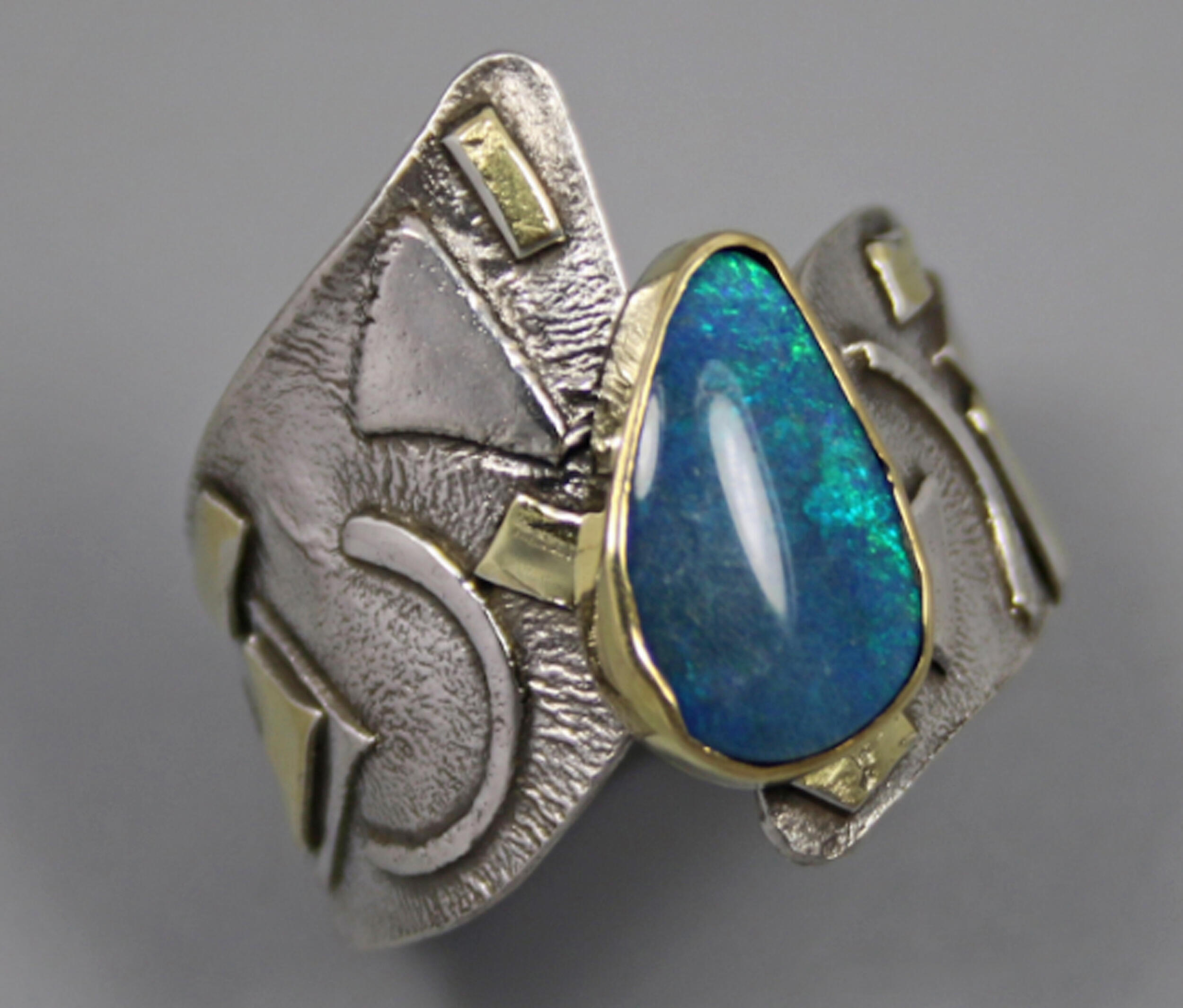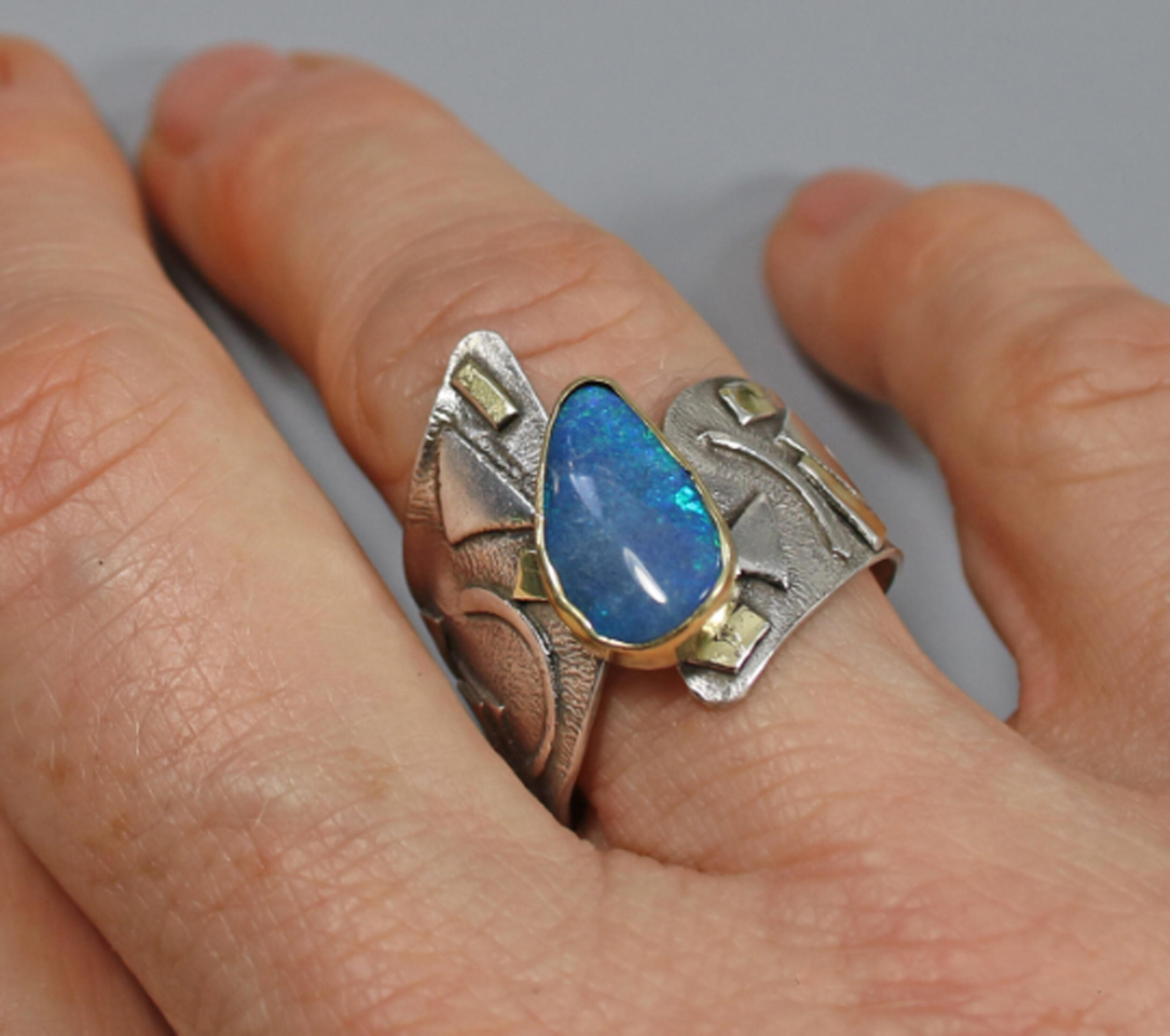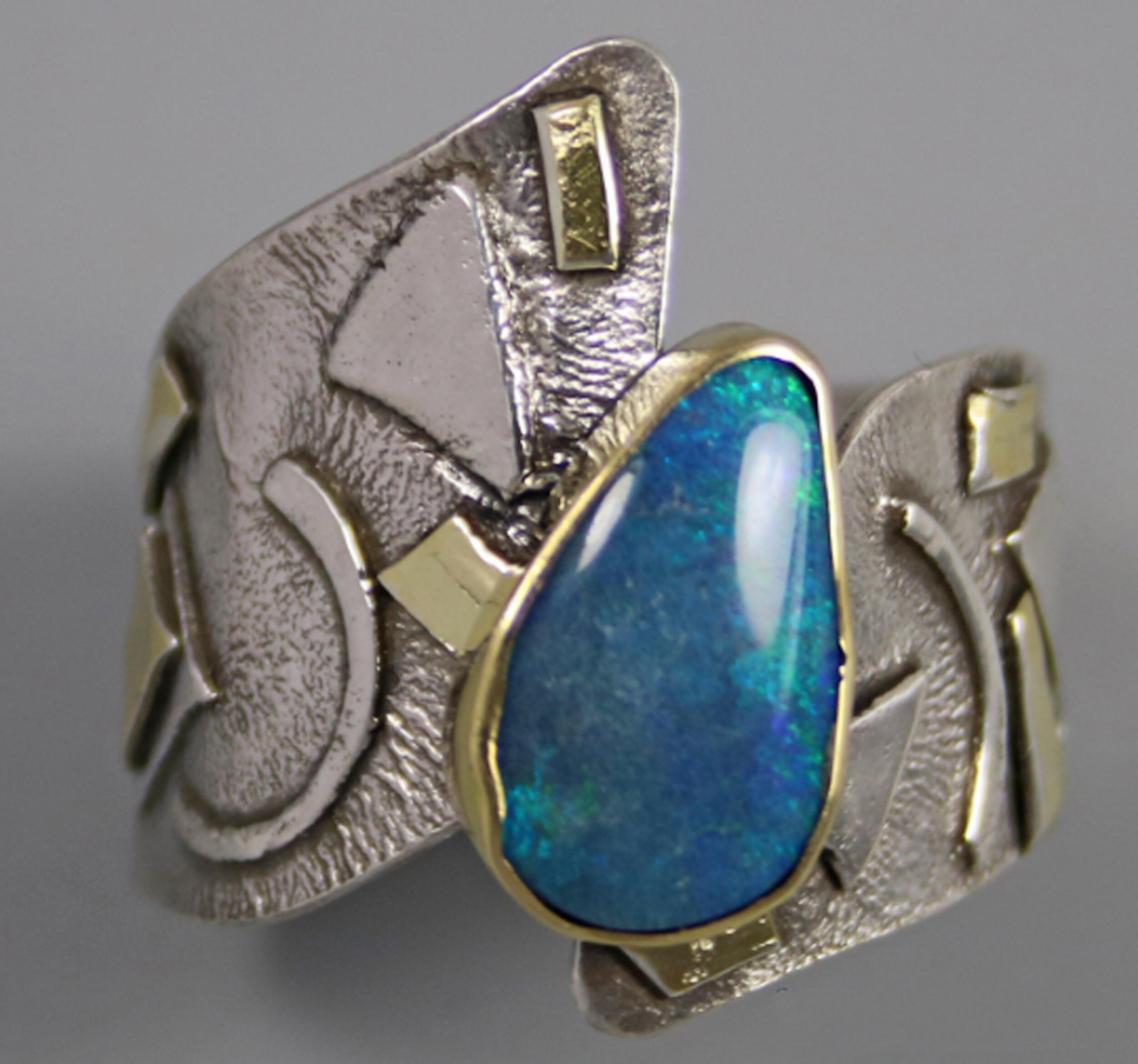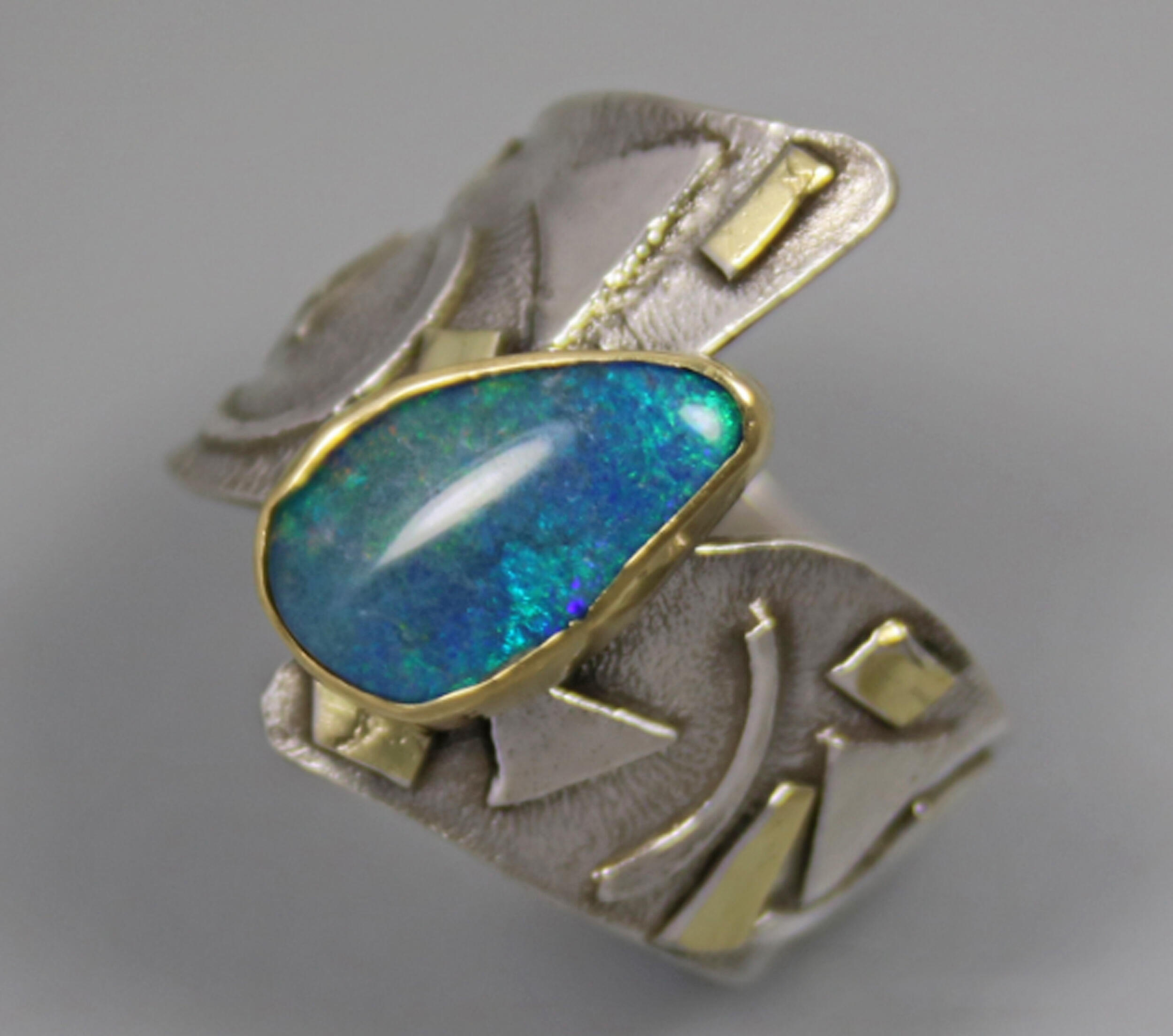 One of a kind Australian Blue Opal ring. Beautiful opal doublet with bits of blue fire is bezel set in 14kt gold. The artistic wide band of sterling silver hosts 18kt gold accents and a light patination enhances the sculptural design. Original Ran Armstrong OOAK wide band designer gemstone ring. This non traditional style ring is very comfortable to wear; an exceptional fashion statement. A lovely October birthstone ring.