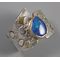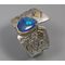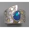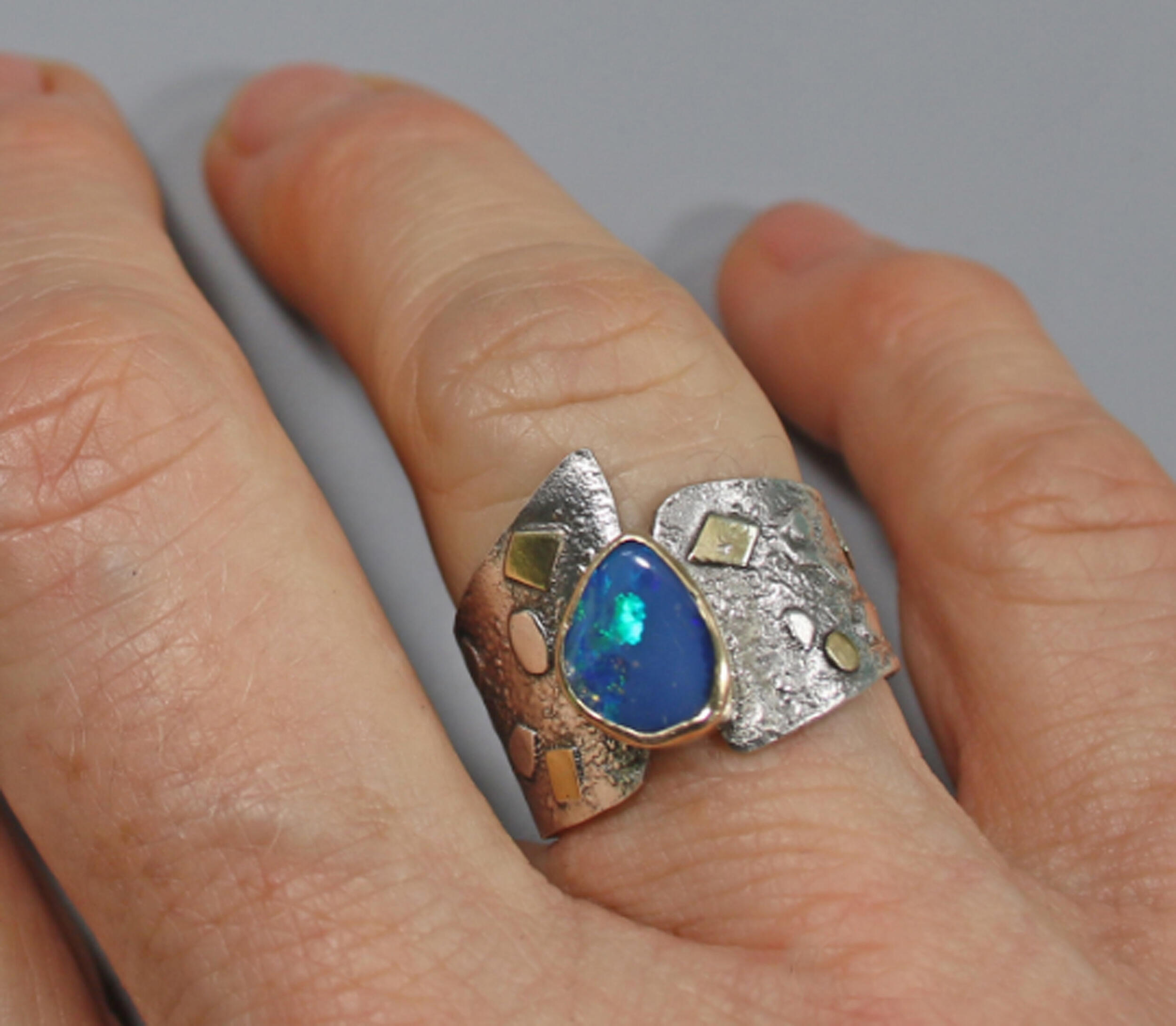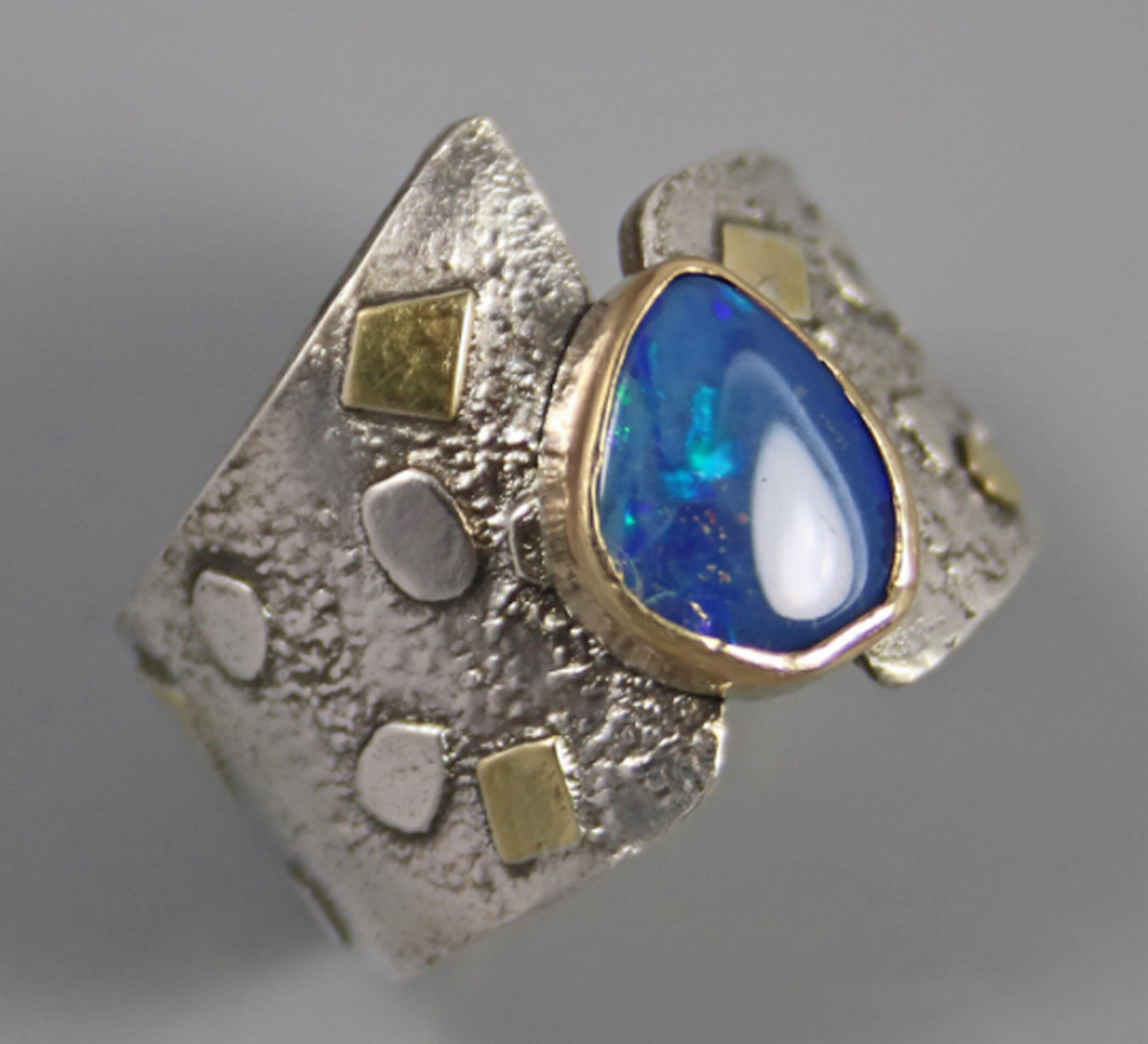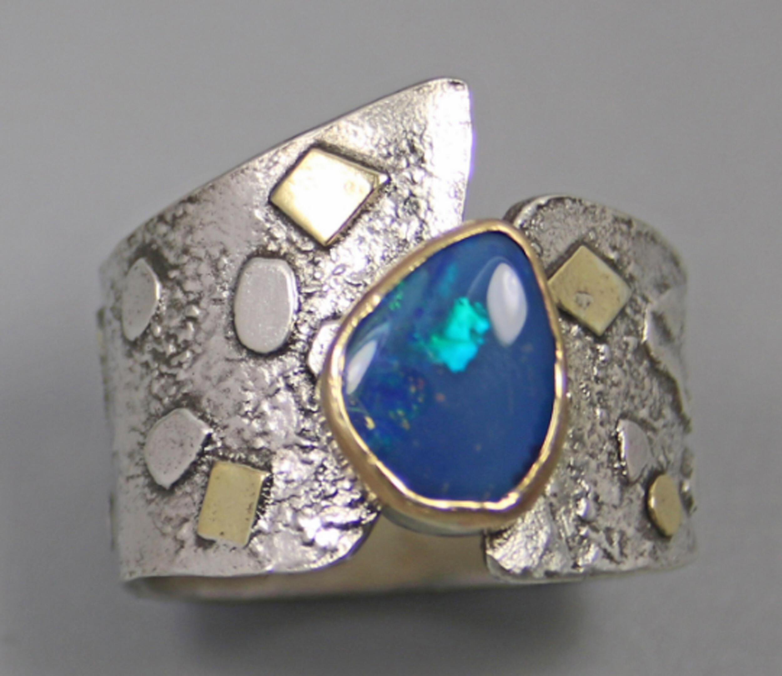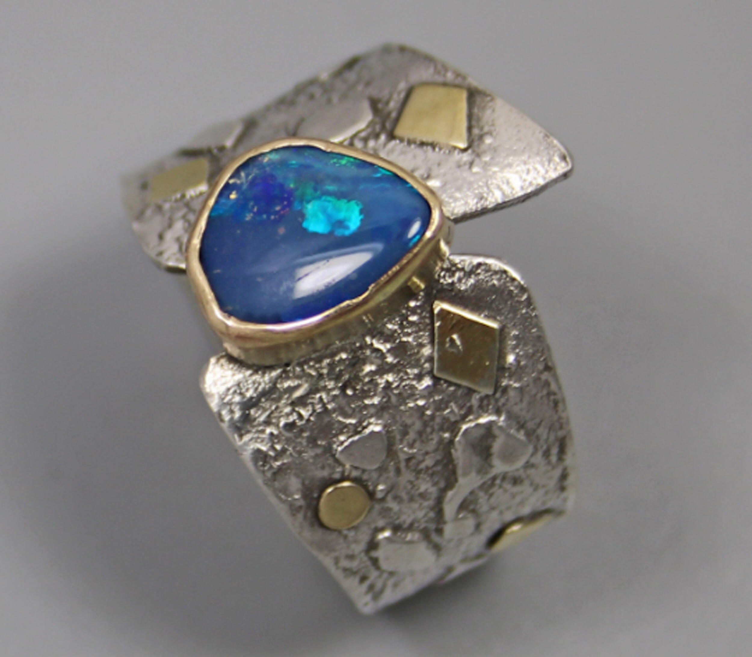 One of a kind Australian Black Opal ring. Beautiful opal doublet with bits of green and blue fire is bezel set in 14kt gold. The artistic wide band of sterling silver hosts 18kt gold accents and a light patination enhances the sculptural design. Original Ran Armstrong OOAK wide band designer gemstone ring. This non traditional style ring is very comfortable to wear; an exceptional fashion statement. A lovely October birthstone ring.