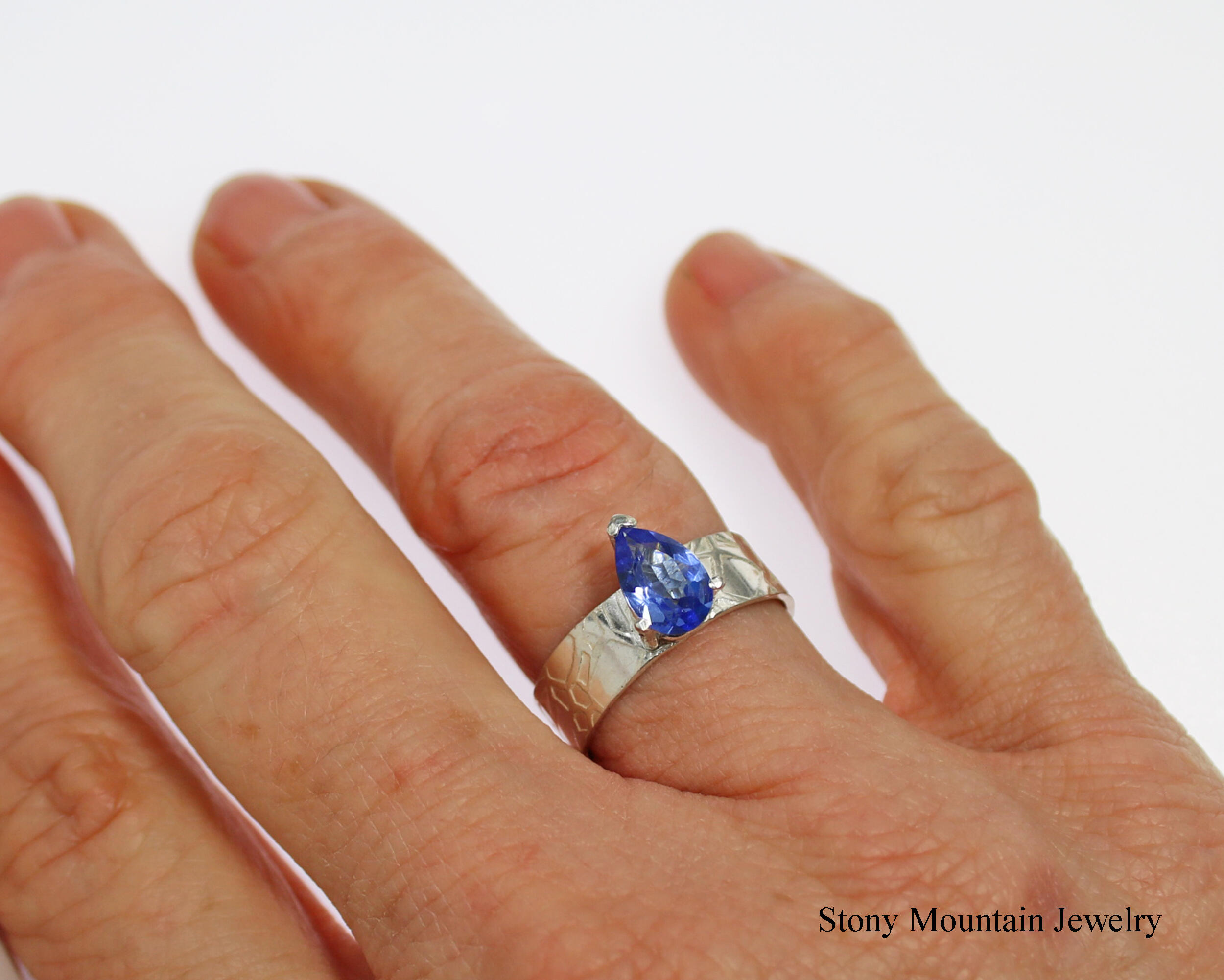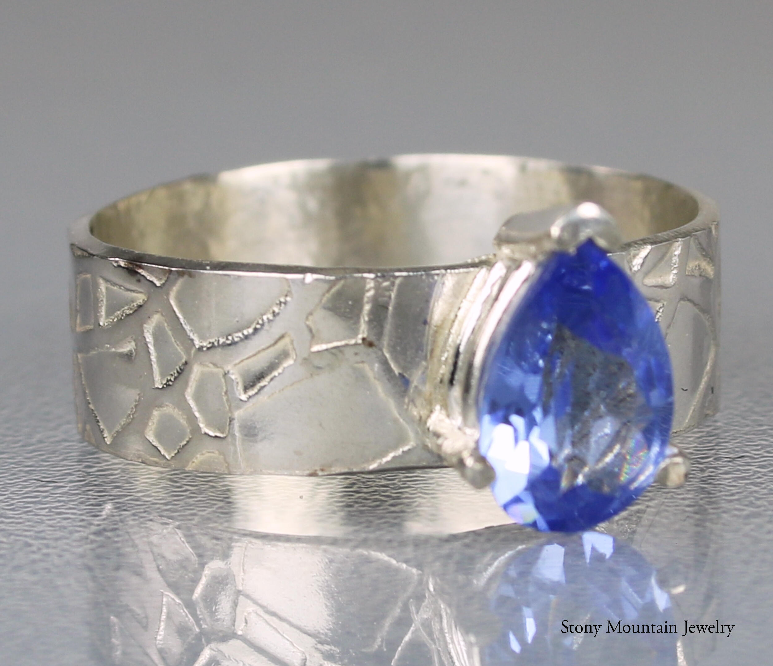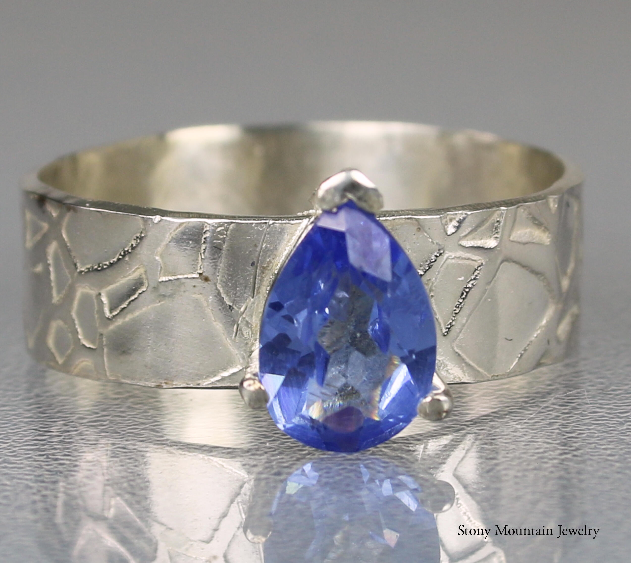 Dazzling pear cut lab created Tanzanite set in a three prong sterling silver mount will be set on your choice of textured sterling silver band. The ring in the photos is on our Cobblestone pattern sterling silver band. Select the one YOU like the most. on our swirling clouds pattern sterling silver band. Original Ran Armstrong designer gemstone ring. This non traditional style ring is very comfortable and fun to wear; an exceptional fashion statement to dress up of down. The perfect gift to treat yourself or that special someone.