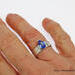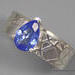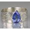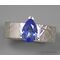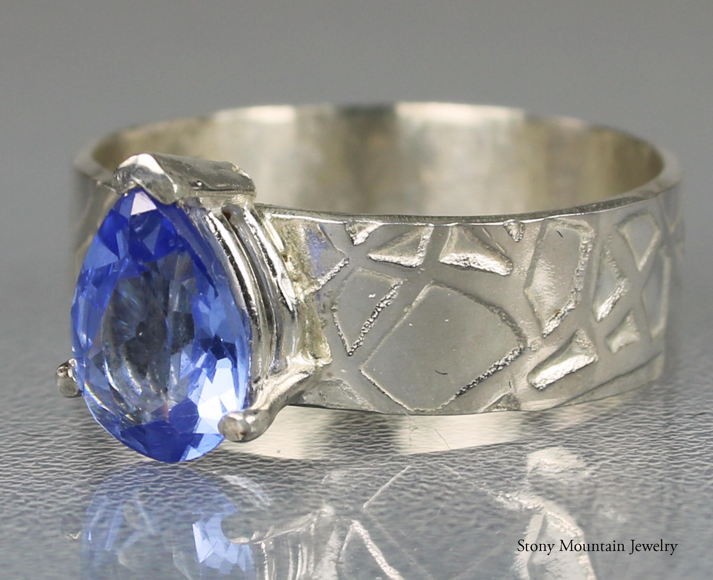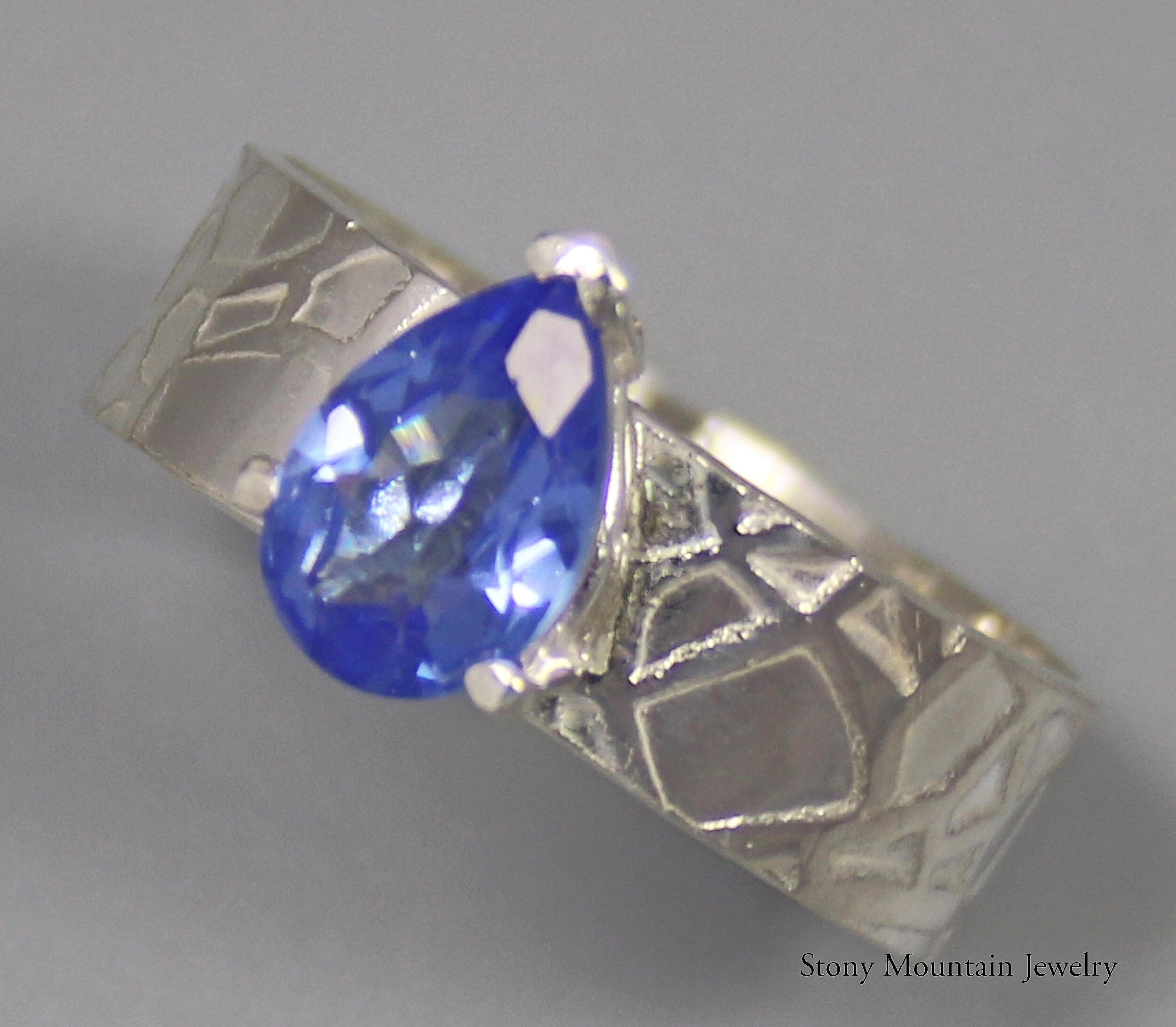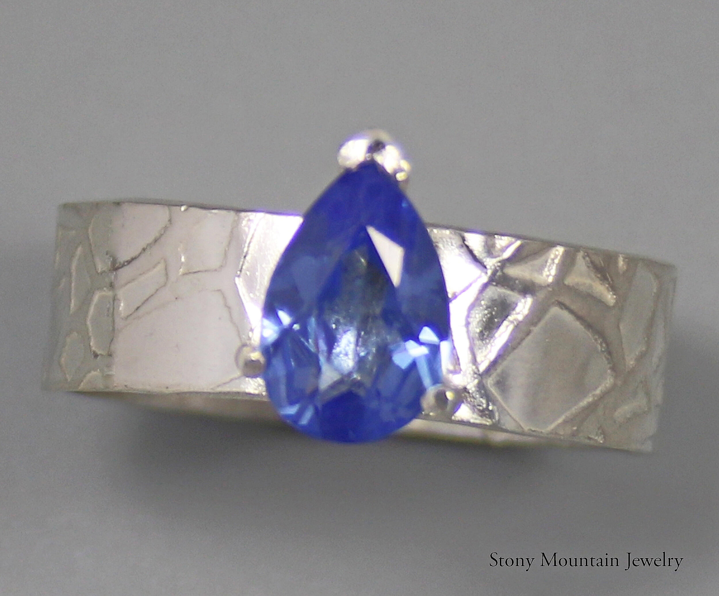 Dazzling pear cut lab created Tanzanite set in a three prong sterling silver mount will be set on your choice of textured sterling silver band. The ring in the photos is on our Cobblestone pattern sterling silver band. Select the one YOU like the most. on our swirling clouds pattern sterling silver band. Original Ran Armstrong designer gemstone ring. This non traditional style ring is very comfortable and fun to wear; an exceptional fashion statement to dress up of down. The perfect gift to treat yourself or that special someone.