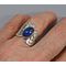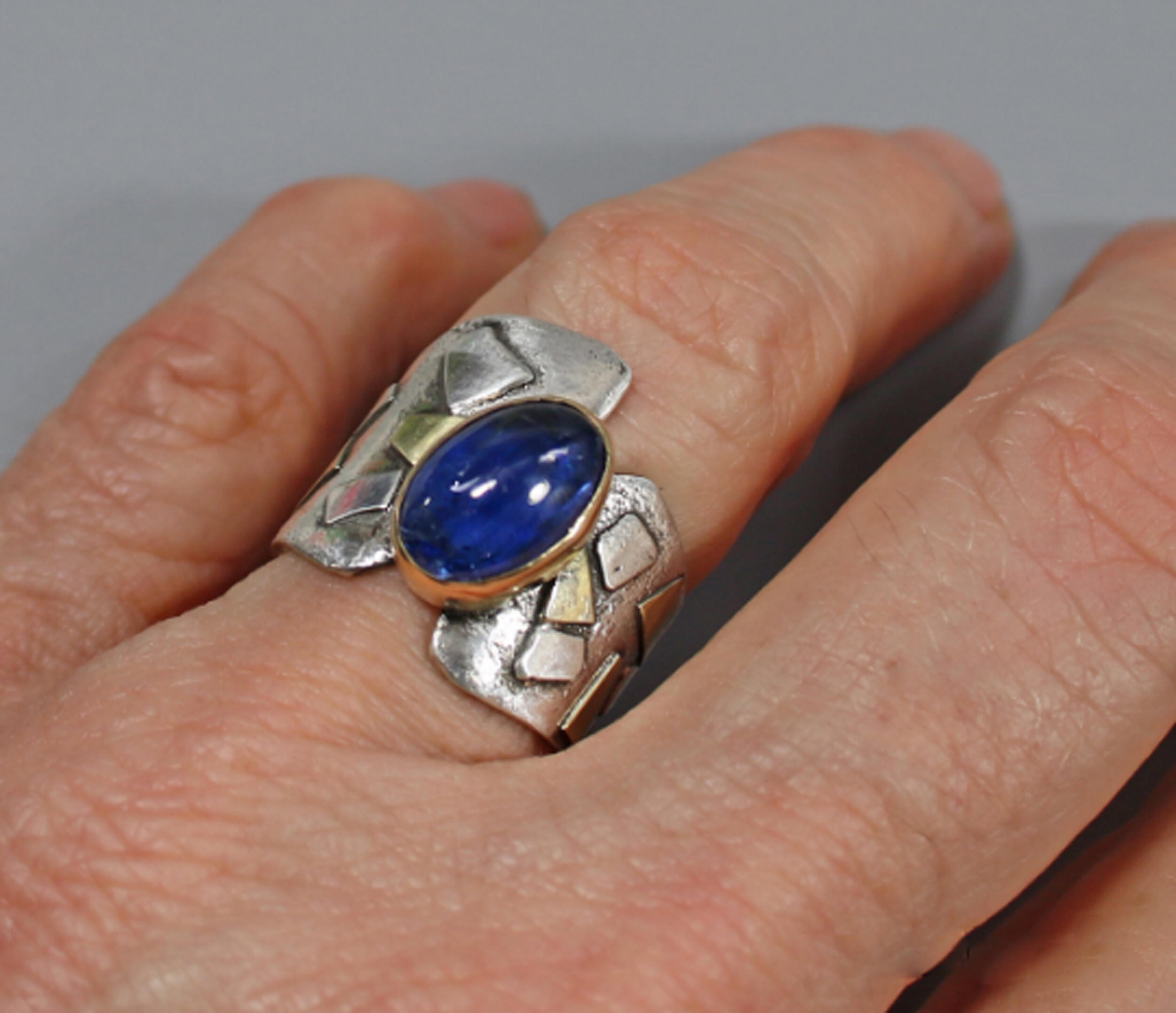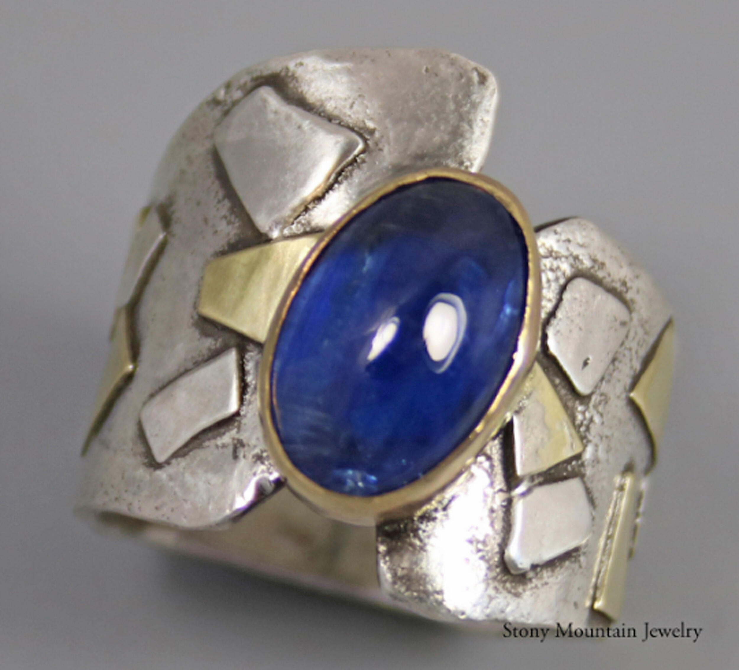 One of a kind cabochon cut kyanite ring. Beautiful blue kyanite is bezel set in 14kt gold. The artistic wide band of sterling silver hosts 18kt gold accents and a light patination enhances the sculptural design. Original Ran Armstrong OOAK wide band designer gemstone ring. This non traditional style ring is very comfortable to wear; an exceptional fashion statement. A lovely blue gemstone ring.