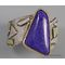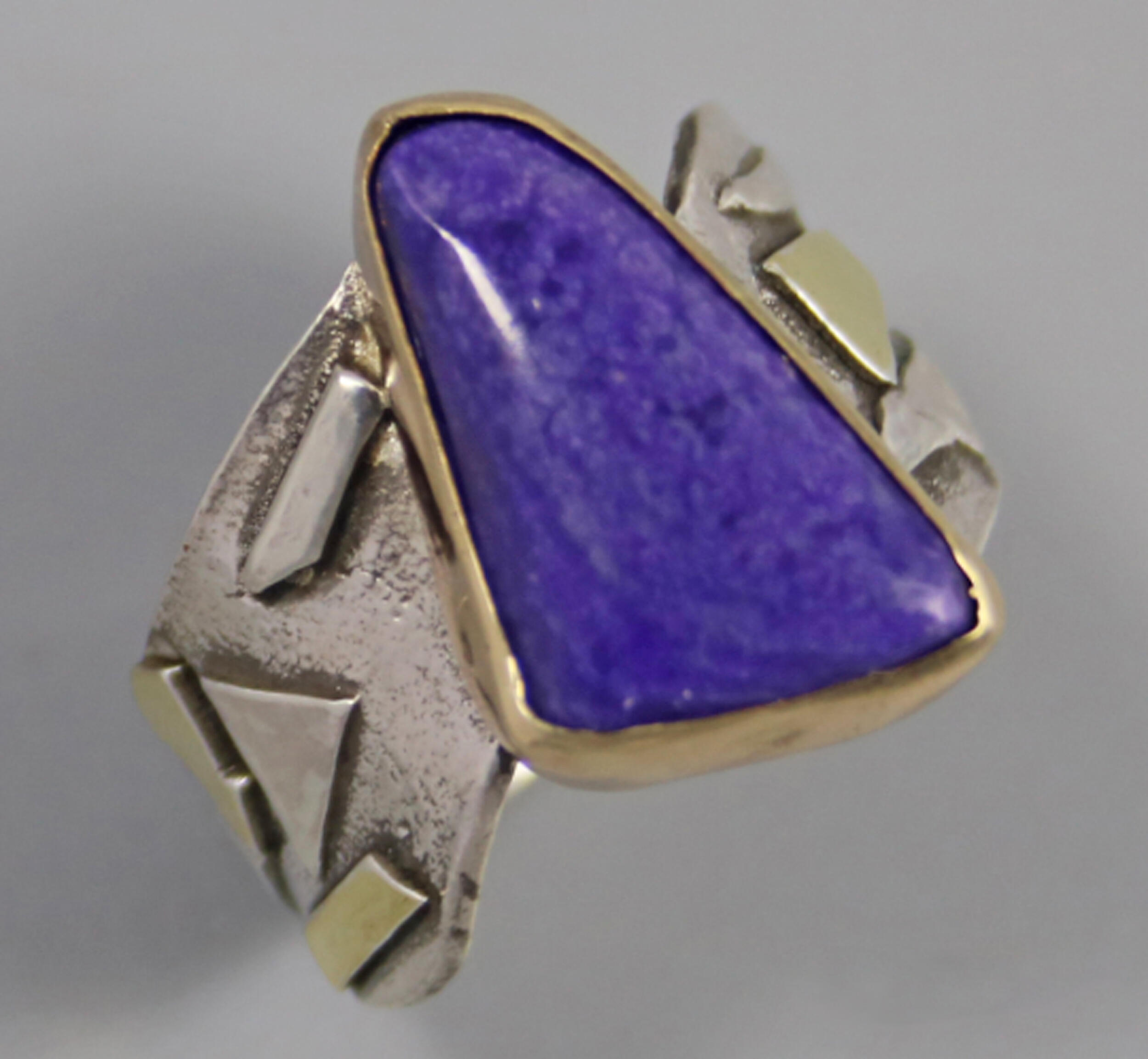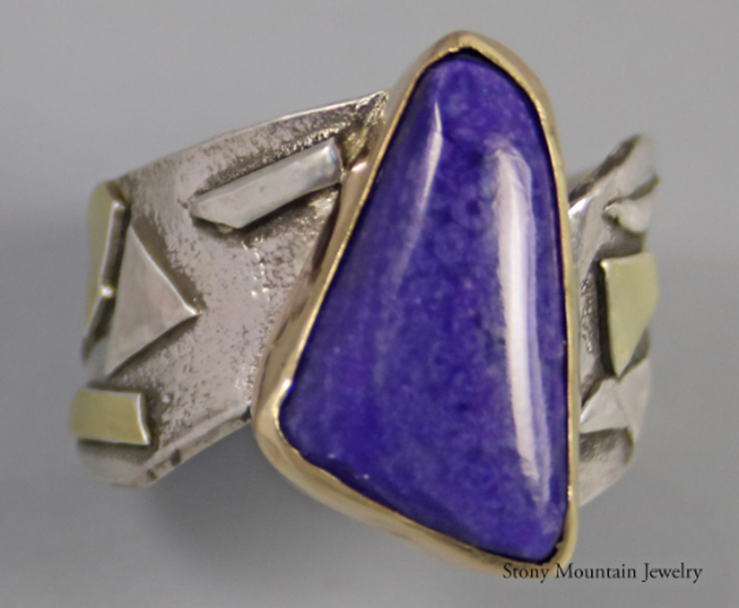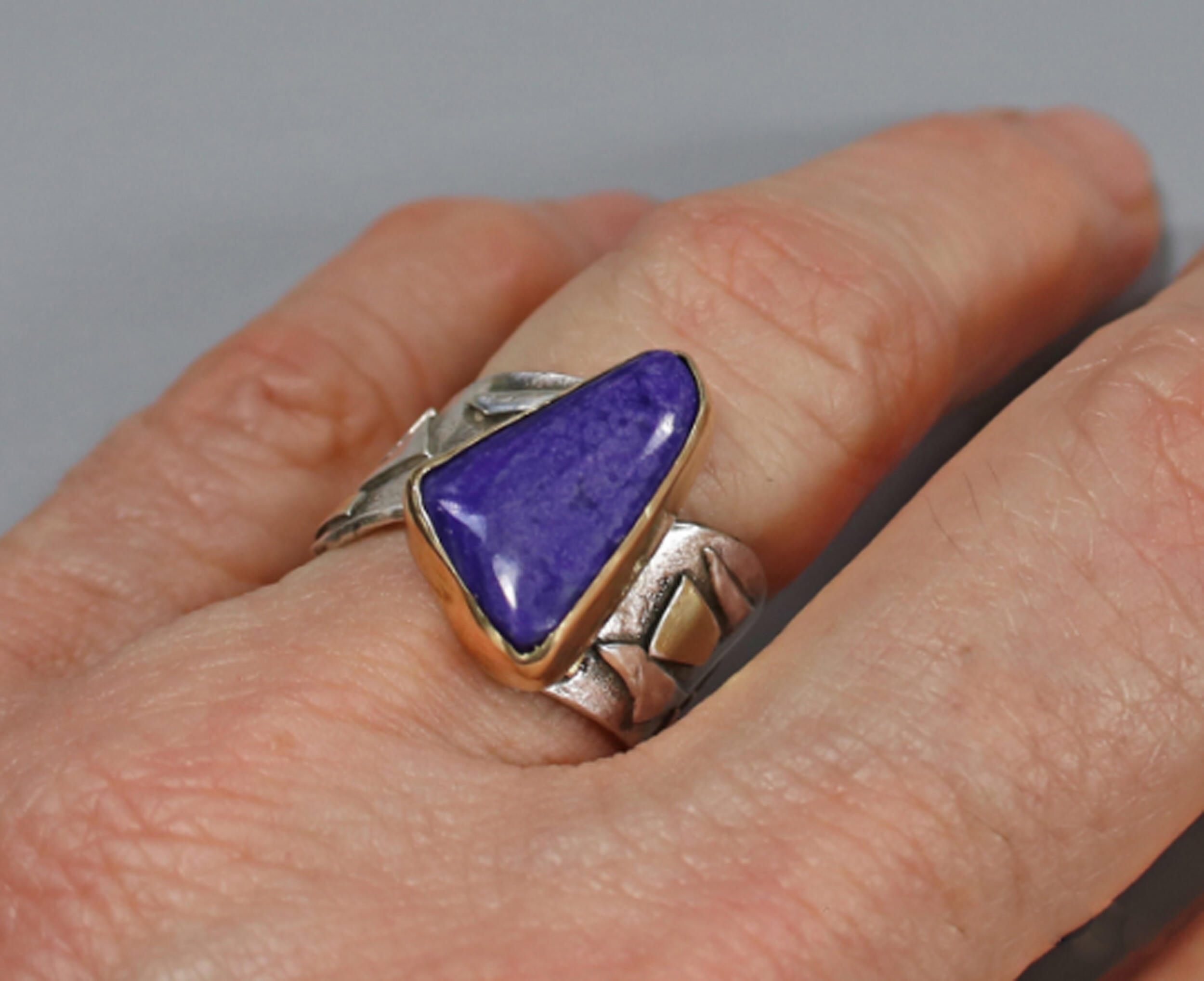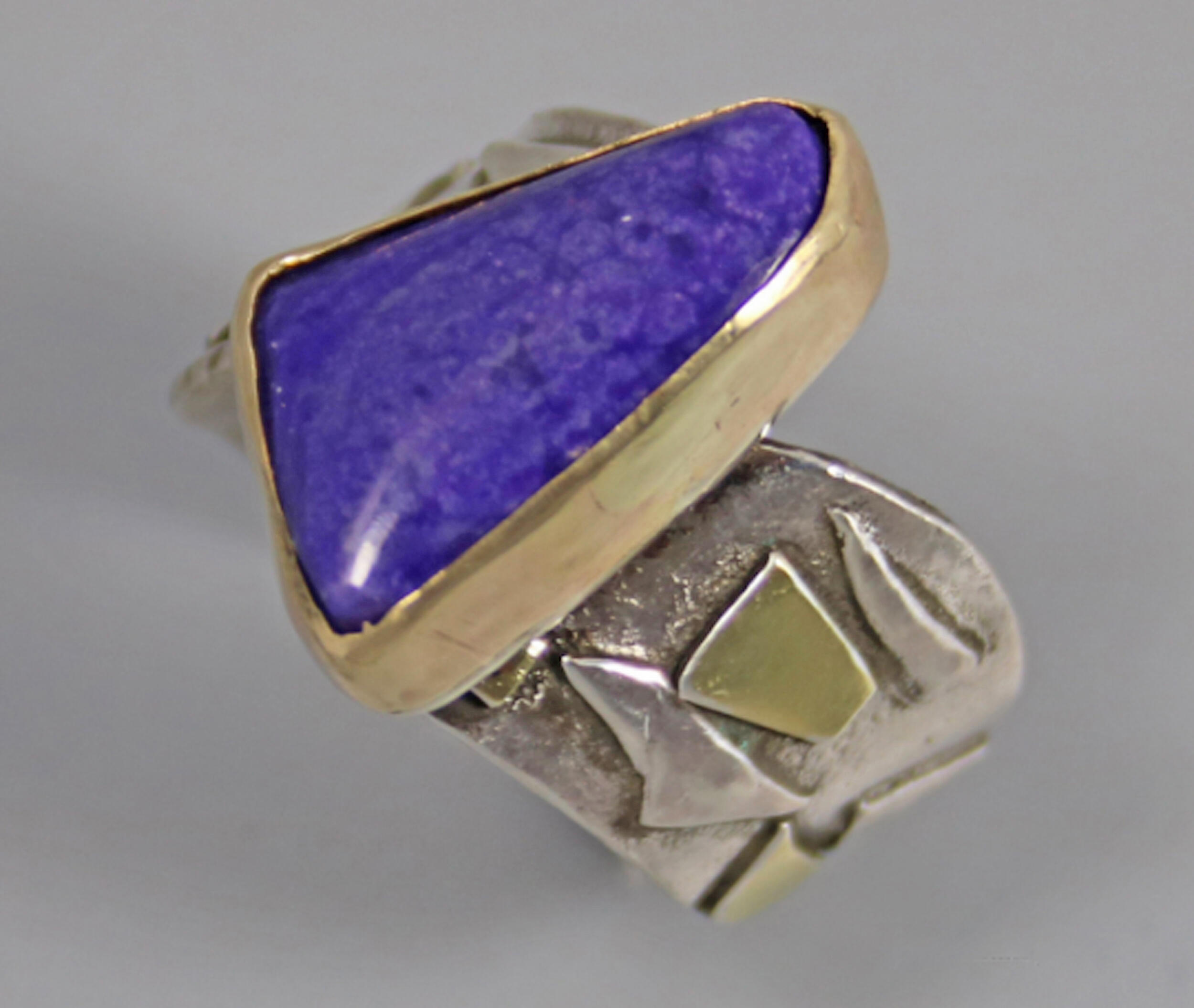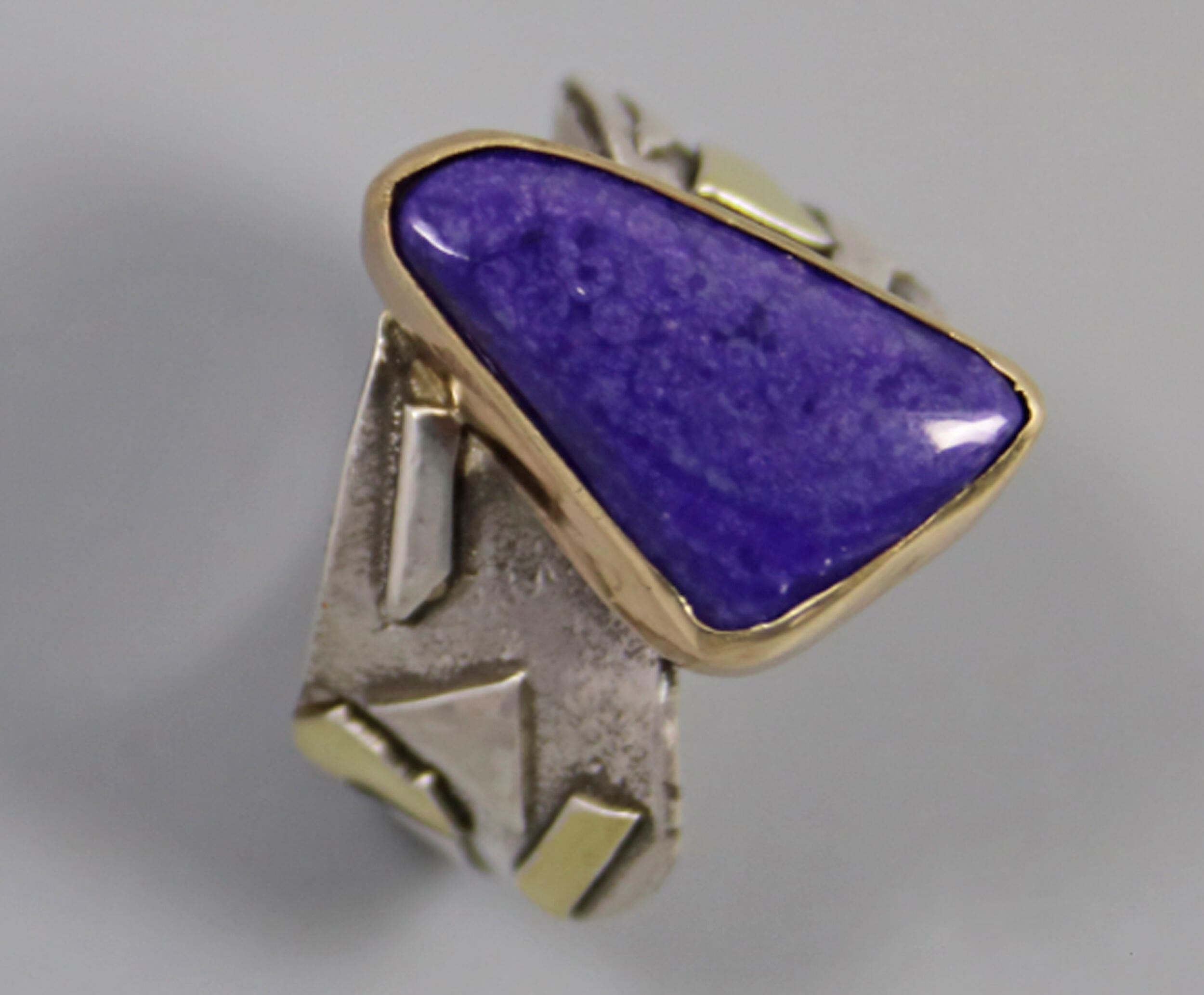 One of a kind sugilite ring. Rare & beautiful purple sugilite is bezel set in 14kt gold. The artistic wide band of sterling silver hosts 18kt gold accents and a light patination enhances the sculptural design. Original Ran Armstrong OOAK wide band designer gemstone ring. This non traditional style ring is very comfortable to wear; an exceptional fashion statement.
