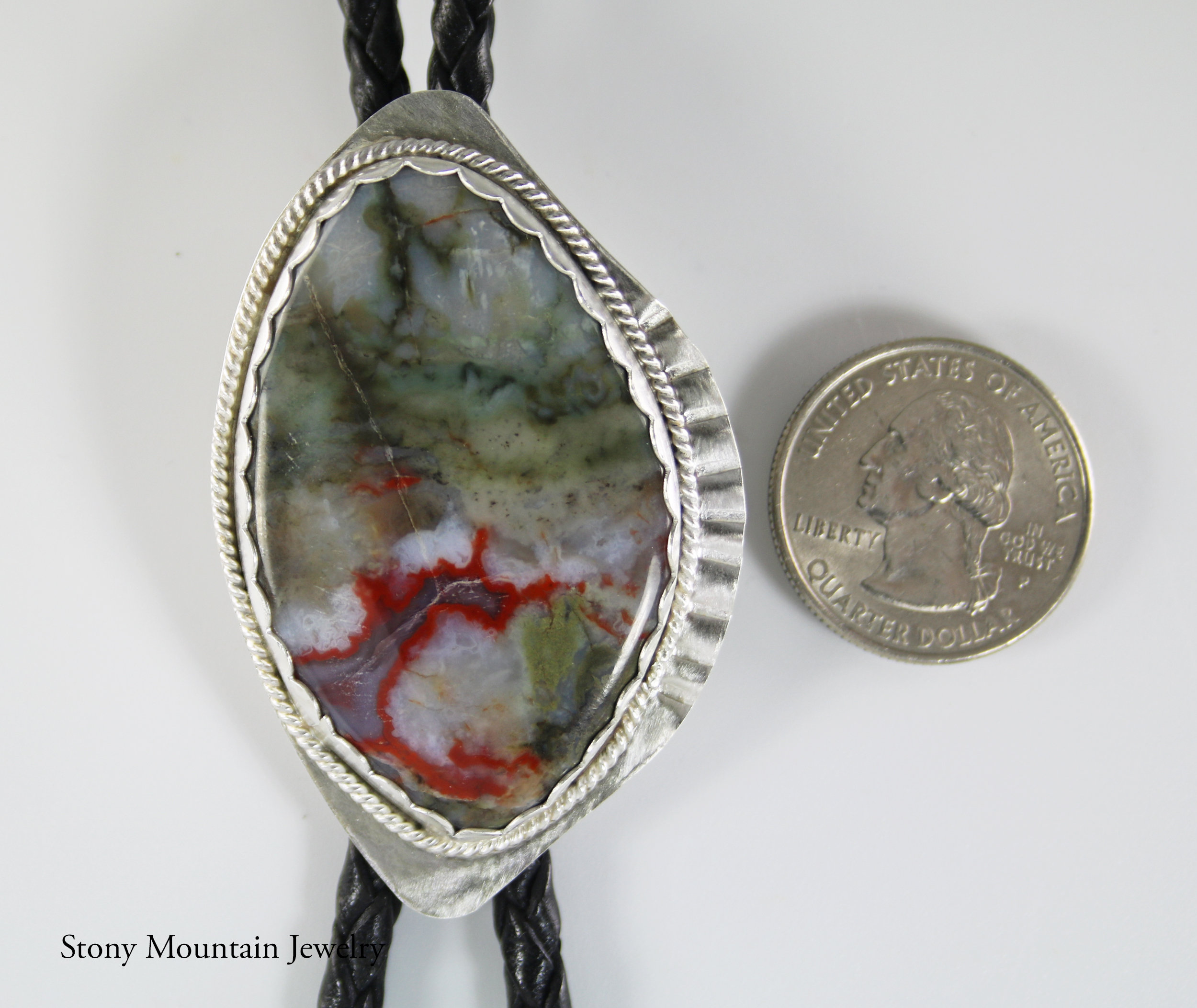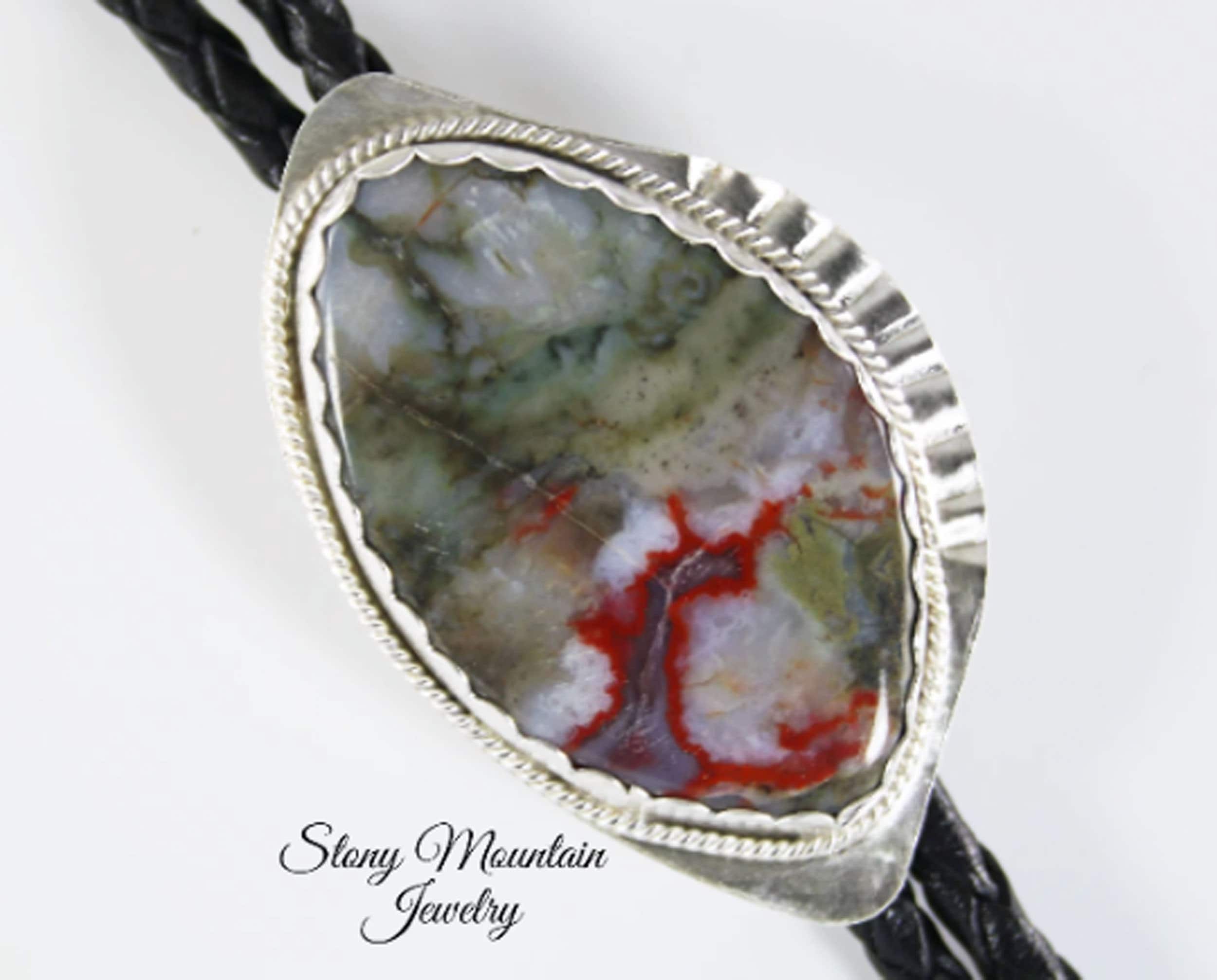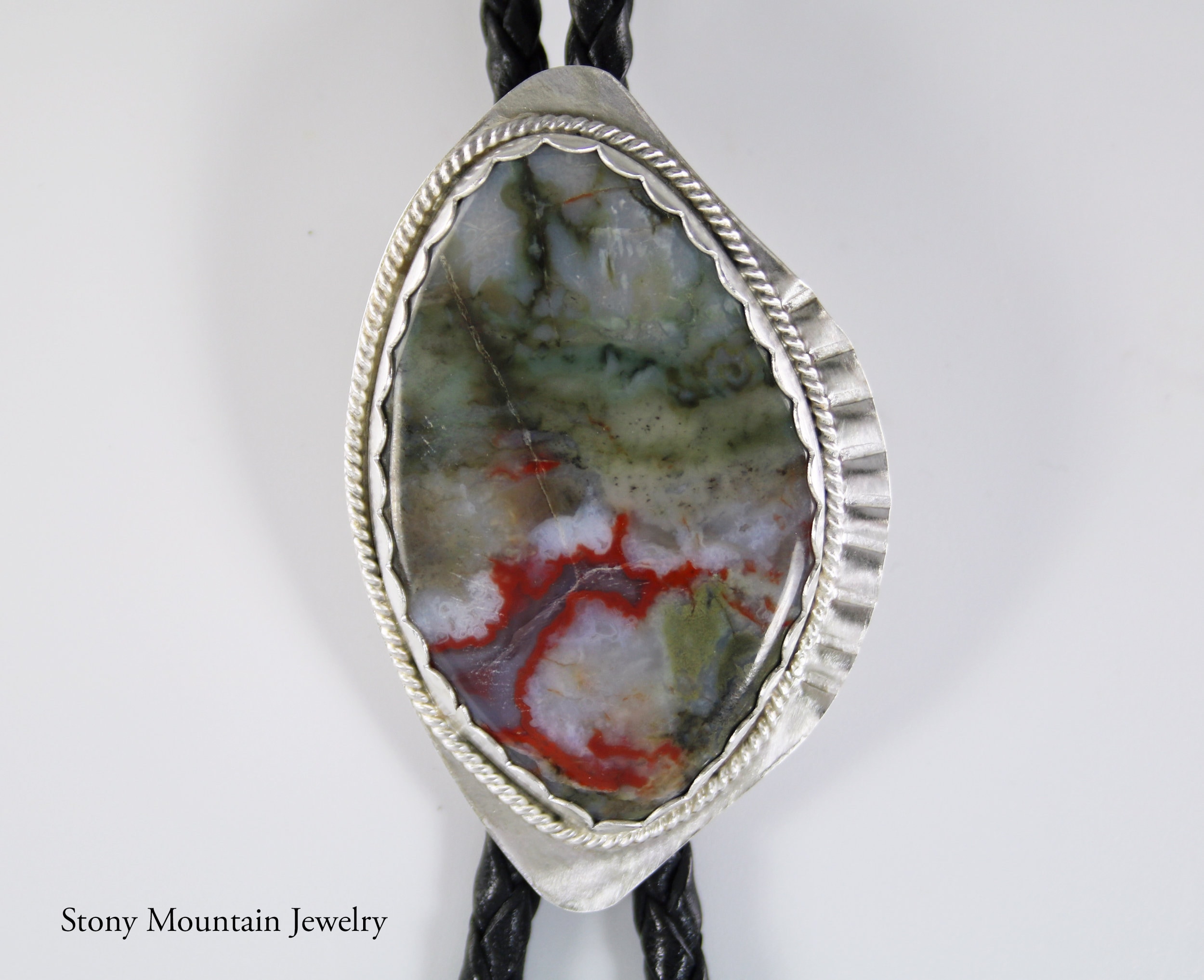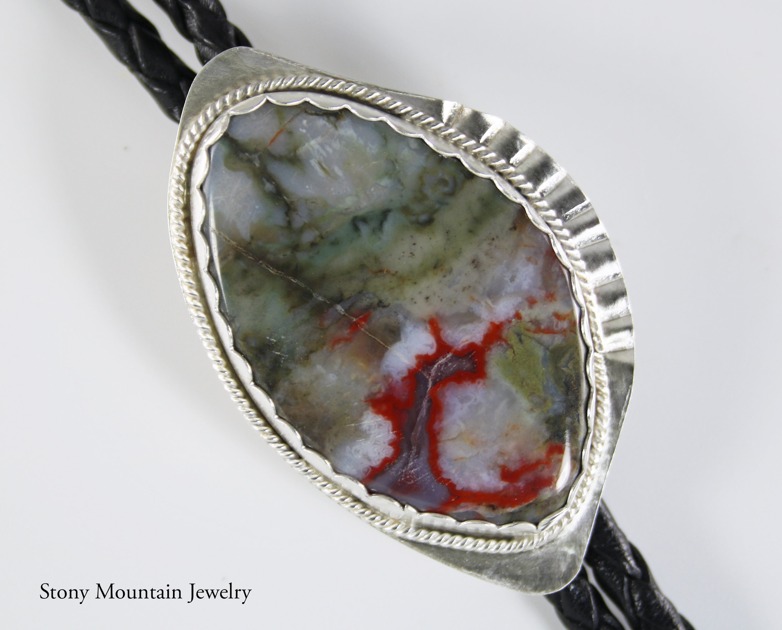 Contemporary Bolo Tie. No rules - this beautiful bolo can be worn by men or women. A wonderful alternative for formal attire or a funky bit of dress up with a tee shirt - NO rules apply for Bolo Ties! Hand cut freeform fossil Coprolite aka Dinosaur Poop is artistically set in sterling silver. This beautiful stone has great color and structure. The handcrafted slide uses friction rather than a mechanical device. This slide will keep your tie securely in place without crimping the leather cord. Lapidary work, design and fabrication all done by Ran. Gemstone............................Fossil Dinosaur Coprolite Gemstone Size....................47mm x 30mm +/- Gemstone Weight...............57 carats +/- Bolo Tie Dimensions...........2.25" x 1.5" +/- Metal...................................Sterling Silver Tips......................................Sterling Silver - 2.25" Bolo Tie Material.................Black or Brown Leather - 42" - If you prefer a shorter cord, please let us know we will happily adjust the length. Hand crafted Bolo Ties and Belt Buckles offer unique expressions in contemporary designs. Stand out from the crowd with an exceptional tie and/or buckle featuring spectacular hand cut stones and innovative metal work. Master Lapidarist Ran Armstrong has spent decades honing his crafts in lapidary arts, jewelry design and metal sculpting. Starting with large pieces of rough material (rocks), Ran cuts slabs. He then begins the process of studying each slab to find the most interesting picture, pattern or color combinations before cutting the final cabochon for a jewelry piece. Each piece is created one at a time and is one of a kind which will be Distinctively Yours. All jewelry is gift boxed. US SHIPPING: All items under $200.00 are shipped via USPS First Class Mail. All items over $200.00 are shipped insured USPS Flat Rate Priority Mail, Insured with signature confirmation to the United States. INTERNATIONAL SHIPPING: Buyer is responsible for any and all customs fees and/or VAT taxes. At this time, only items under $200.00 ship internationally. Those items ship USPS Flat Rate Priority, Insured. Return receipt requested where available. Shipping upgrades are available at checkout.