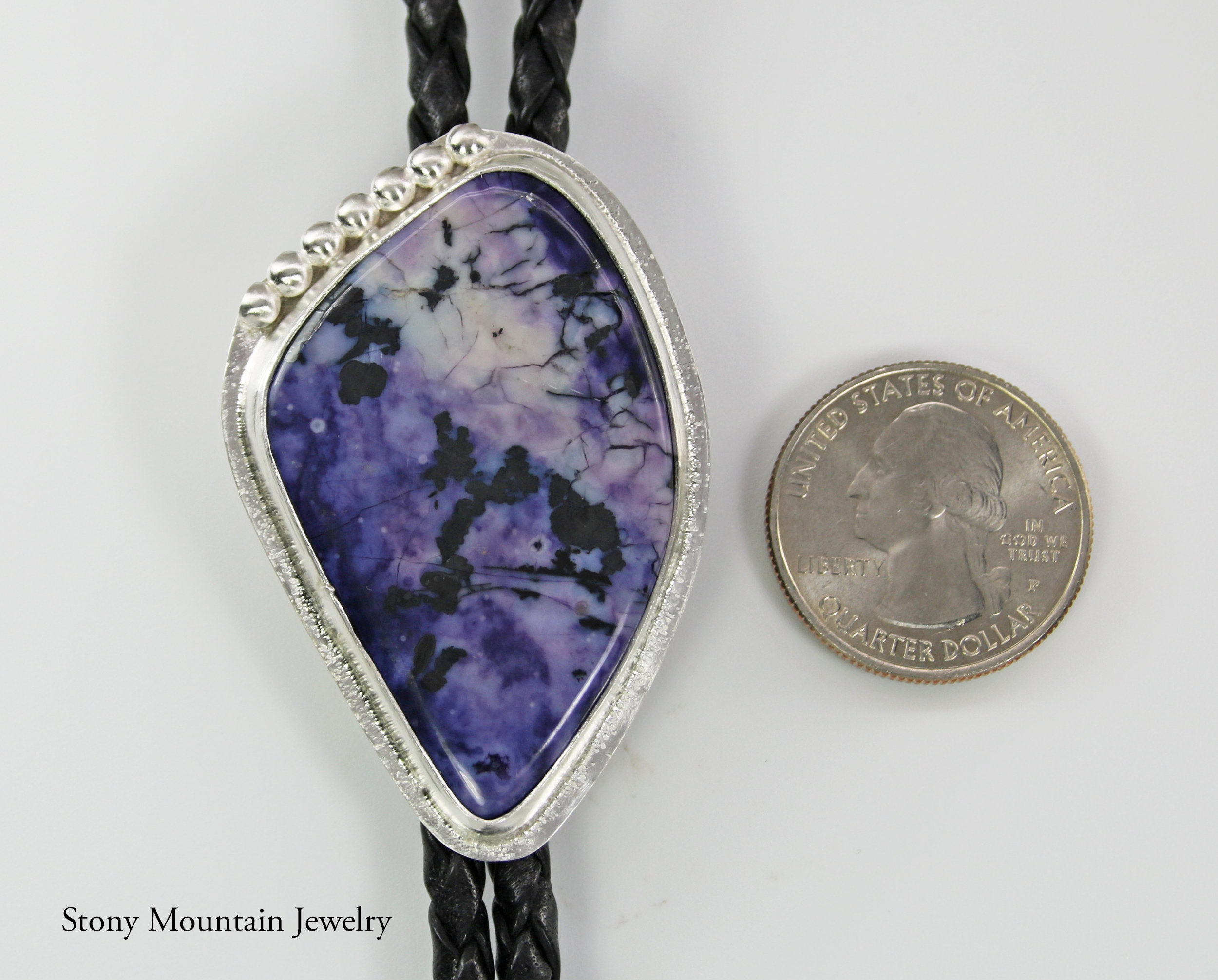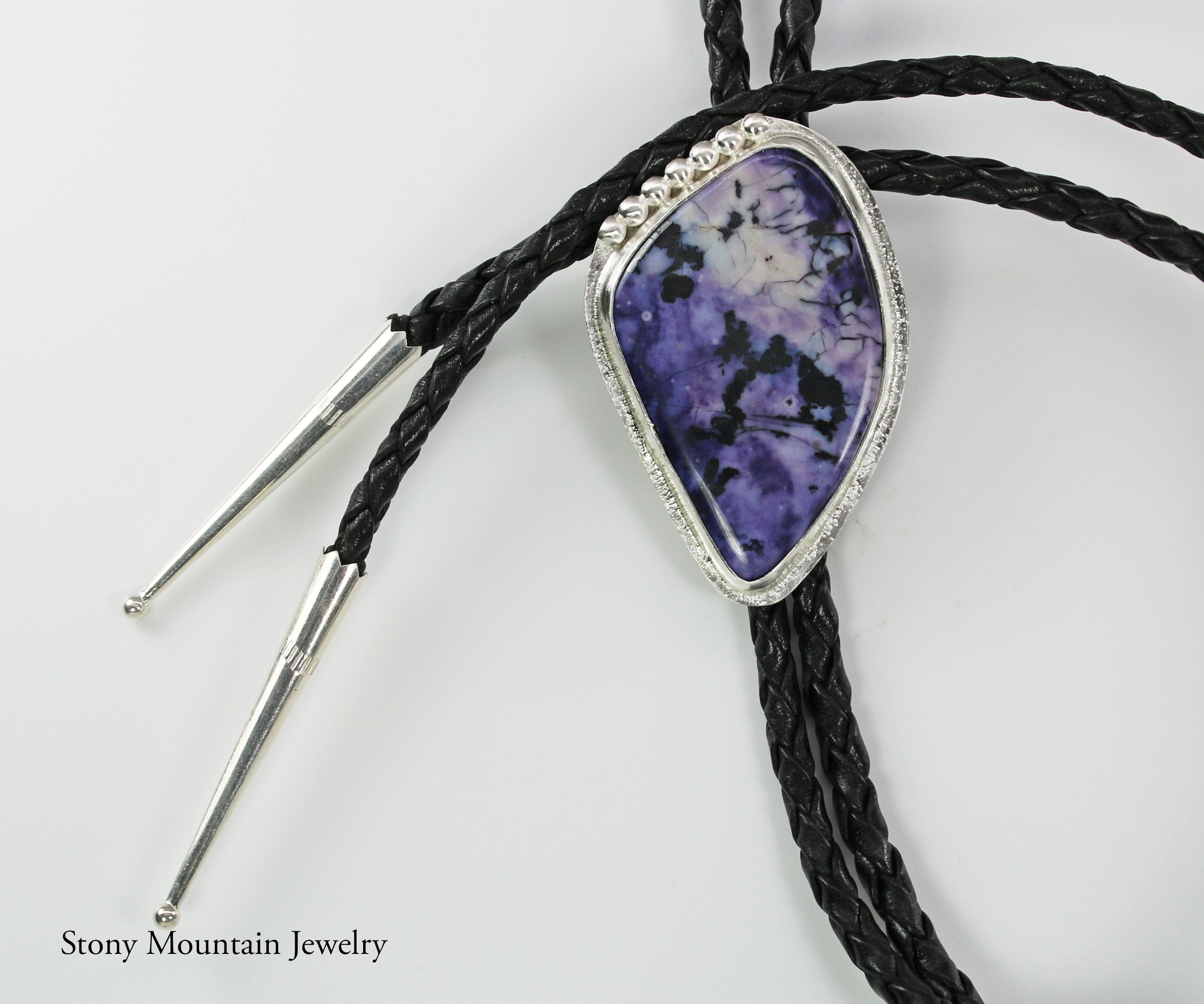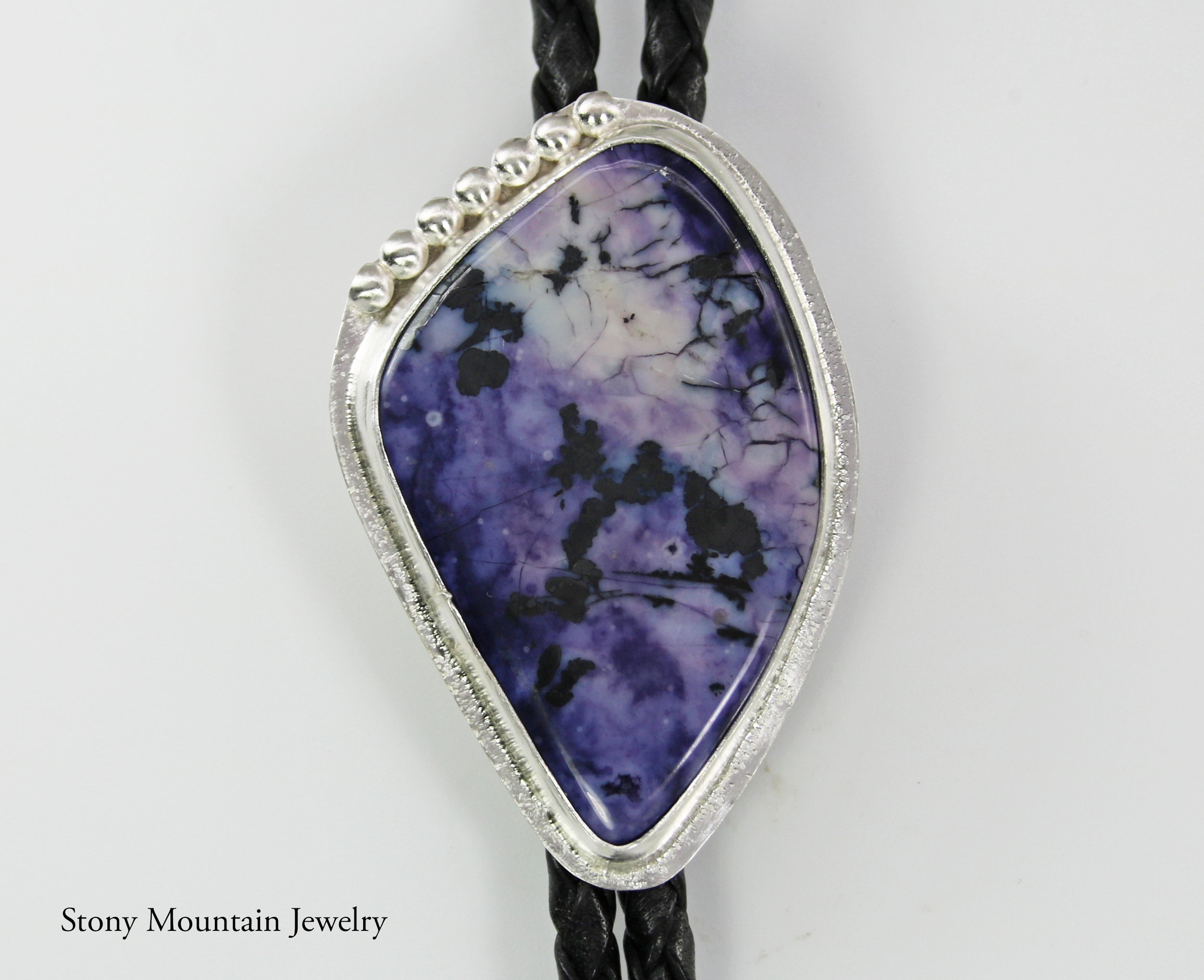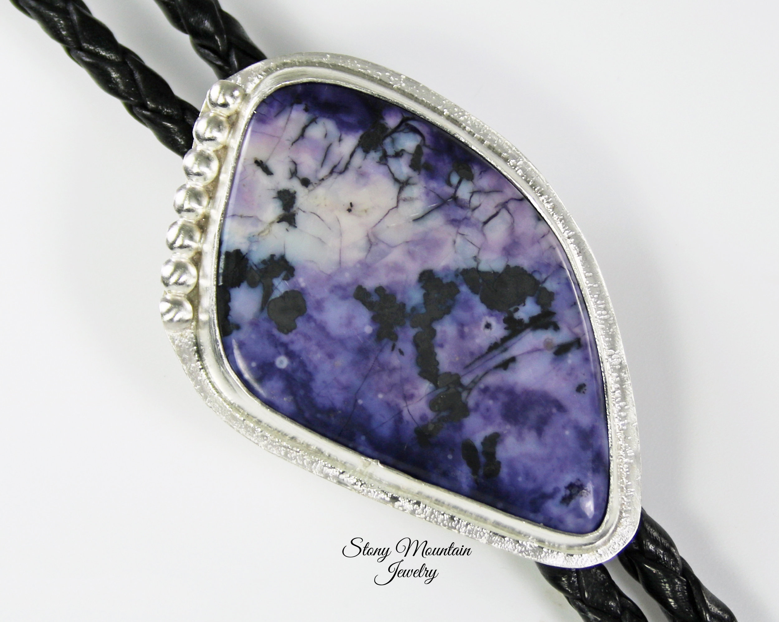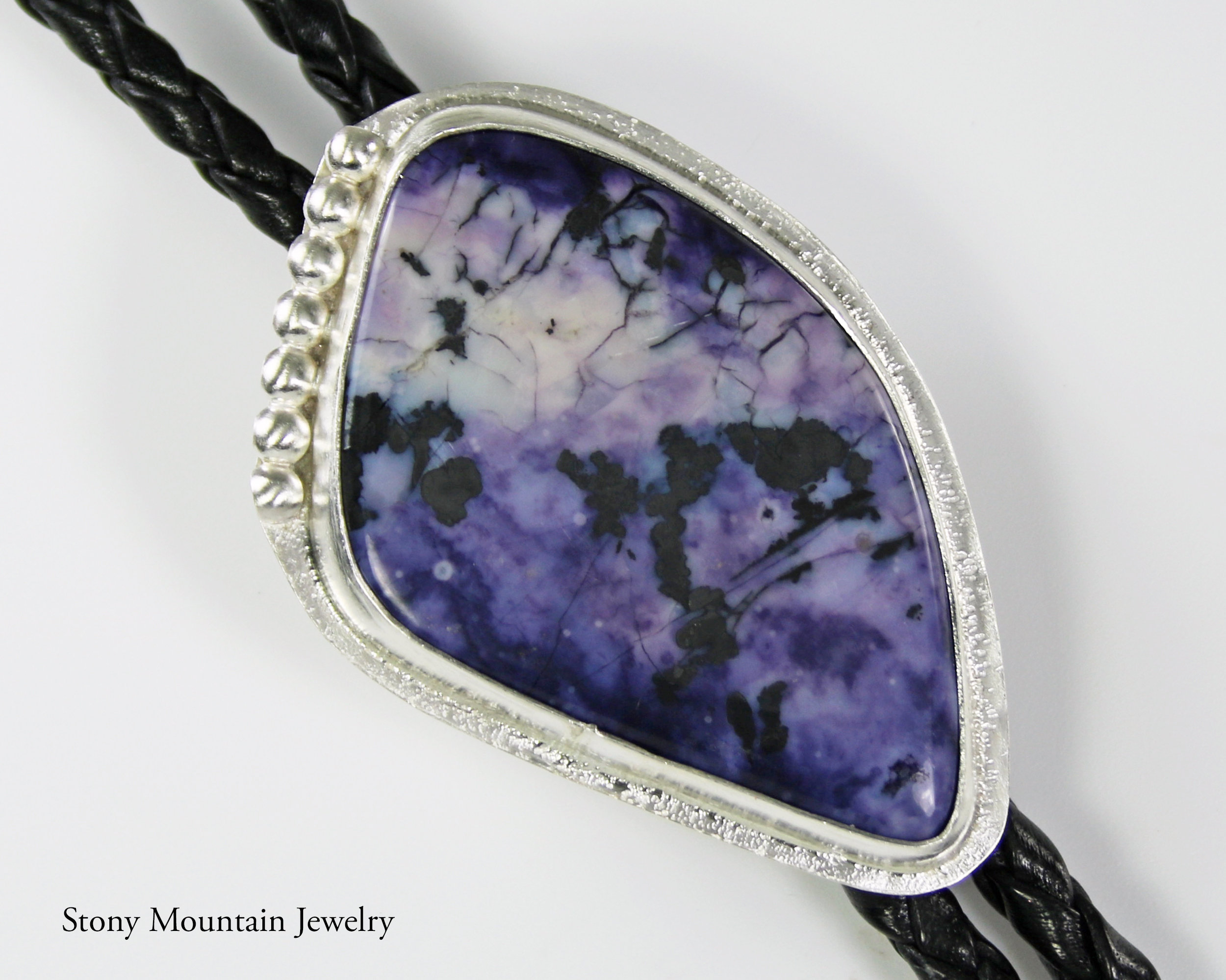 Contemporary Bolo Tie. No rules - this beautiful bolo can be worn by men or women. A wonderful alternative for formal attire or a funky bit of dress up with a tee shirt - NO rules apply for Bolo Ties! Hand cut freeform rare Tiffany Stone is artistically set in sterling silver. The handcrafted slide uses friction rather than a mechanical device. This slide will keep your tie securely in place without crimping the leather cord. Lapidary work, design and fabrication all done by Ran.