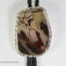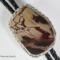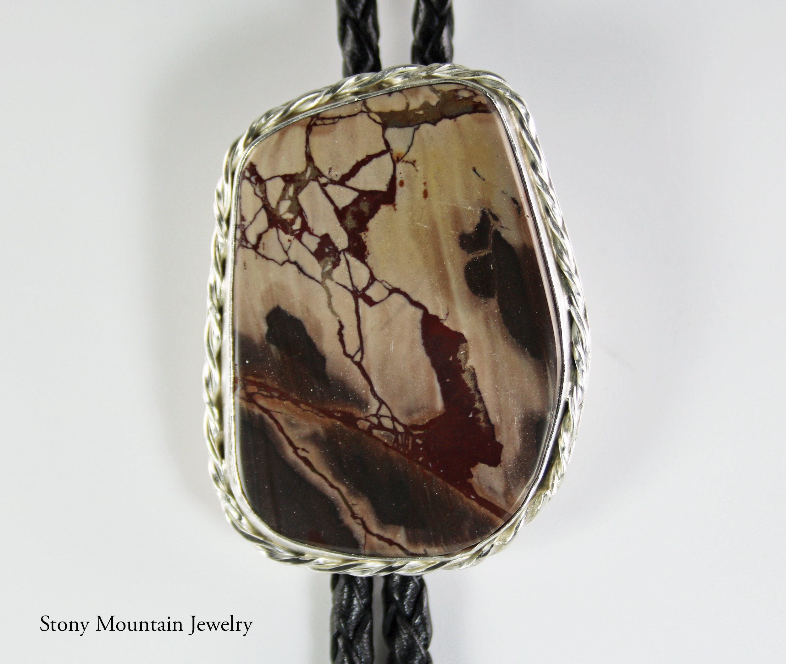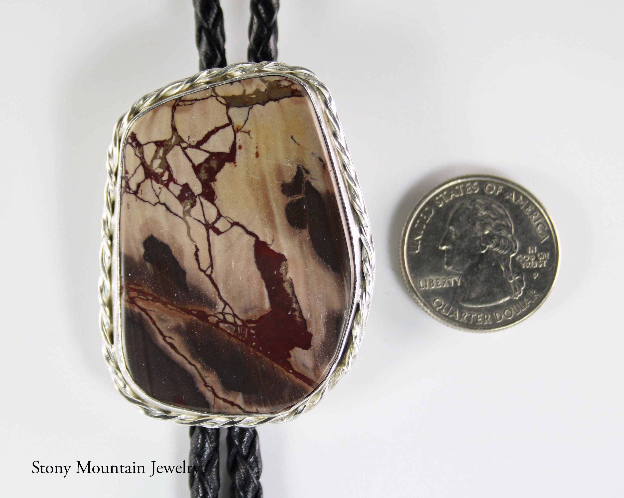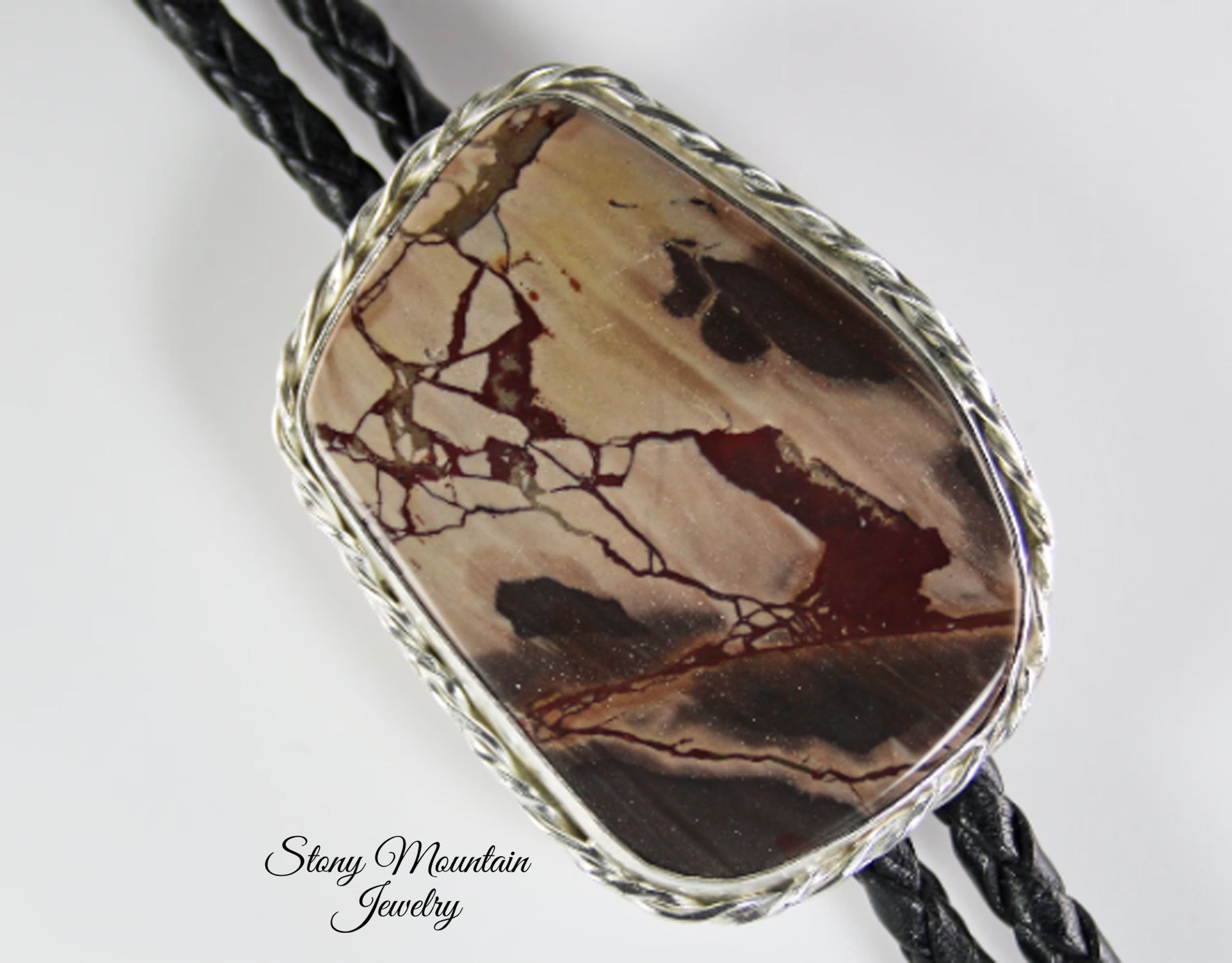Contemporary Bolo Tie. No rules - this beautiful bolo can be worn by men or women. A wonderful alternative for formal attire or a funky bit of dress up with a tee shirt - NO rules apply for Bolo Ties! Hand cut freeform Dead Camel Jasper aka Dead Ringer Jasper is artistically set in sterling silver. This beautiful stone has great color and structure. The handcrafted slide uses friction rather than a mechanical device. This slide will keep your tie securely in place without crimping the leather cord. Lapidary work, design and fabrication all done by Ran.