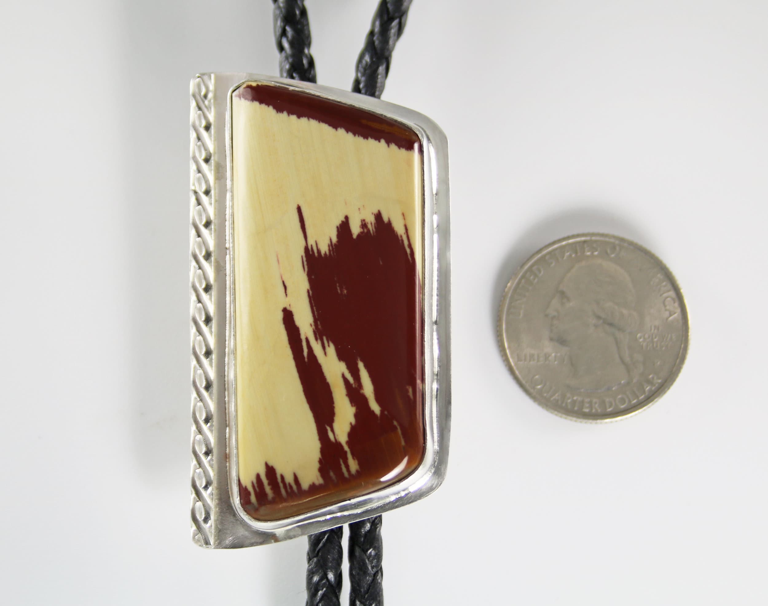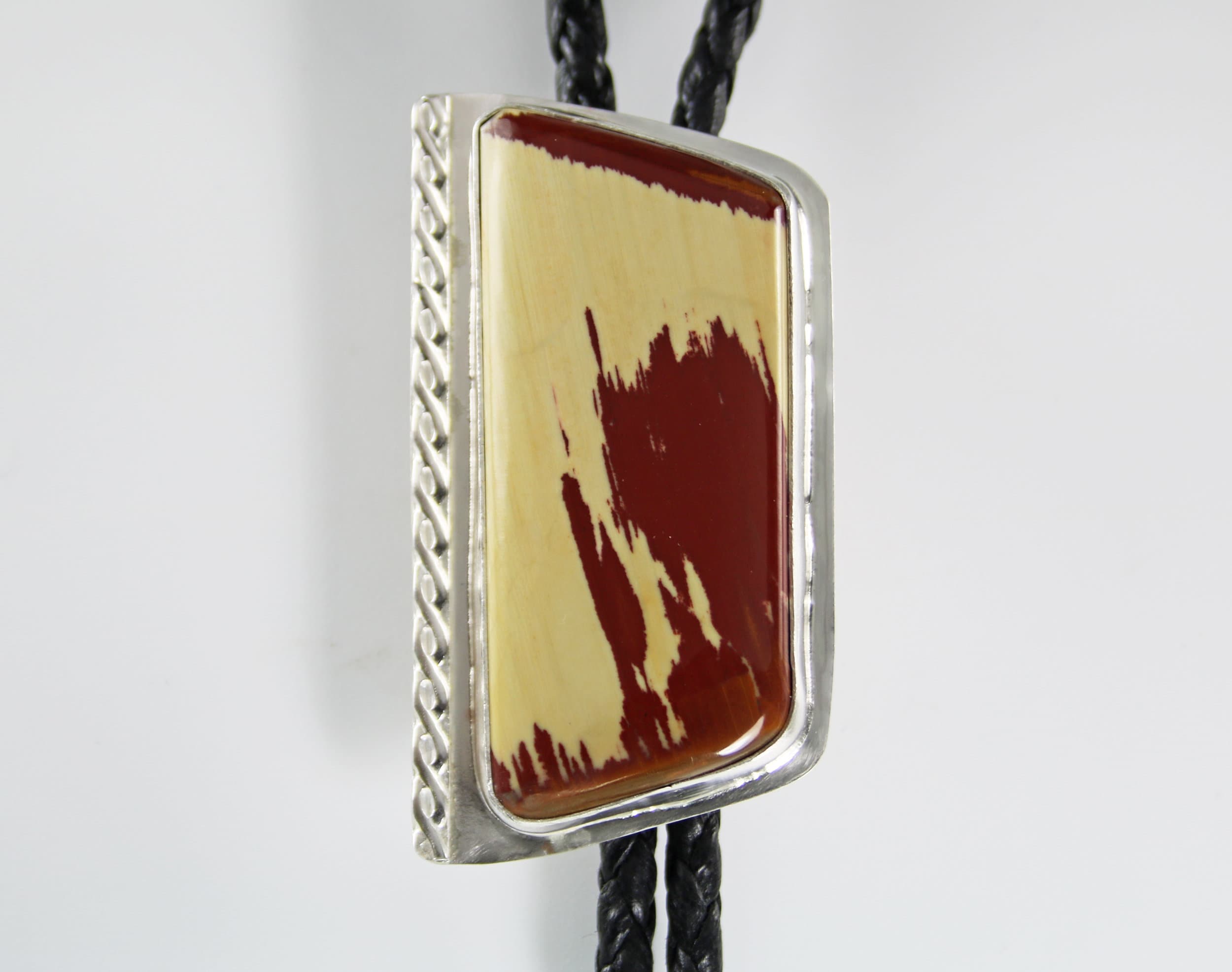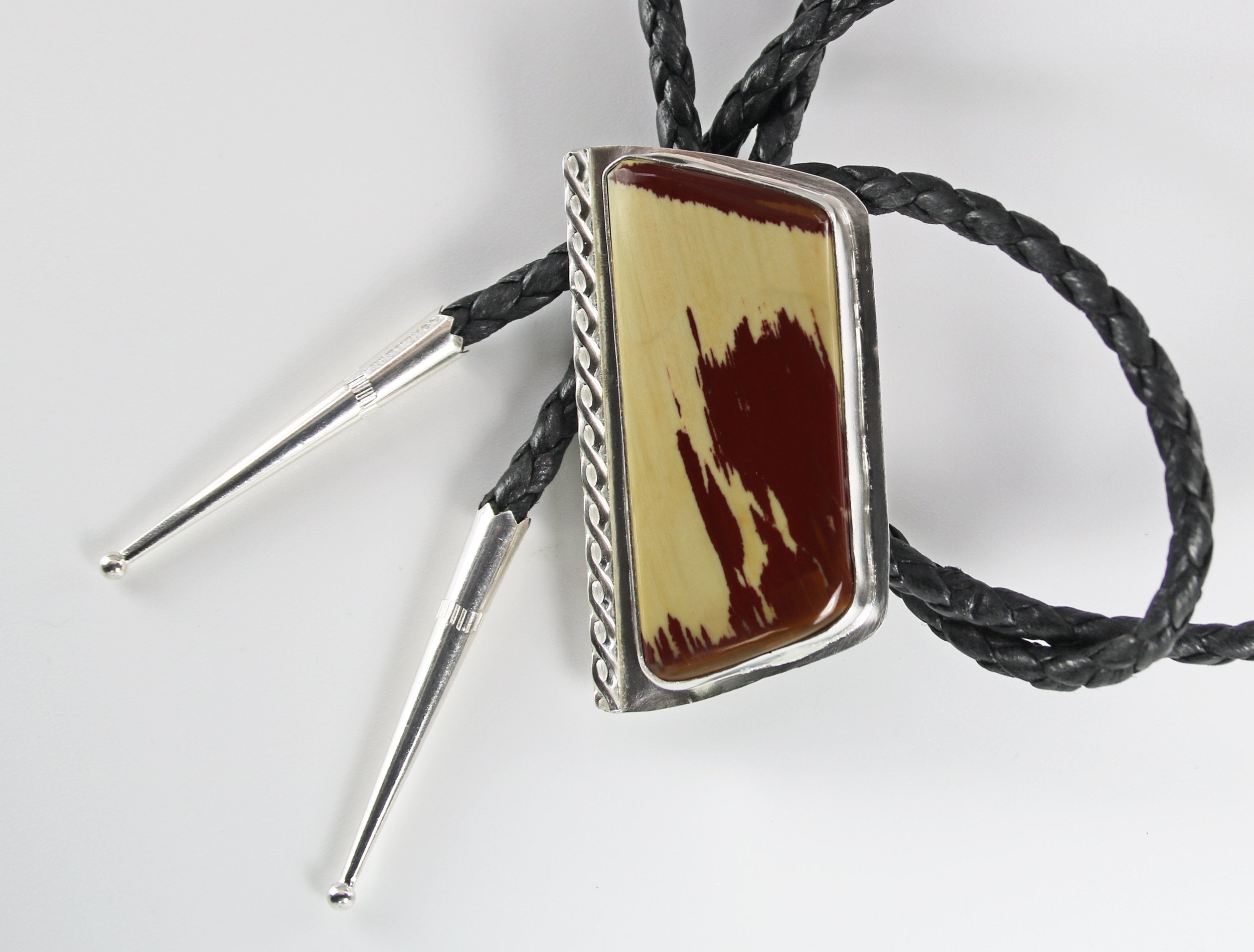 Contemporary Bolo Tie. No rules - this beautiful bolo can be worn by men or women. A wonderful alternative for formal attire or a funky bit of dress up with a tee shirt - NO rules apply for Bolo Ties! Rare hand cut freeform Owyhee Jasper is artistically set in sterling silver. This unusual stone is accented with three sterling silver balls The handcrafted slide uses friction rather than a mechanical device. This slide will keep your tie securely in place without crimping the leather cord. Lapidary work, design and fabrication all done by Ran. Your choice of black or brown cord.
