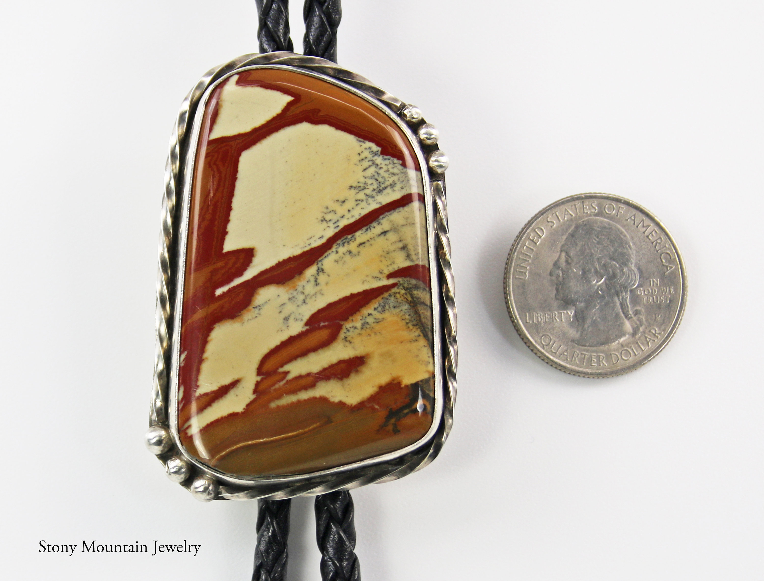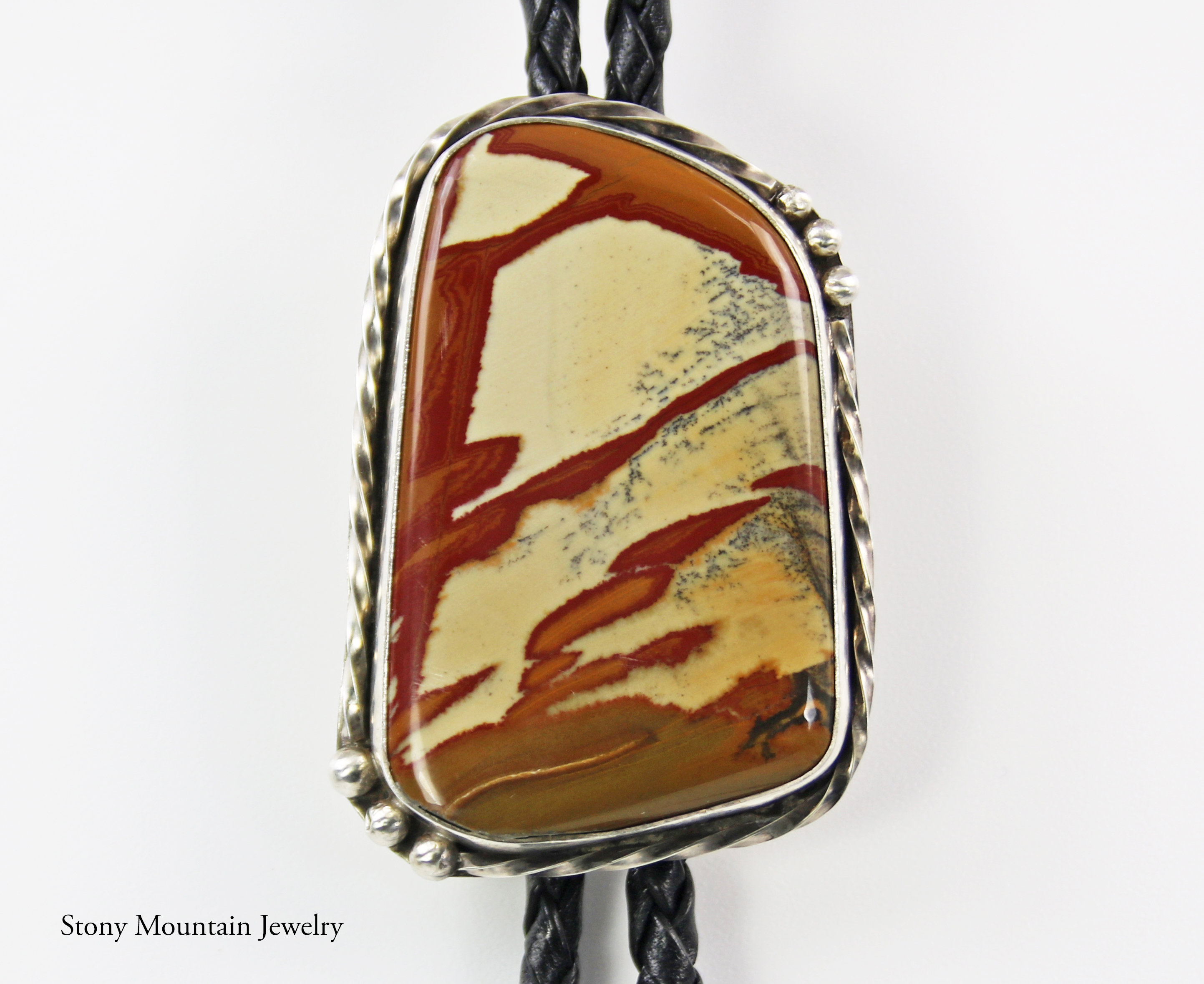 Contemporary Bolo Tie. No rules - this beautiful bolo can be worn by men or women. A wonderful alternative for formal attire or a funky bit of dress up with a tee shirt - NO rules apply for Bolo Ties! Rare hand cut freeform Owyhee Jasper is artistically set in sterling silver. This unusual stone is accented with three sterling silver balls The handcrafted slide uses friction rather than a mechanical device. This slide will keep your tie securely in place without crimping the leather cord. Lapidary work, design and fabrication all done by Ran. Your choice of black or brown cord.