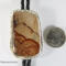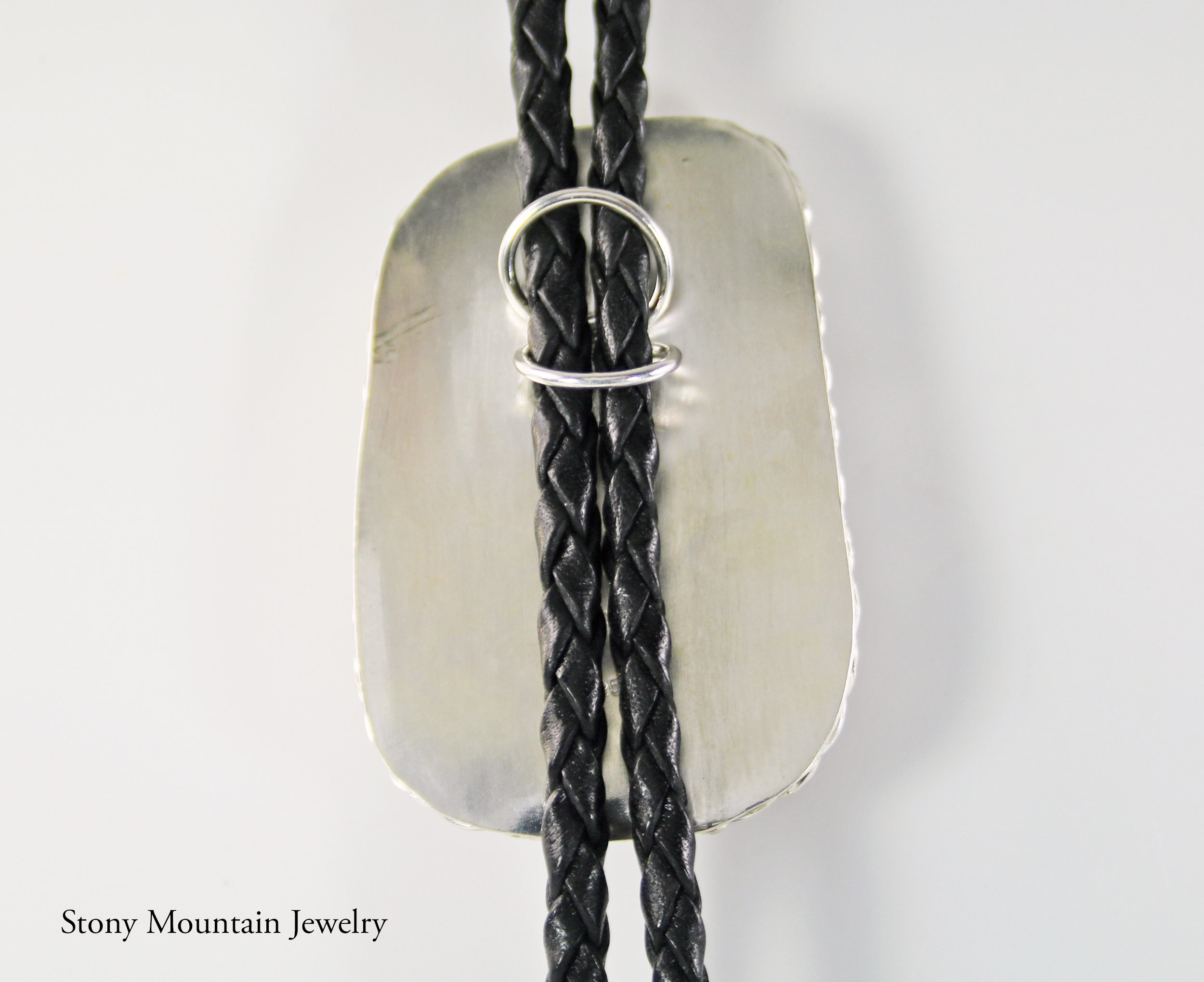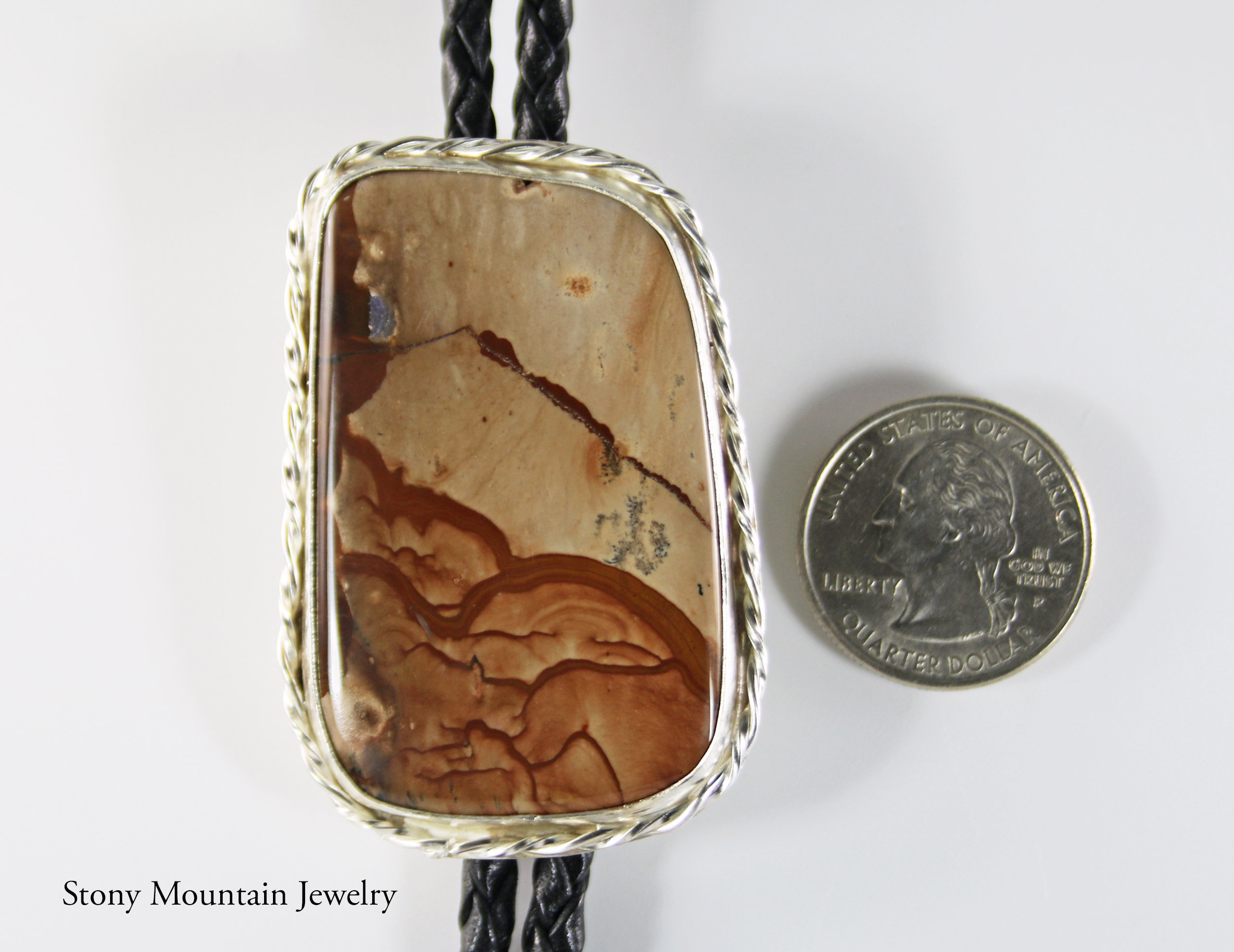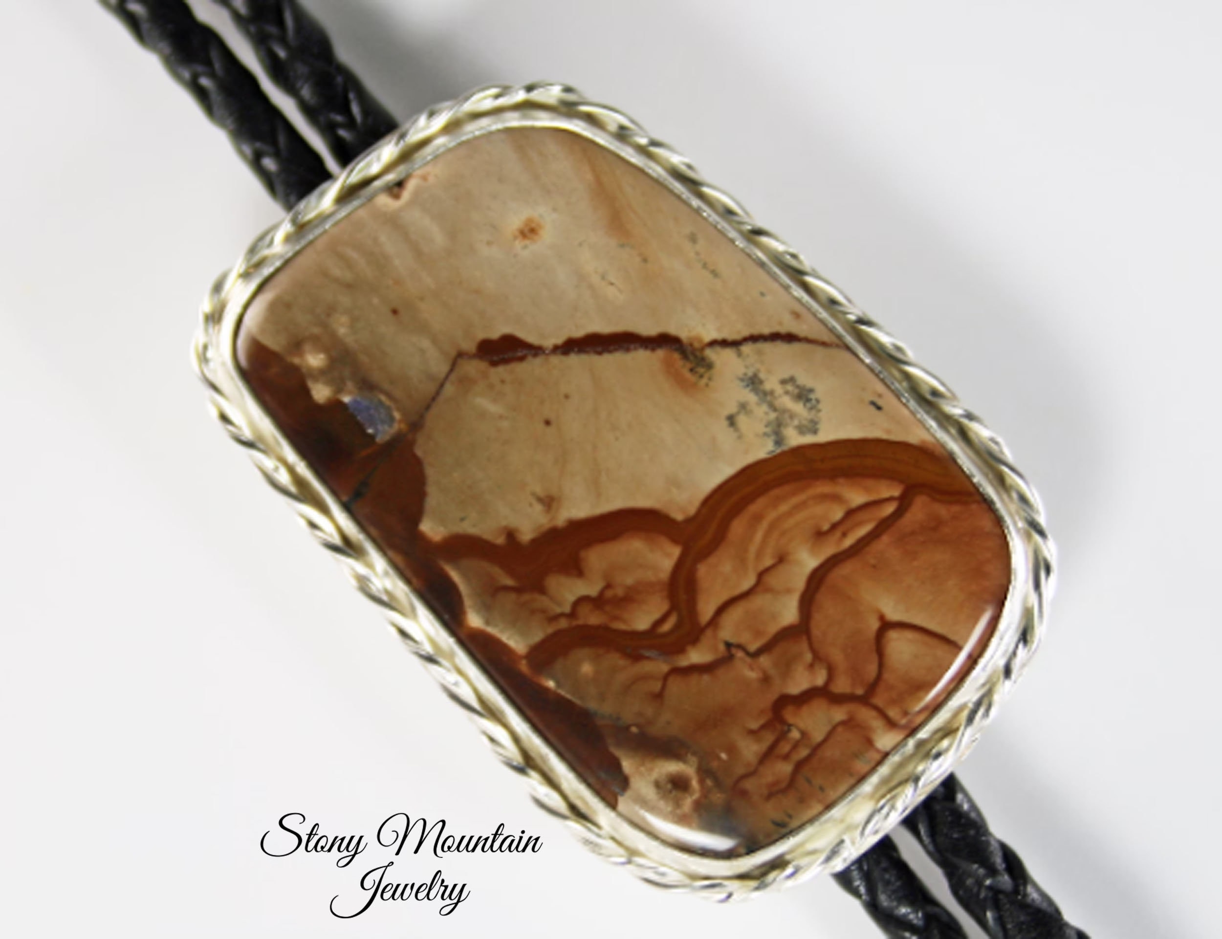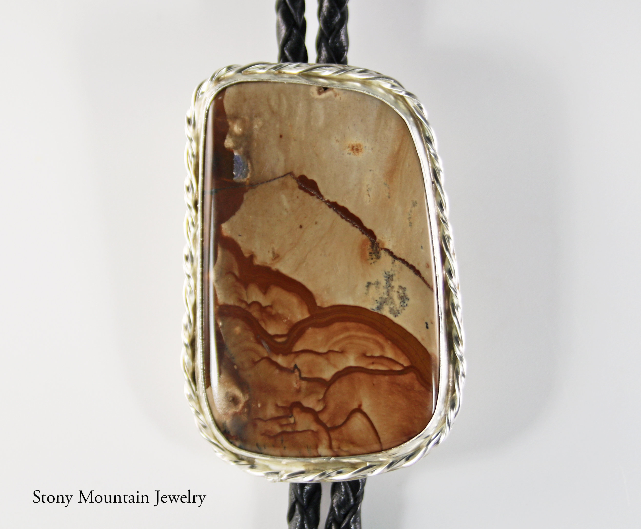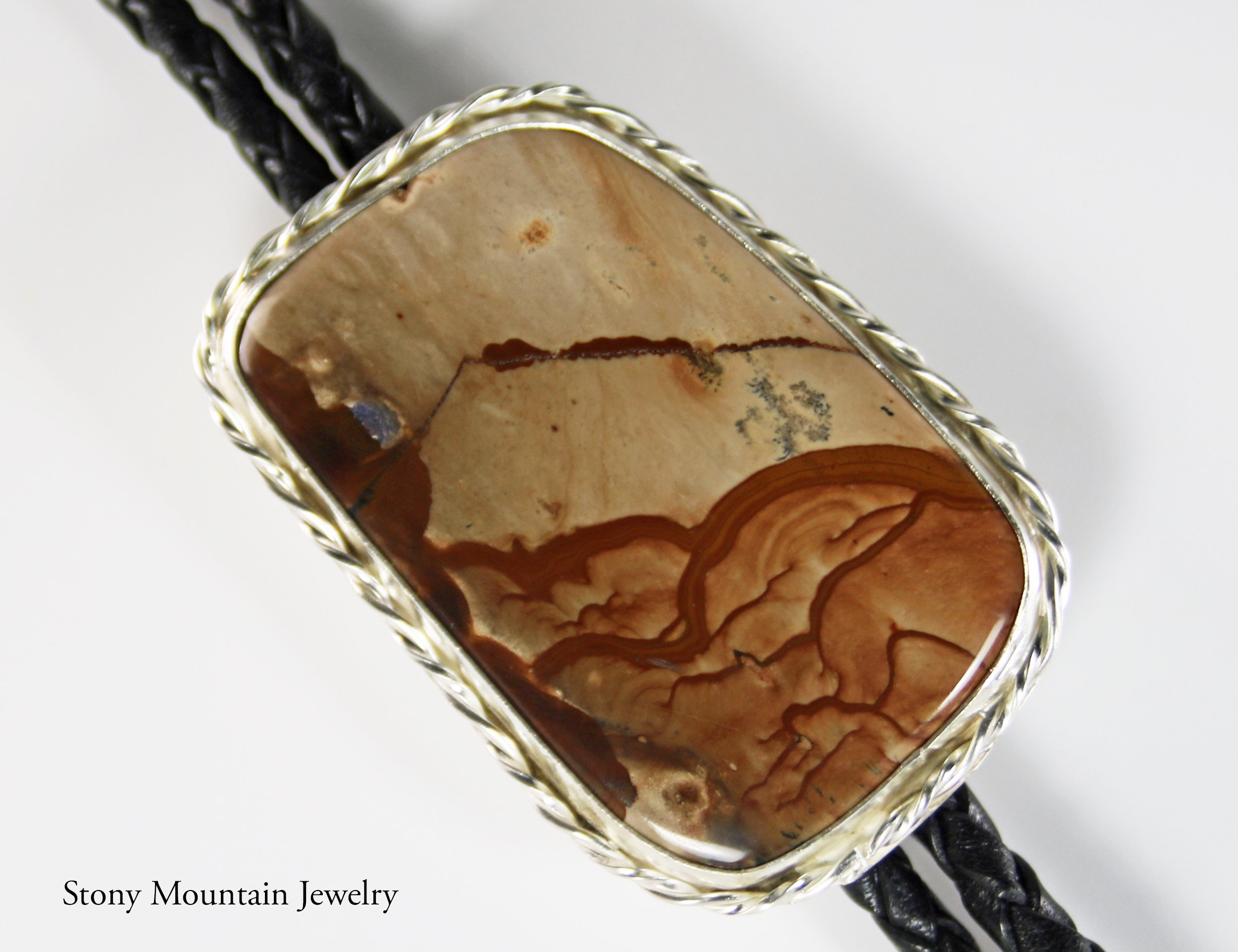 Contemporary Bolo Tie. No rules - this beautiful bolo can be worn by men or women. A wonderful alternative for formal attire or a funky bit of dress up with a tee shirt - NO rules apply for Bolo Ties! Stunning hand cut freeform Biggs Picture Jasper is artistically set in sterling silver. This stone is a wonderful example of this type of picture jasper. The handcrafted slide uses friction rather than a mechanical device. This slide will keep your tie securely in place without crimping the leather cord. Lapidary work, design and fabrication all done by Ran.