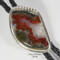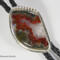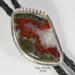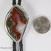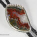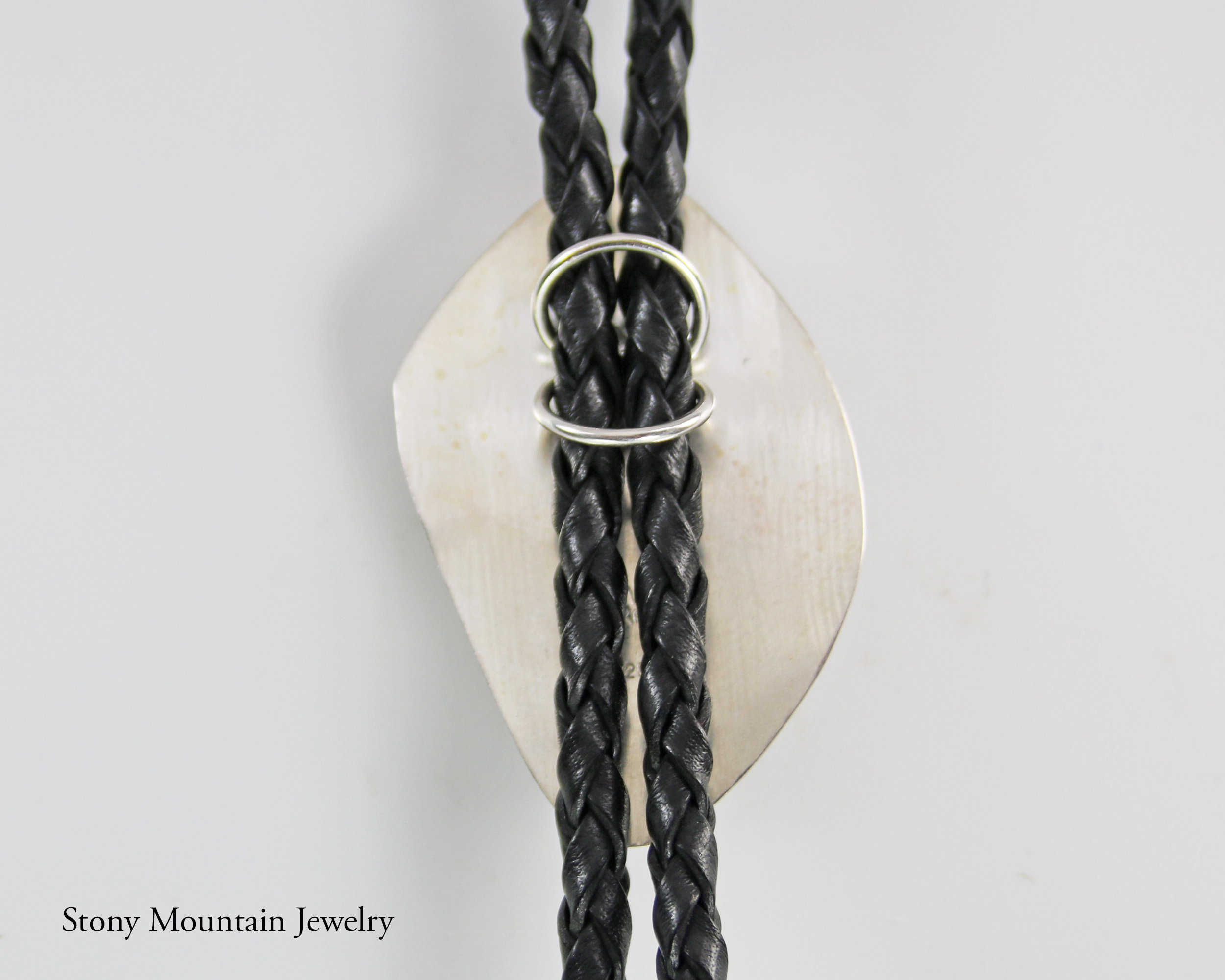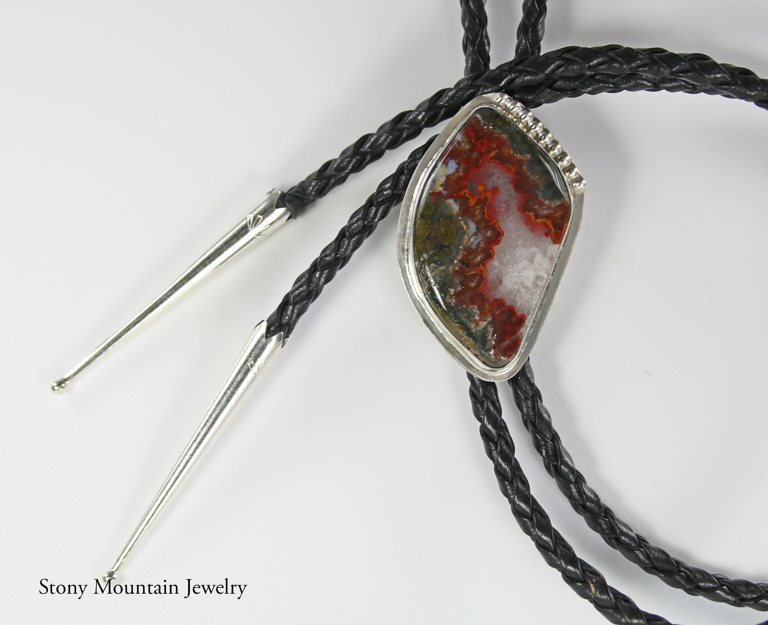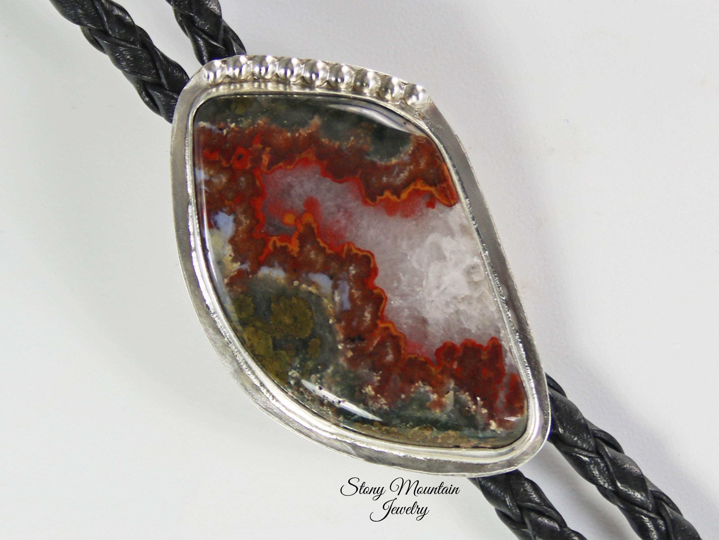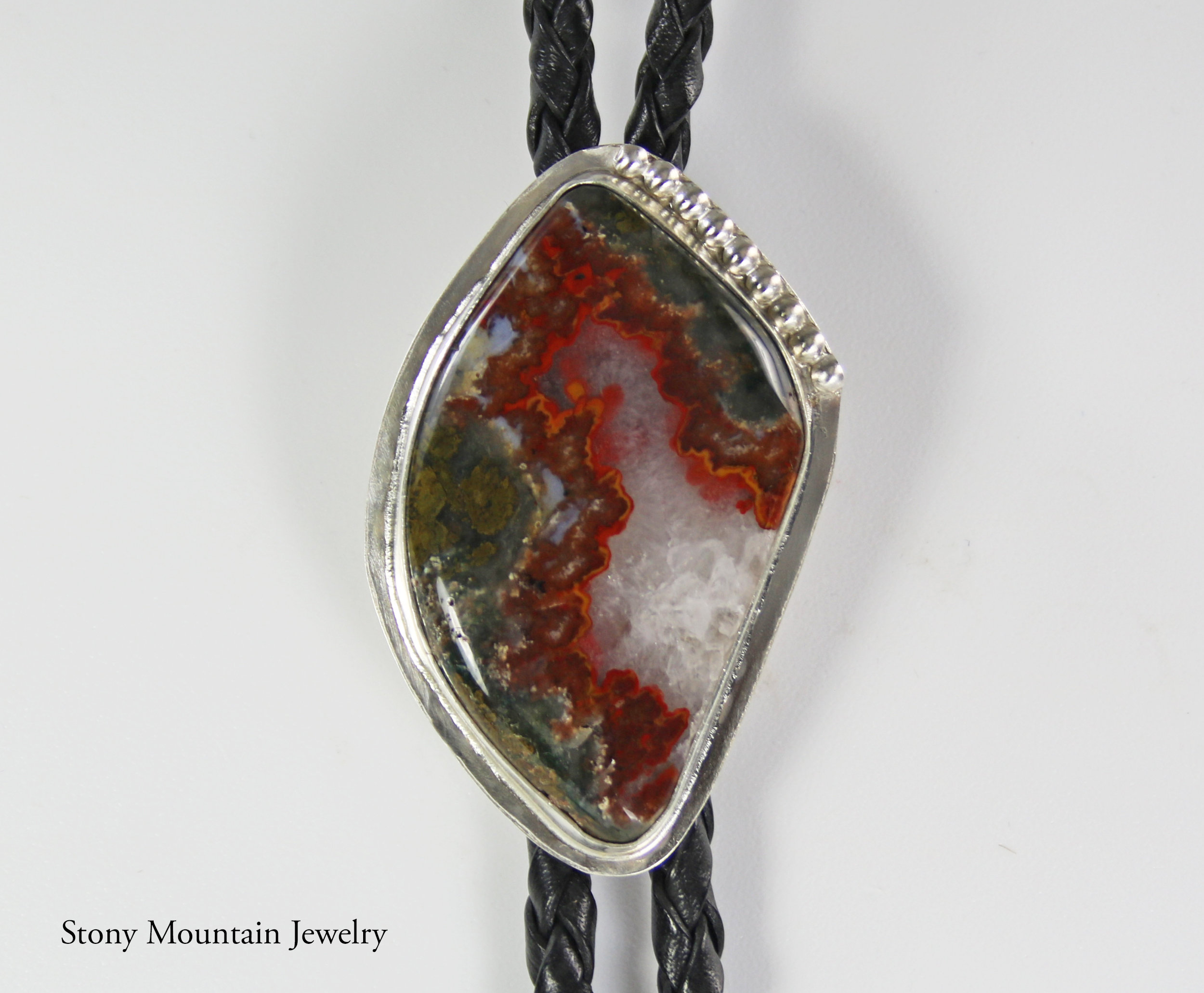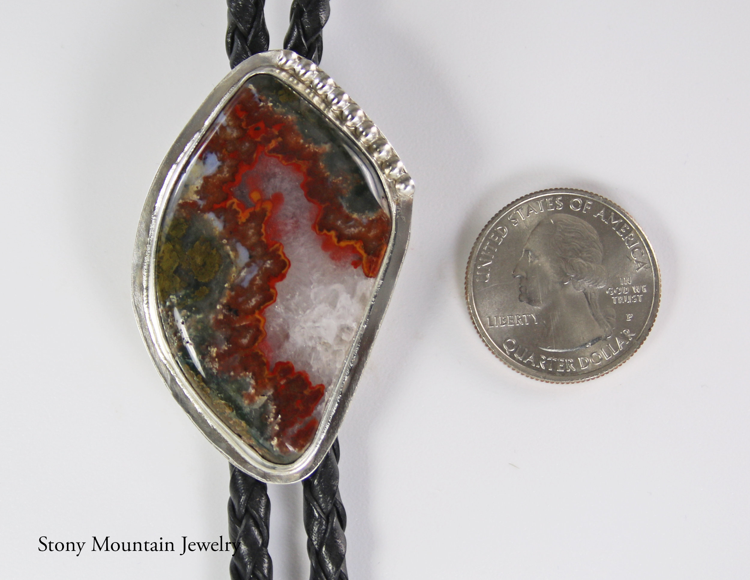 Our handmade Moroccan Seam Agate Bolo Tie is a unique and stylish piece for men and women. This designer bolo tie features a large hand cut seam agate cabochon artistically set in sterling silver. A one-of-a-kind accessory, perfect for any formal or casual occasion. This stunning stone is truly a spectacular collector piece. This stone was hand cut from very old stock material. The handcrafted slide uses friction rather than a mechanical device. This slide will keep your tie securely in place without crimping the leather cord. Lapidary work, design and fabrication all done by Ran.