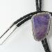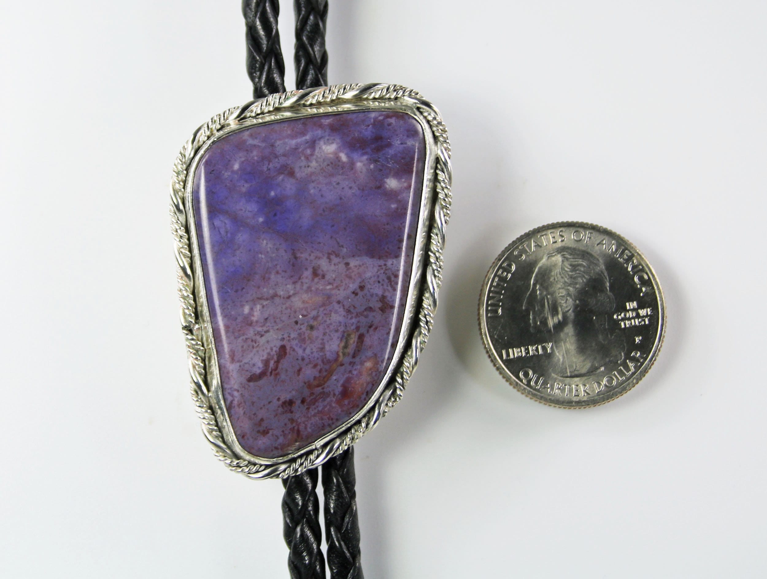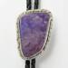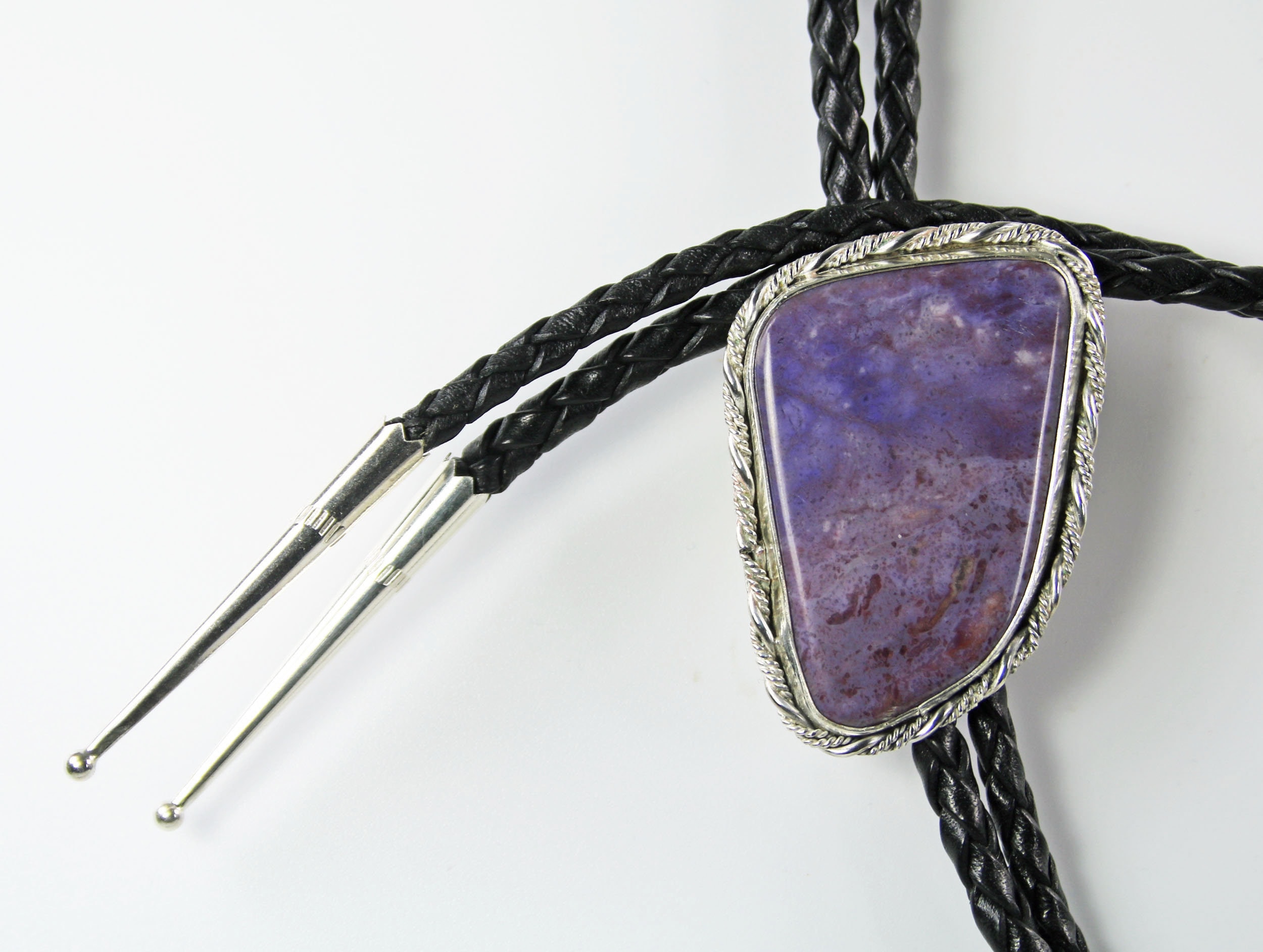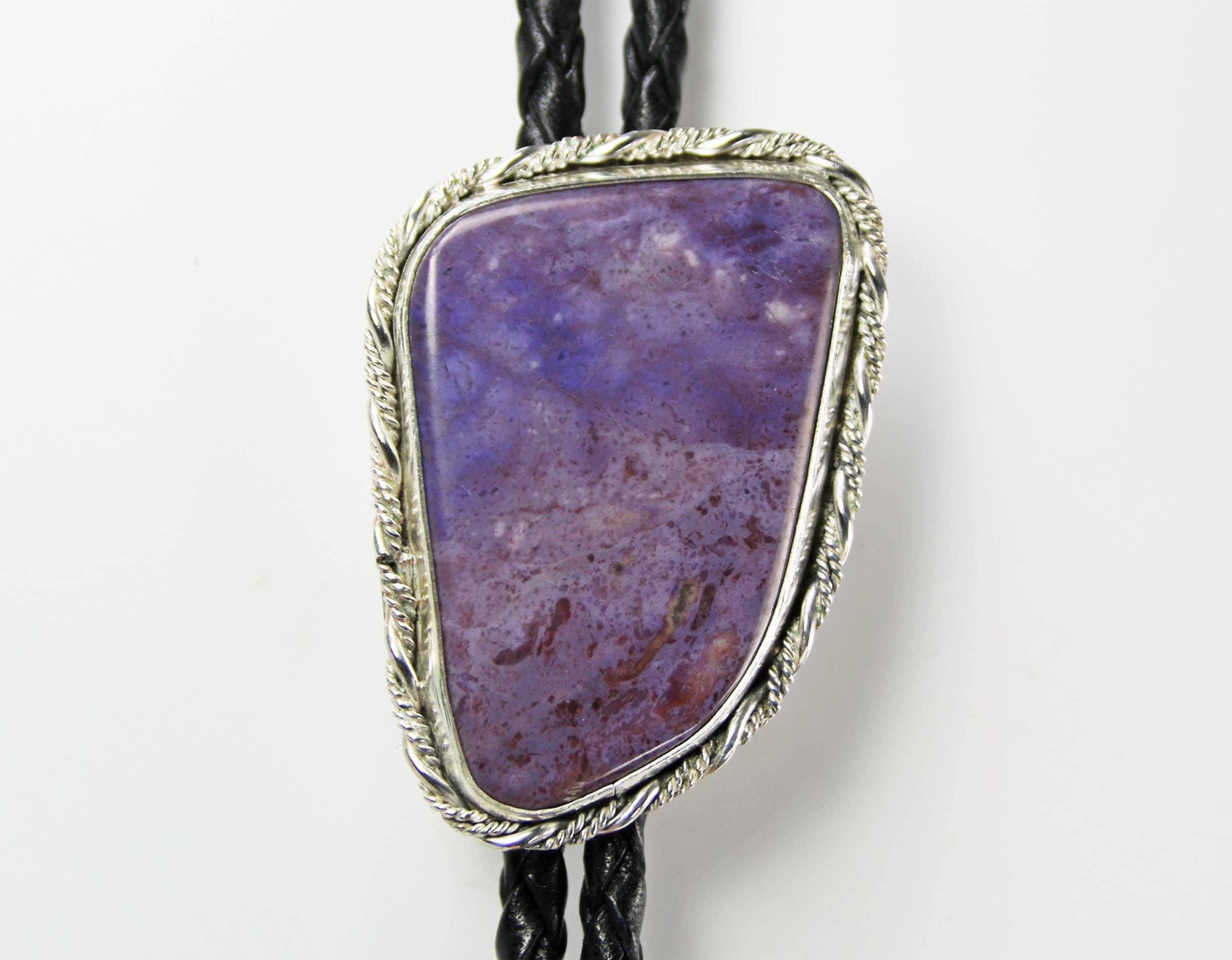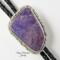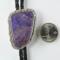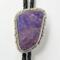 One of a Kind Contemporary Bolo Tie. No rules - this beautiful bolo can be worn by men or women. A wonderful alternative for formal attire or a funky bit of dress up with a tee shirt - NO rules apply for Bolo Ties! Rare hand cut freeform Purple Jade cabochon is artistically set in sterling silver. This stone has beautiful mottled shades of purple. The handcrafted slide uses friction rather than a mechanical device. This slide will keep your tie securely in place without crimping the leather cord. Lapidary work, design and fabrication all done by Ran.