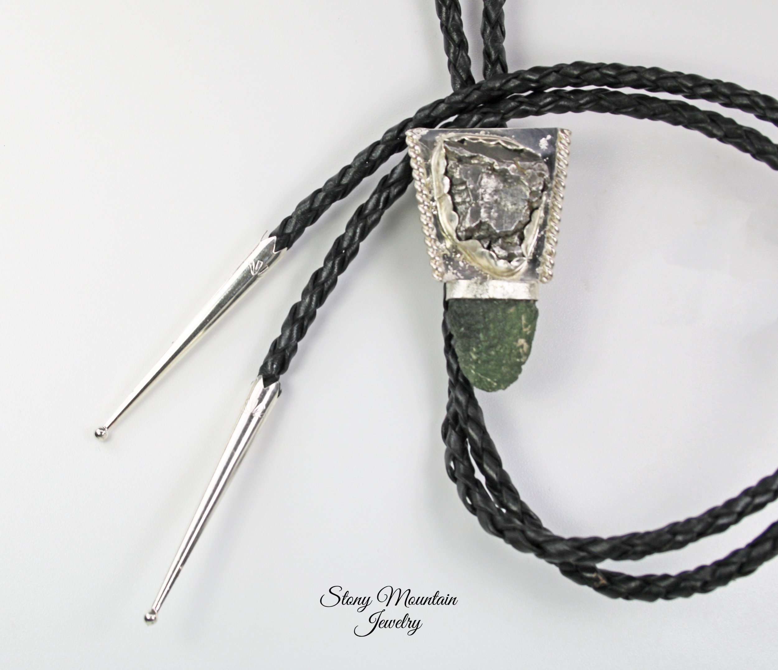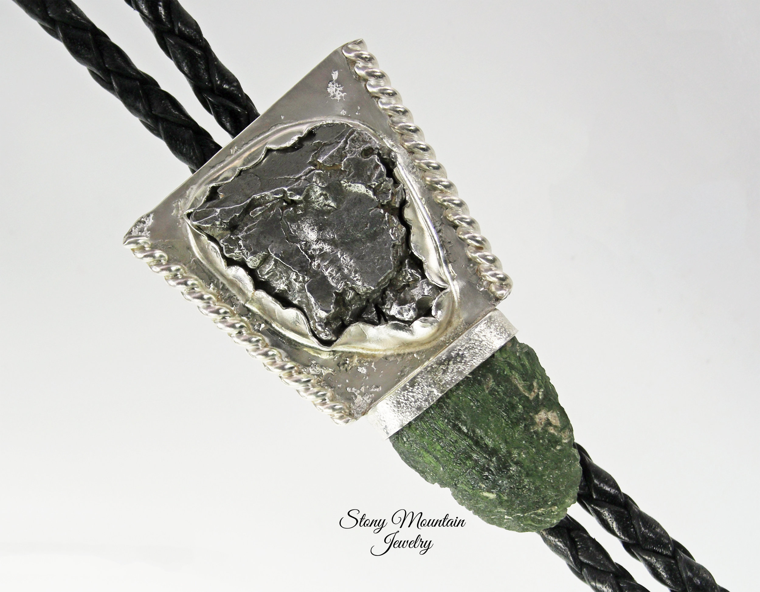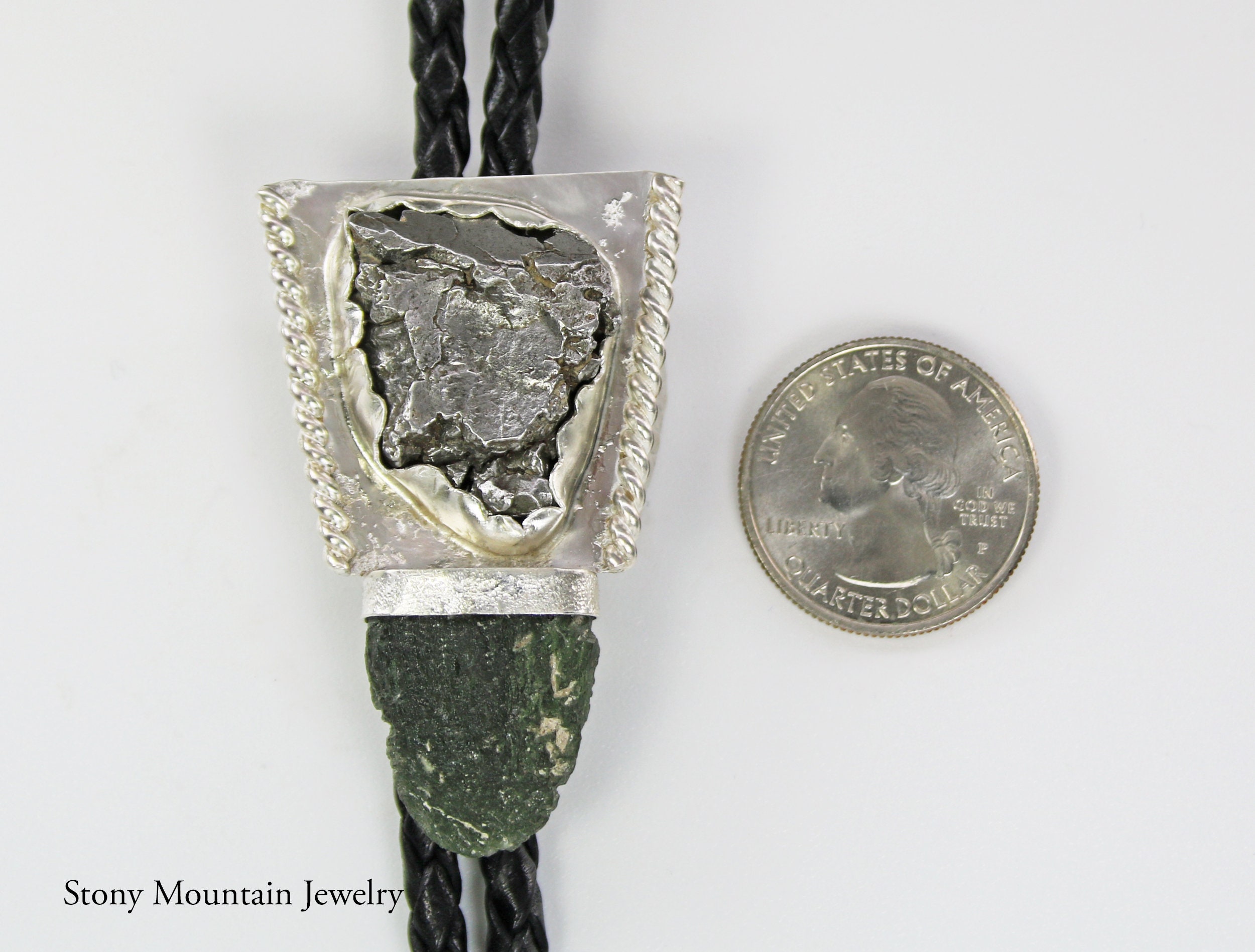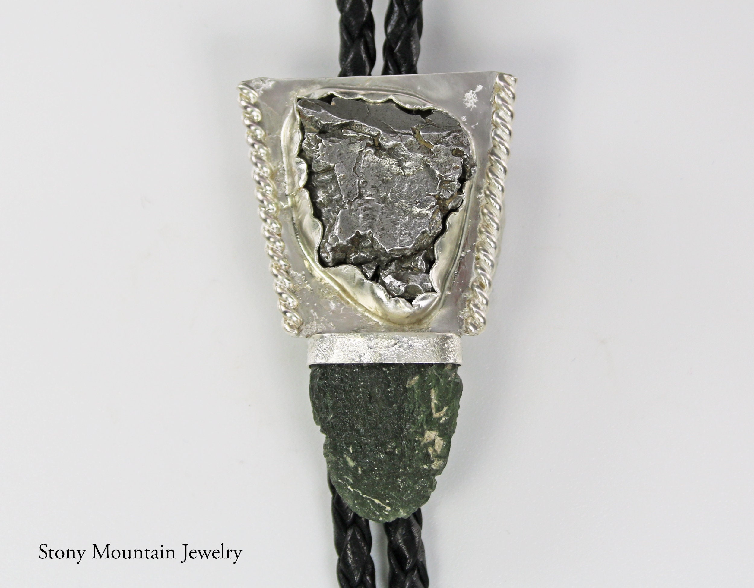 One of a Kind Contemporary Designer Bolo Tie. No rules - this beautiful bolo can be worn by men or women. A wonderful alternative for formal attire or a funky bit of dress up with a tee shirt - NO rules apply for Bolo Ties! Hand cut freeform Meteorite is artistically set in textured sterling silver and features a rare large Moldavite addition. The handcrafted slide uses friction rather than a mechanical device. This slide will keep your tie securely in place without crimping the leather cord. Lapidary work, design and fabrication all done by Ran. The cracks and crevices on the face of the meteorite are tactile and add to the interest of this piece.