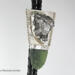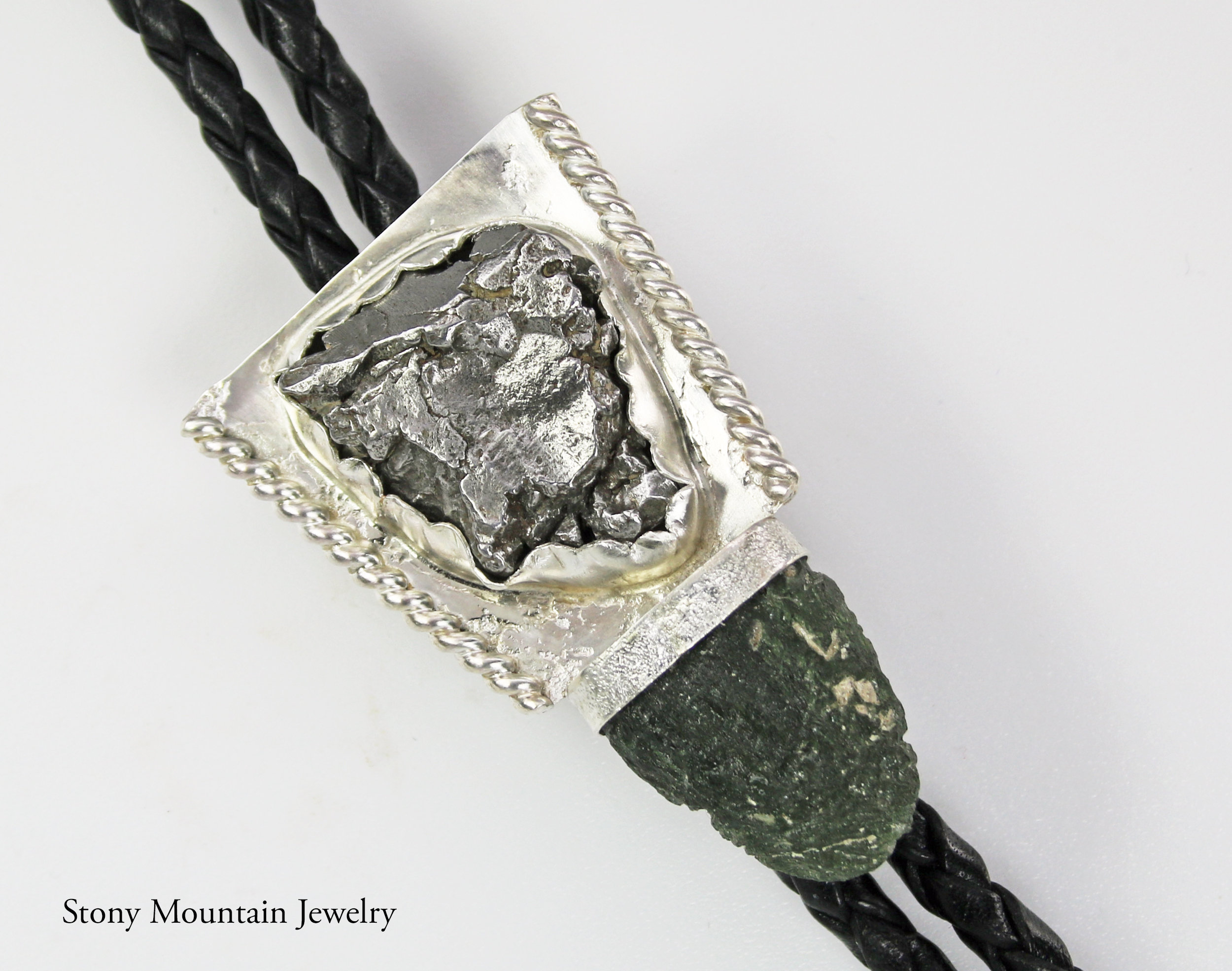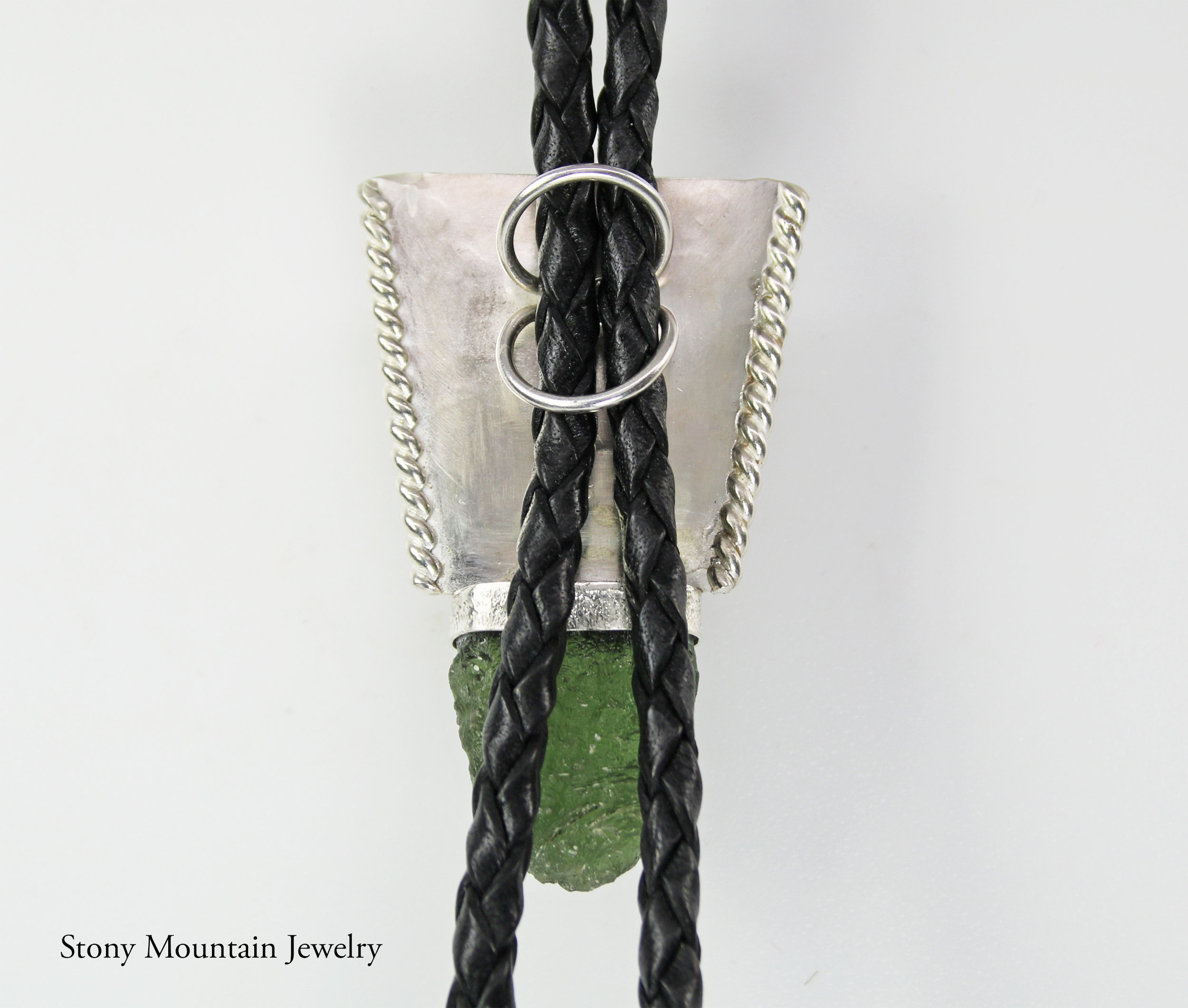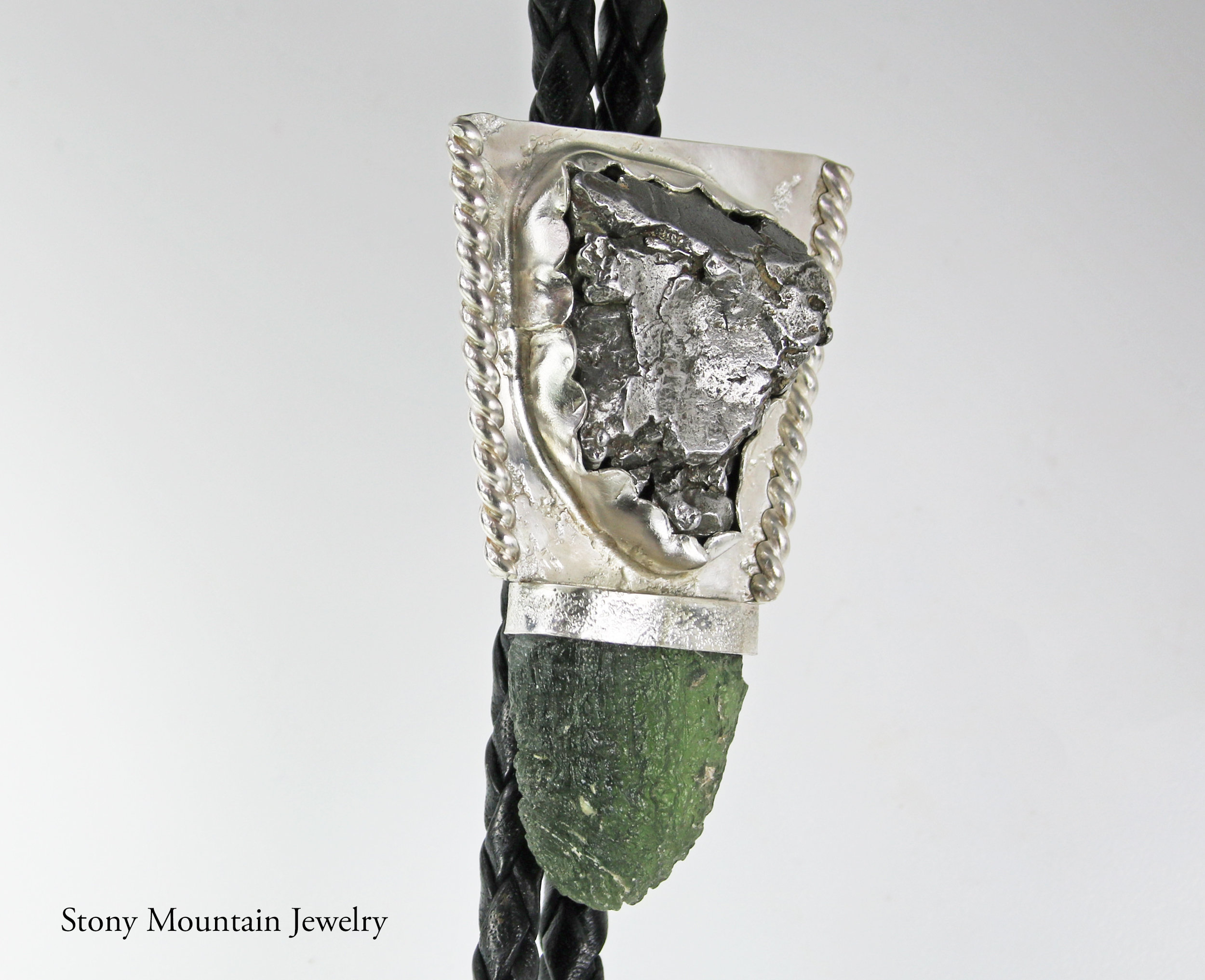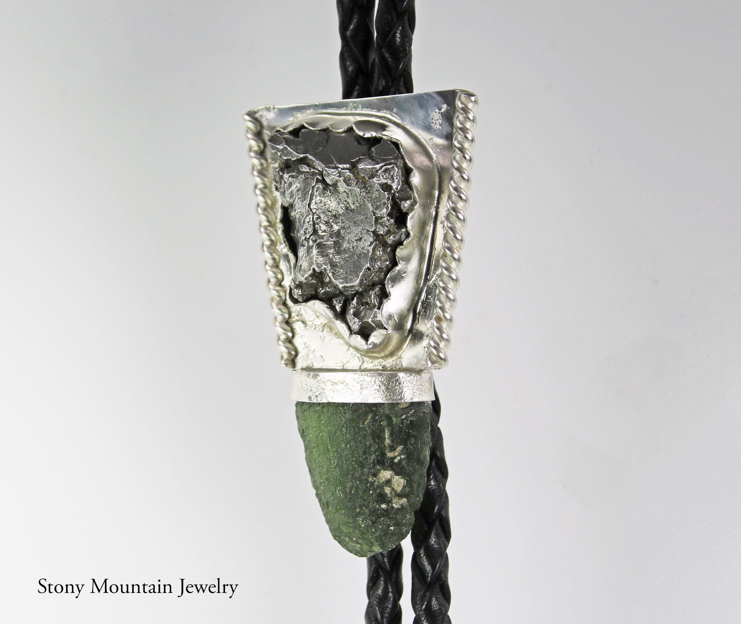One of a Kind Contemporary Designer Bolo Tie. No rules - this beautiful bolo can be worn by men or women. A wonderful alternative for formal attire or a funky bit of dress up with a tee shirt - NO rules apply for Bolo Ties! Hand cut freeform Meteorite is artistically set in textured sterling silver and features a rare large Moldavite addition. The handcrafted slide uses friction rather than a mechanical device. This slide will keep your tie securely in place without crimping the leather cord. Lapidary work, design and fabrication all done by Ran. The cracks and crevices on the face of the meteorite are tactile and add to the interest of this piece.