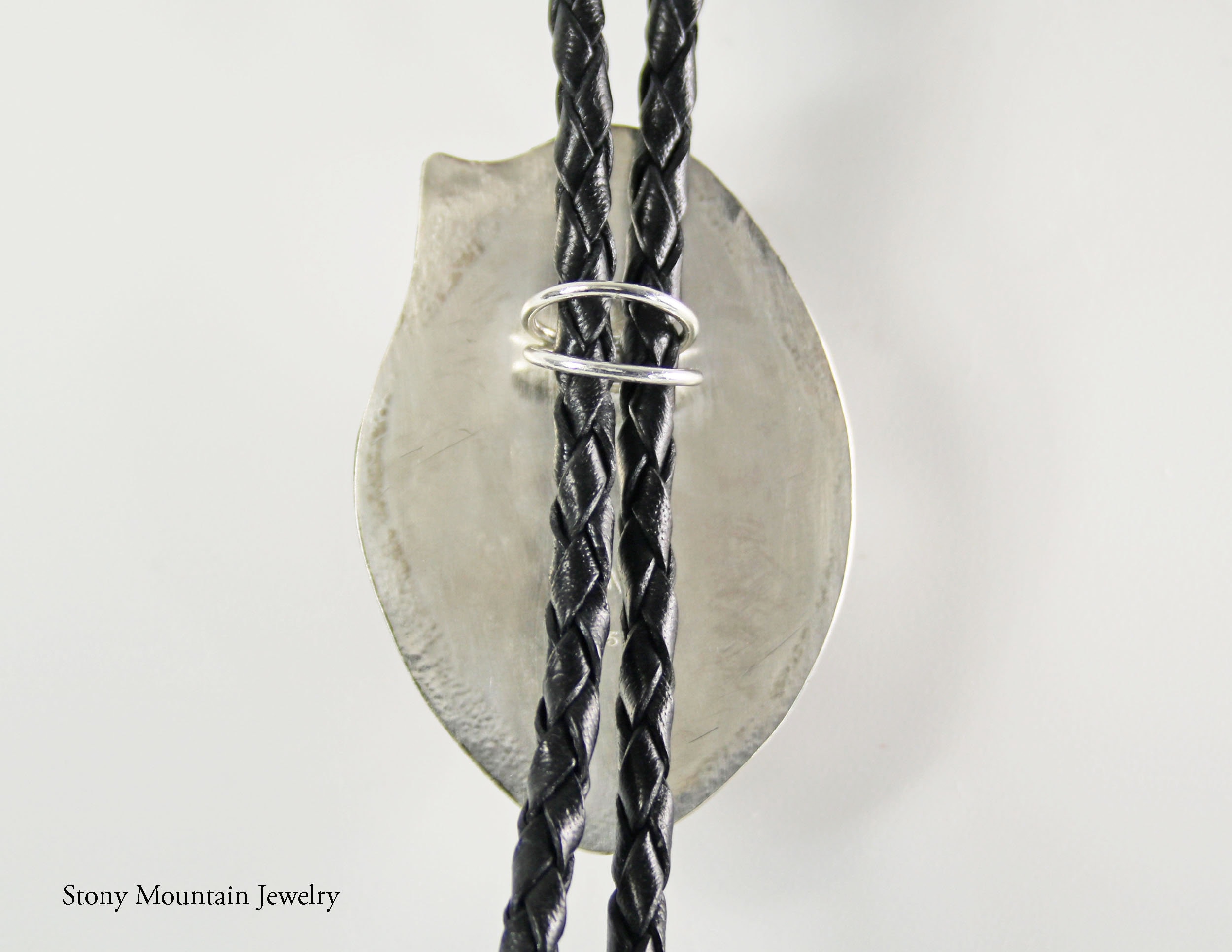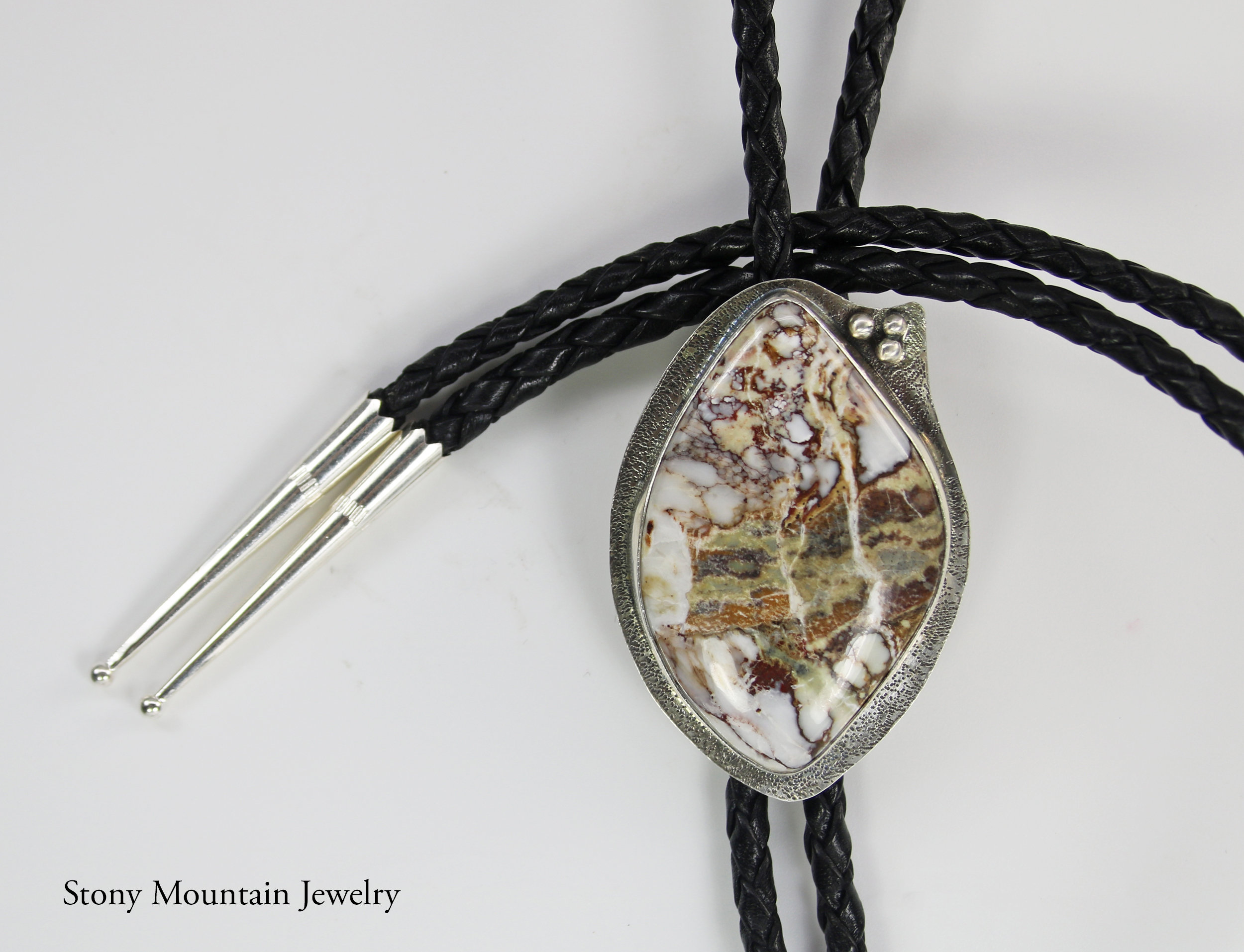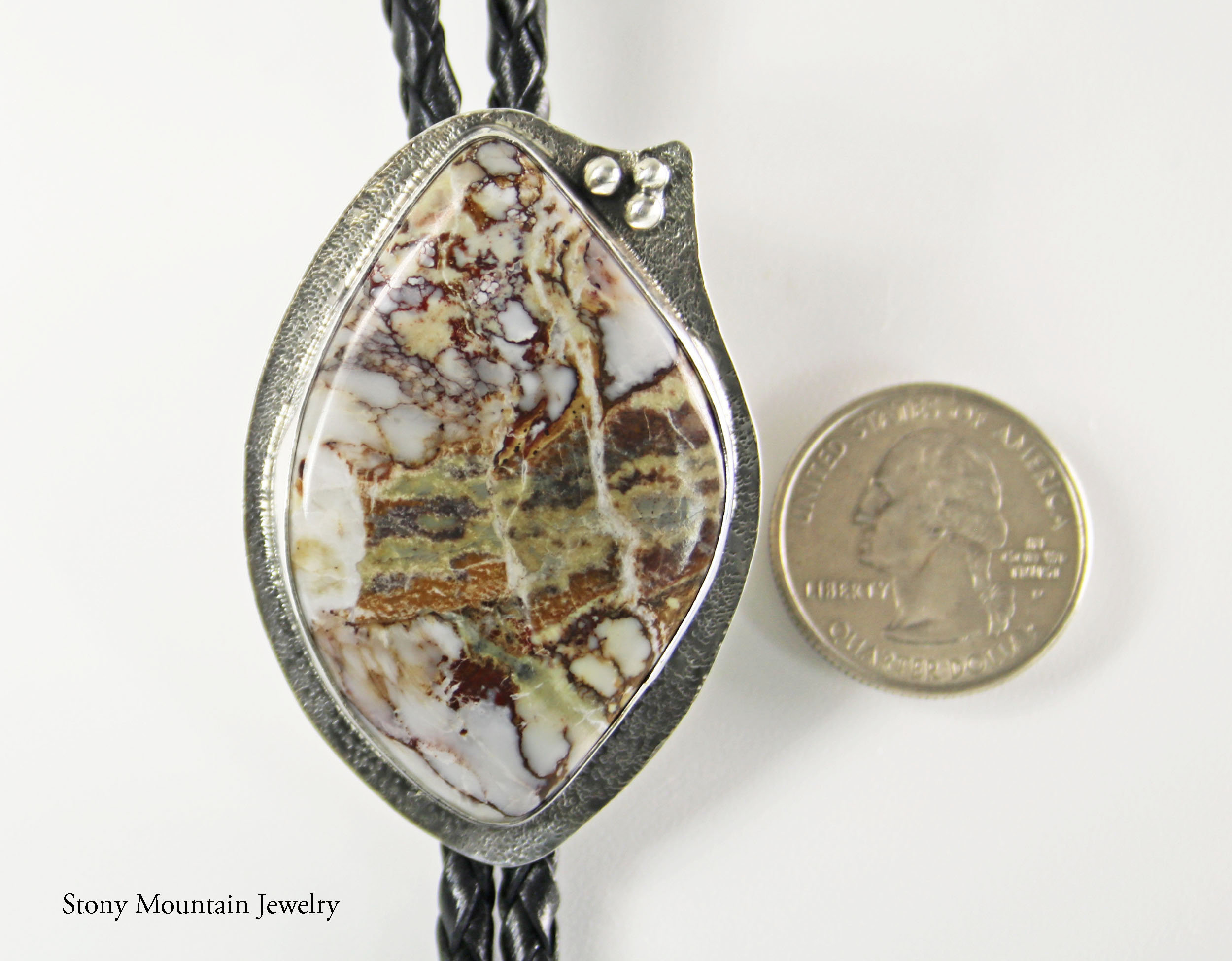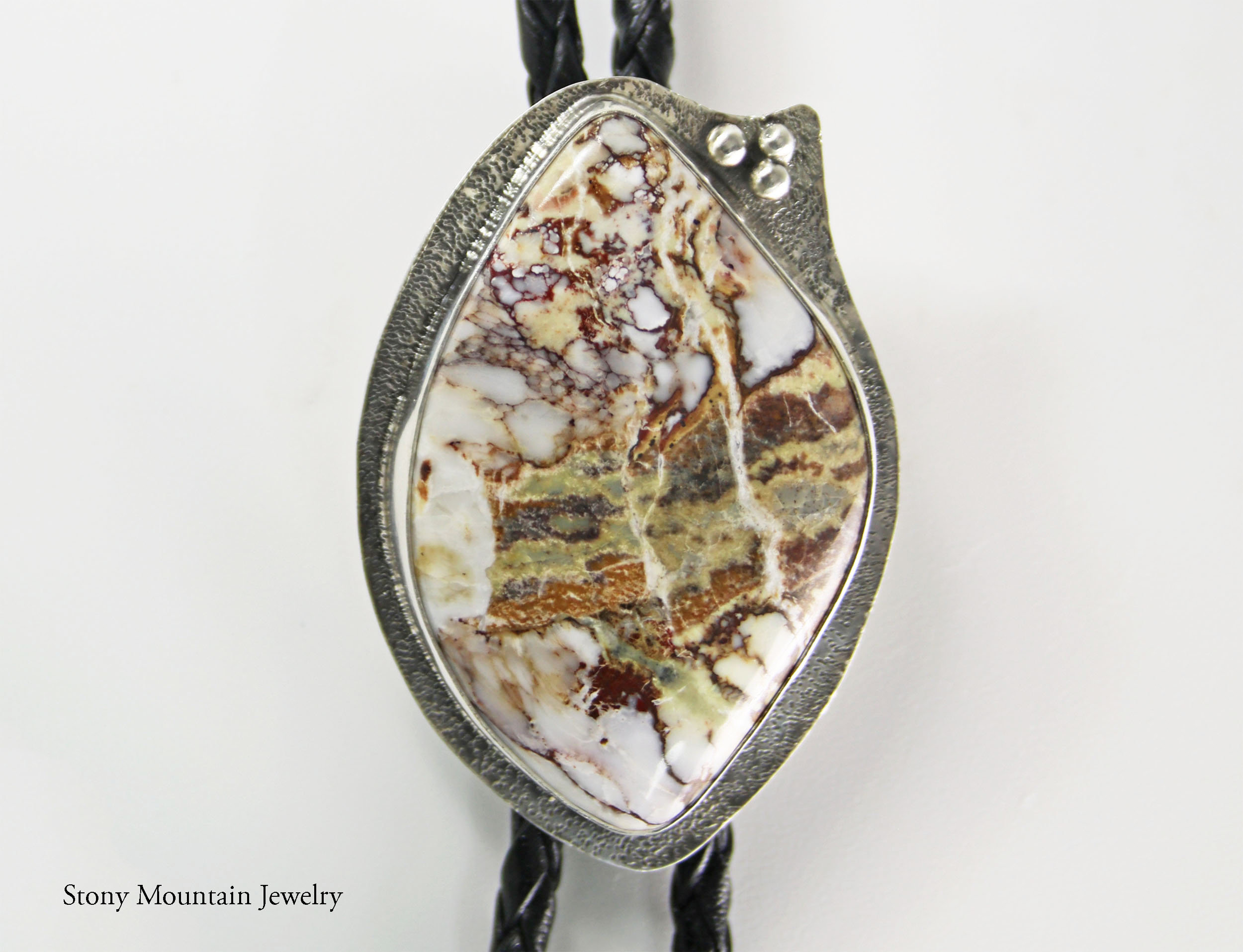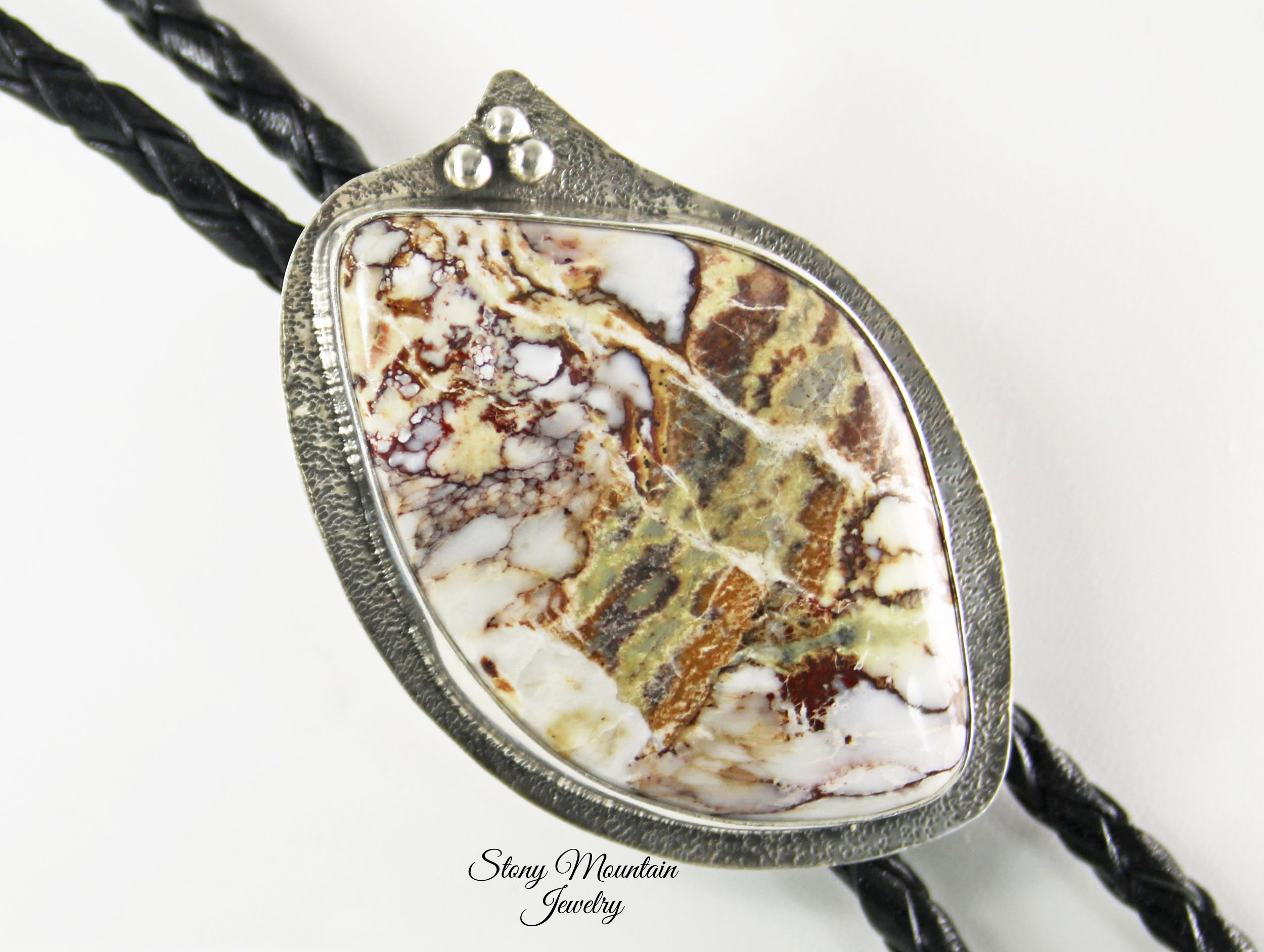 Contemporary Bolo Tie. No rules - this beautiful bolo can be worn by men or women. A wonderful alternative for formal attire or a funky bit of dress up with a tee shirt - NO rules apply for Bolo Ties! Rare hand cut freeform Wild Horse Magnesite is artistically set in sterling silver. This stone is a wonderful example of this rare picture stone. The handcrafted slide uses friction rather than a mechanical device. This slide will keep your tie securely in place without crimping the leather cord. Lapidary work, design and fabrication all done by Ran.