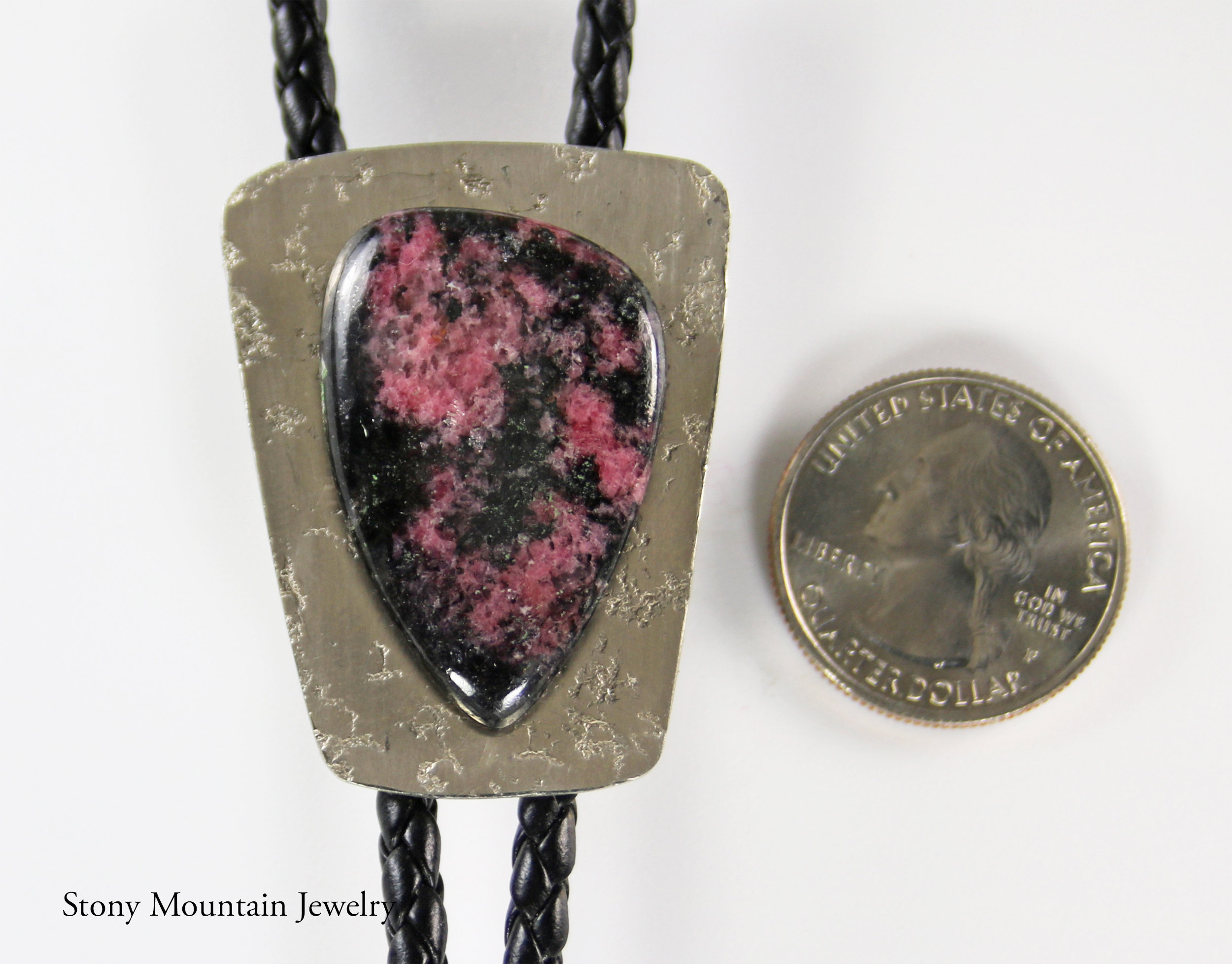 Contemporary Bolo Tie. No rules - this beautiful bolo can be worn by men or women. A wonderful alternative for formal attire or a funky bit of dress up with a tee shirt - NO rules apply for Bolo Ties! Beautiful Eudialyte hand cut cabochon is mounted on a textured pewter surround. The stainless steel mechanical slide allows your vegan cord to easily adjust and then stay in place.