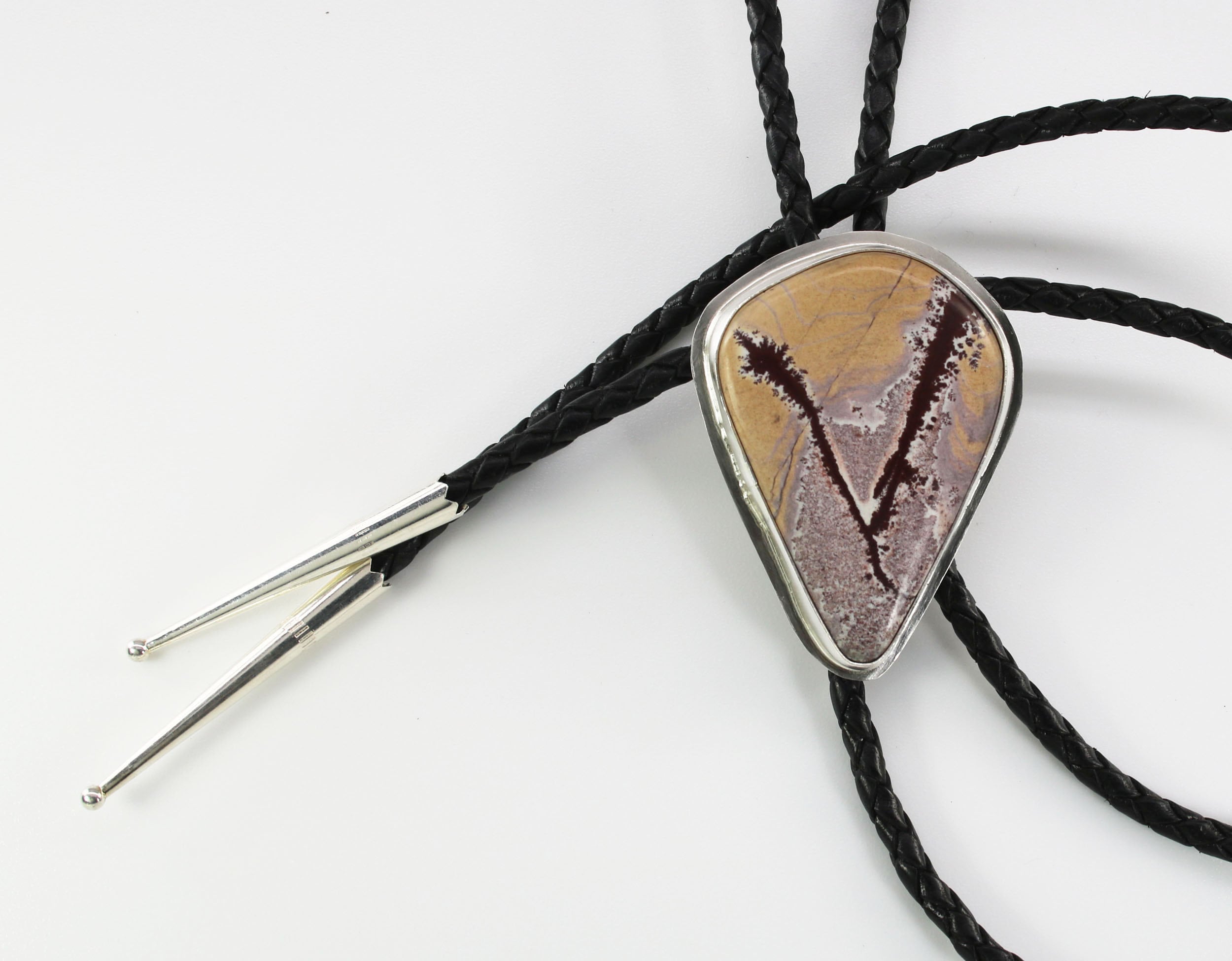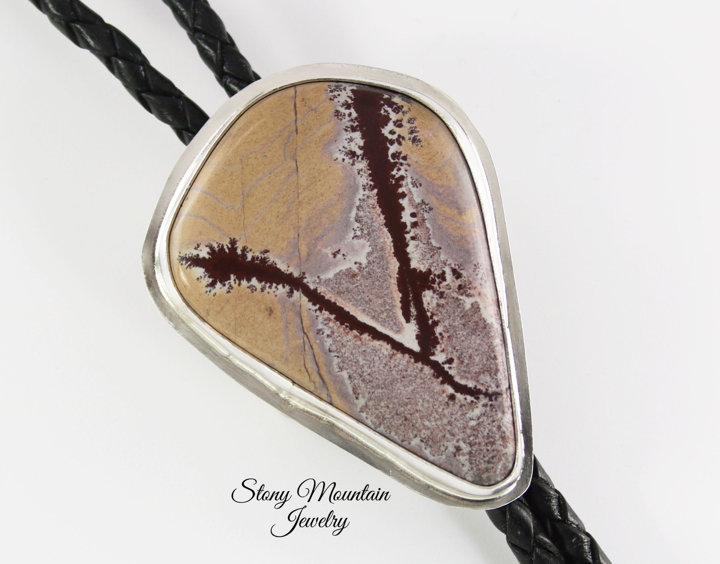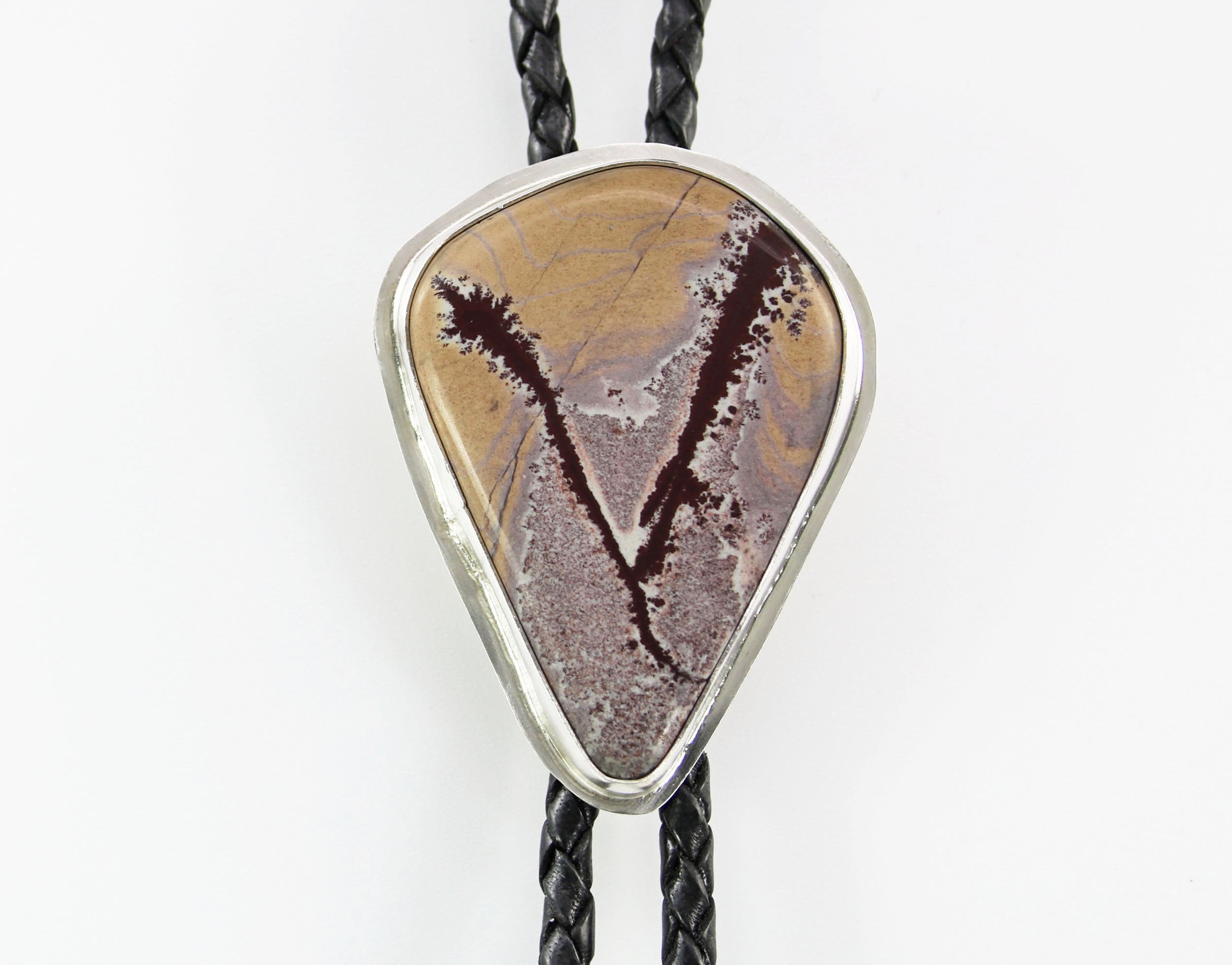 Contemporary Bolo Tie. No rules - this beautiful bolo can be worn by men or women. A wonderful alternative for formal attire or a funky bit of dress up with a tee shirt - NO rules apply for Bolo Ties! Hand cut freeform Sonoran Dendritic Rhyolite is artistically set in sterling silver. This lovely gray gemstone features rust red dendrites. The handcrafted slide uses friction rather than a mechanical device. This slide will keep your tie securely in place without crimping the leather cord. Lapidary work, design and fabrication all done by Ran.