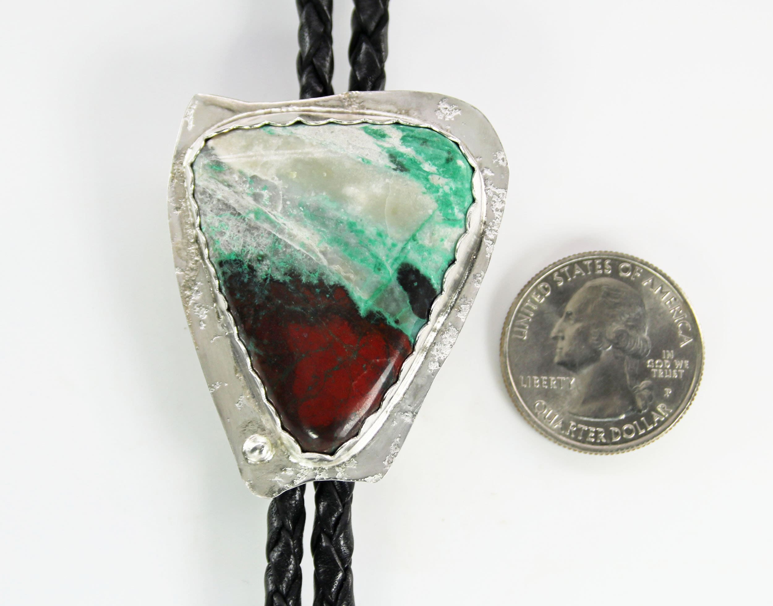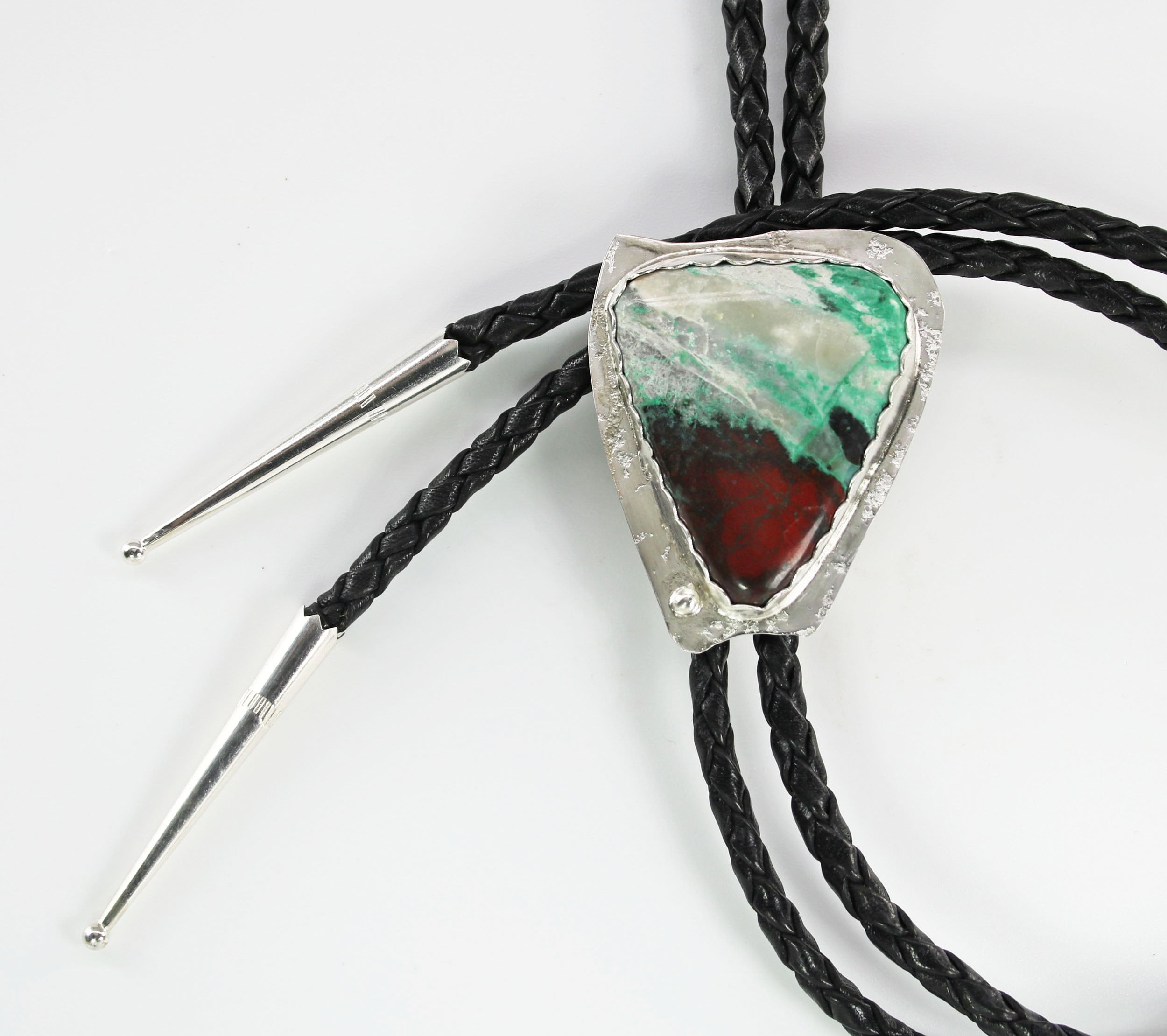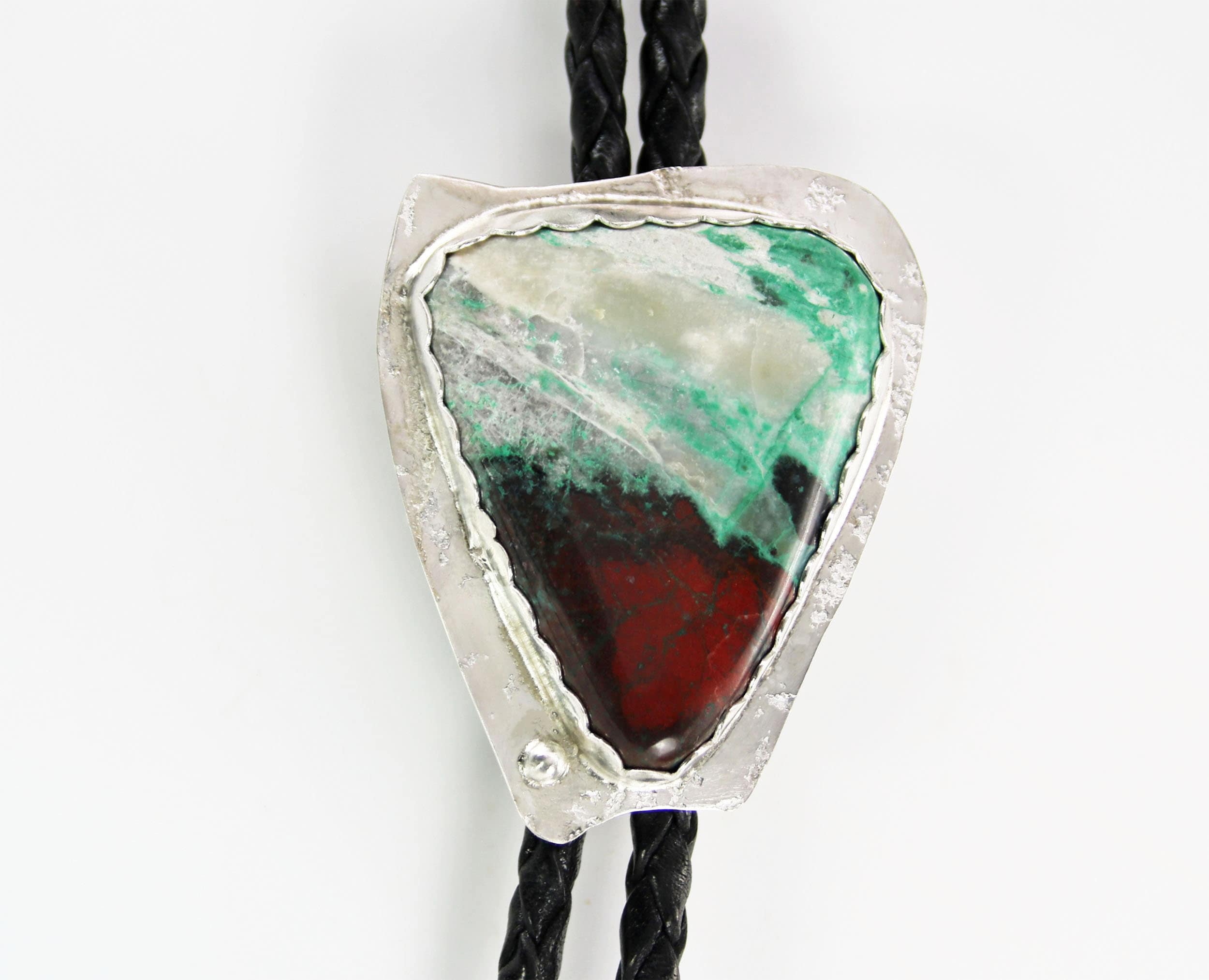 Contemporary Bolo Tie. No rules - this beautiful bolo can be worn by men or women. A wonderful alternative for formal attire or a funky bit of dress up with a tee shirt - NO rules apply for Bolo Ties! Hand cut freeform Sonoran Sunset is artistically set in sterling silver. The handcrafted slide uses friction rather than a mechanical device. This slide will keep your tie securely in place without crimping the leather cord. Lapidary work, design and fabrication all done by Ran.