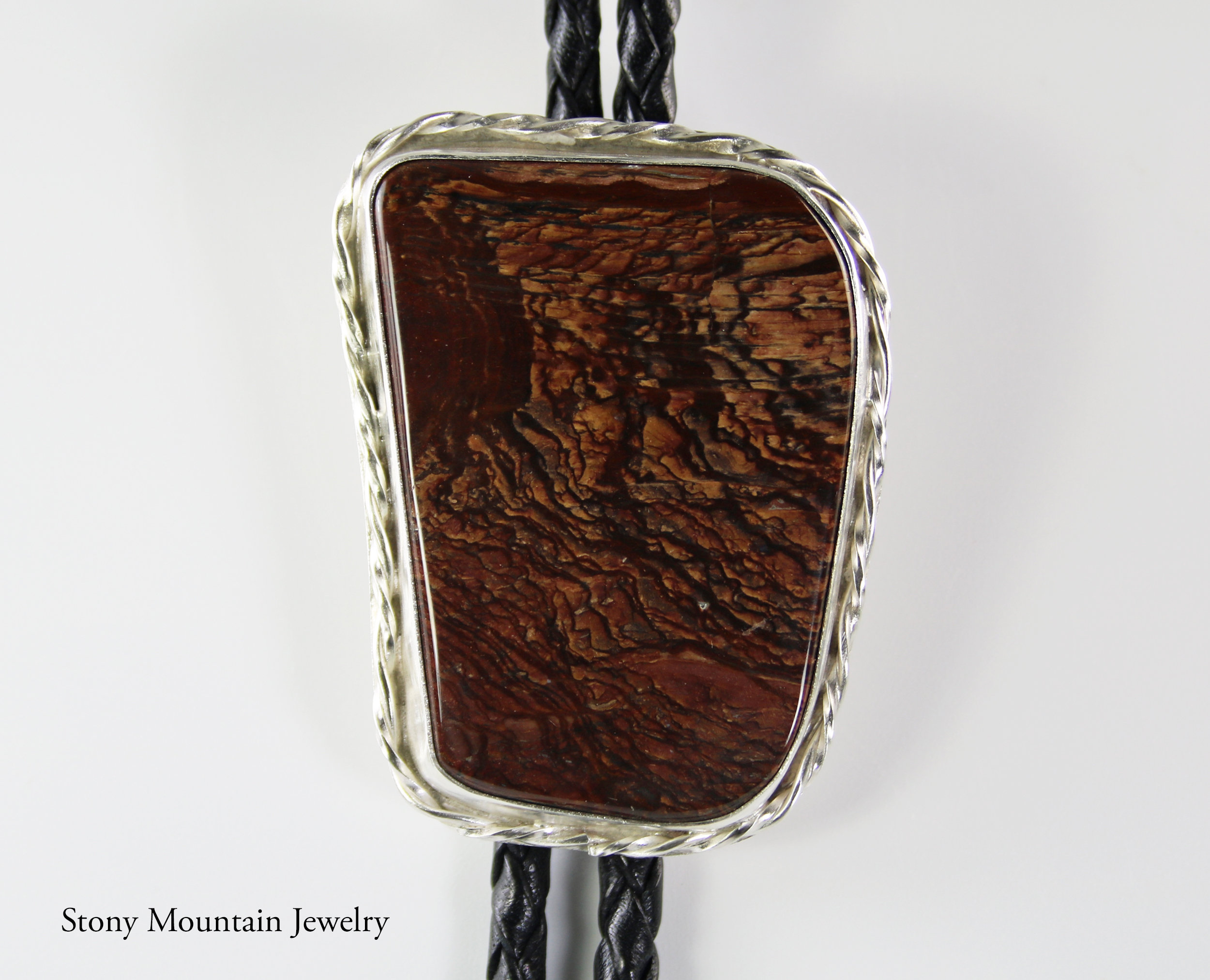 Contemporary Bolo Tie. No rules - this beautiful bolo can be worn by men or women. A wonderful alternative for formal attire or a funky bit of dress up with a tee shirt - NO rules apply for Bolo Ties! Stunning hand cut freeform Deschutes Jasper is artistically set in sterling silver. This very rare gemstone is accented with three sterling silver balls and super squiggle. The handcrafted slide uses friction rather than a mechanical device. This slide will keep your tie securely in place without crimping the leather cord. Lapidary work, design and fabrication all done by Ran.