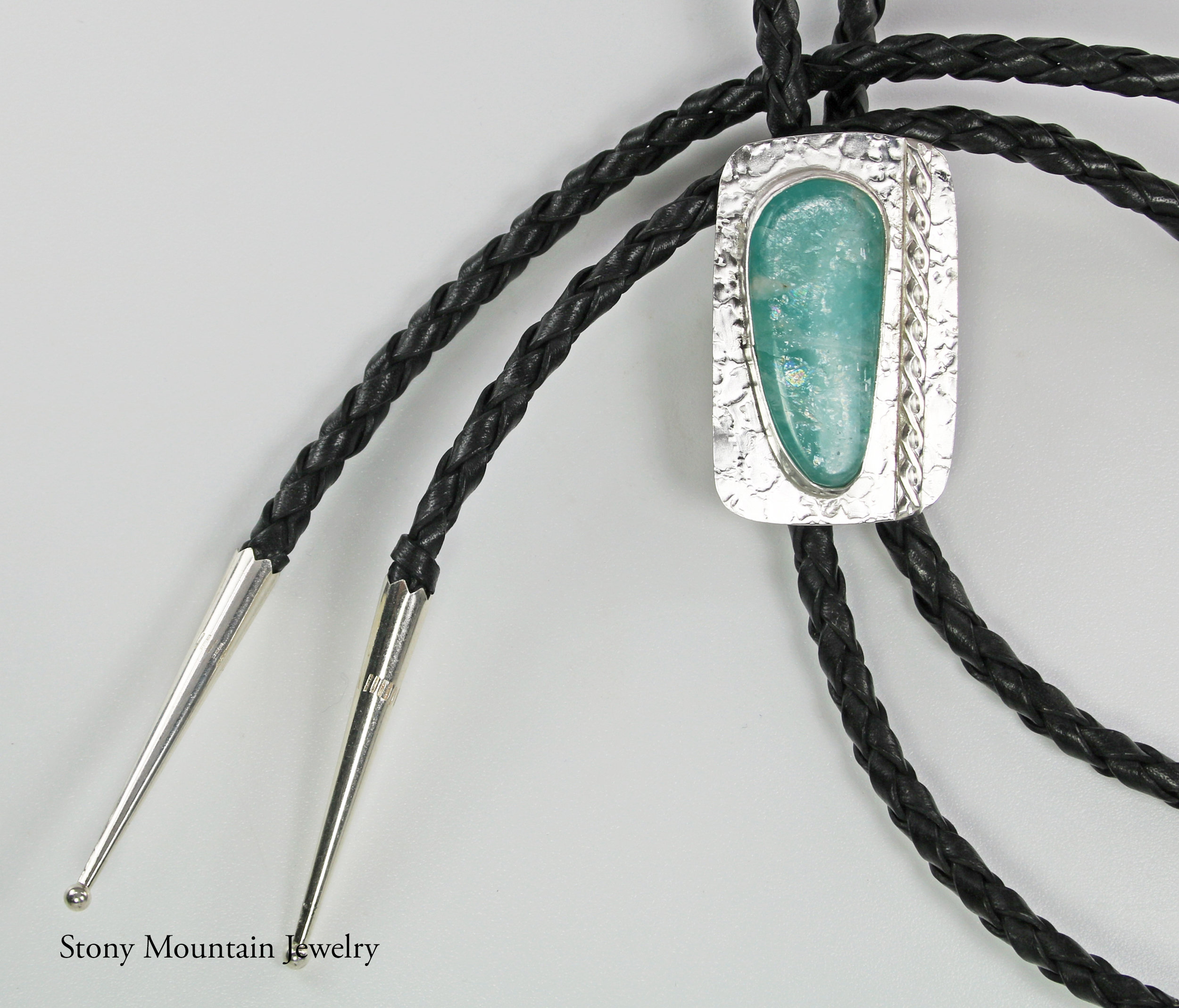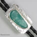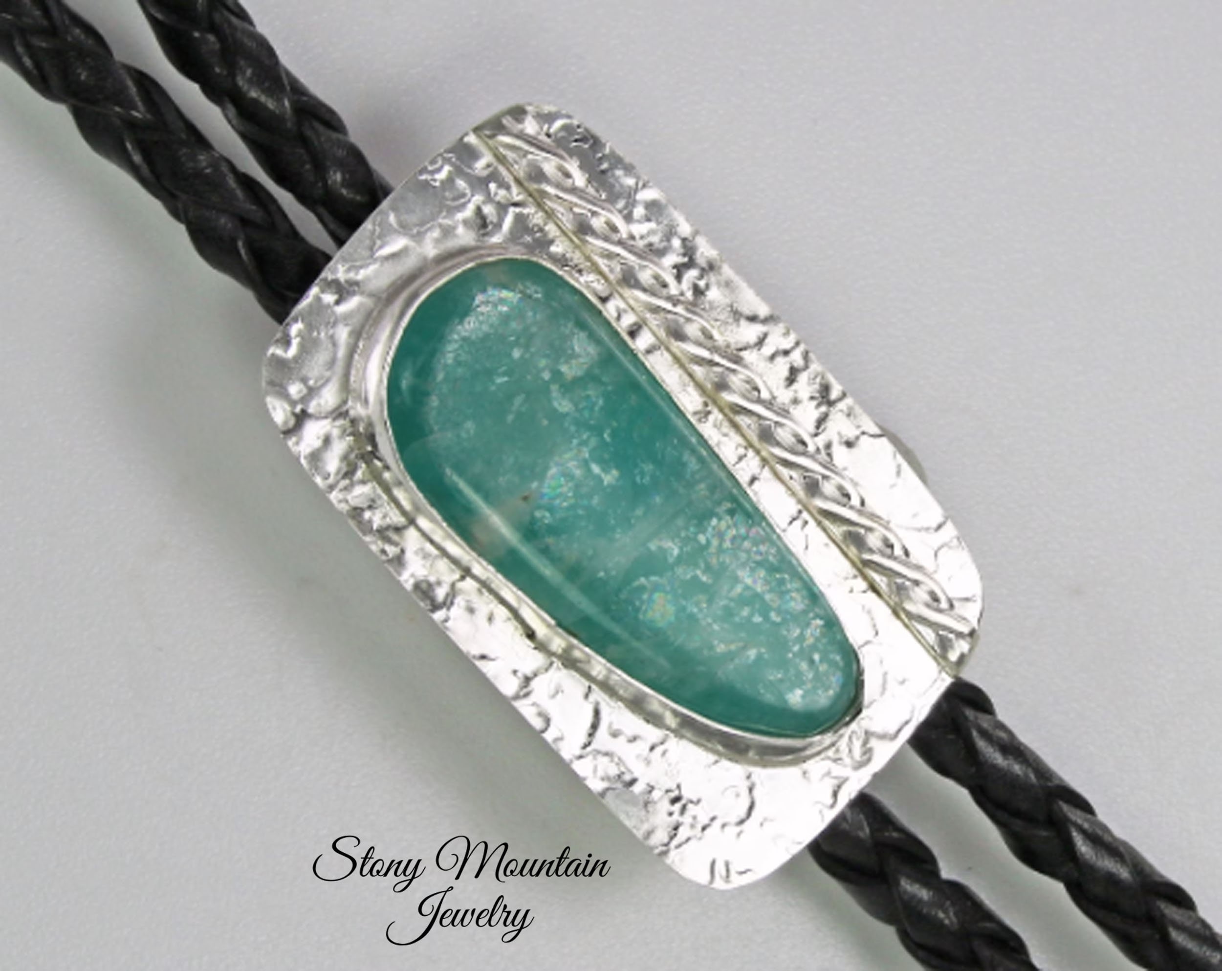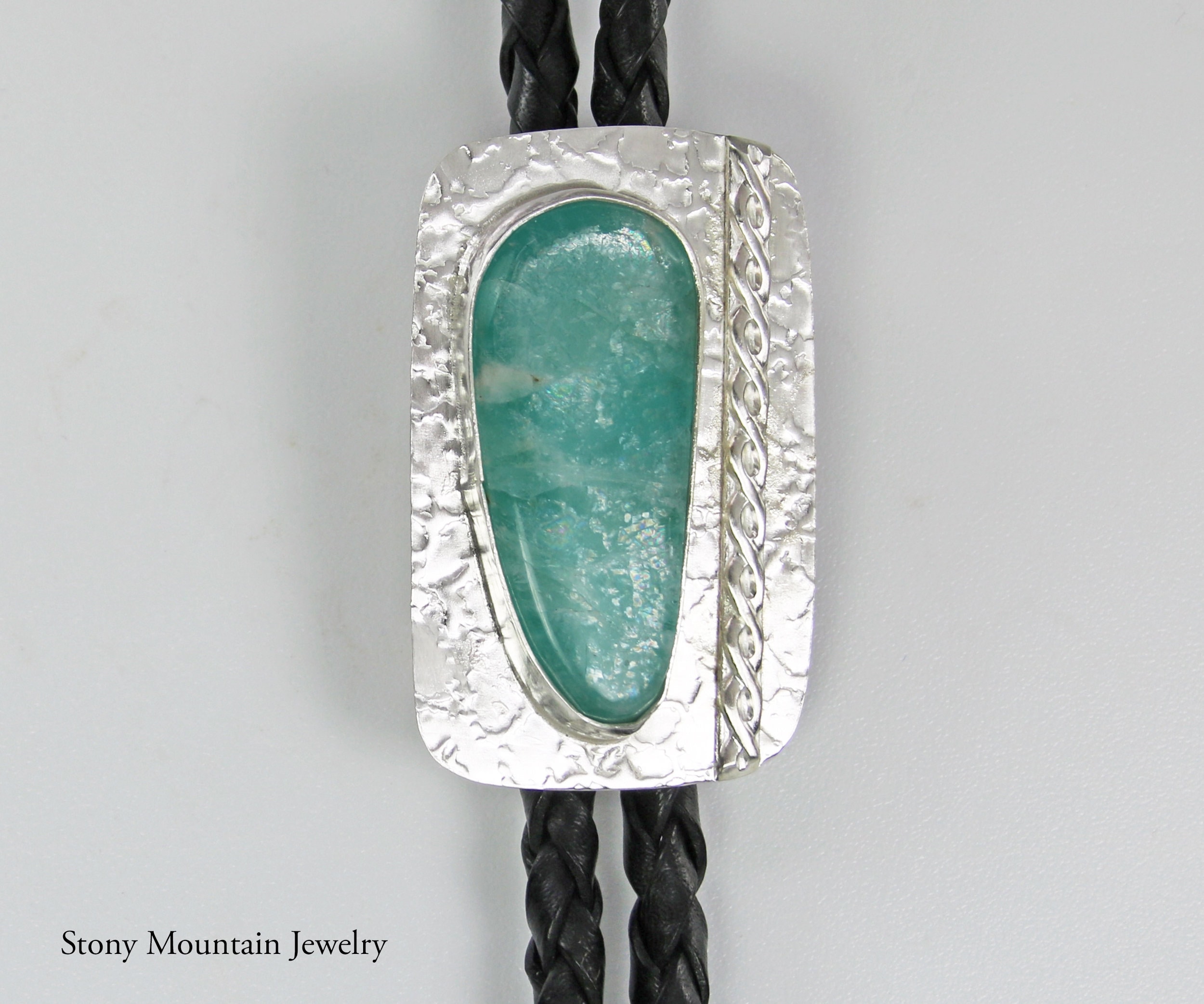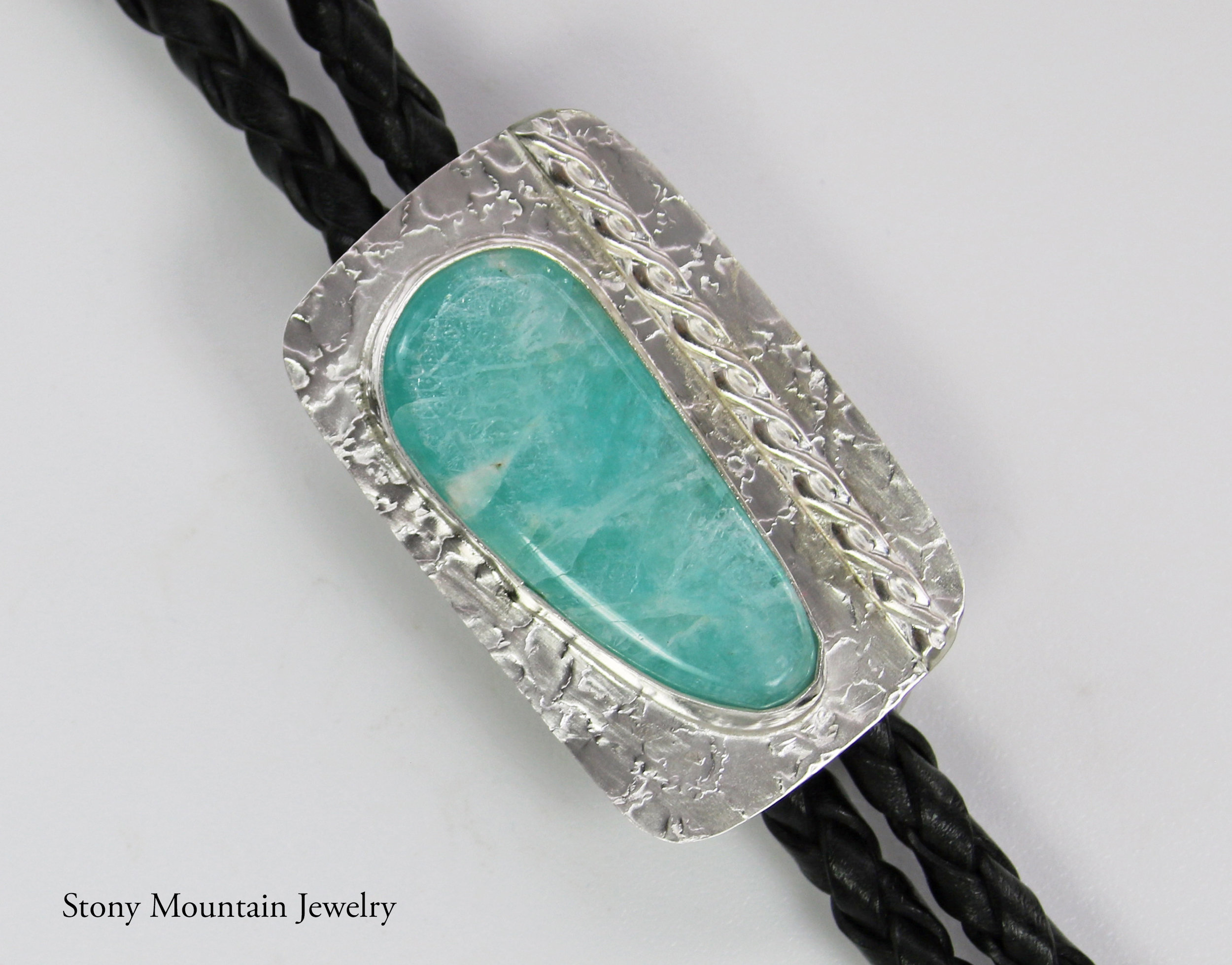 Contemporary Bolo Tie. No rules - this beautiful bolo can be worn by men or women. A wonderful alternative for formal attire or a funky bit of dress up with a tee shirt - NO rules apply for Bolo Ties! Hand cut freeform Amazonite is artistically set in sterling silver. This stunning stone is a fine example of Amazonite with a shiller effect, similar to Labradorite or Moonstone. The handcrafted slide uses friction rather than a mechanical device. This slide will keep your tie securely in place without crimping the leather cord. Lapidary work, design and fabrication all done by Ran.