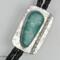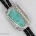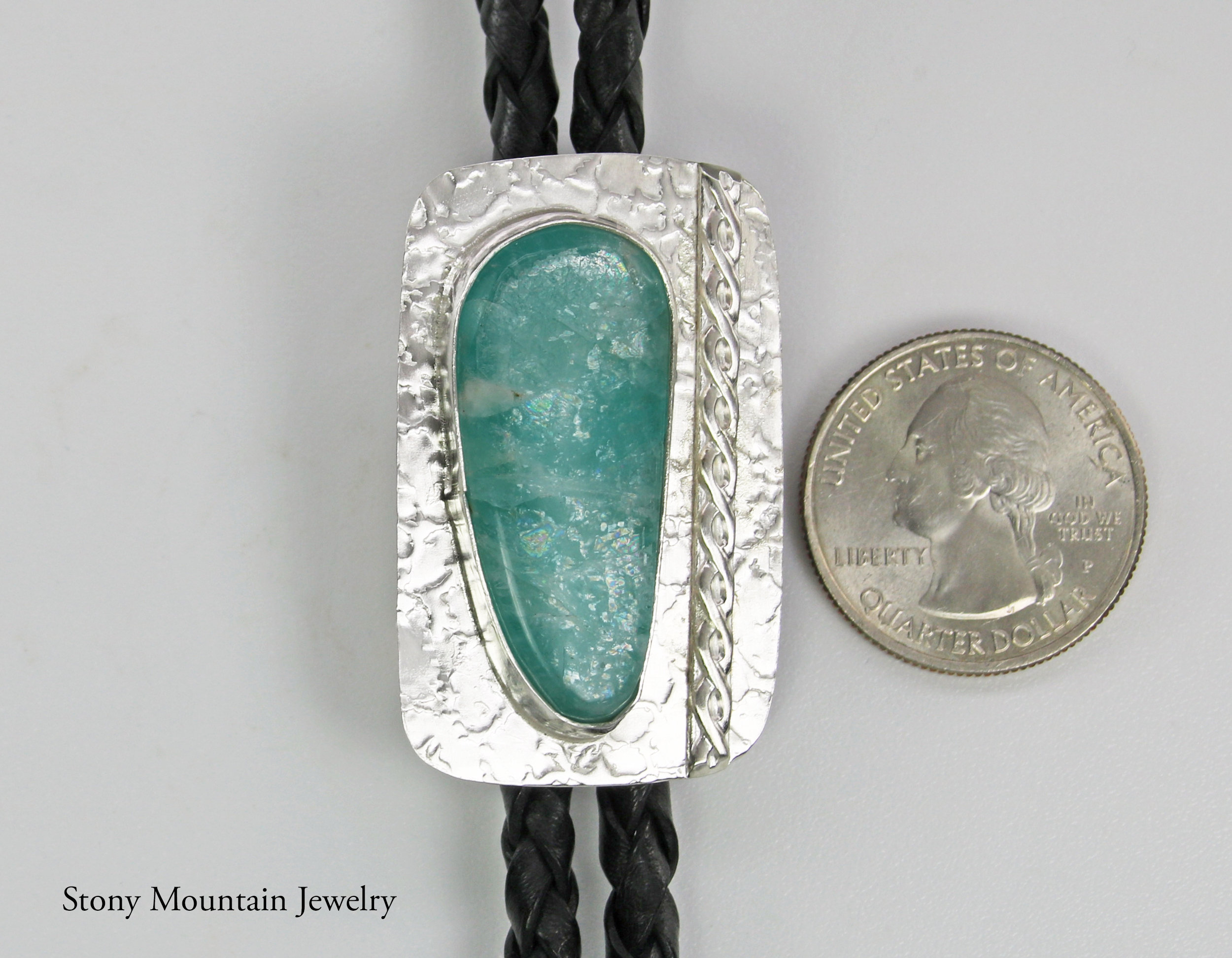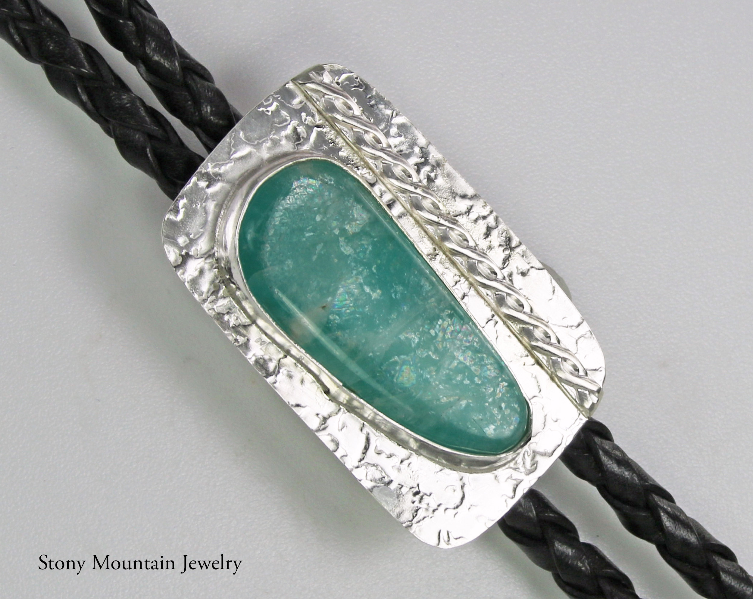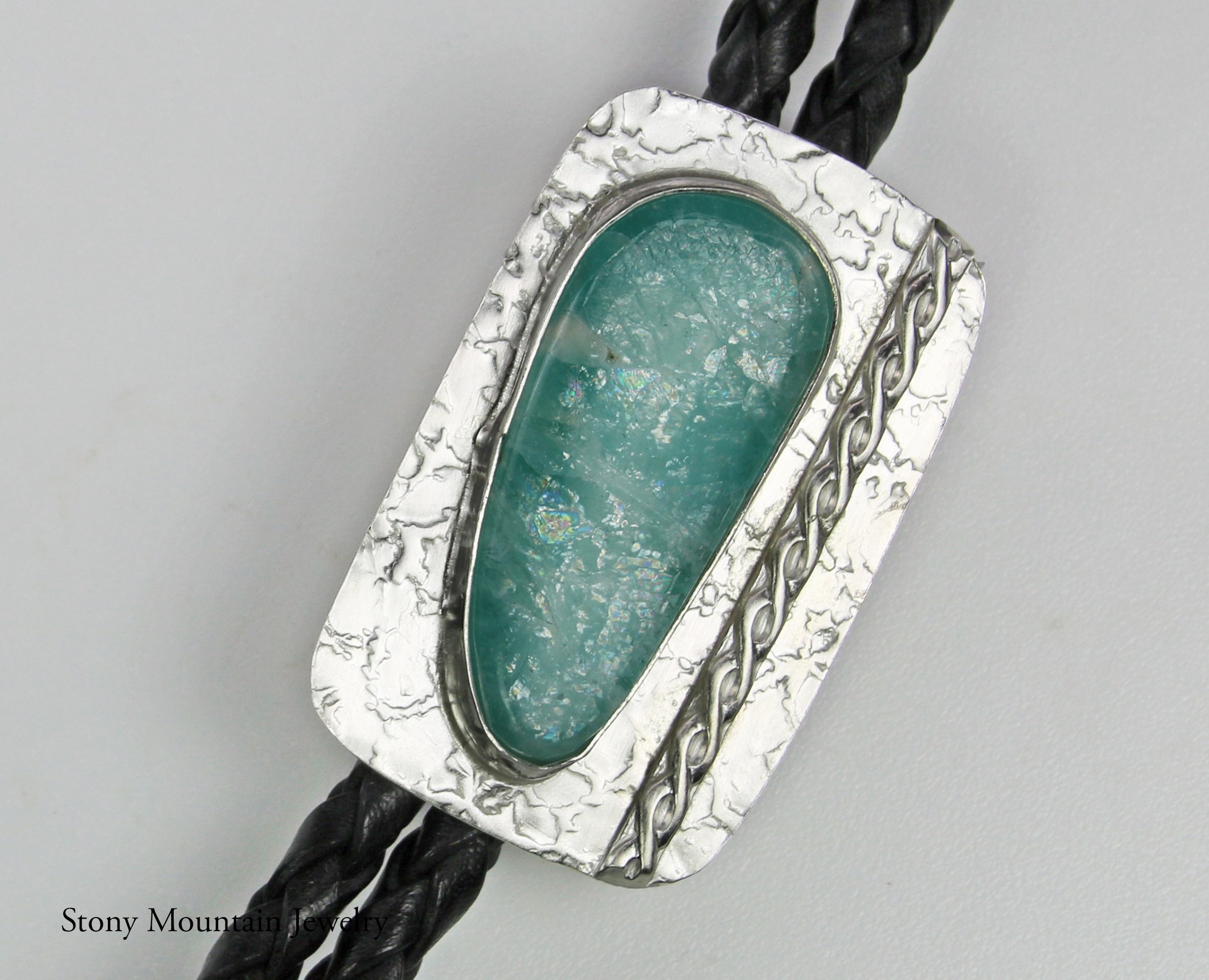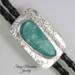 Contemporary Bolo Tie. No rules - this beautiful bolo can be worn by men or women. A wonderful alternative for formal attire or a funky bit of dress up with a tee shirt - NO rules apply for Bolo Ties! Hand cut freeform Amazonite is artistically set in sterling silver. This stunning stone is a fine example of Amazonite with a shiller effect, similar to Labradorite or Moonstone. The handcrafted slide uses friction rather than a mechanical device. This slide will keep your tie securely in place without crimping the leather cord. Lapidary work, design and fabrication all done by Ran.