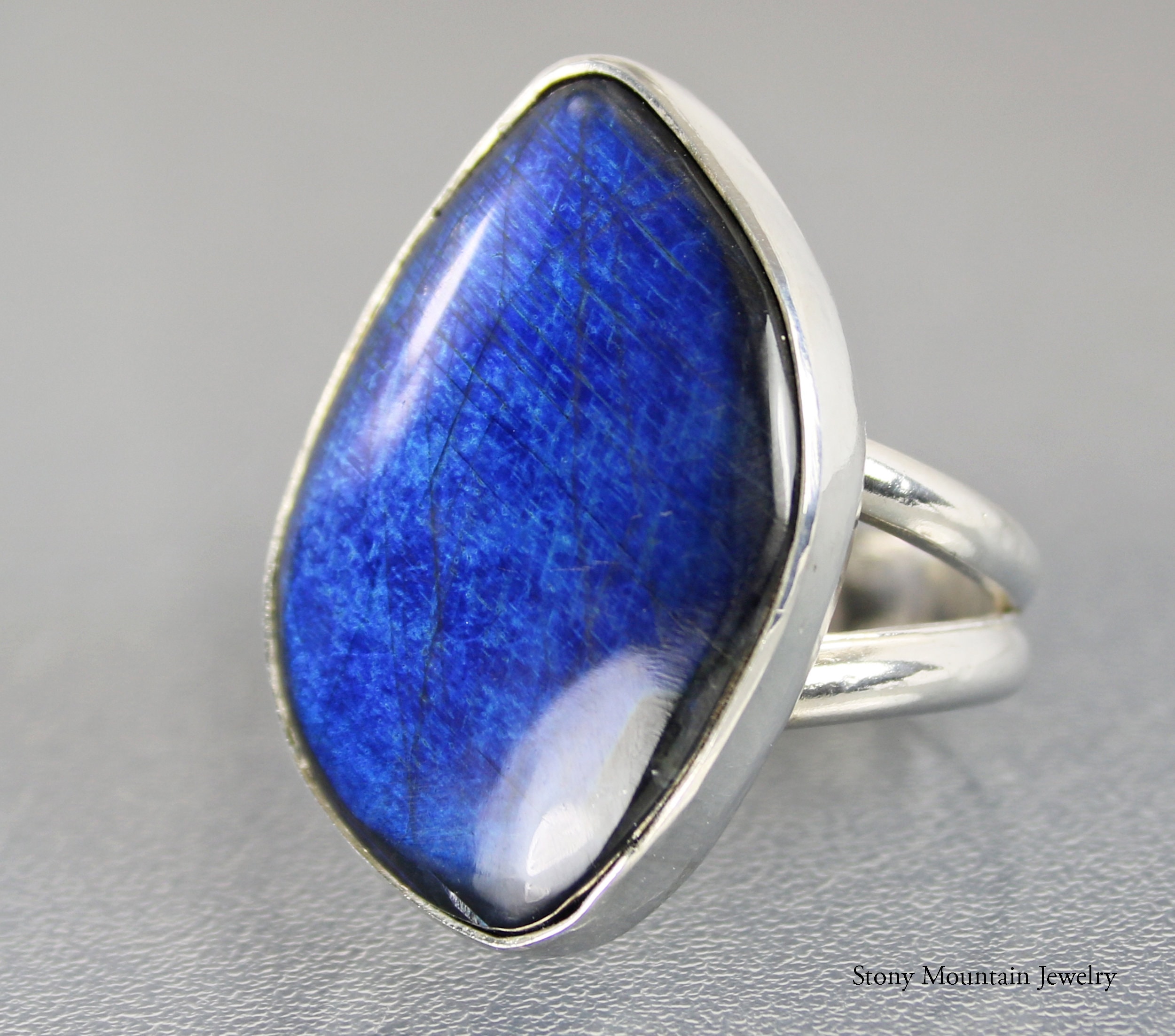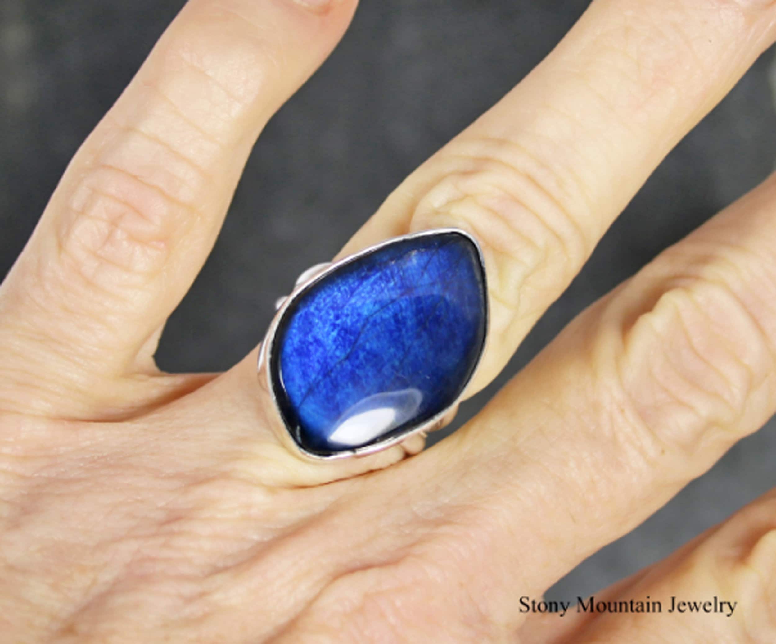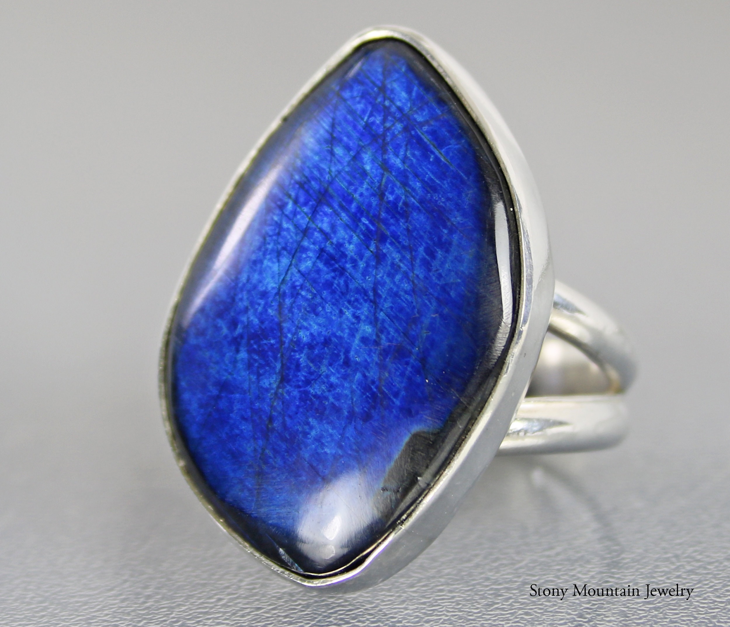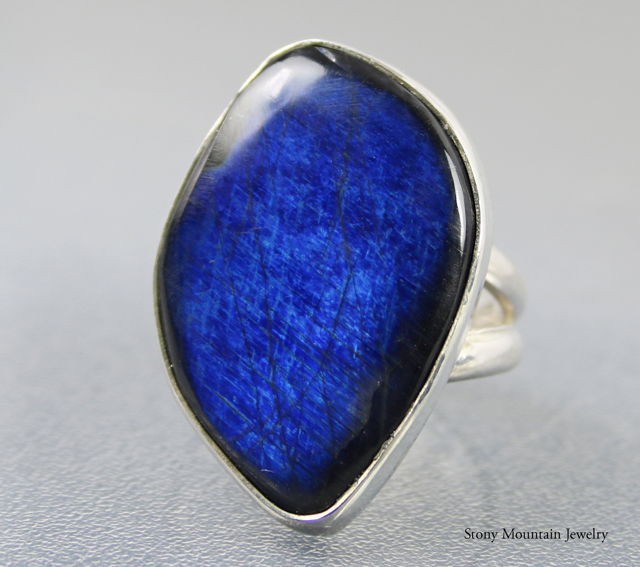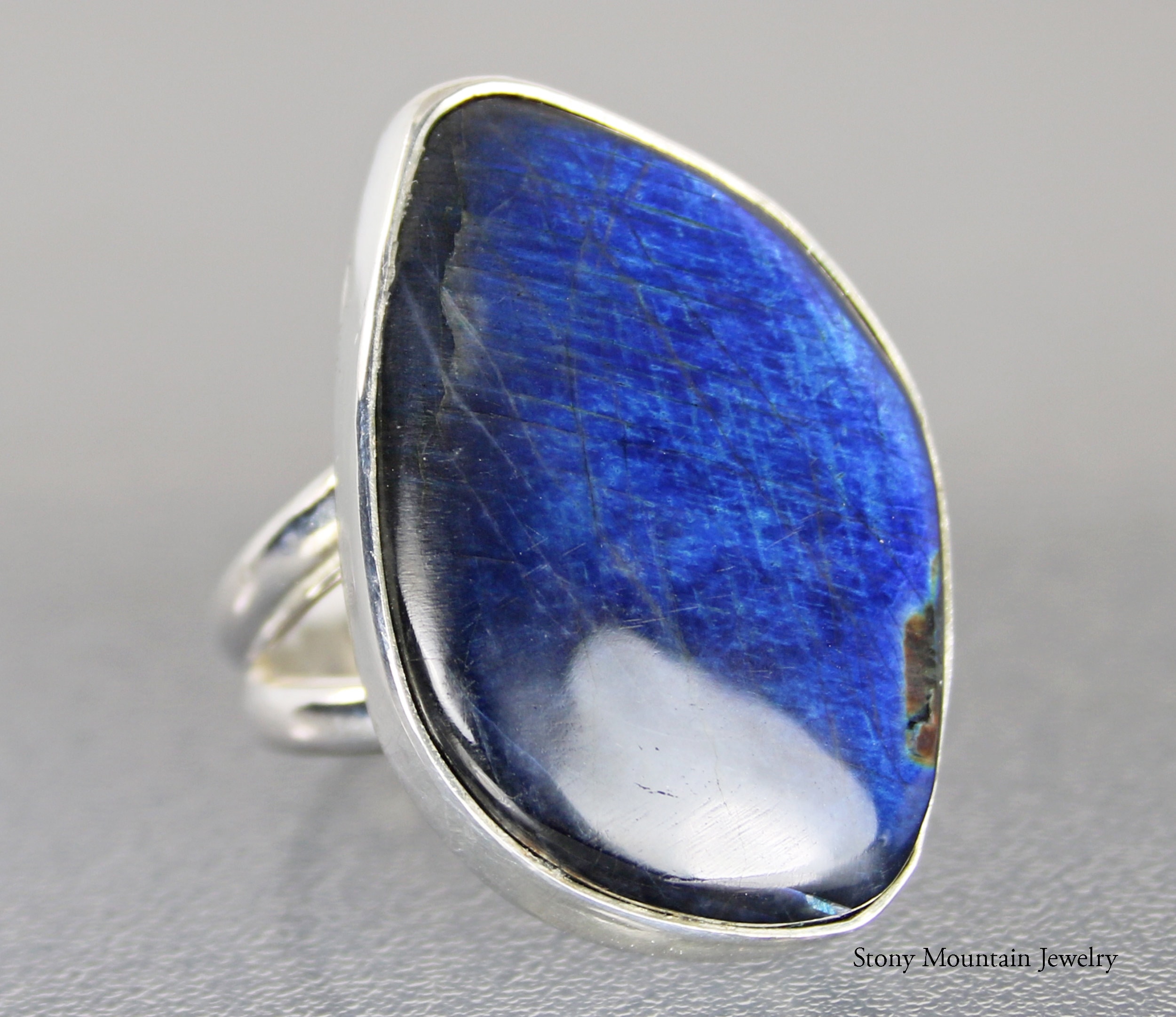 Flashy blue spectrolite cabochon is set in a sterling silver bezel with a sterling silver wide band. Dress up or dress casual - turn this ring in different directions to see the remarkable color flash. Don't be fooled; this stone will appear dark blue until it is in direct light. Gemstone............................Spectrolite Gemstone Origin.................Finland Gemstone Weight................19.85cts Ring Size..............................7.5 Wide Band Widest band measure..........28mm (face of the ring where the stone is set) Band side measure..............8mm Band back measure.............5.5mm Band thickness...................1.5mm Rings in the Cabochon Collection focus on the gemstone. Master Lapidarist Ran Armstrong has spent decades honing his crafts in lapidary arts, jewelry design and metal sculpting. Starting with large pieces of rough material (rocks), Ran cuts slabs. He then begins the process of studying each slab to find the most interesting picture, pattern or color combinations before cutting the final cabochon for a jewelry piece. Whether large or small, in a streamlined setting or something more intricate you can be sure that Ran has found the best part of the stone in this wearable art piece that is Distinctively Yours. All jewelry is gift boxed. US SHIPPING: All items under $200.00 are shipped via USPS First Class Mail, with tracking. Shipping upgrade are available at checkout. All items over $200.00 are shipped USPS First Class Mail, with Signature Confirmation to the United States. INTERNATIONAL SHIPPING: Buyer is responsible for any and all customs fees and/or VAT taxes. At this time, only items under $400.00 ship internationally. Those items ship USPS First Class Mail, with tracking. Shipping upgrades are available at checkout.