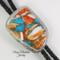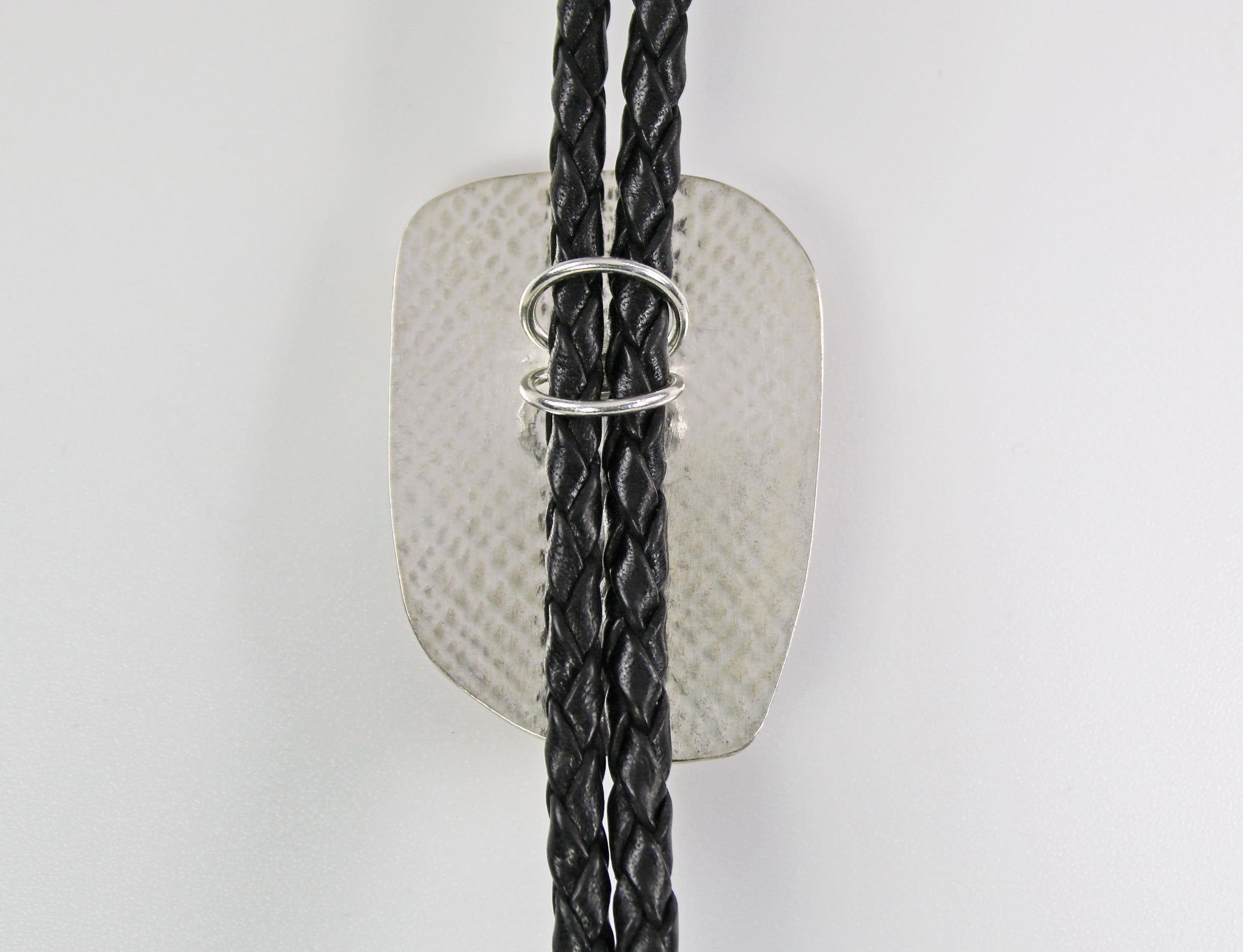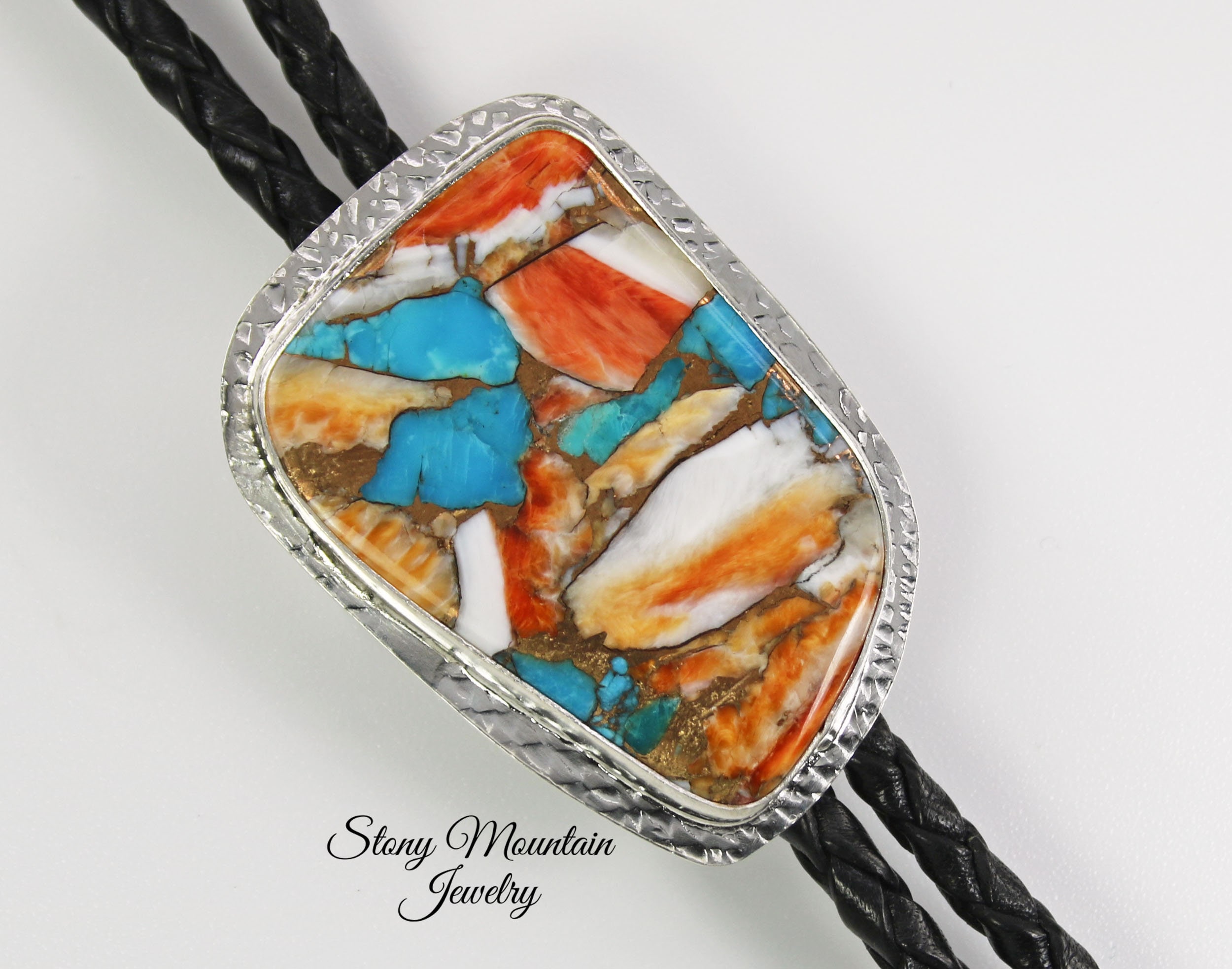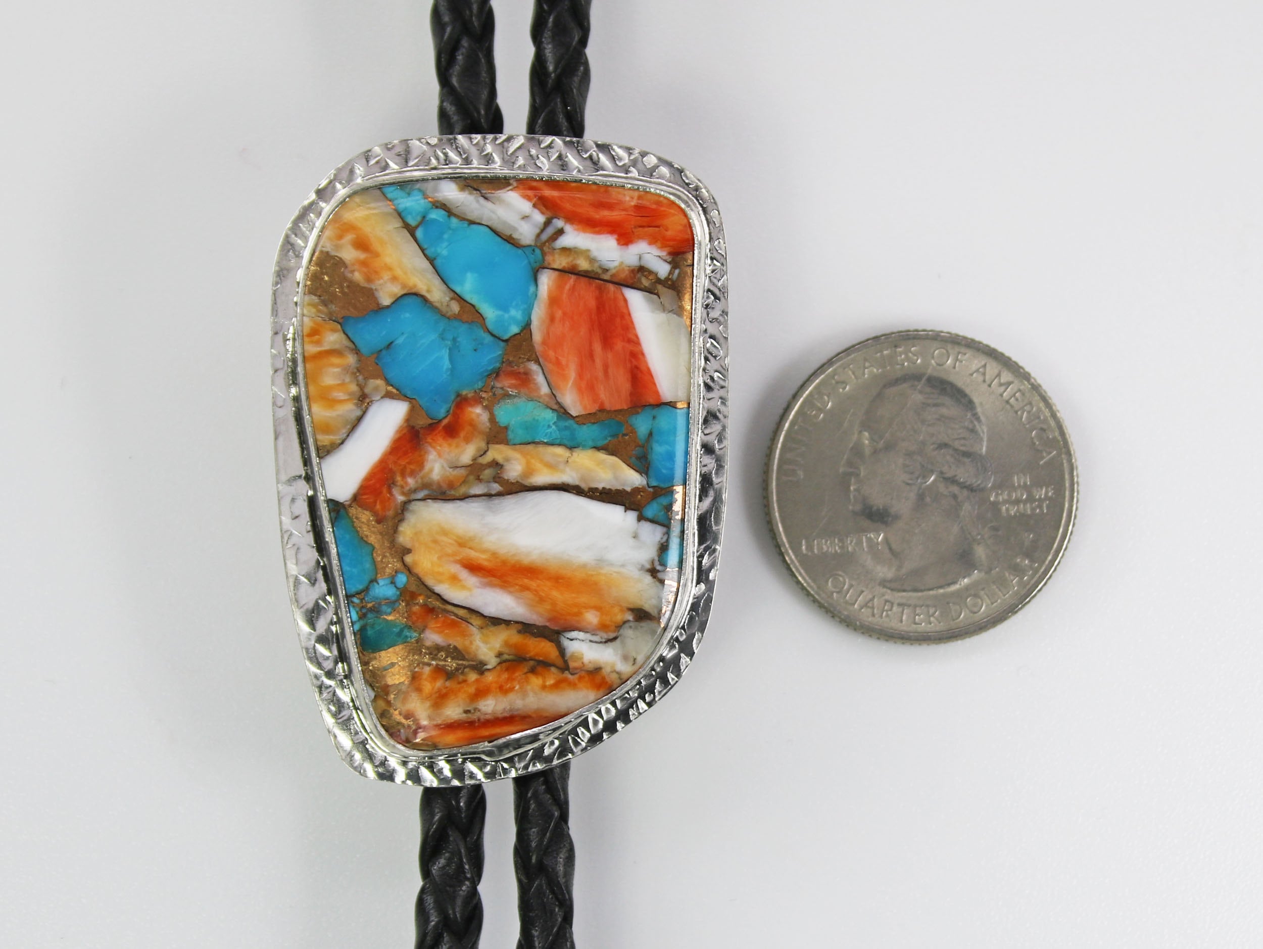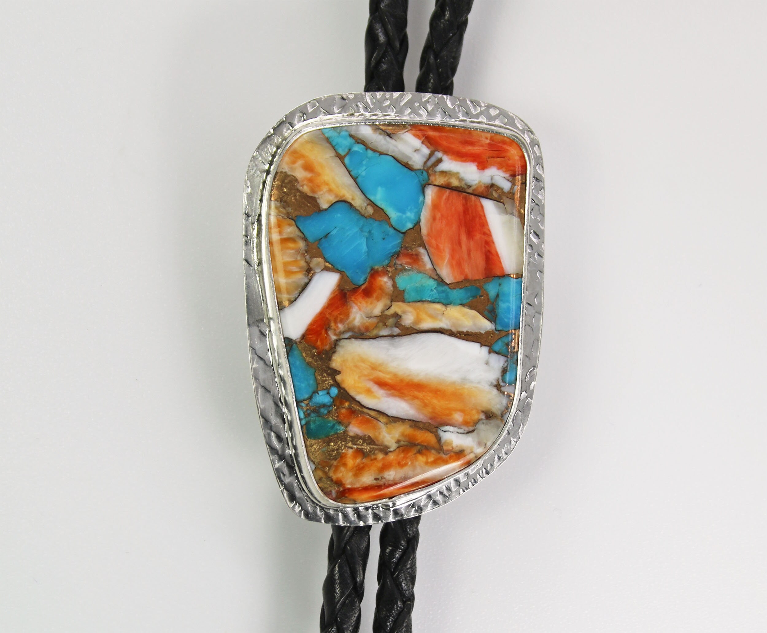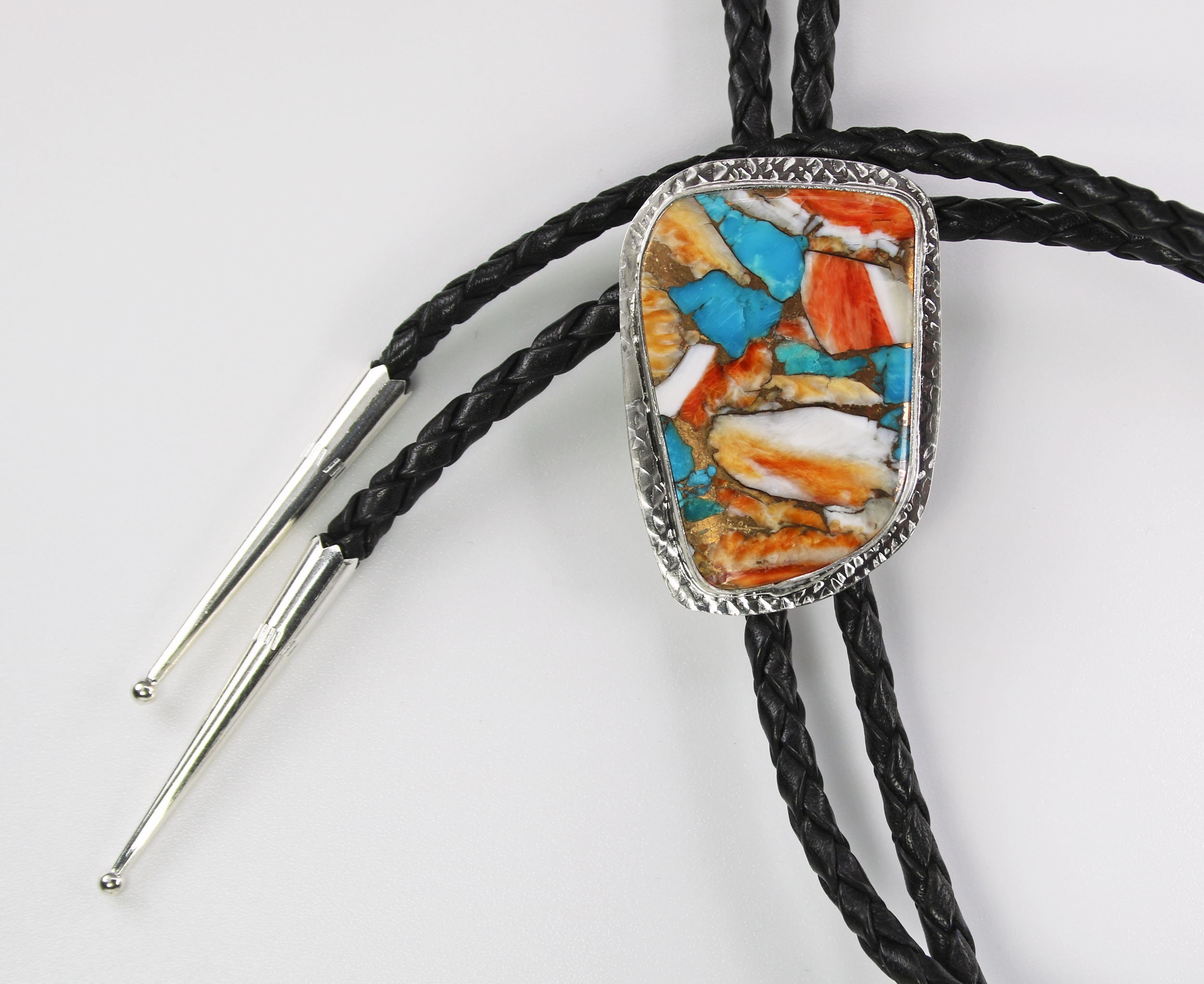 Contemporary Bolo Tie. No rules - this beautiful bolo can be worn by men or women. A wonderful alternative for formal attire or a funky bit of dress up with a tee shirt - NO rules apply for Bolo Ties! Hand cut oval Kingman Turquoise & Spiny Oyster Matrix is artistically set in sterling silver. The handcrafted slide uses friction rather than a mechanical device. This slide will keep your tie securely in place without crimping the leather cord. Lapidary work, design and fabrication all done by Ran.