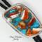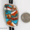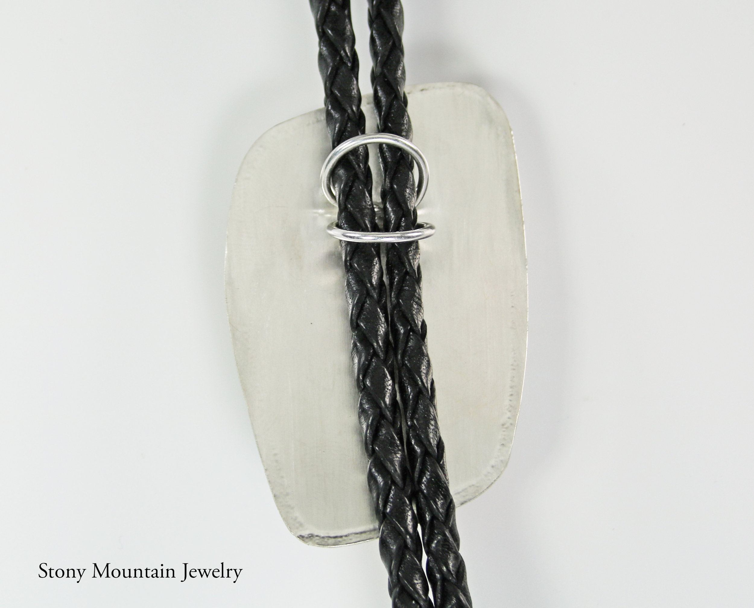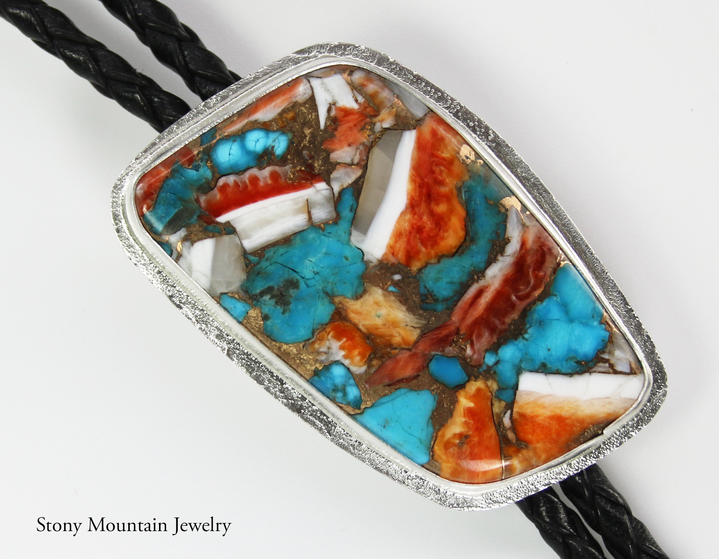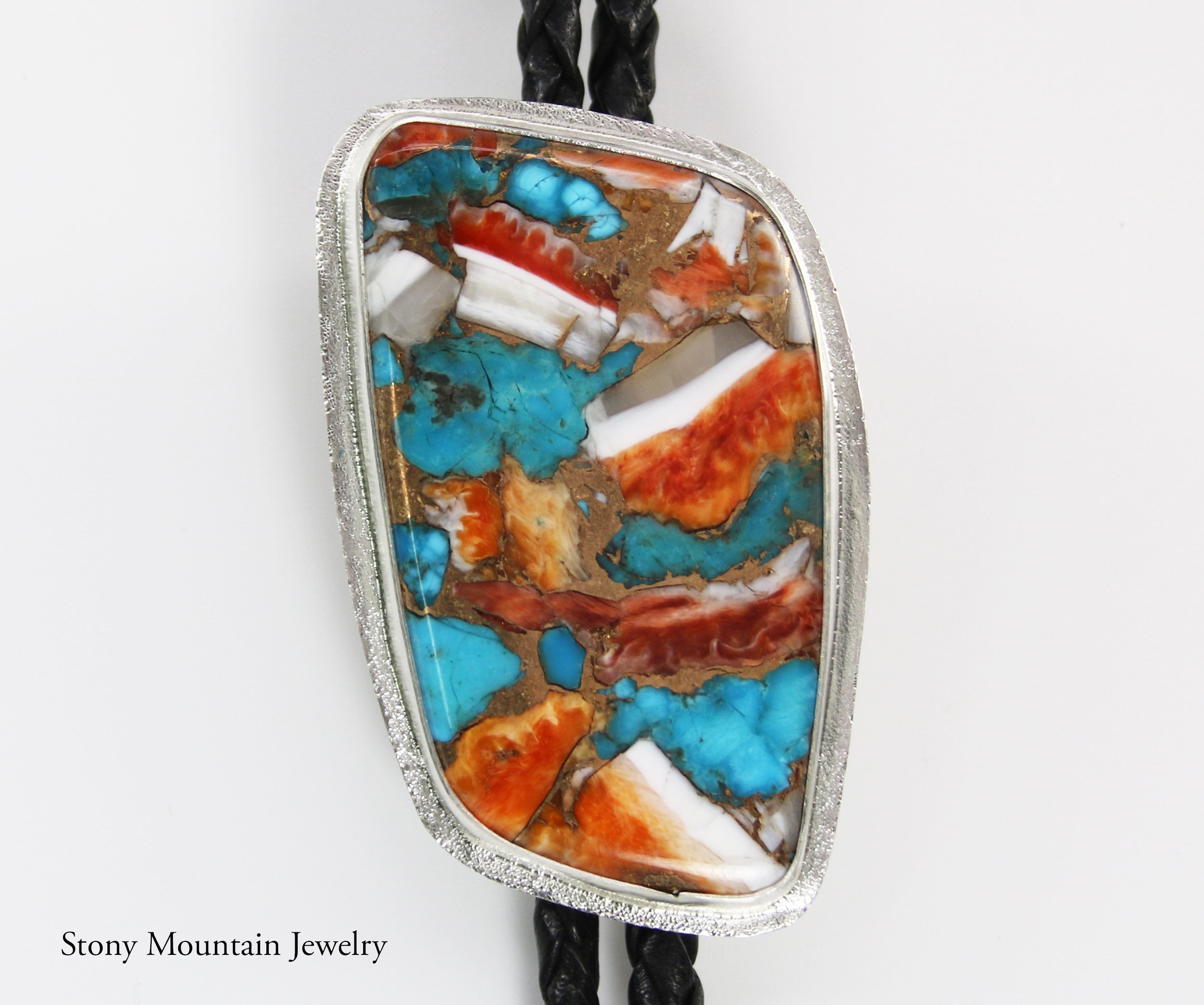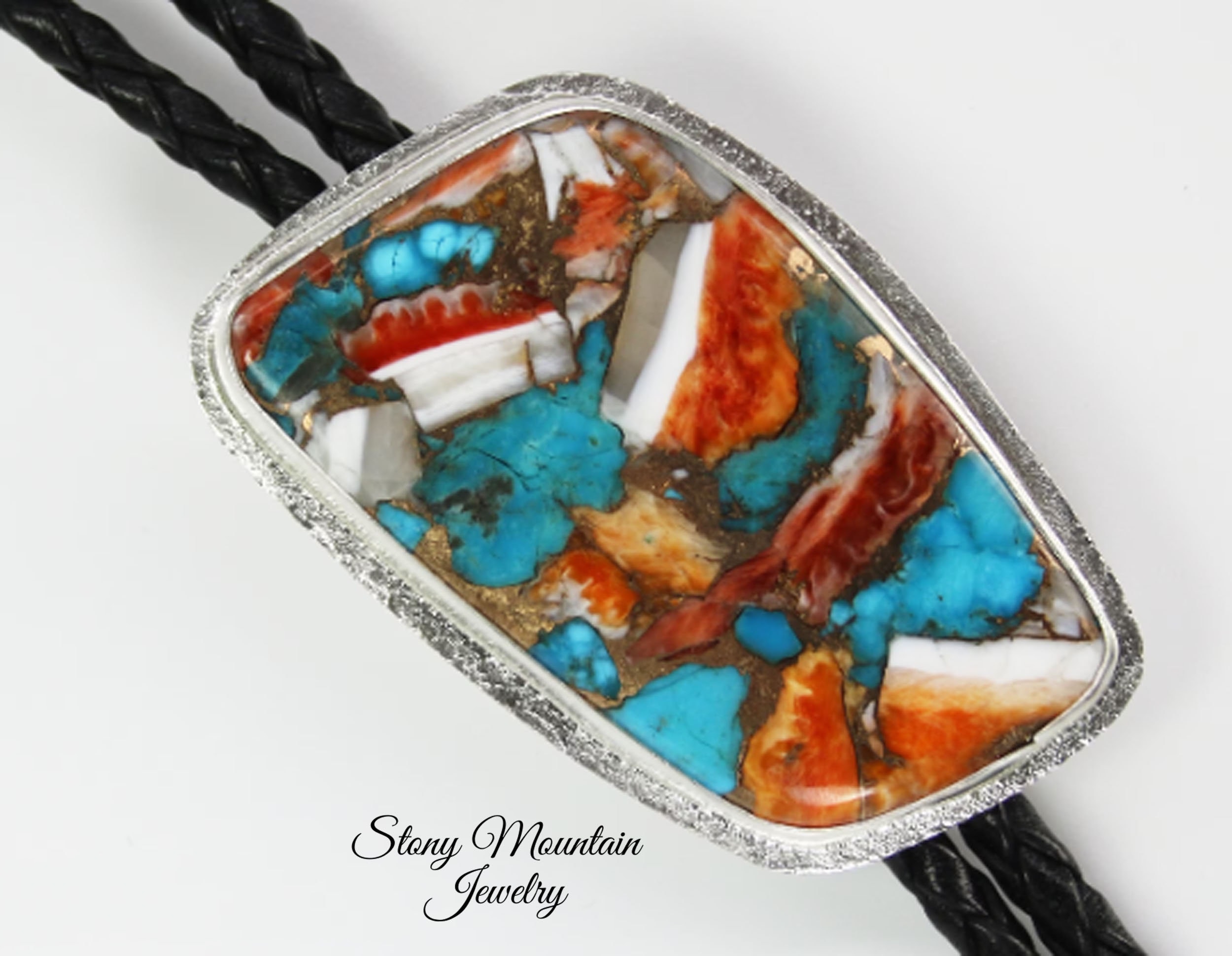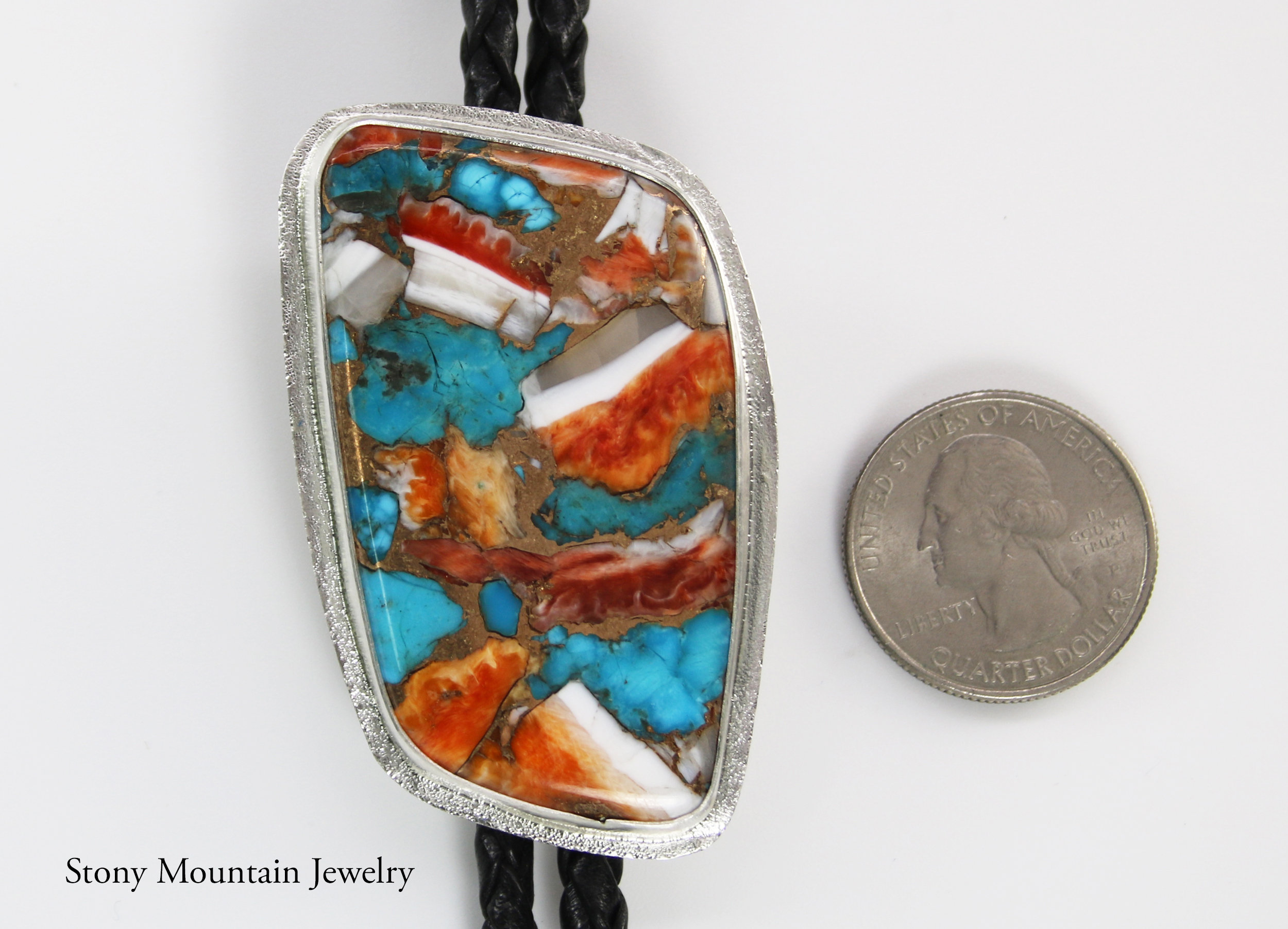 Contemporary Bolo Tie. No rules - this beautiful bolo can be worn by men or women. A wonderful alternative for formal attire or a funky bit of dress up with a tee shirt - NO rules apply for Bolo Ties! Hand cut oval Kingman Turquoise & Spiny Oyster Matrix is artistically set in sterling silver. The handcrafted slide uses friction rather than a mechanical device. This slide will keep your tie securely in place without crimping the leather cord. Lapidary work, design and fabrication all done by Ran.