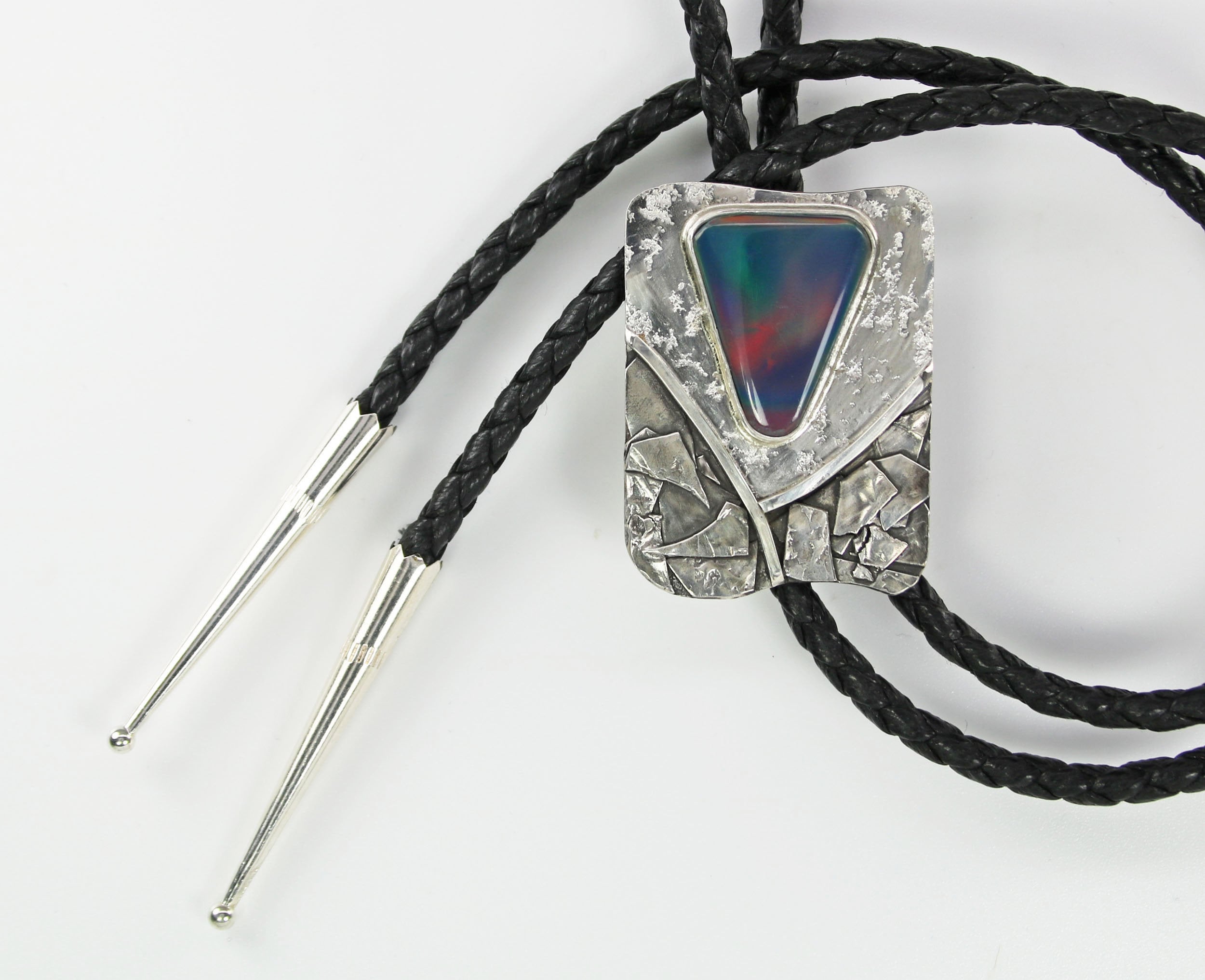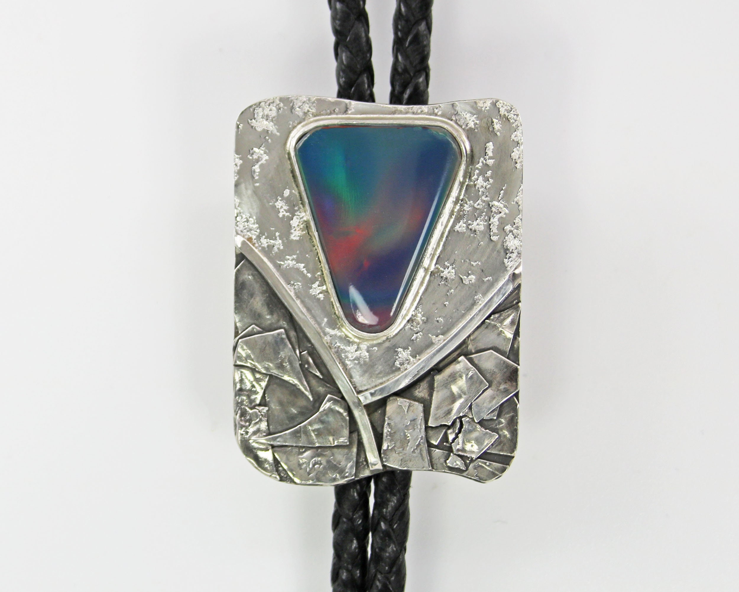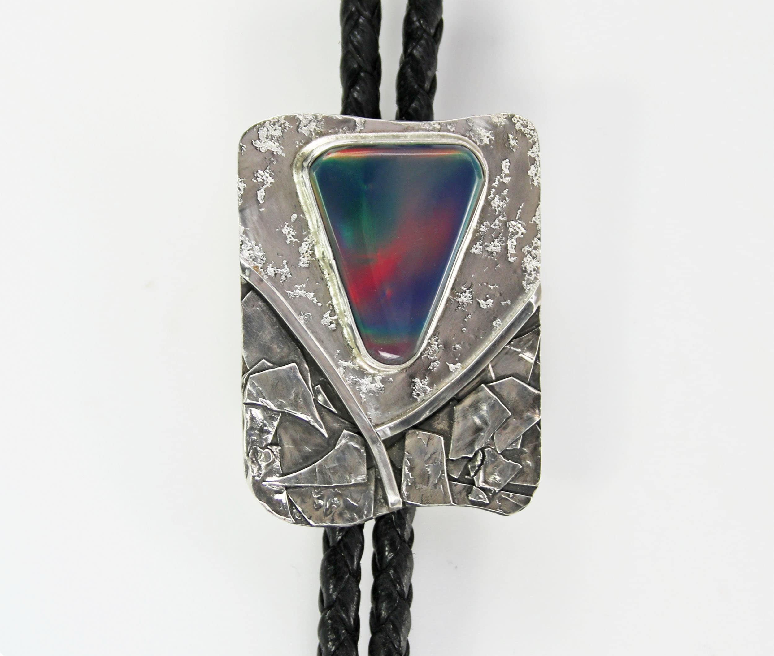 Contemporary Bolo Tie. No rules - this beautiful bolo can be worn by men or women. A wonderful alternative for formal attire or a funky bit of dress up with a tee shirt - NO rules apply for Bolo Ties! Flashy Aurora Opal cabochon is artistically set in highly sculpted and fused sterling silver. The sterling silver is lightly patinated in some area to enhance the sculptural detail of the metal. The bezel set stone sits atop textured bright sterling silver. The handcrafted slide uses friction rather than a mechanical device. This slide will keep your tie securely in place without crimping the leather cord. Lapidary work, design and fabrication all done by Ran.