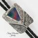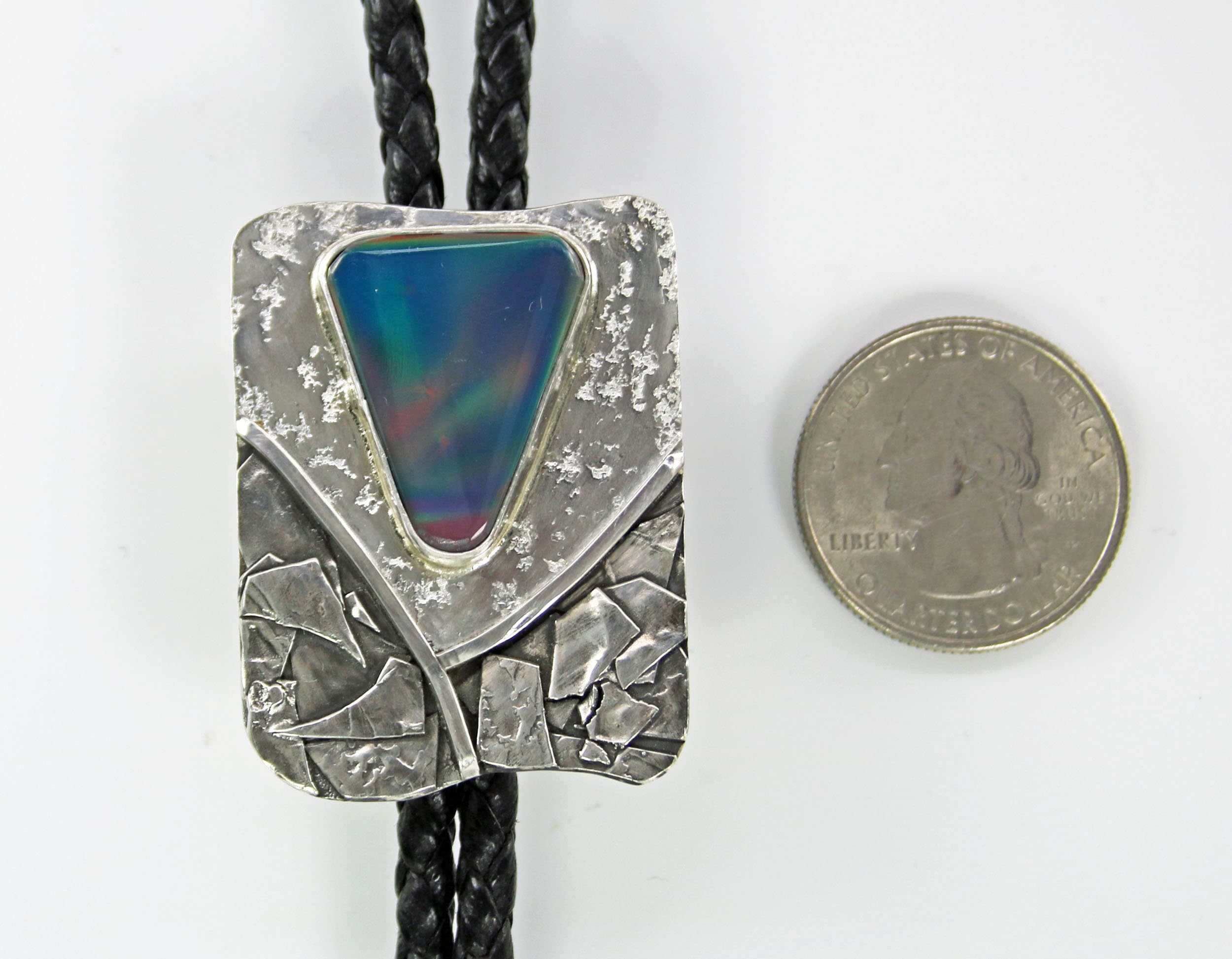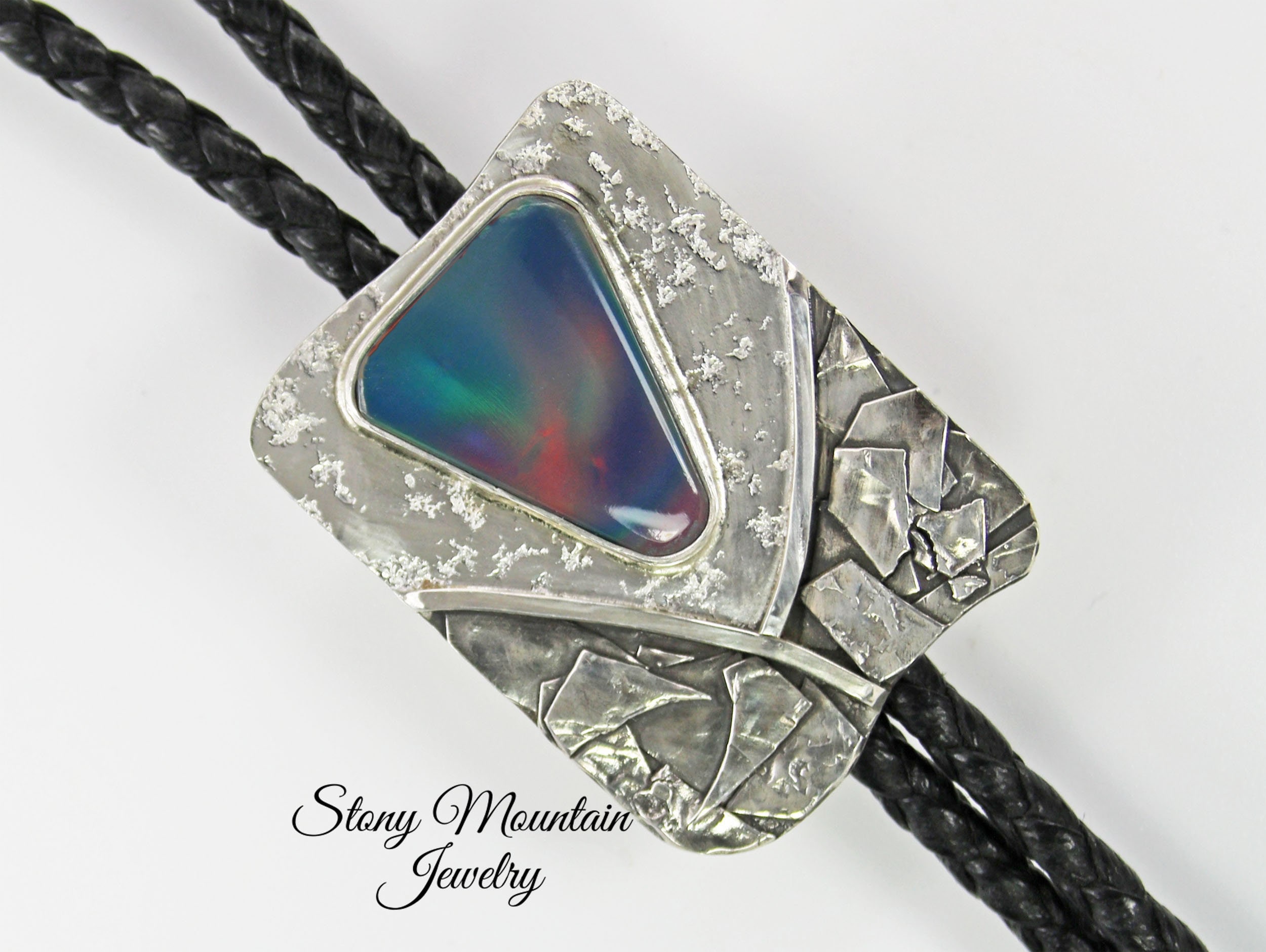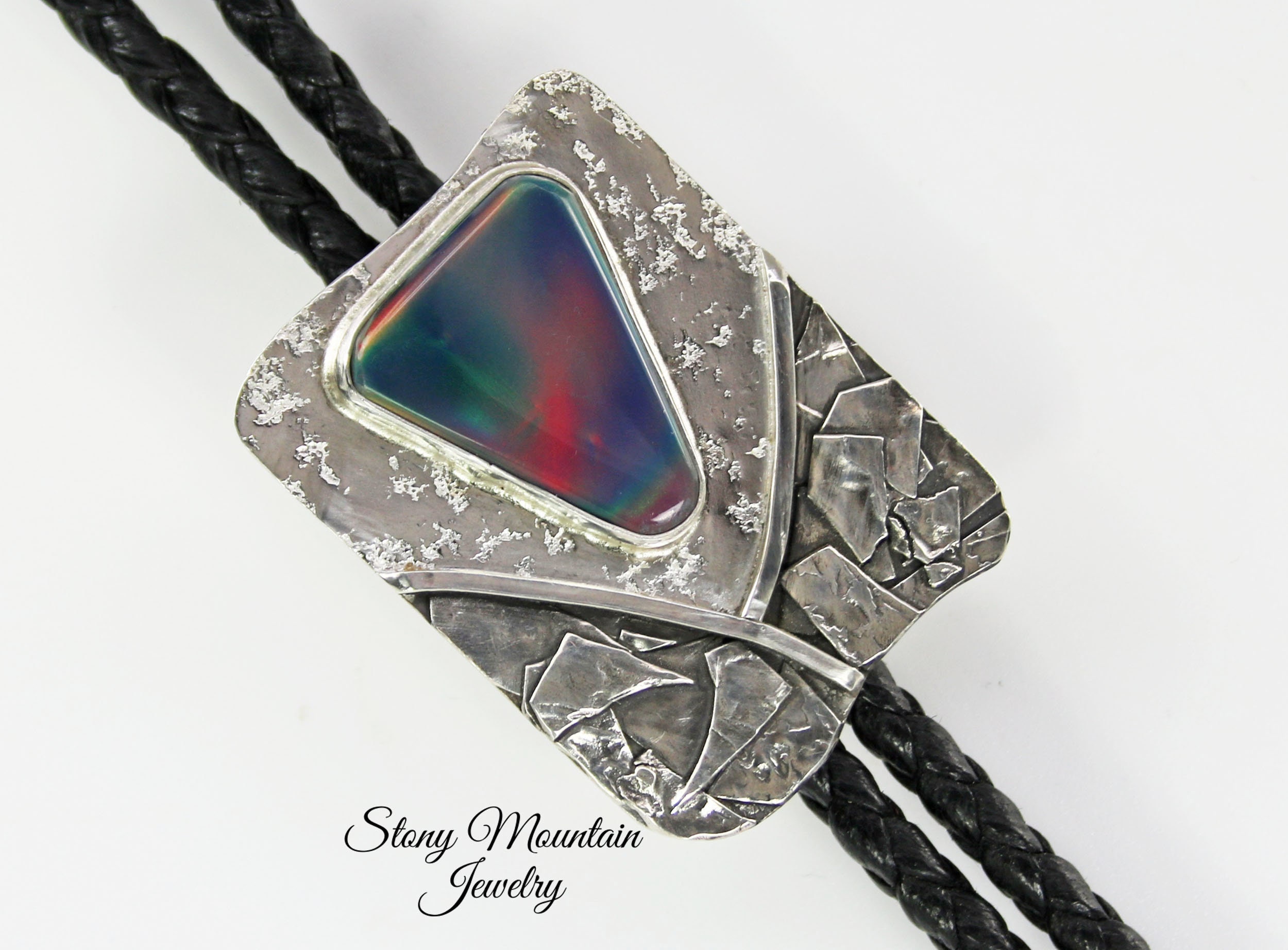 Contemporary Bolo Tie. No rules - this beautiful bolo can be worn by men or women. A wonderful alternative for formal attire or a funky bit of dress up with a tee shirt - NO rules apply for Bolo Ties! Flashy Aurora Opal cabochon is artistically set in highly sculpted and fused sterling silver. The sterling silver is lightly patinated in some area to enhance the sculptural detail of the metal. The bezel set stone sits atop textured bright sterling silver. The handcrafted slide uses friction rather than a mechanical device. This slide will keep your tie securely in place without crimping the leather cord. Lapidary work, design and fabrication all done by Ran.