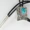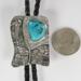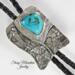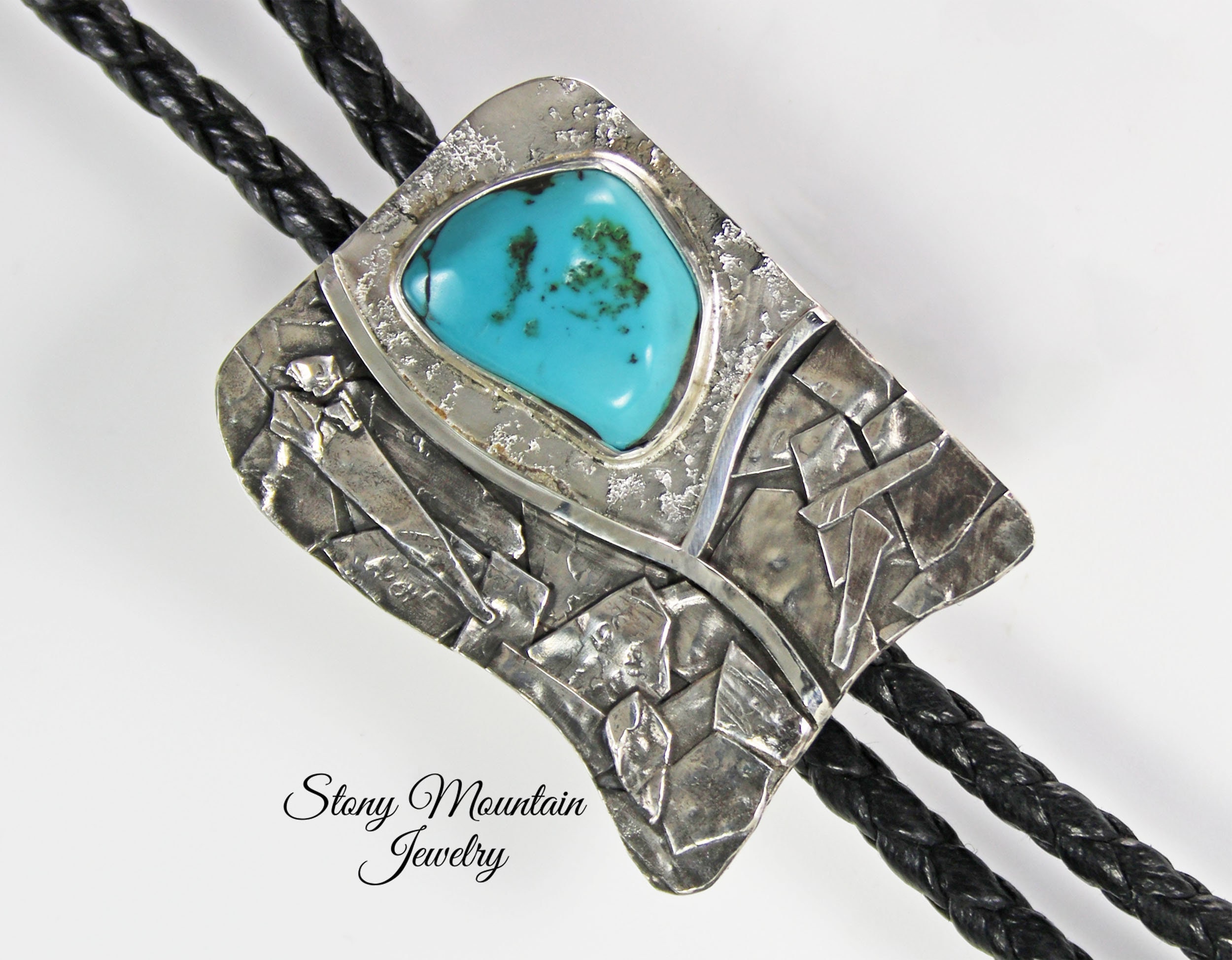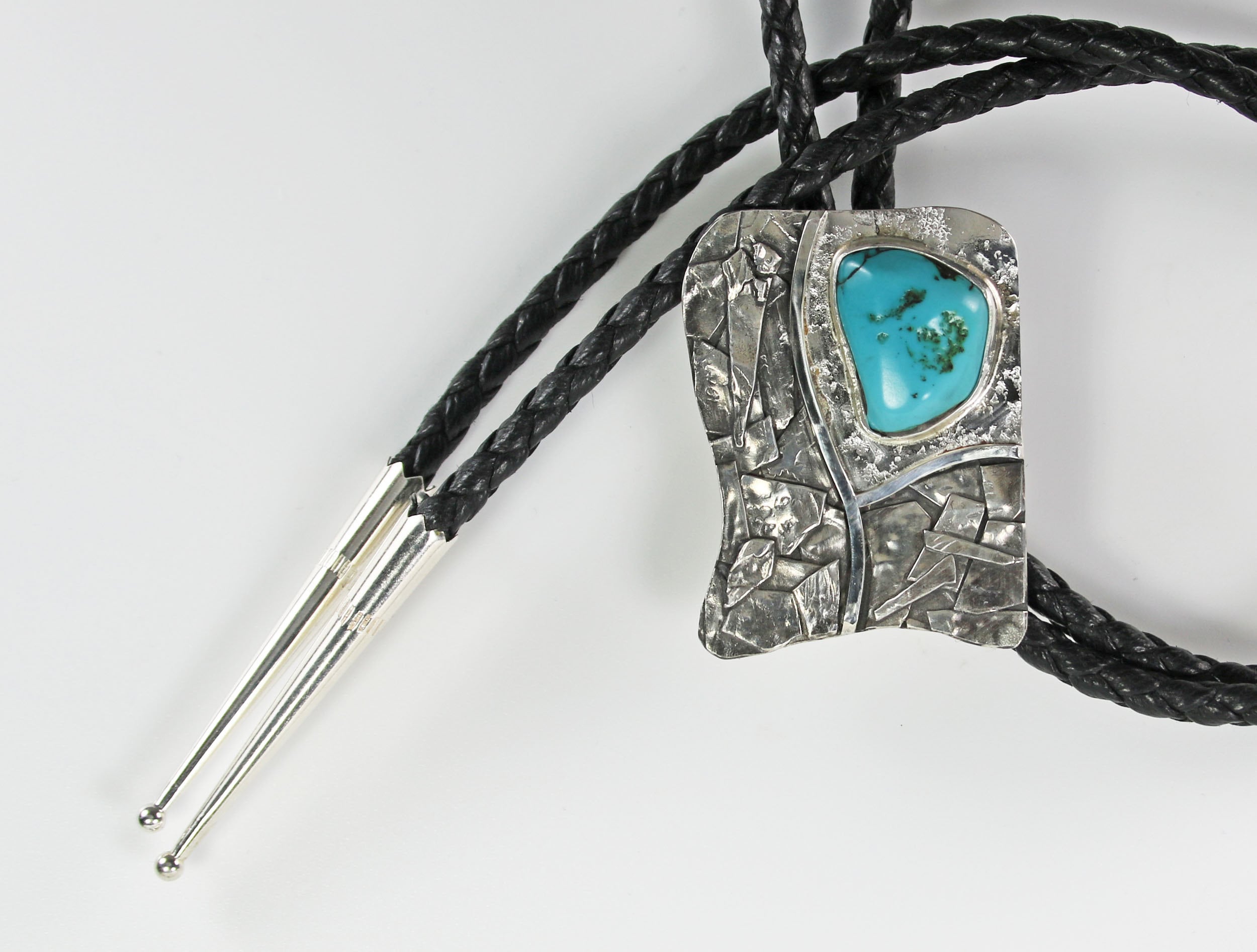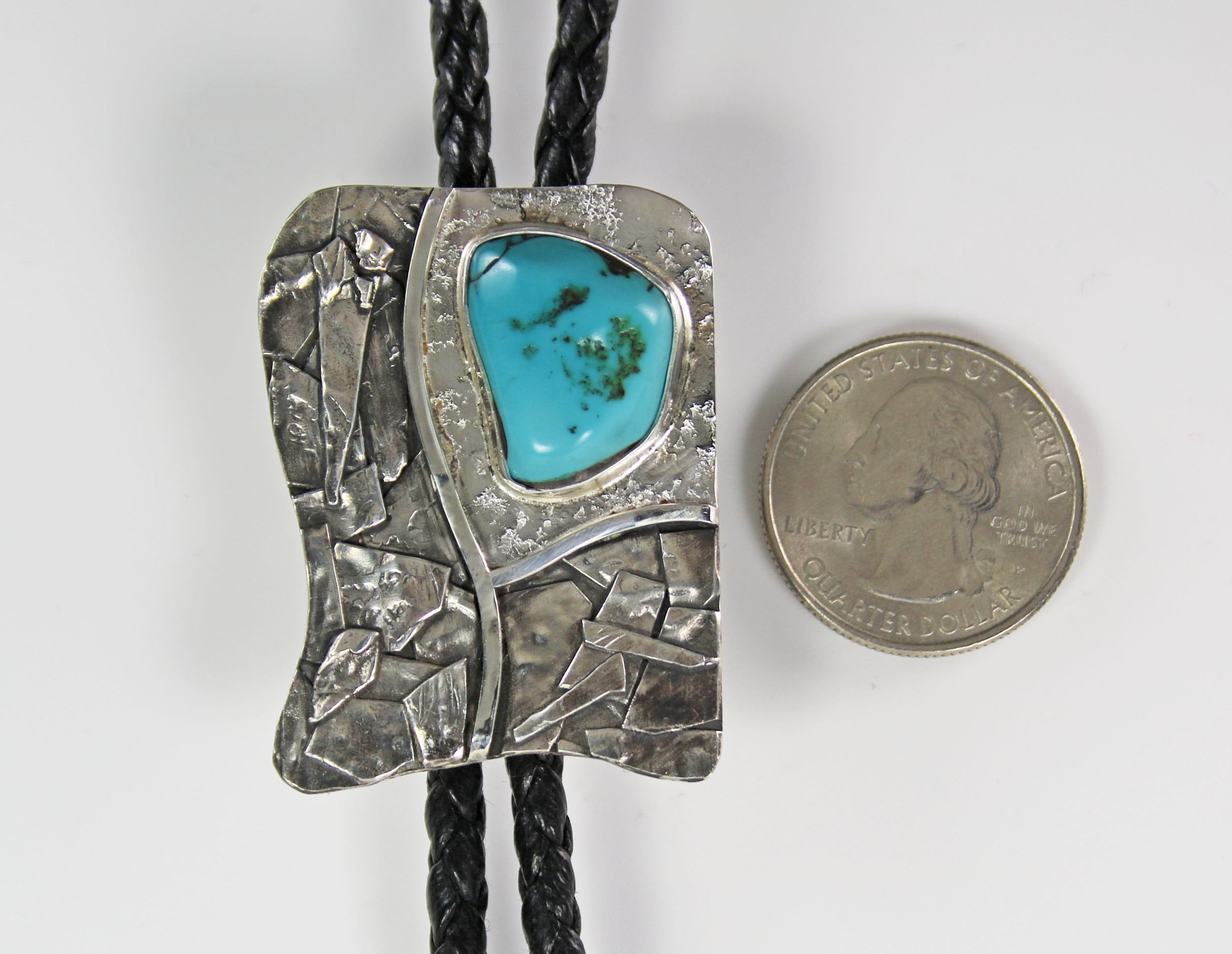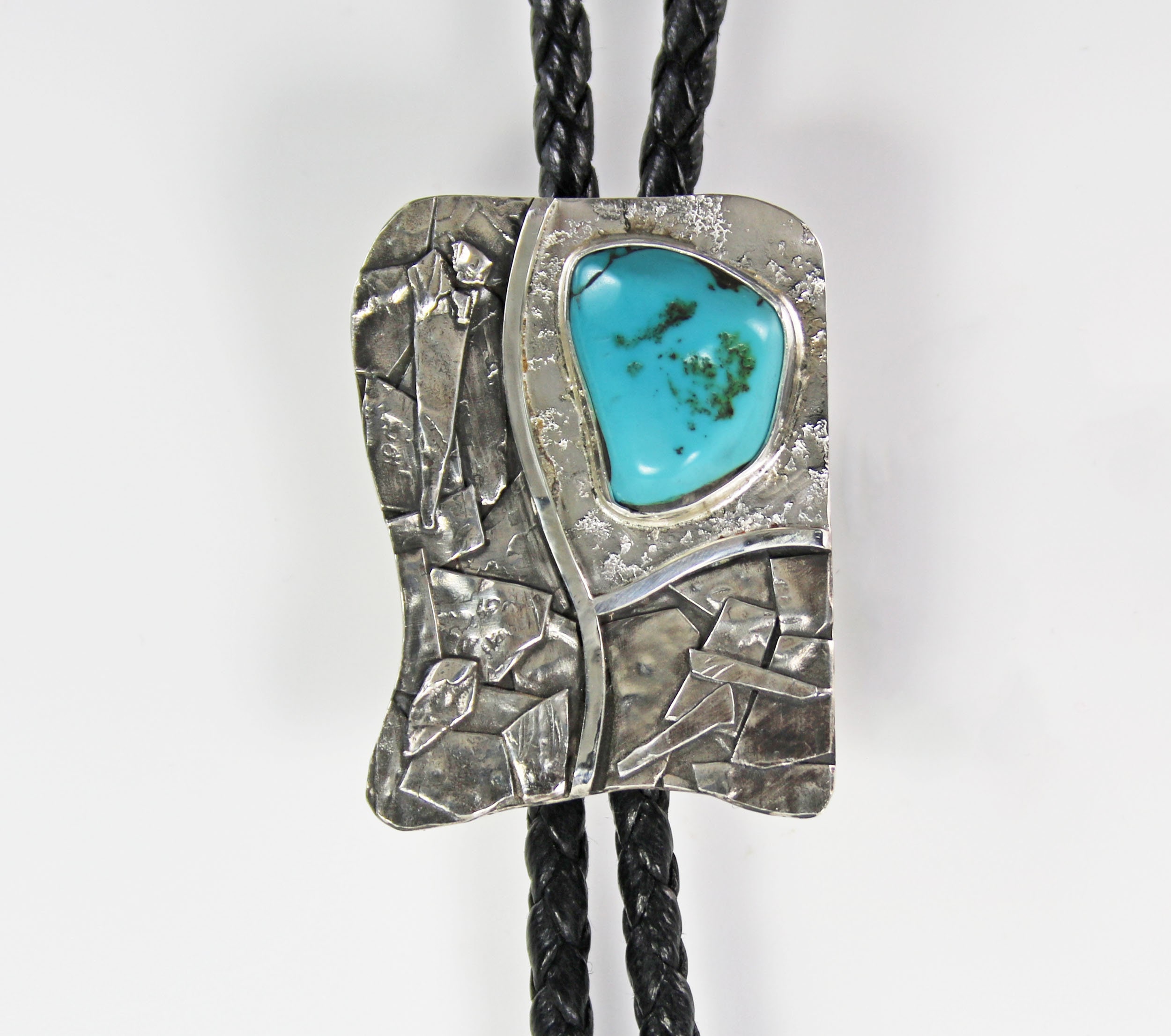 Contemporary Bolo Tie. No rules - this beautiful bolo can be worn by men or women. A wonderful alternative for formal attire or a funky bit of dress up with a tee shirt - NO rules apply for Bolo Ties! Stunning Sleeping Beauty Turquosise nugget is artistically set in highly sculpted and fused sterling silver. The sterling silver is lightly patinated in some area to enhance the sculptural detail of the metal. The bezel set stone sits atop textured bright sterling silver. The handcrafted slide uses friction rather than a mechanical device. This slide will keep your tie securely in place without crimping the leather cord. Lapidary work, design and fabrication all done by Ran.