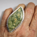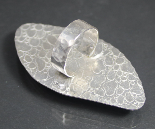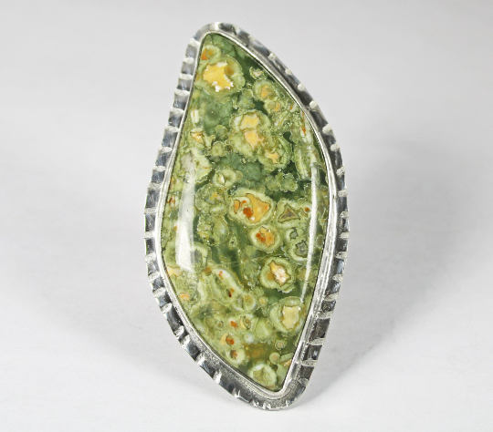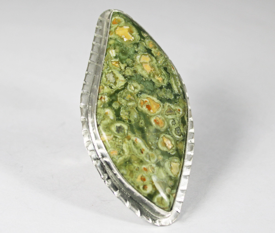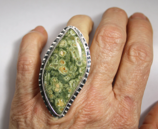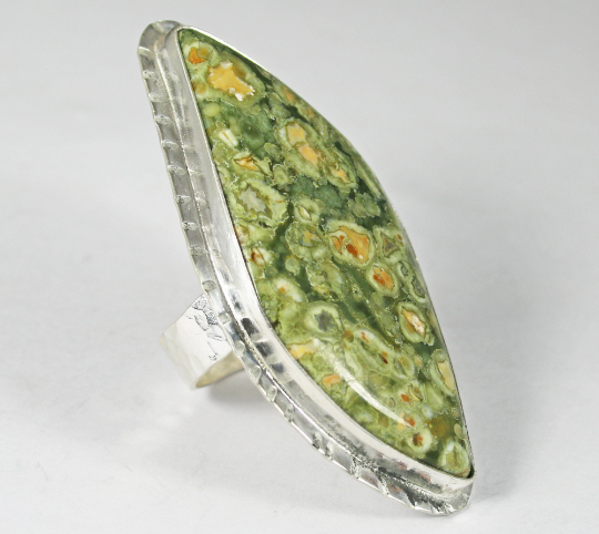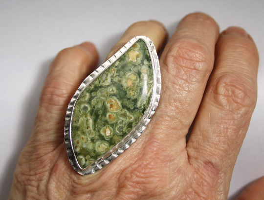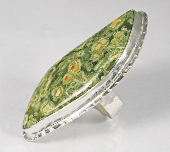 Save the Rain Forest Ring. Wear your love of the rain forest right on your finger! Hand fabricated in our studio, the back of this ring features a cobblestone texture and the ring band also has a hammered cobblestone look. Certain to get attention, this beauty is a size 8 and can be sized up to a 9.