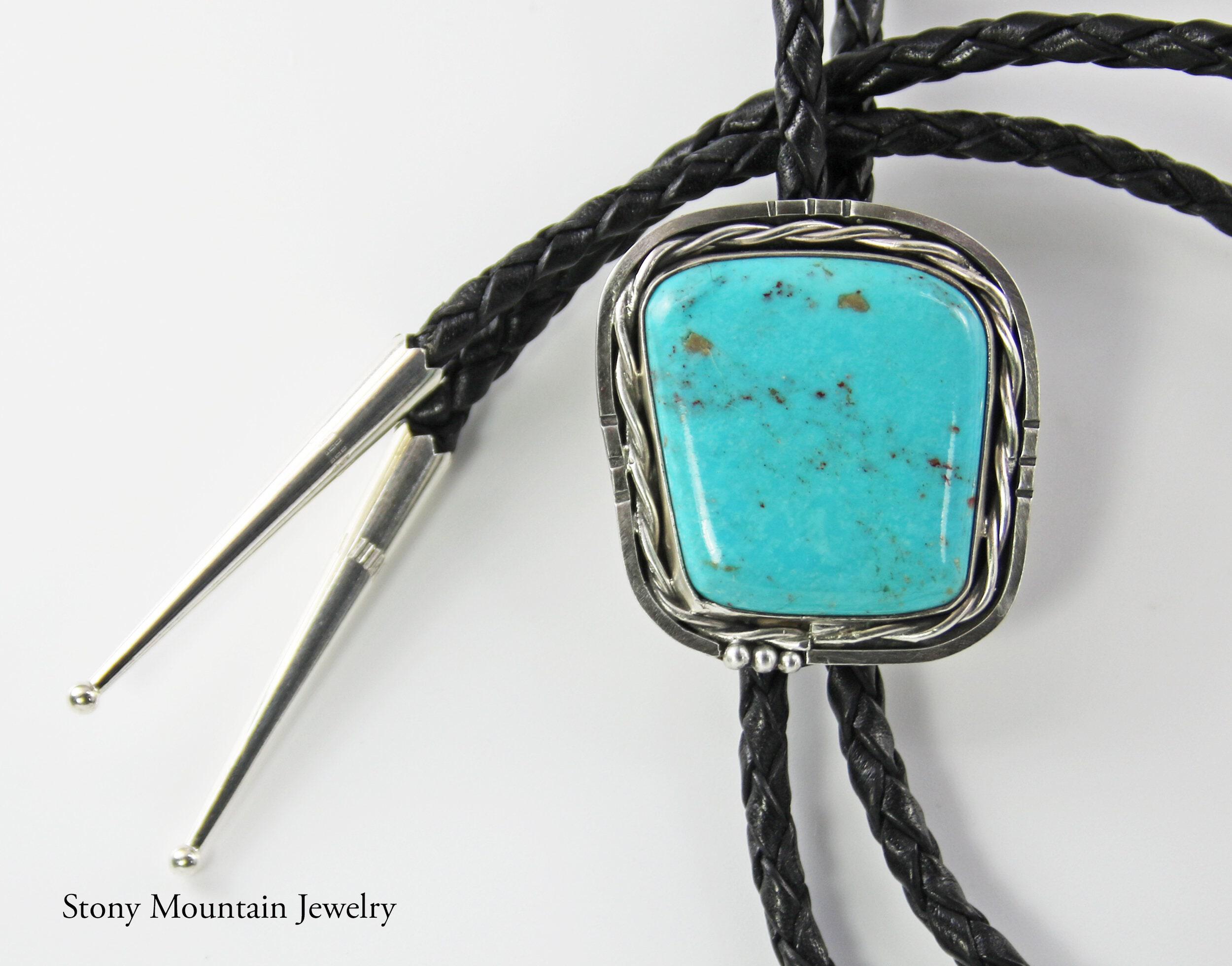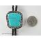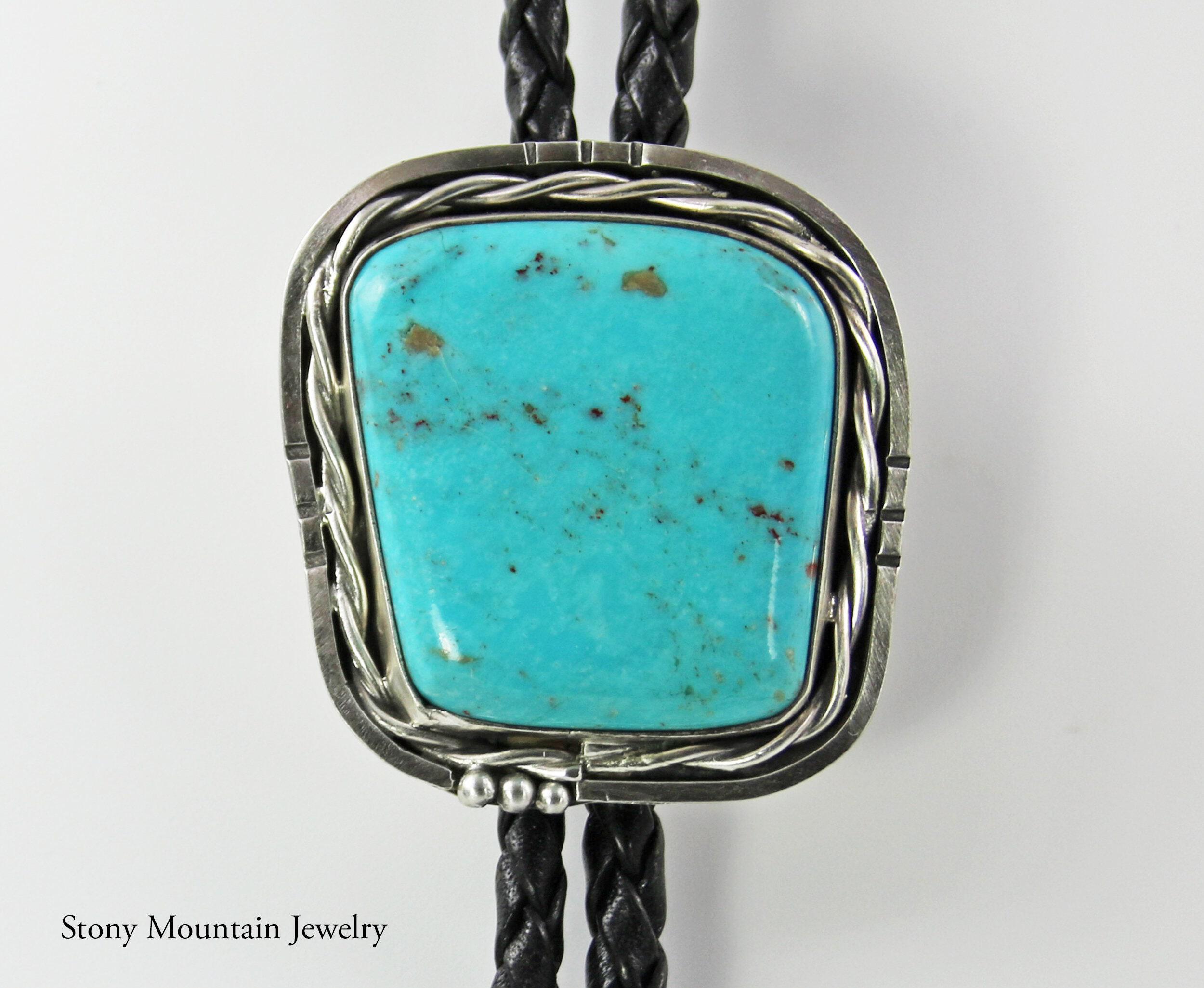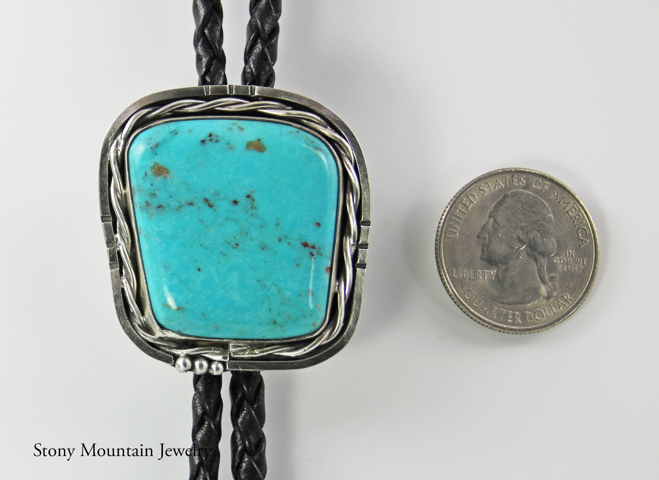 Hand cut freeform Sonoran Turquoise is artistically set in sterling silver. The handcrafted slide uses friction rather than a mechanical device. This slide will keep your tie securely in place without crimping the leather cord. Lapidary work, design and fabrication all done by Ran.
