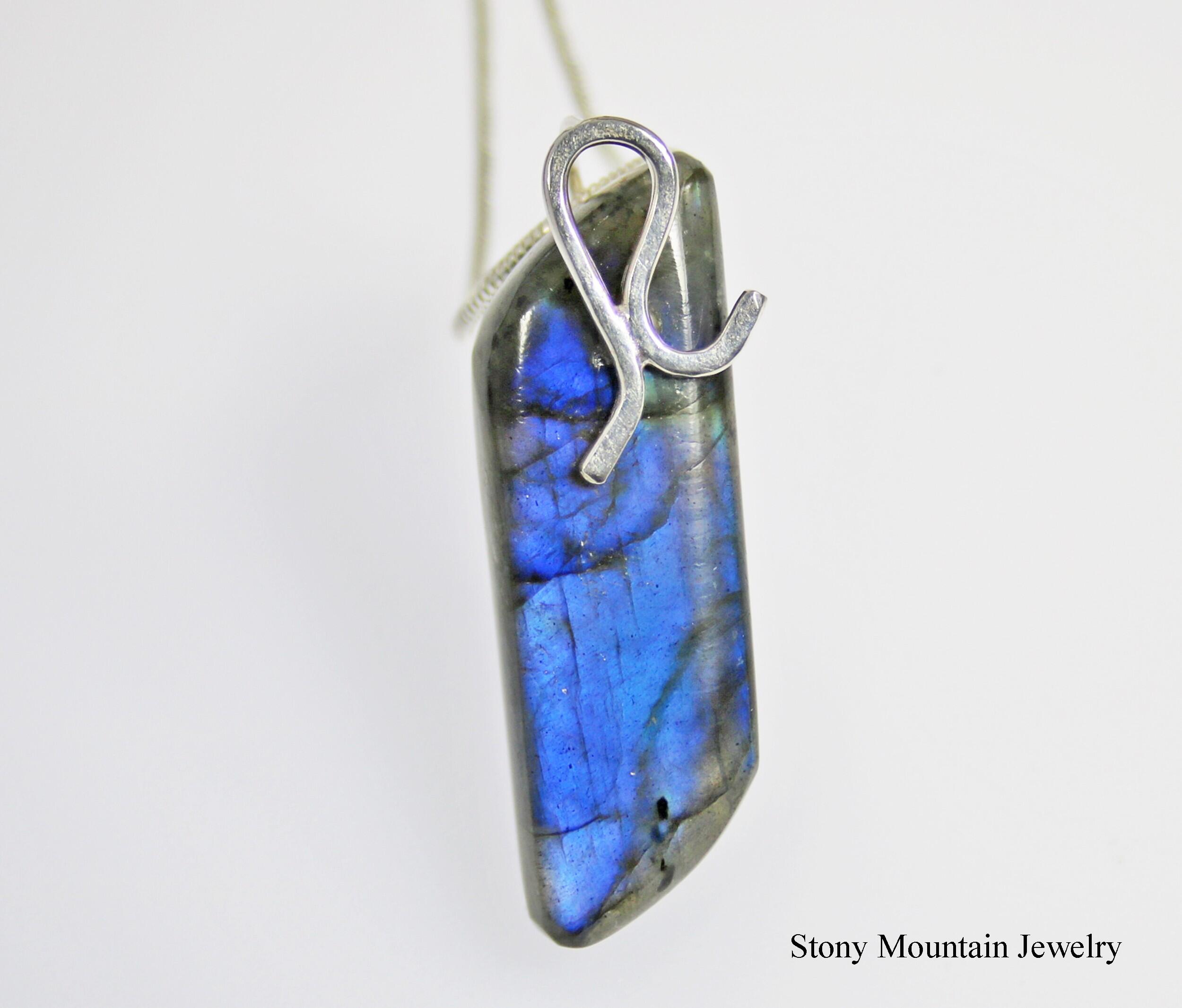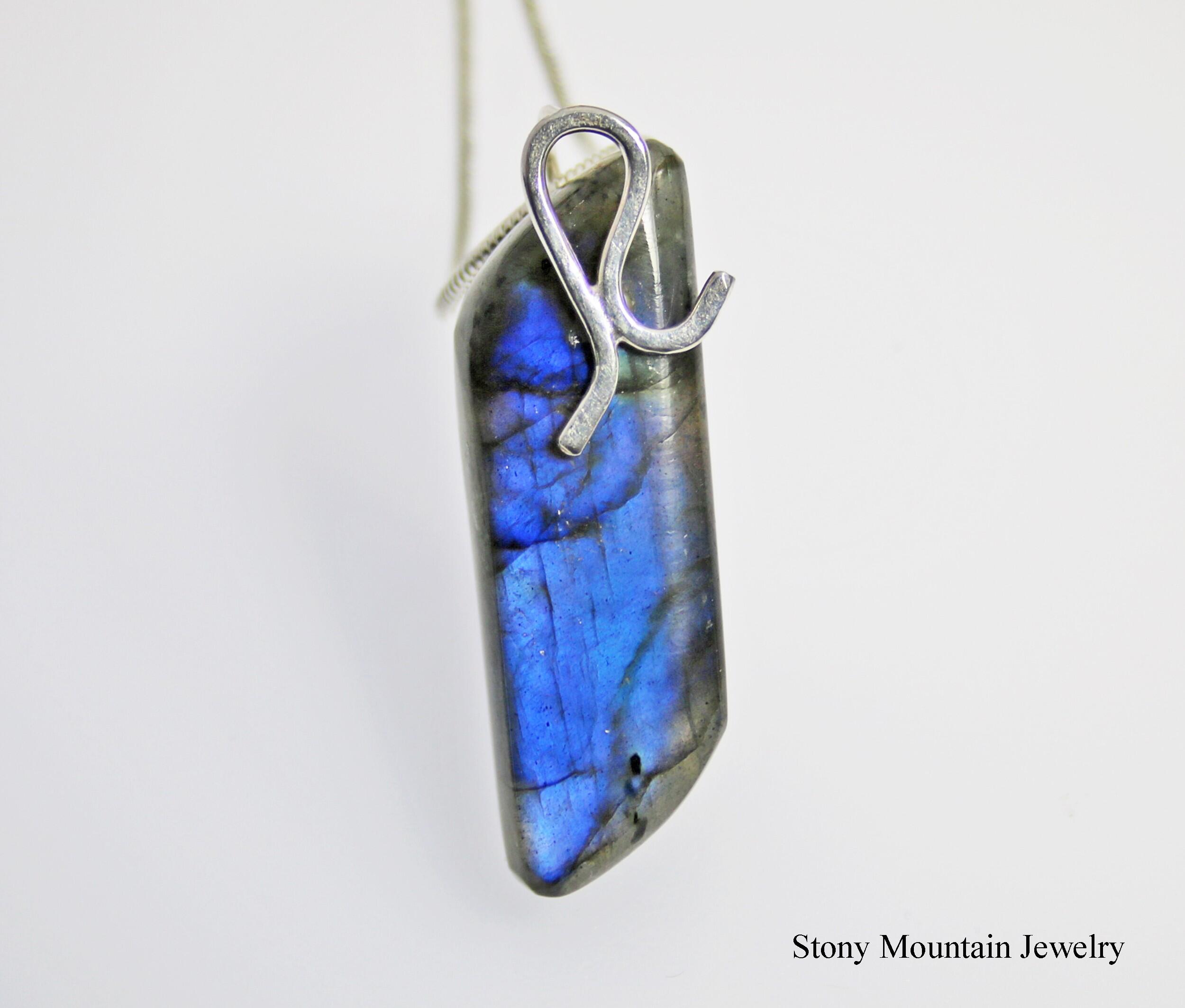 Beautiful and rare Finland Spectrolite hand cut cabochon, set in a minimalist style with sterling silver accent. A special art jewelry piece for any occasion. Original Ran Armstrong design and lapidary work (gemstone cutting).
