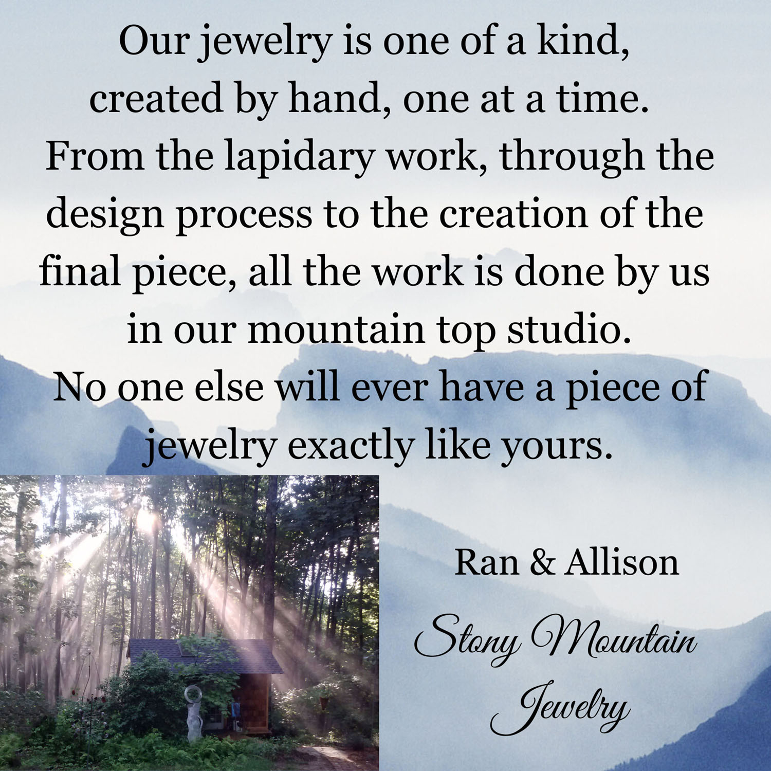 Thanks for visiting Stony Mountain Jewelry! Creating distinctive jewelry for you in a mountain top studio. Our work is hand fabricated in sterling silver and high karat gold. Using fine quality gemstones and our own hand cut cabochons, we are pleased to offer you many one-of-a-kind fine art jewelry pieces.